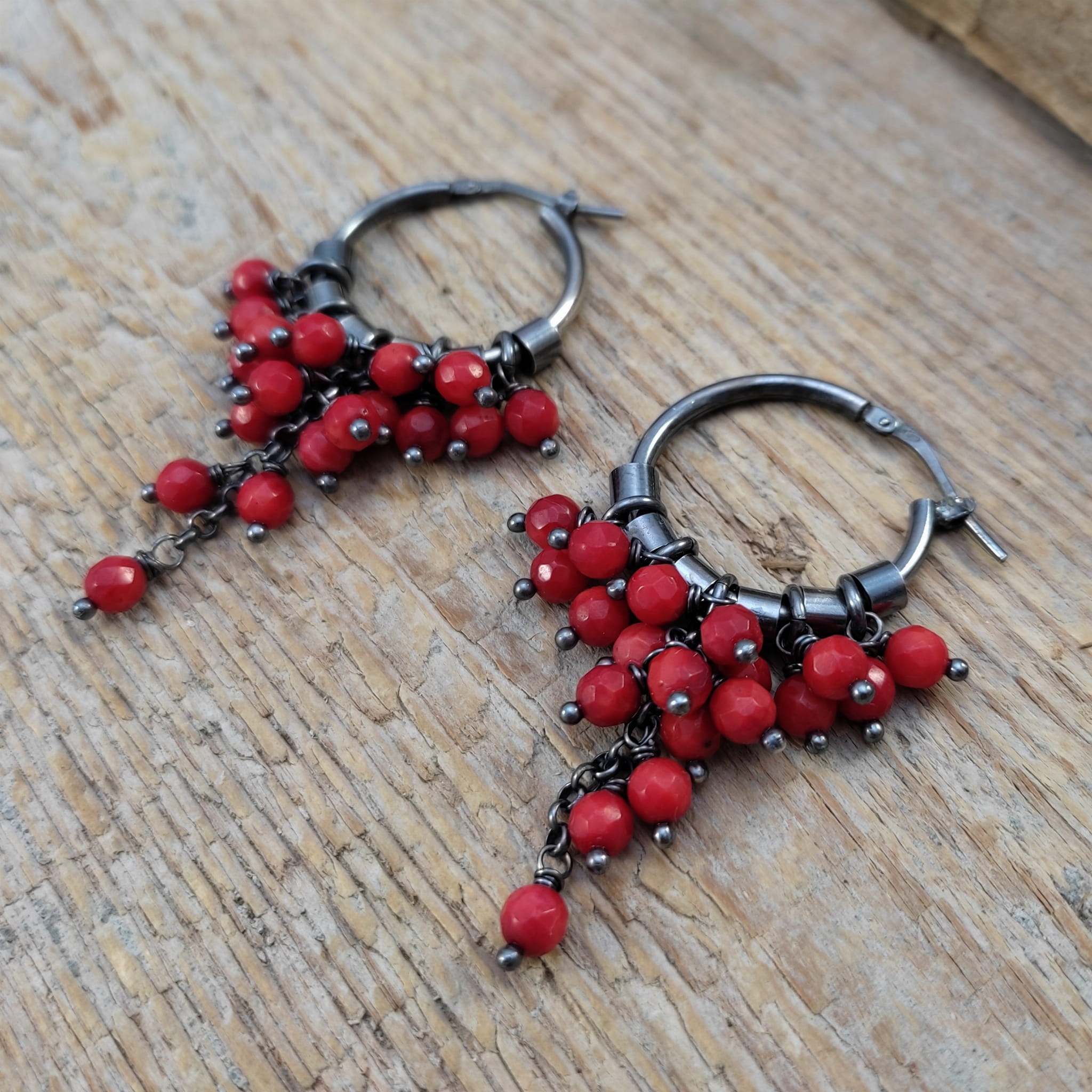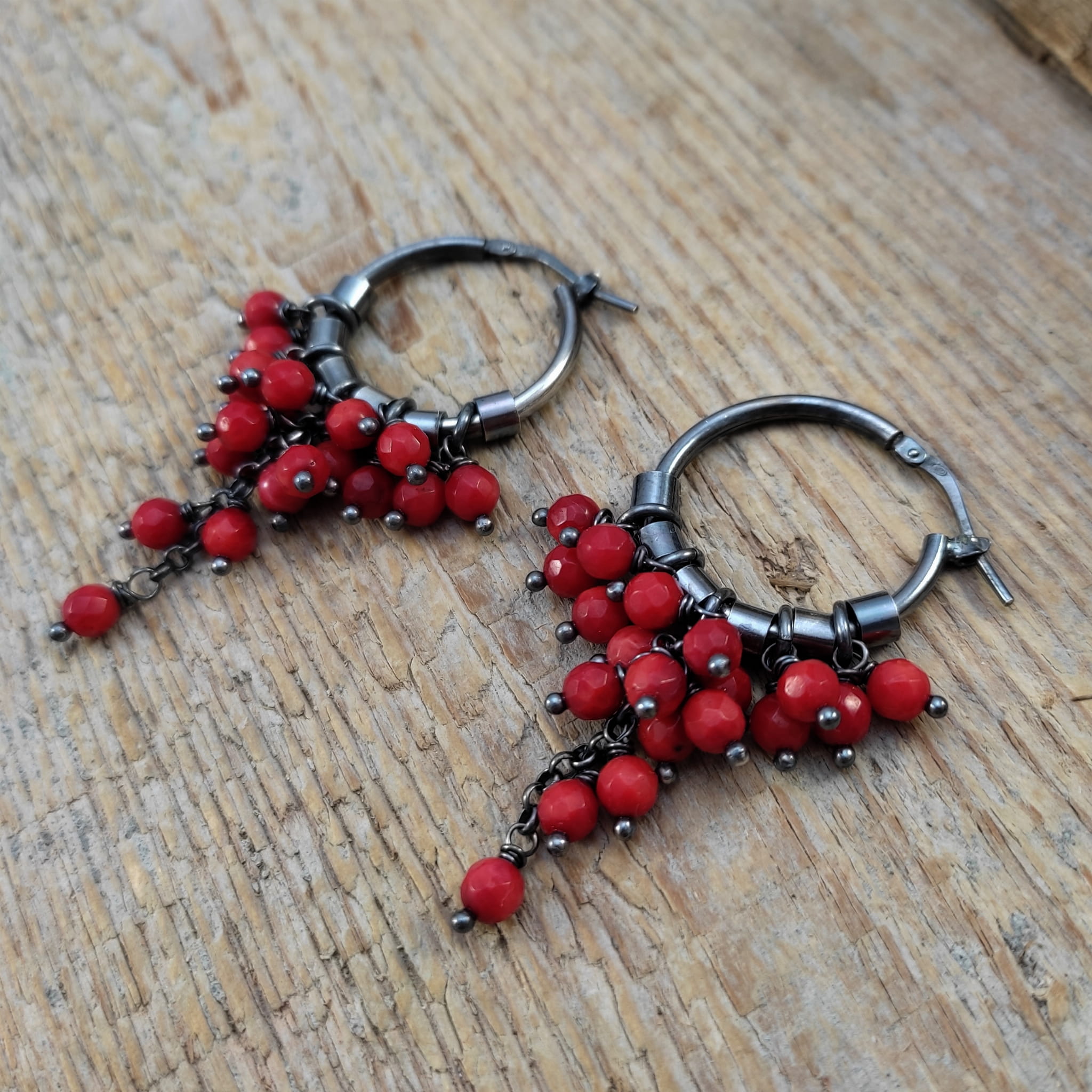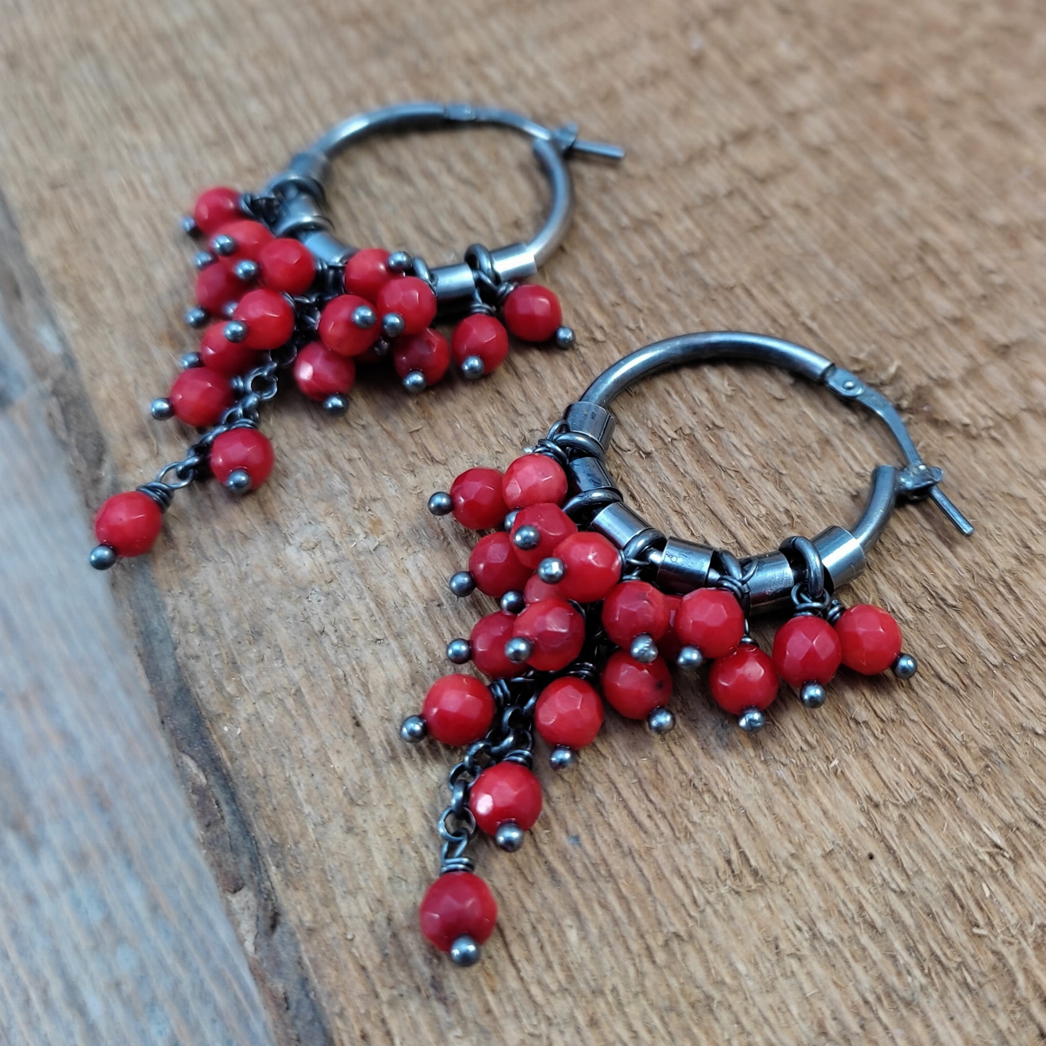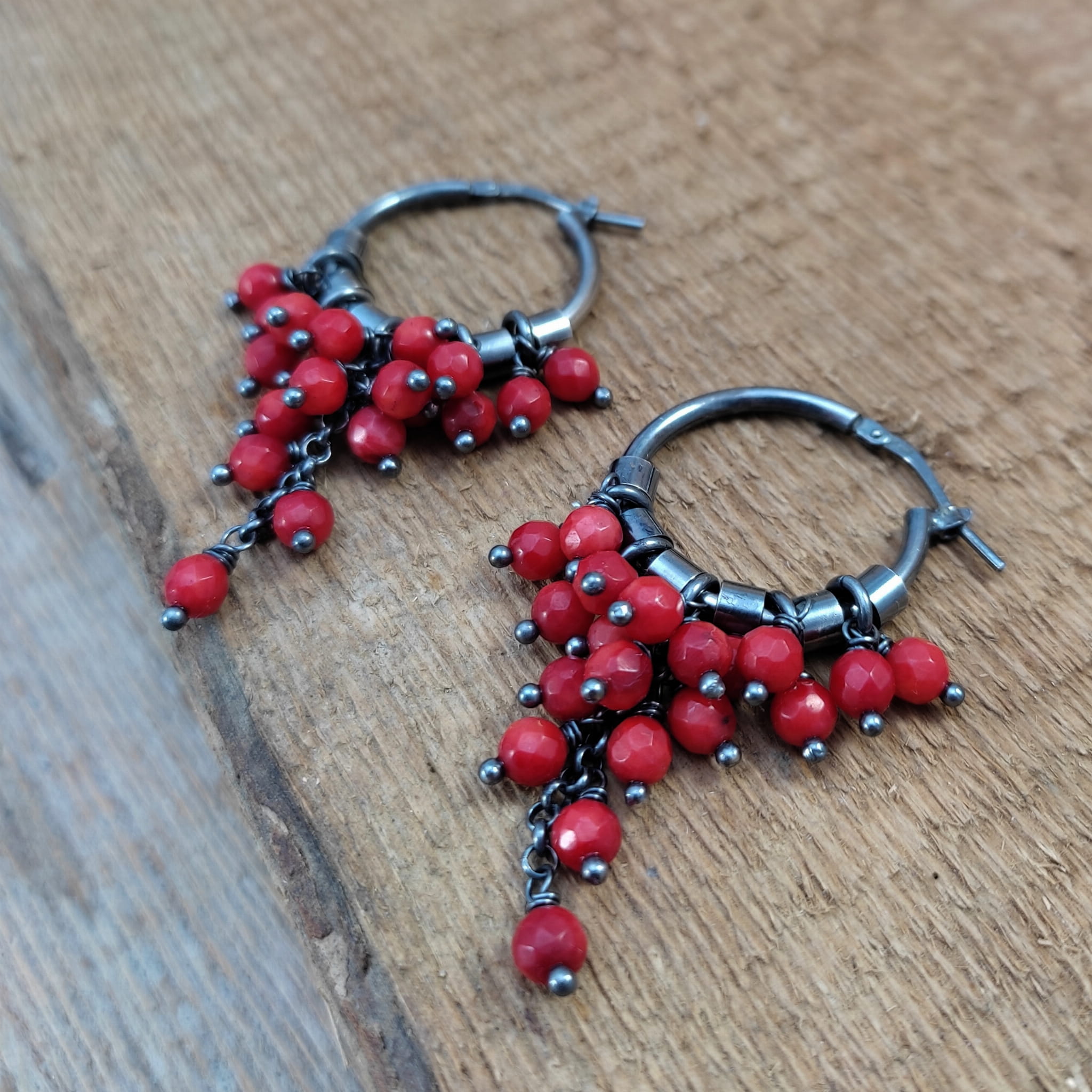 Kolczyki z kulami fasetowanego korala. Fasetowany koral o średnicy 4 mm. Kamienie posiadają niedoskonałości. Długość całkowita kolczyków wynosi ok. 53 mm. Kolczyki zostały wykonane w całości ze srebra 925, srebro oksydowane. Zapakowane w eleganckie pudełko.