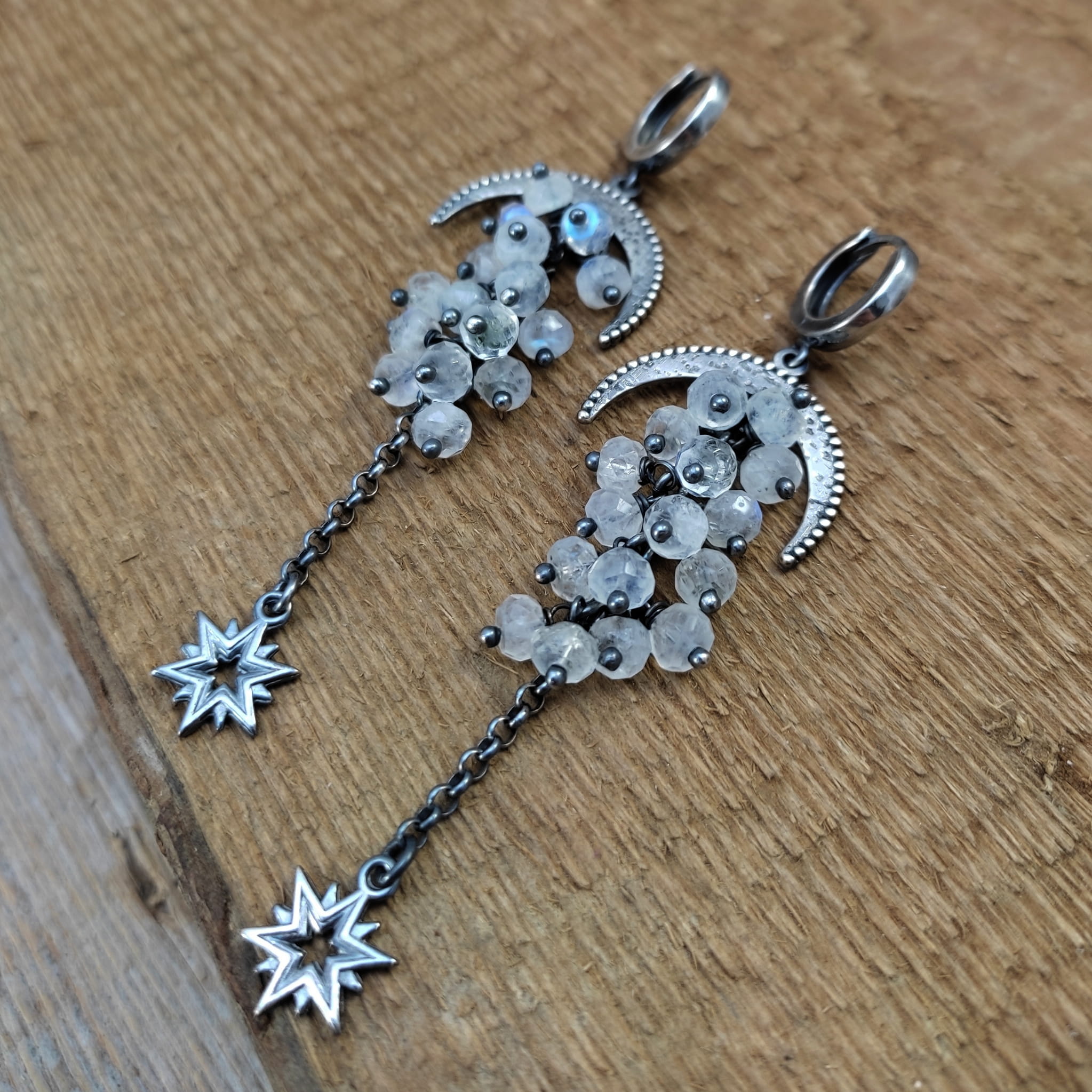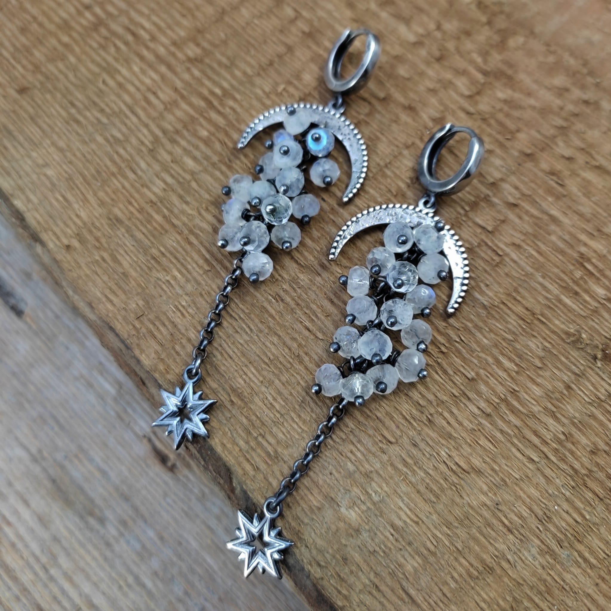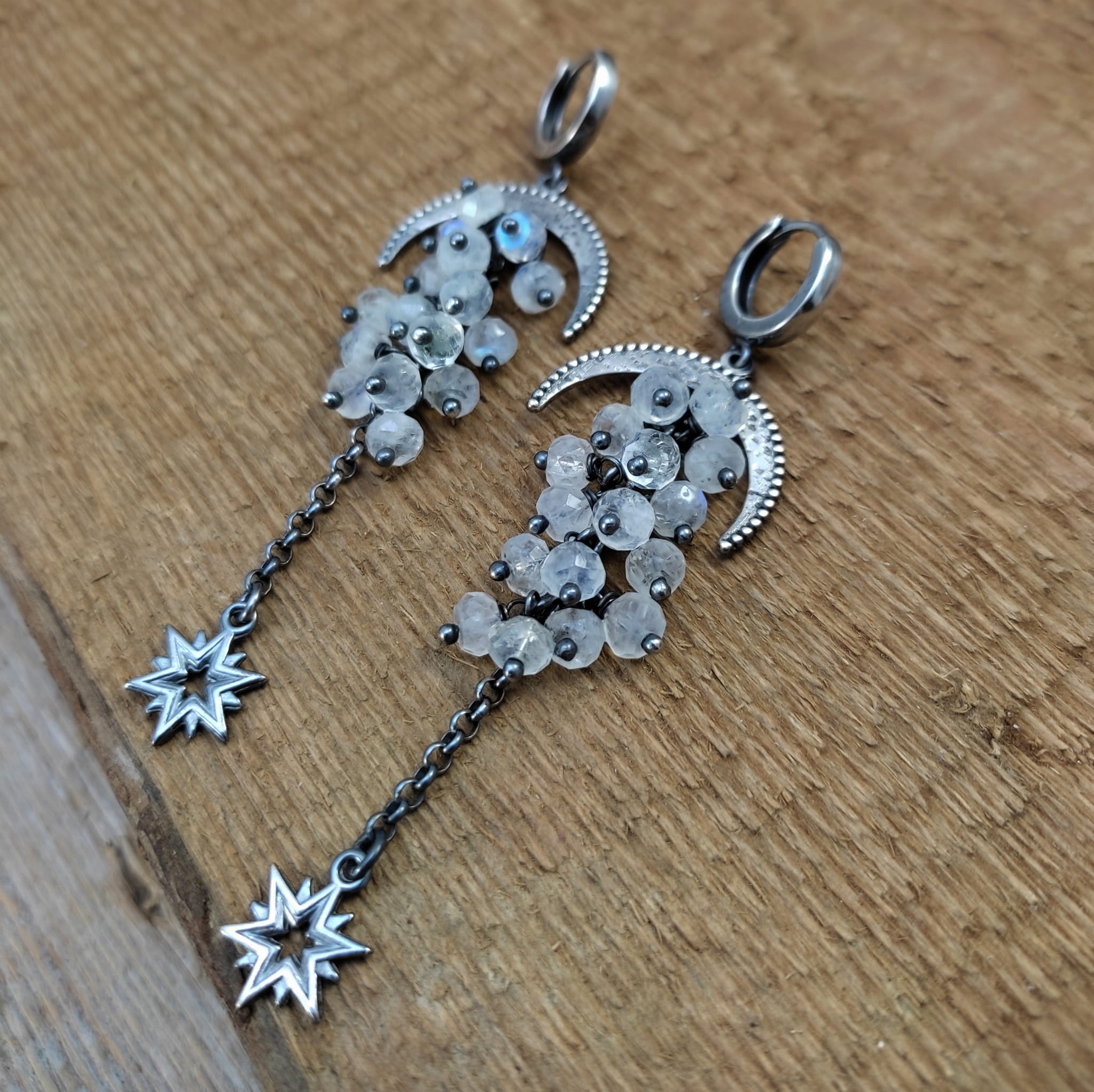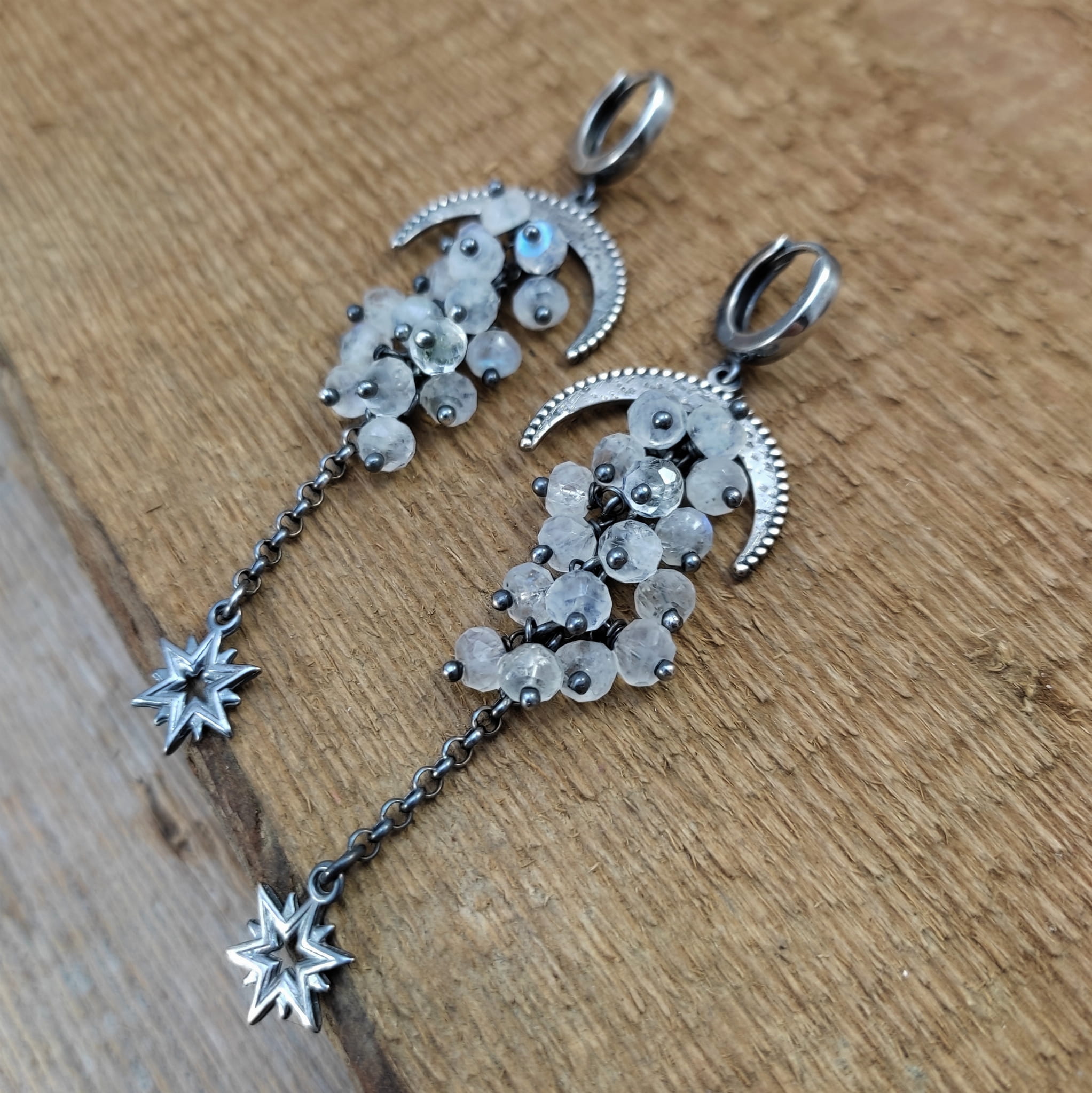 Kolczyki z oponkami fasetowanego kamienia księżycowego. Fasetowany kamień księżycowy o średnicy 5 mm. Kamienie posiadają niedoskonałości. Długość całkowita kolczyków wynosi ok. 78 mm. Kolczyki zostały wykonane w całości ze srebra 925, srebro oksydowane. Zapakowane w eleganckie pudełko.