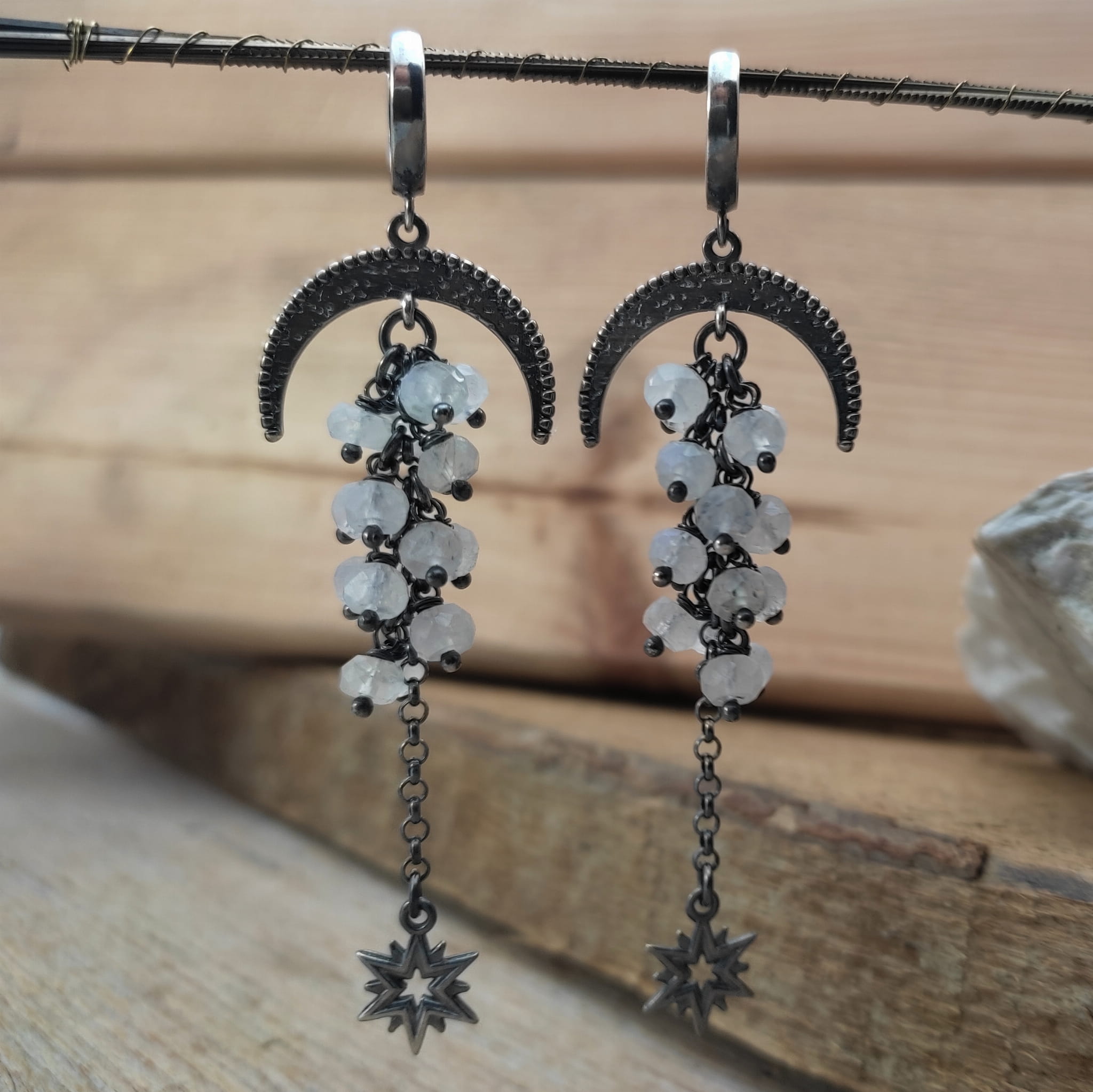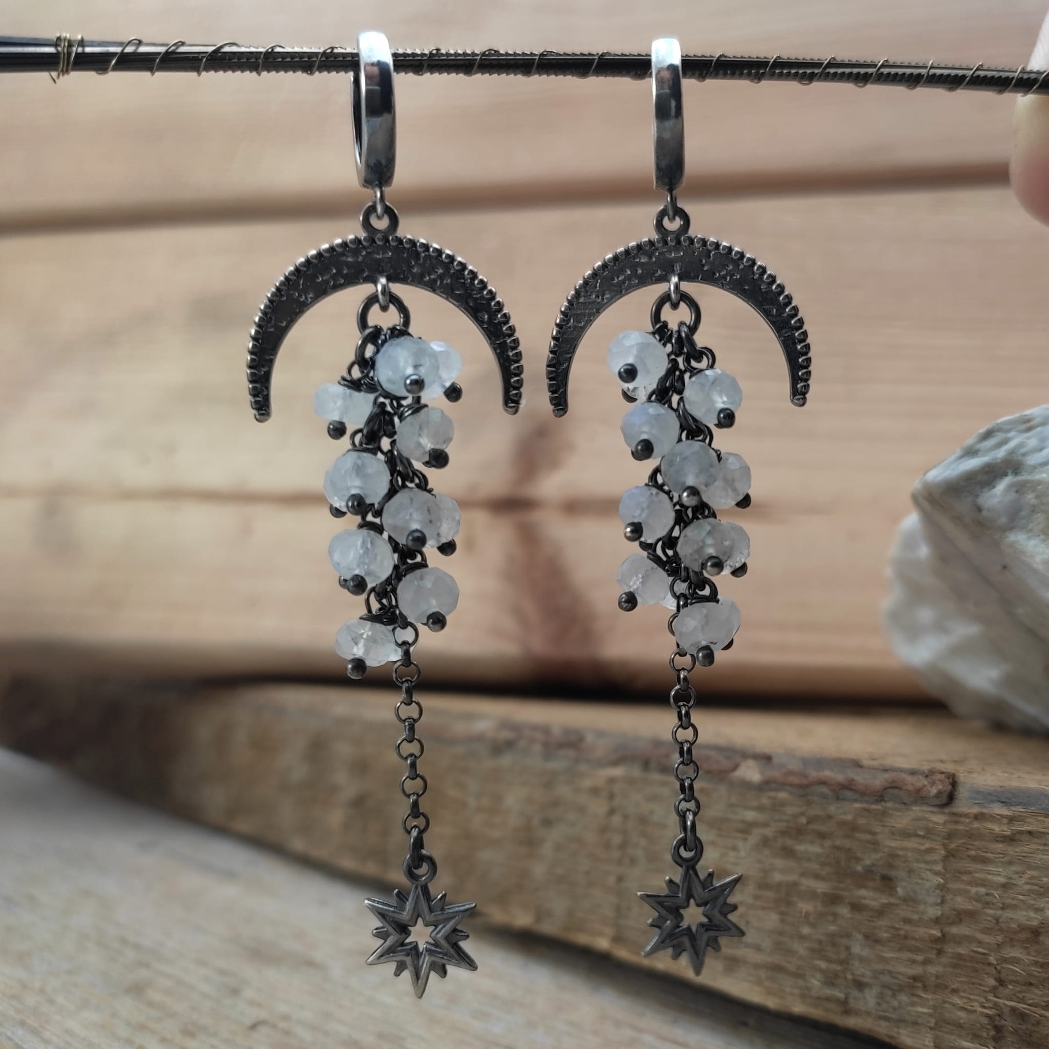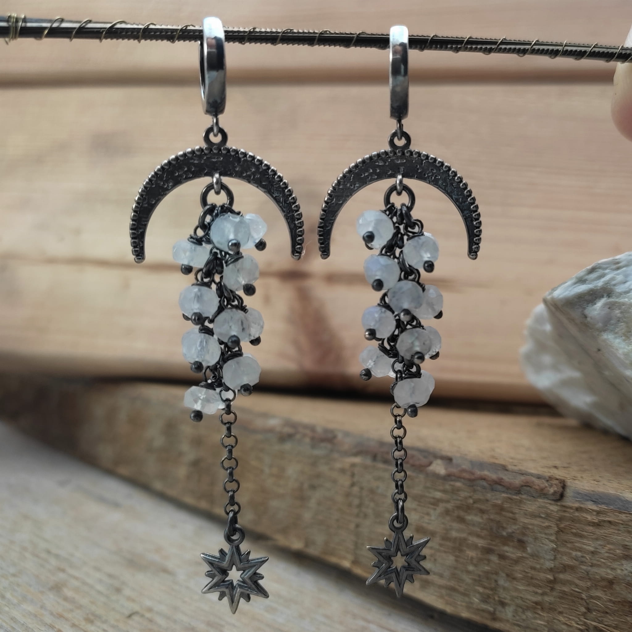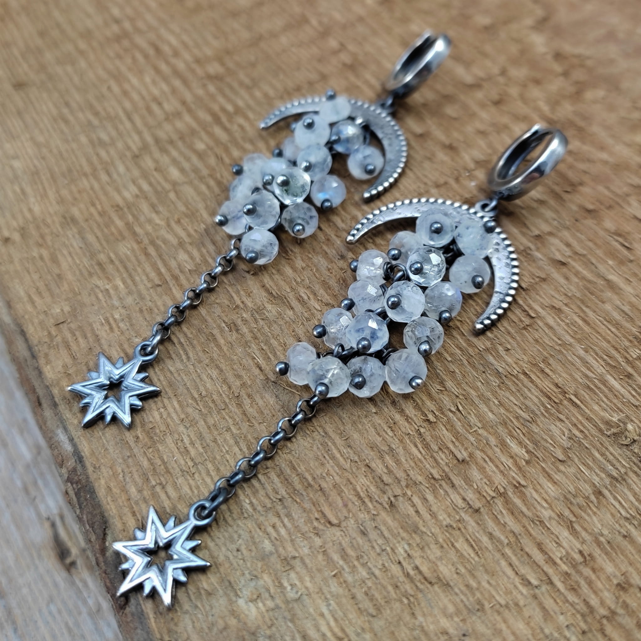 Kolczyki z oponkami fasetowanego kamienia księżycowego. Fasetowany kamień księżycowy o średnicy 5 mm. Kamienie posiadają niedoskonałości. Długość całkowita kolczyków wynosi ok. 78 mm. Kolczyki zostały wykonane w całości ze srebra 925, srebro oksydowane. Zapakowane w eleganckie pudełko.