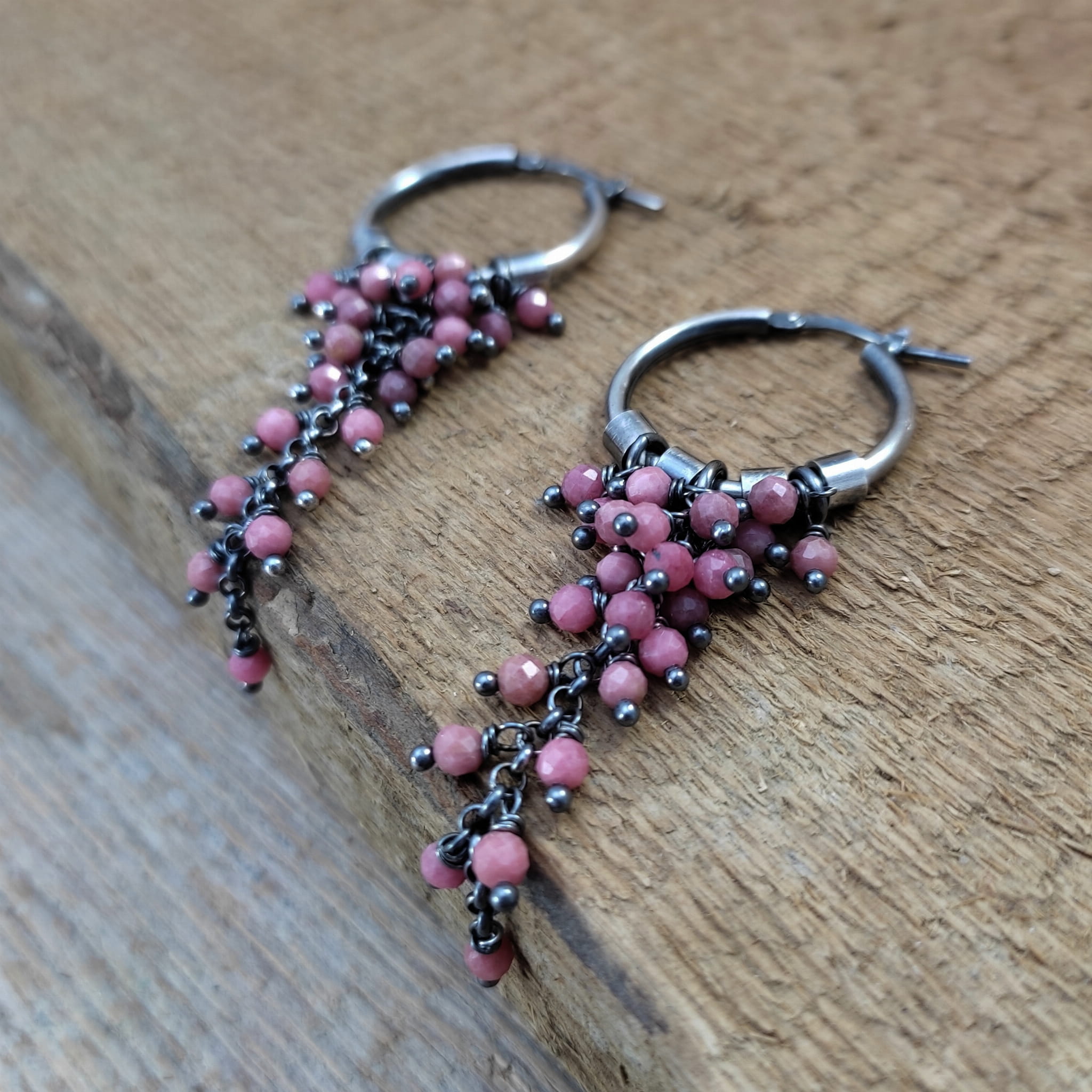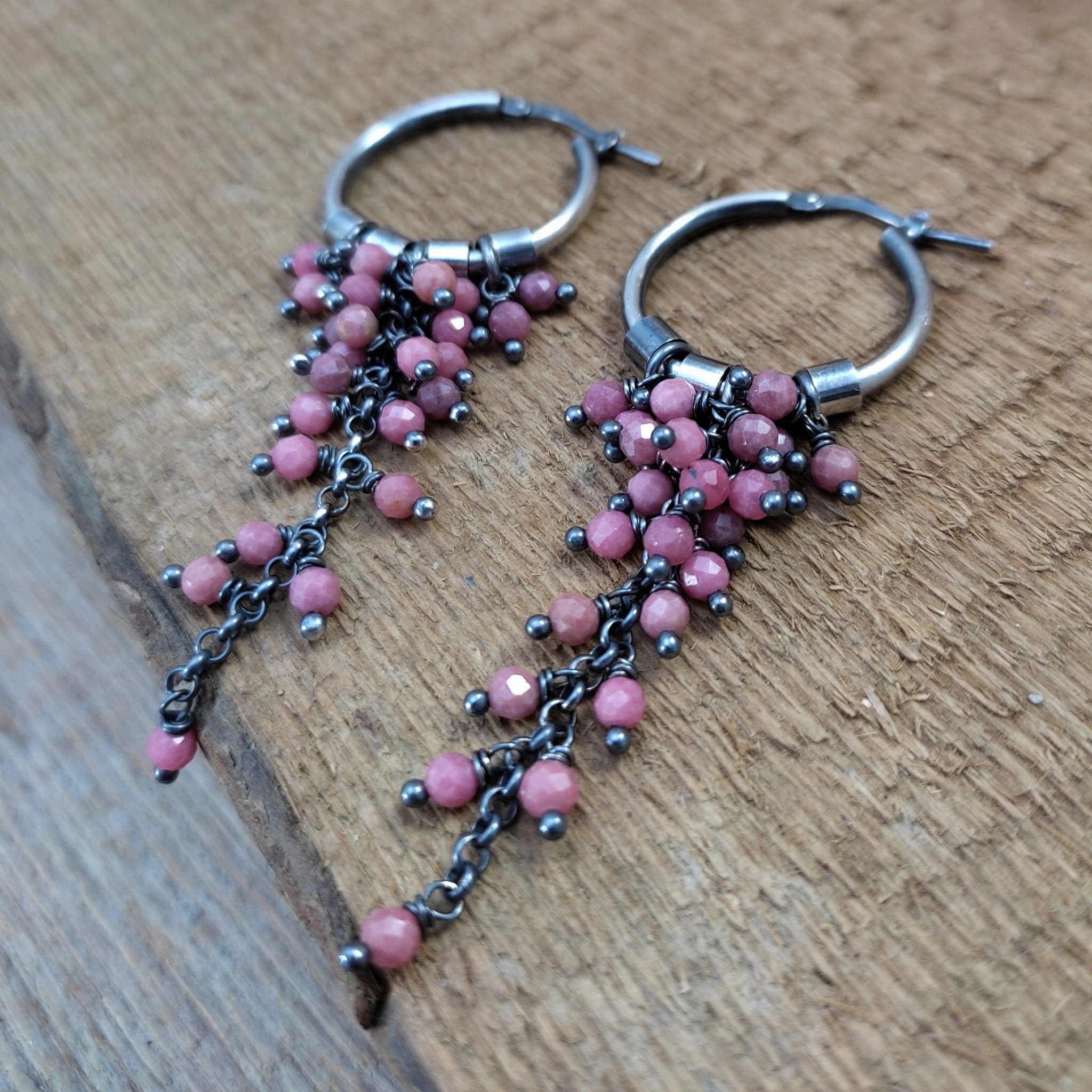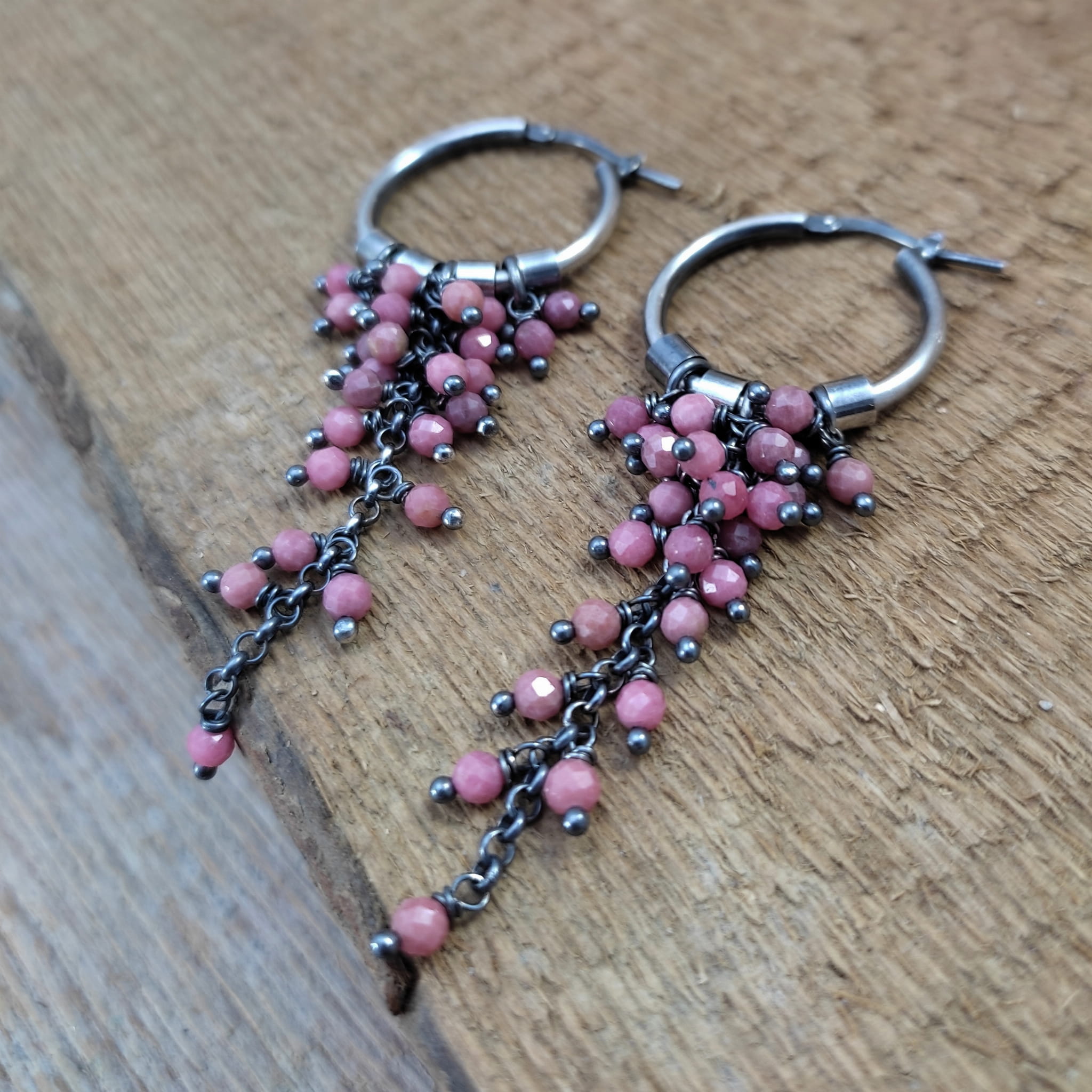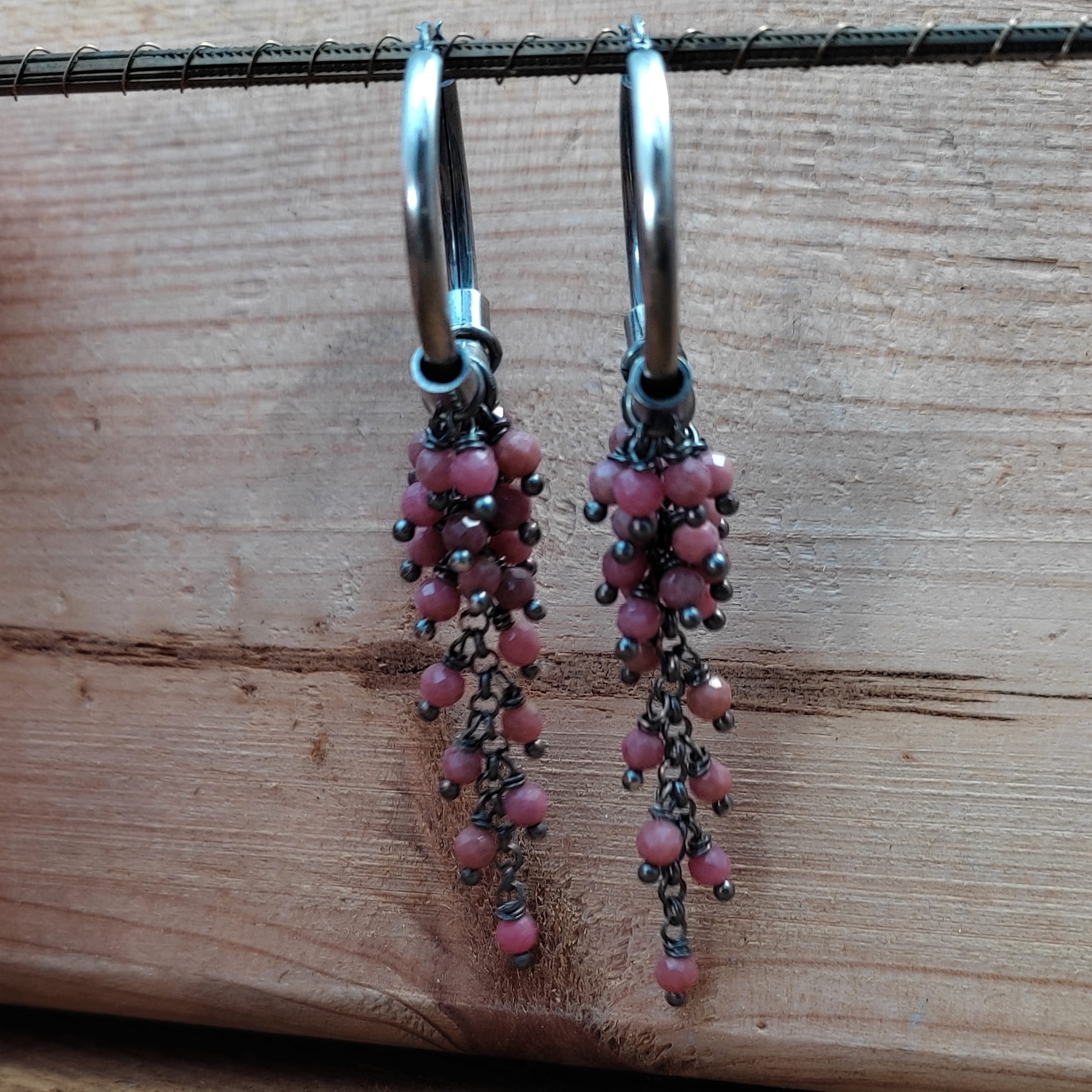 Kolczyki z kulami fasetowanego rodonitu. Fasetowany rodonit o średnicy 3 mm. Kamienie posiadają niedoskonałości. Długość całkowita kolczyków wynosi ok. 67 mm. Kolczyki zostały wykonane w całości ze srebra 925, srebro oksydowane. Zapakowane w eleganckie pudełko.