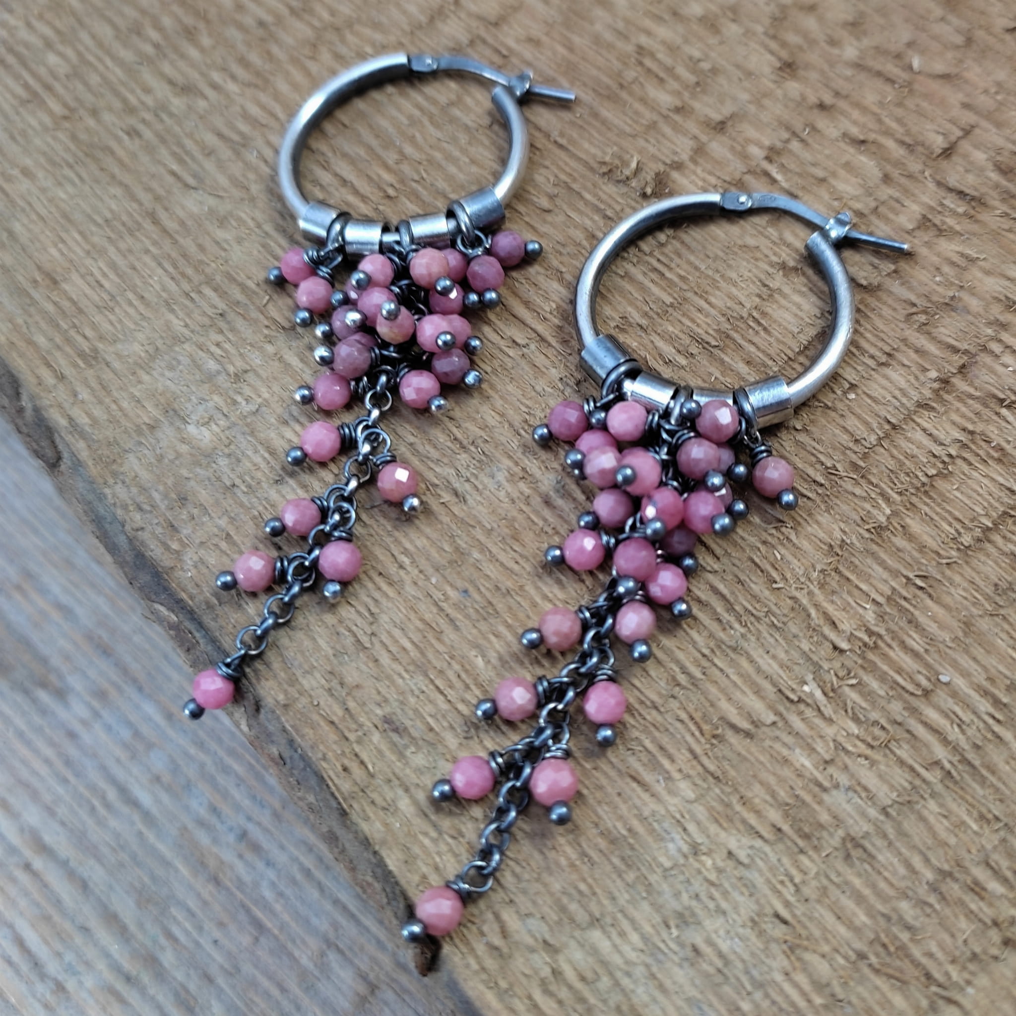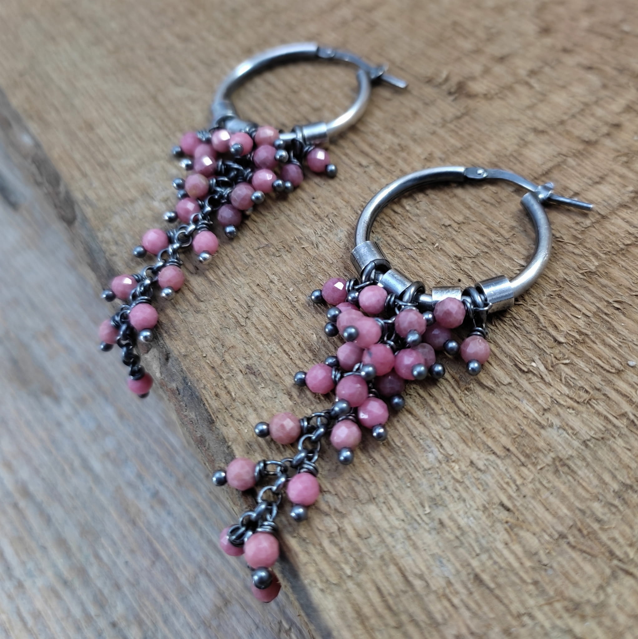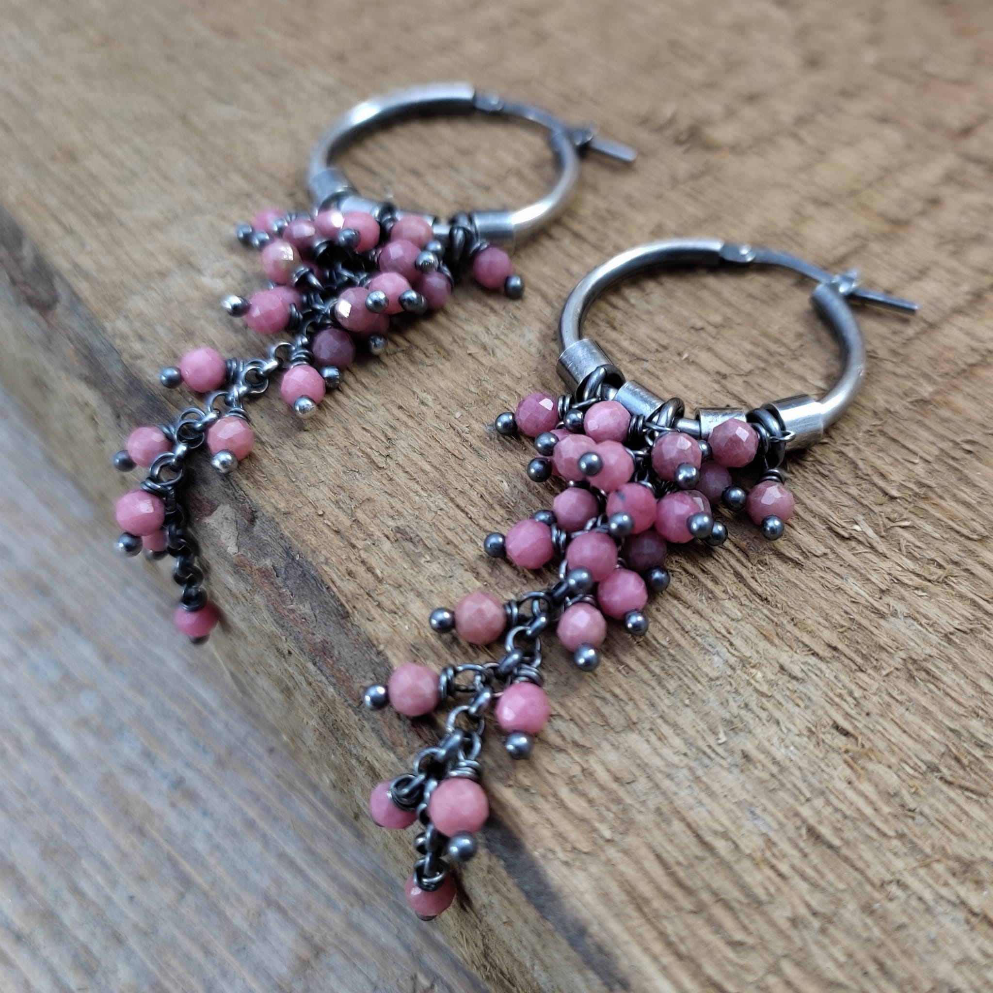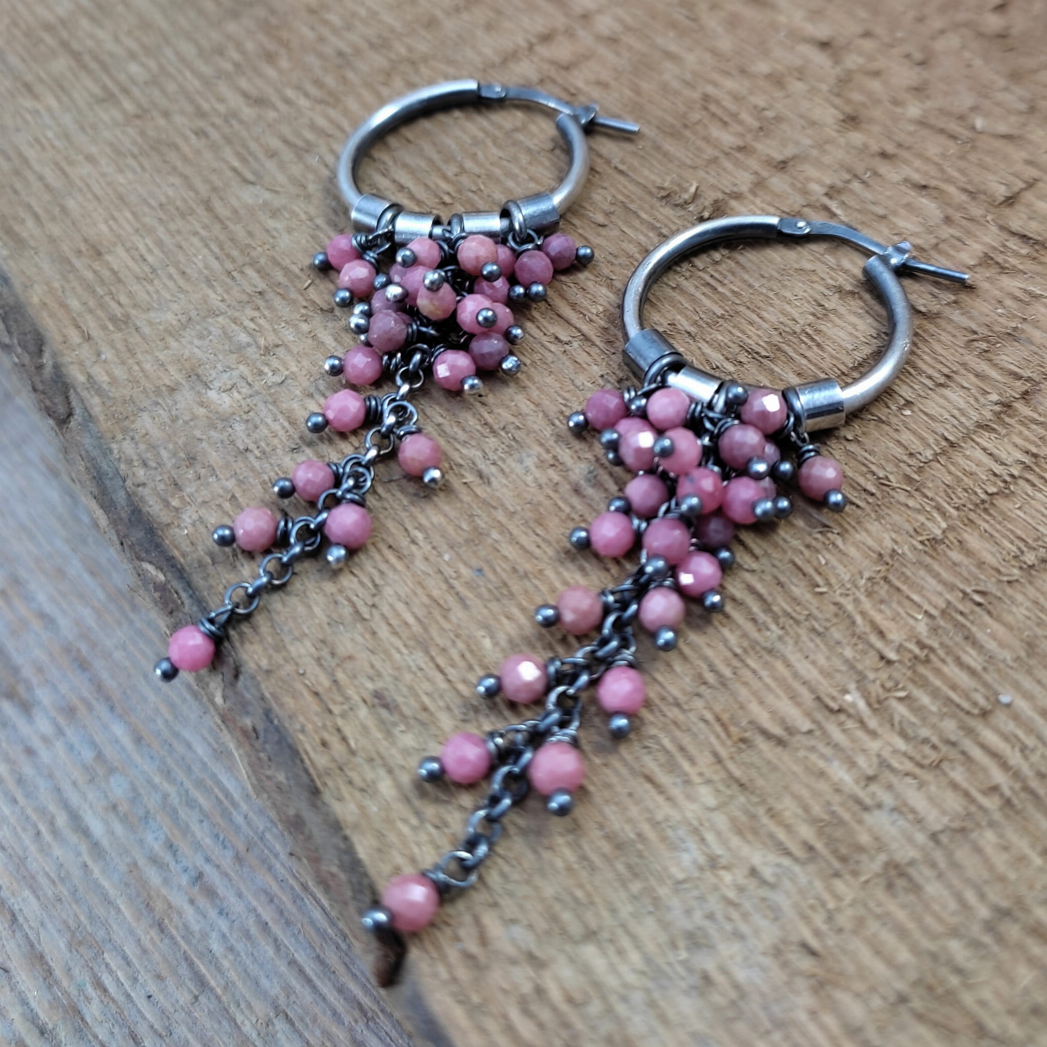 Kolczyki z kulami fasetowanego rodonitu. Fasetowany rodonit o średnicy 3 mm. Kamienie posiadają niedoskonałości. Długość całkowita kolczyków wynosi ok. 67 mm. Kolczyki zostały wykonane w całości ze srebra 925, srebro oksydowane. Zapakowane w eleganckie pudełko.