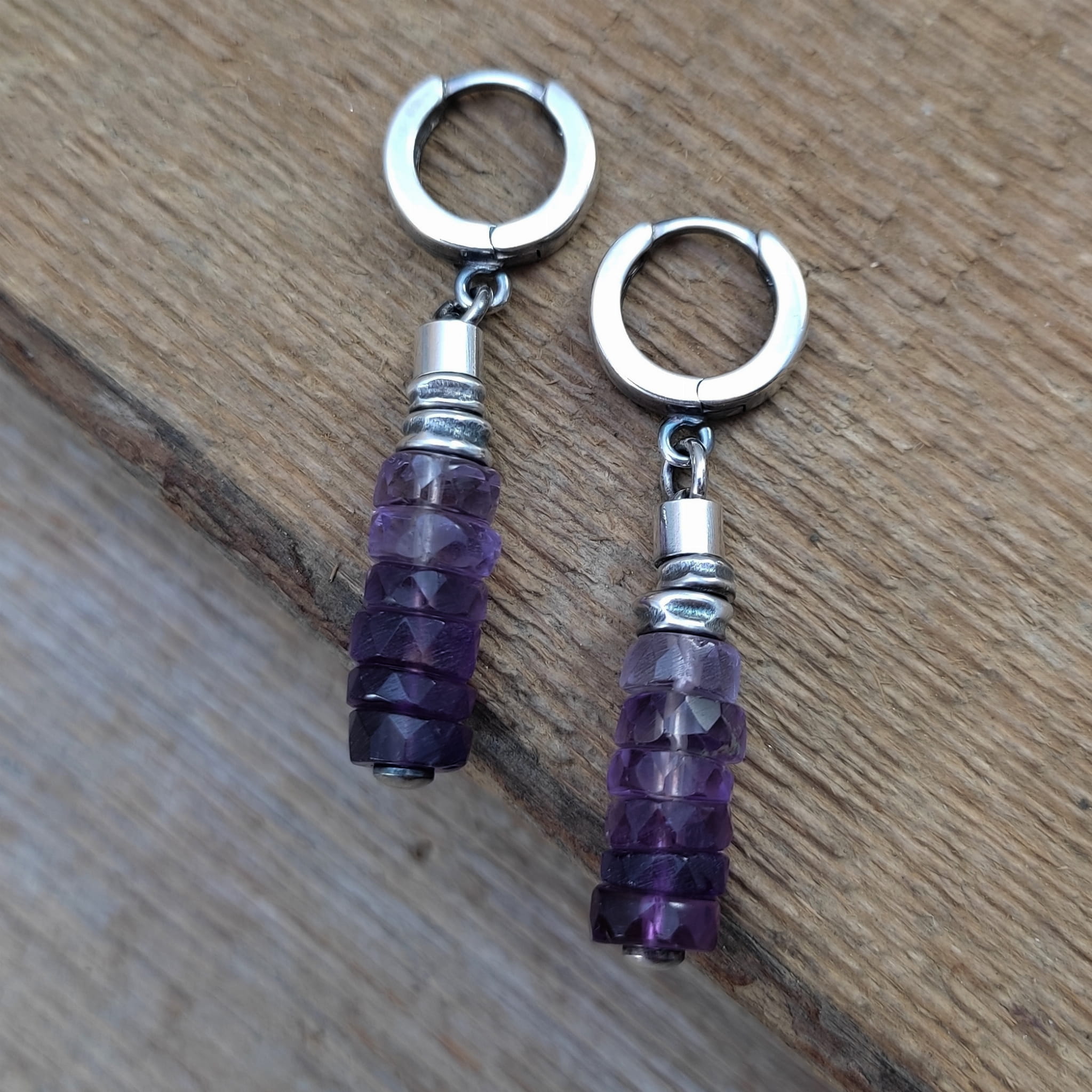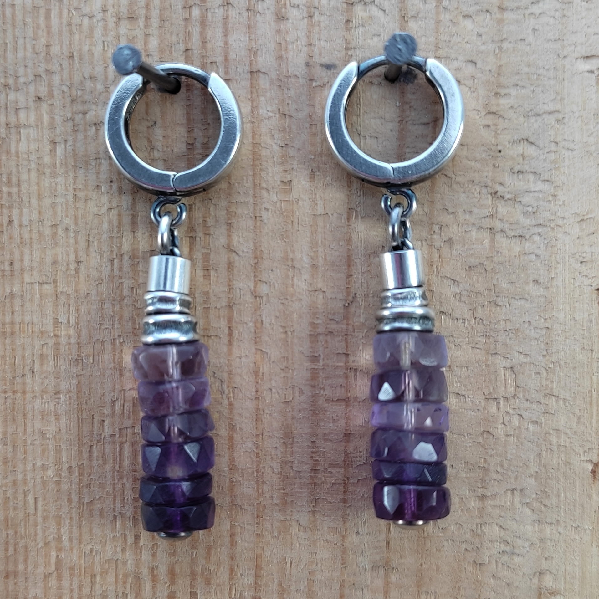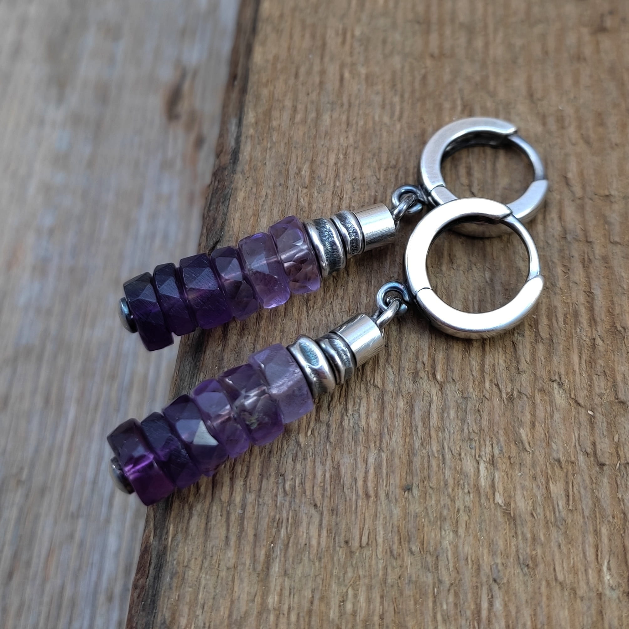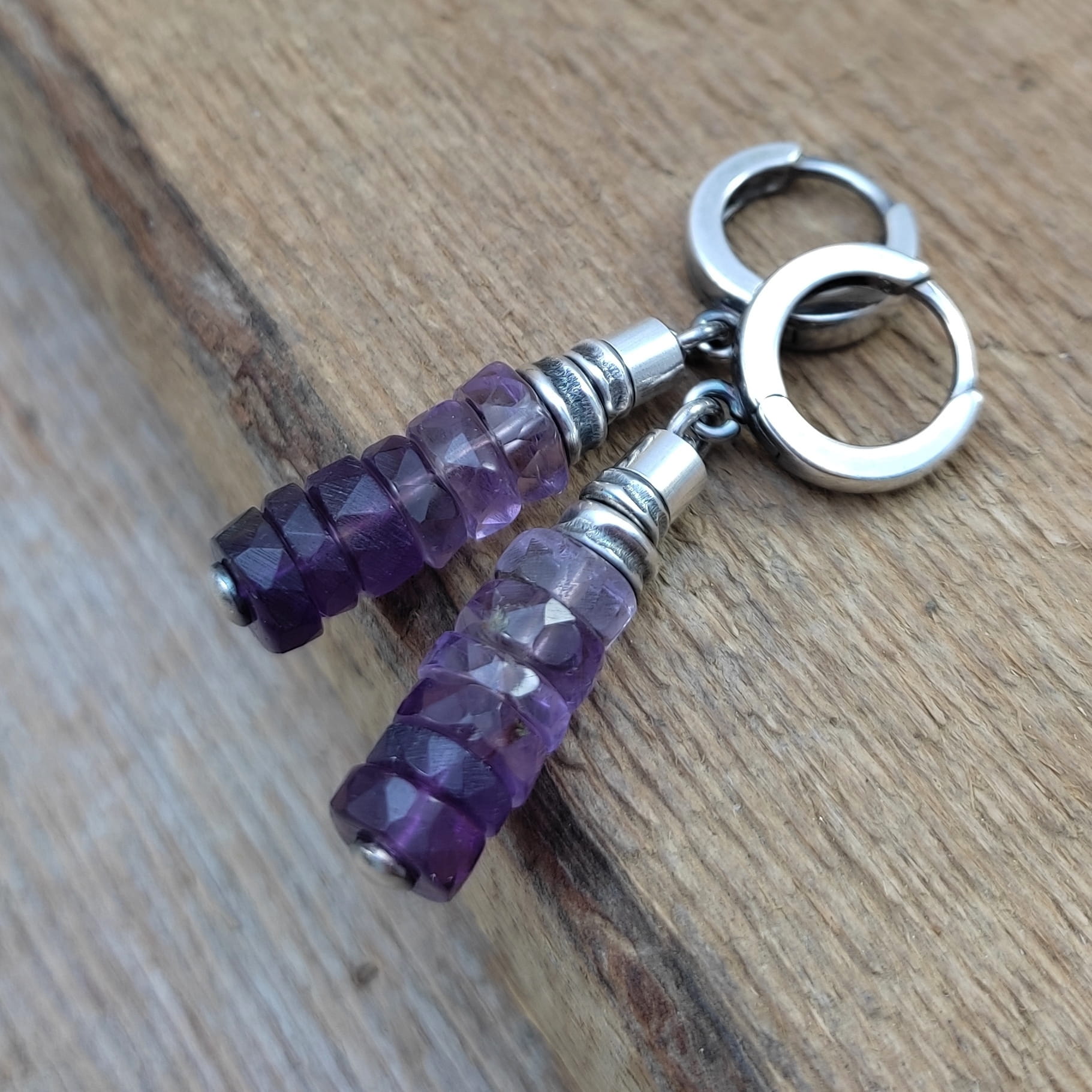 Kolczyki z talarkami ametystu o średnicy 7 mm. Kamienie posiadają niedoskonałości. Długość całkowita kolczyków wynosi ok. 4.2 cm. Kolczyki zostały wykonane w całości ze srebra 925, srebro oksydowane. Zapakowane w eleganckie pudełko.