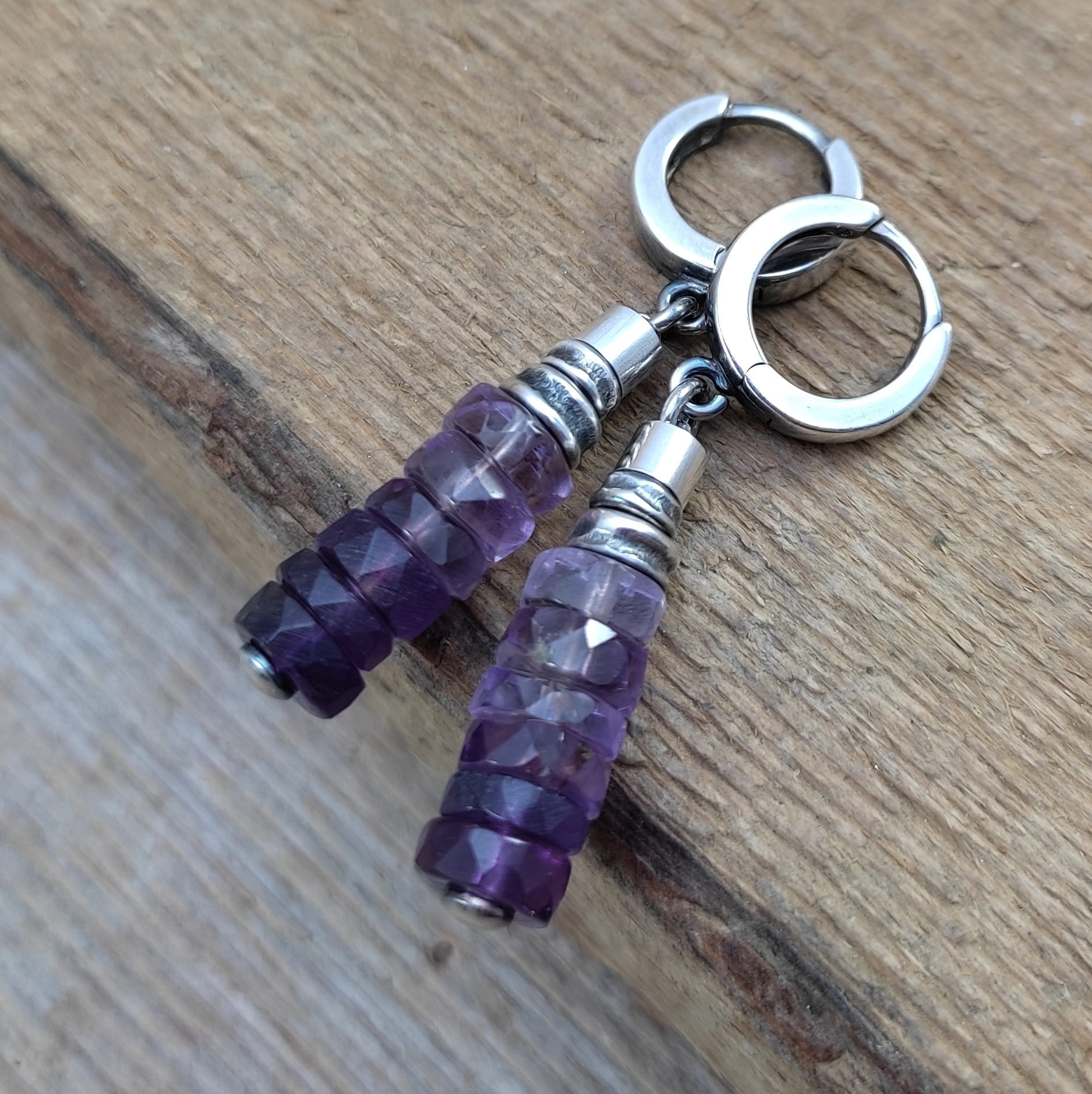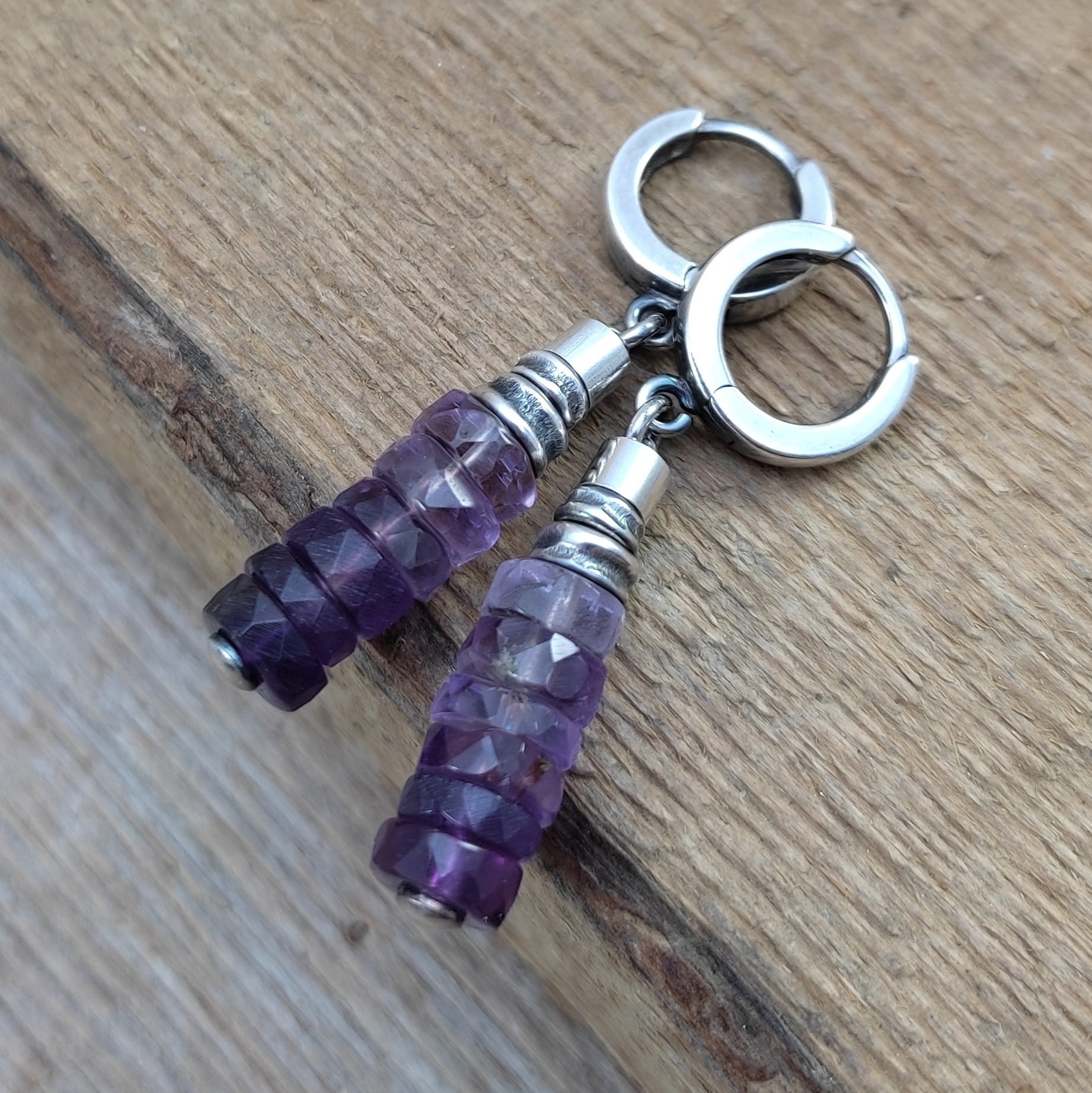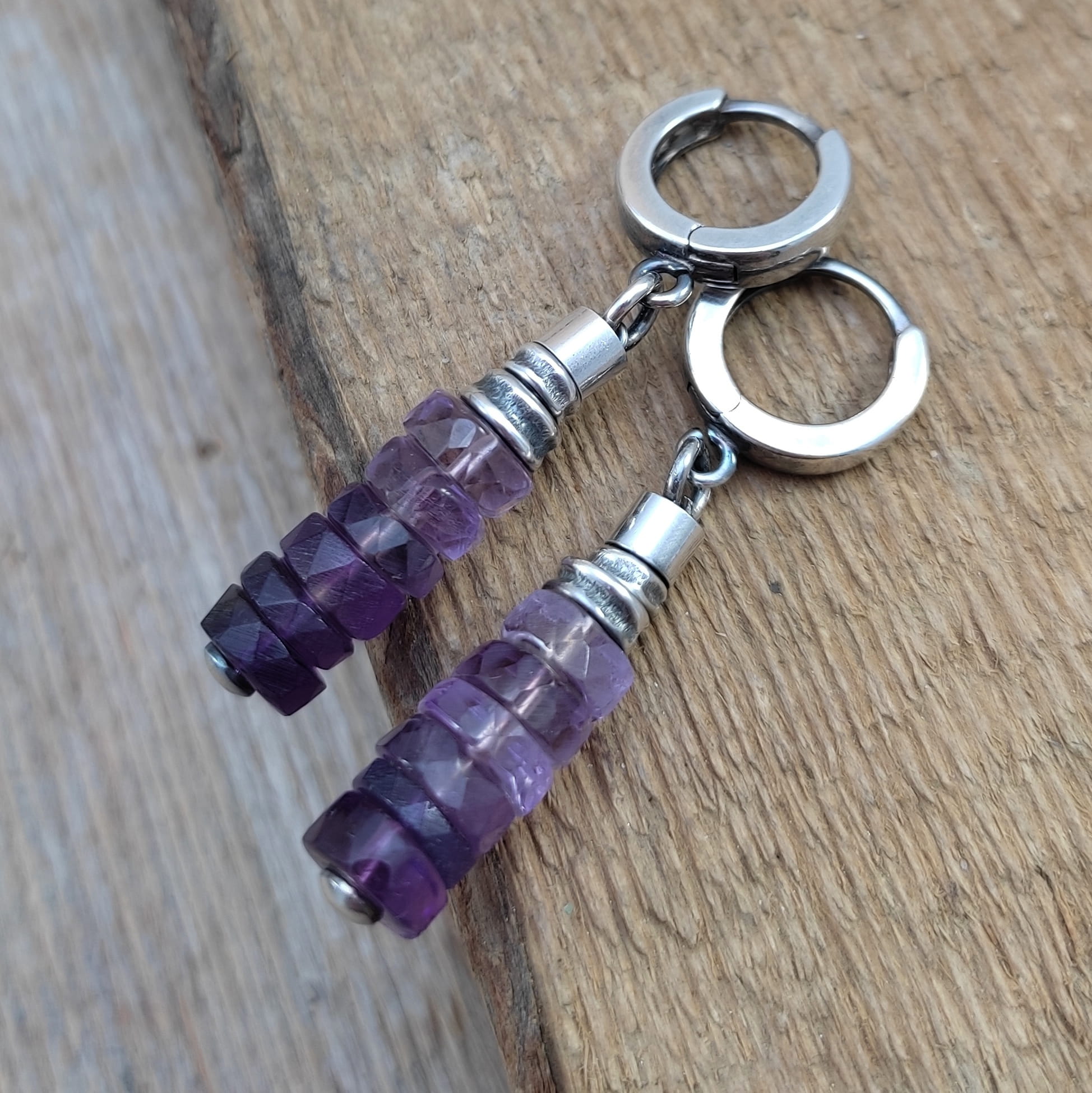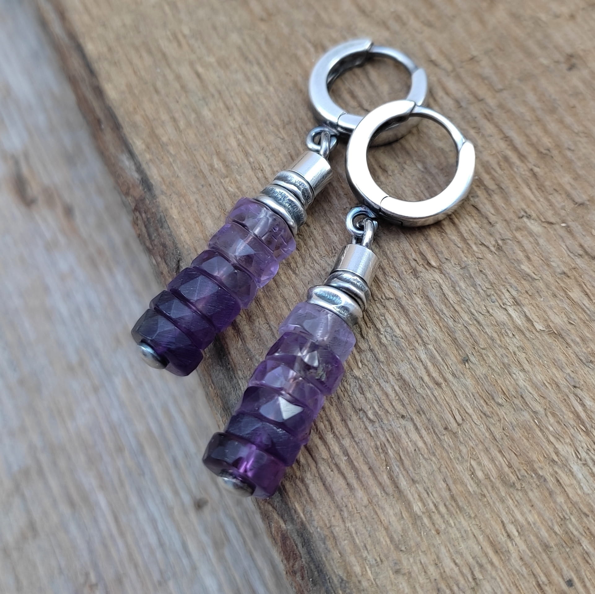 Kolczyki z talarkami ametystu o średnicy 7 mm. Kamienie posiadają niedoskonałości. Długość całkowita kolczyków wynosi ok. 4.2 cm. Kolczyki zostały wykonane w całości ze srebra 925, srebro oksydowane. Zapakowane w eleganckie pudełko.