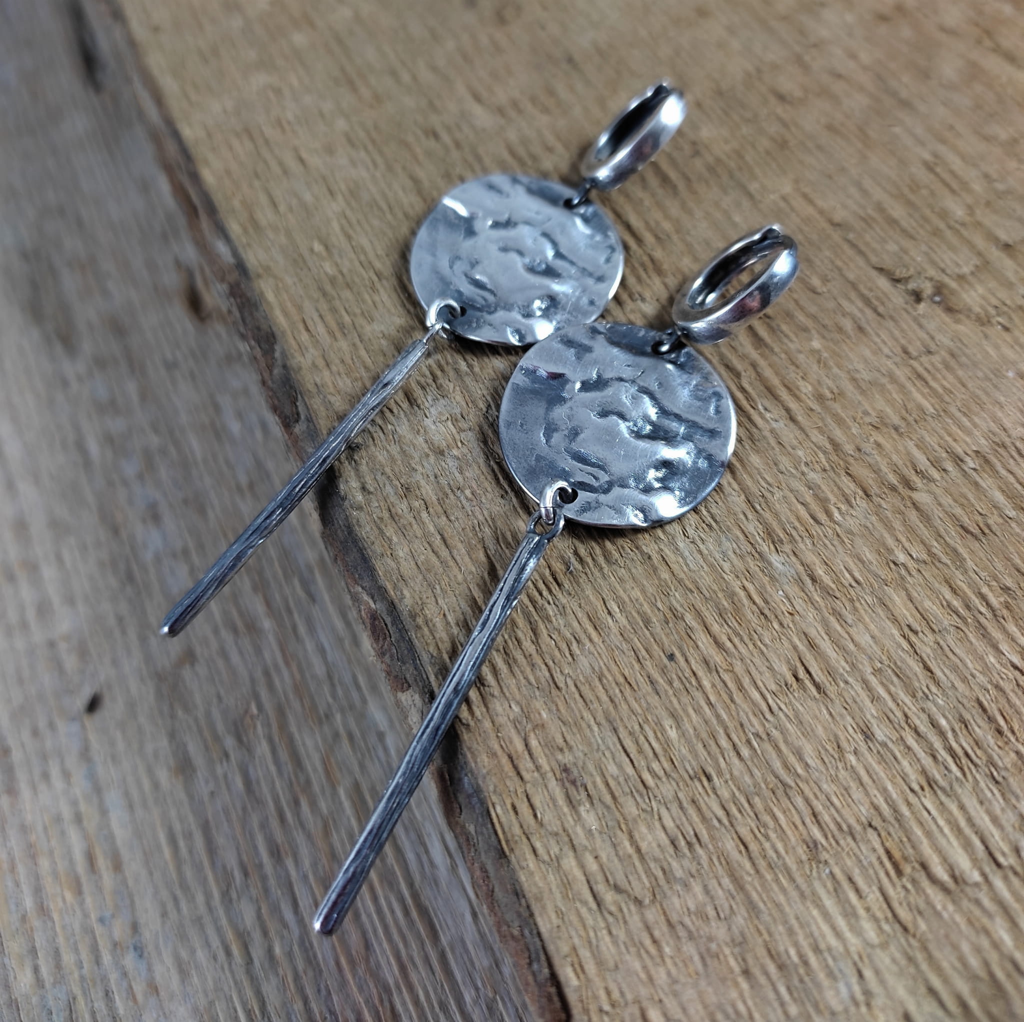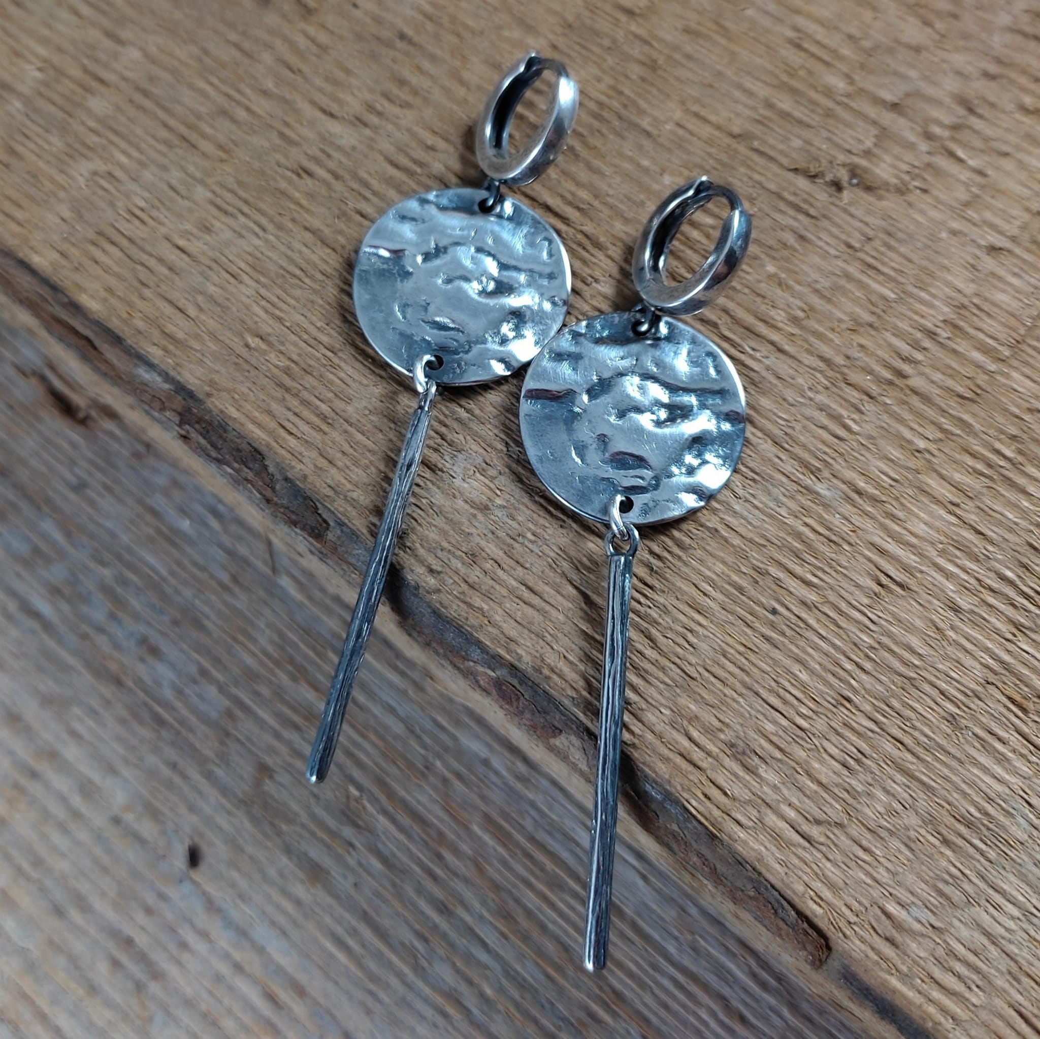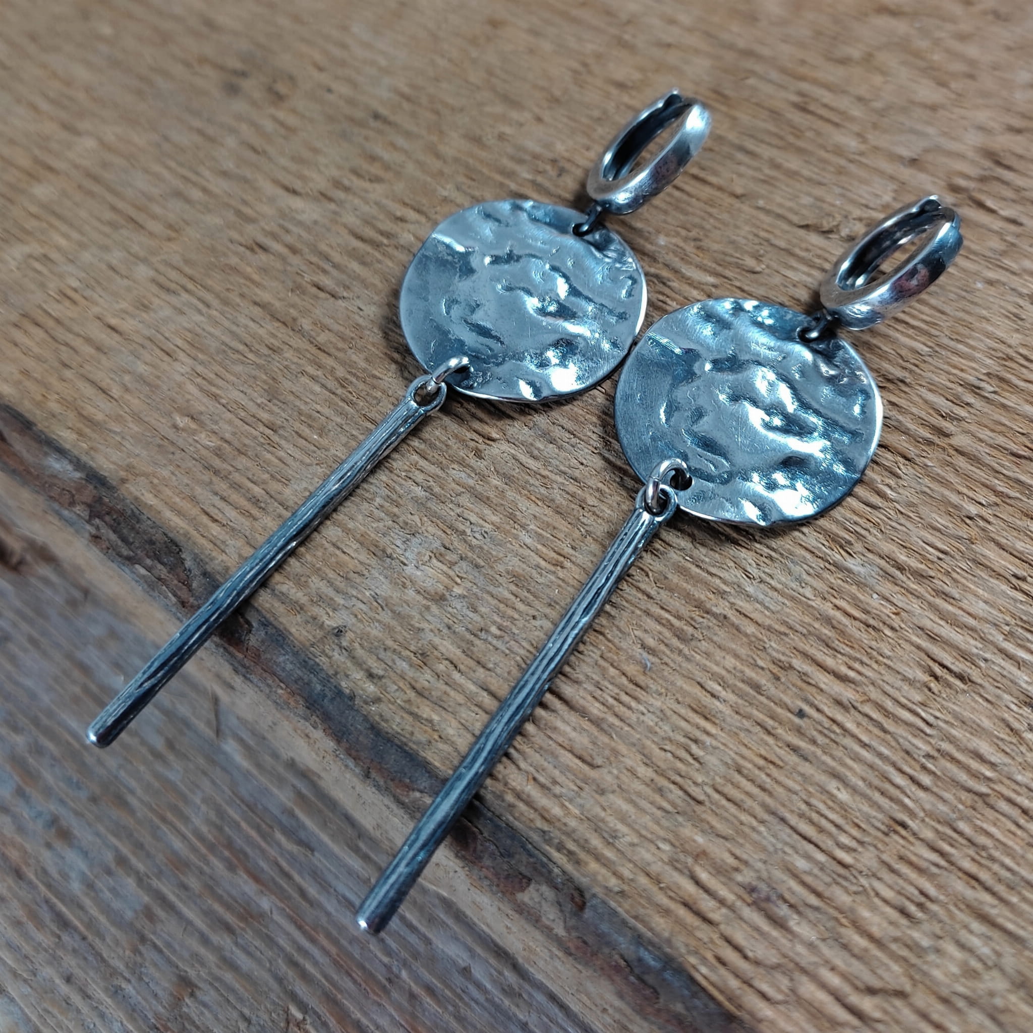 Kolczyki wykonane ze srebra 925, oksydowanego i wypolerowanego. Całkowita długość kolczyków wynosi ok. 6.6 cm. Wielkość srebrnych elementów/kół ok. 19 mm. Elegancko zapakowane.