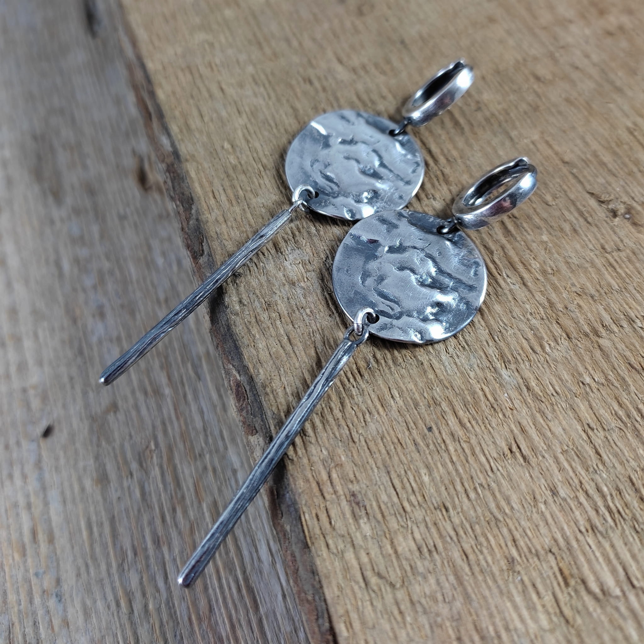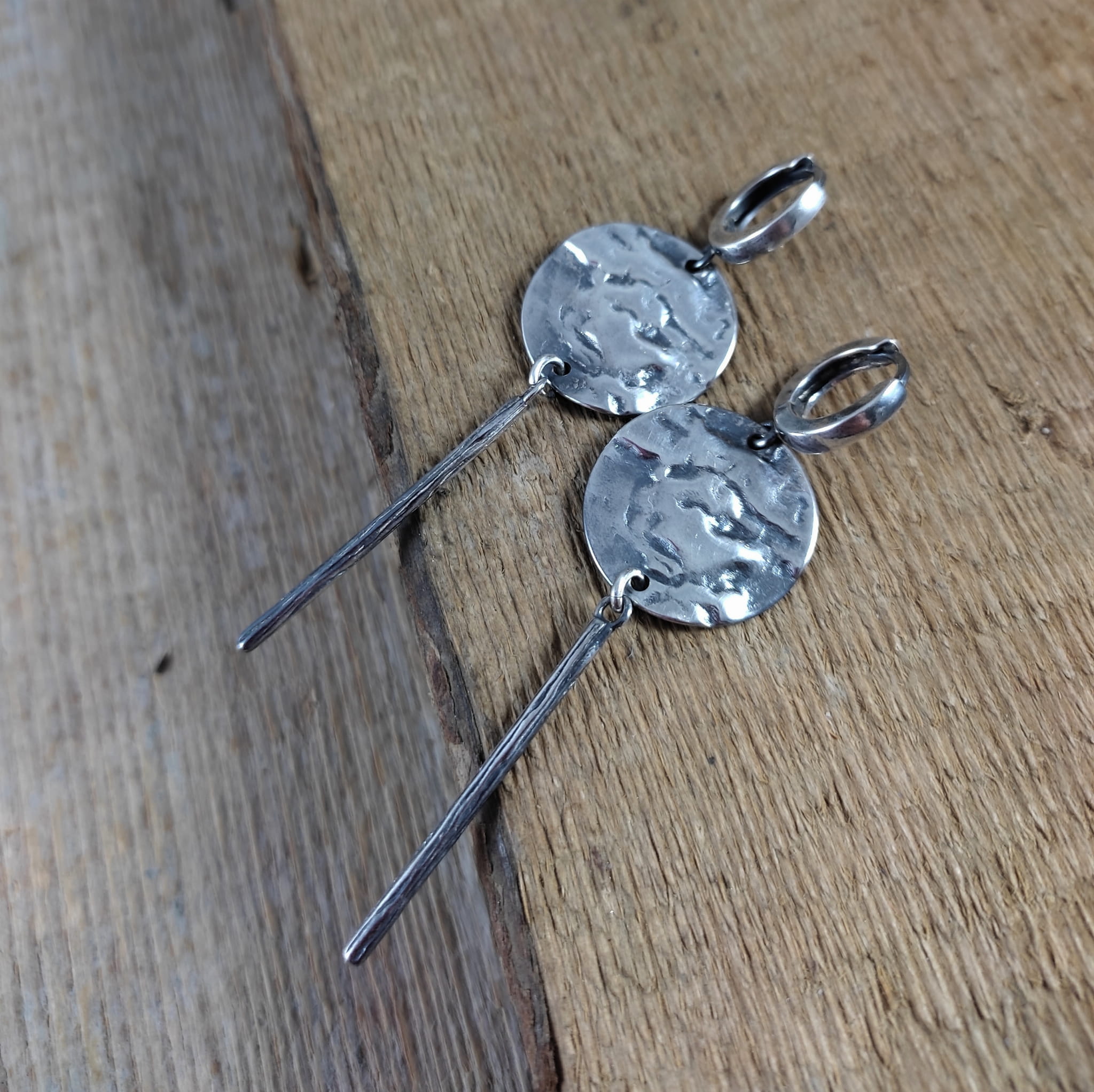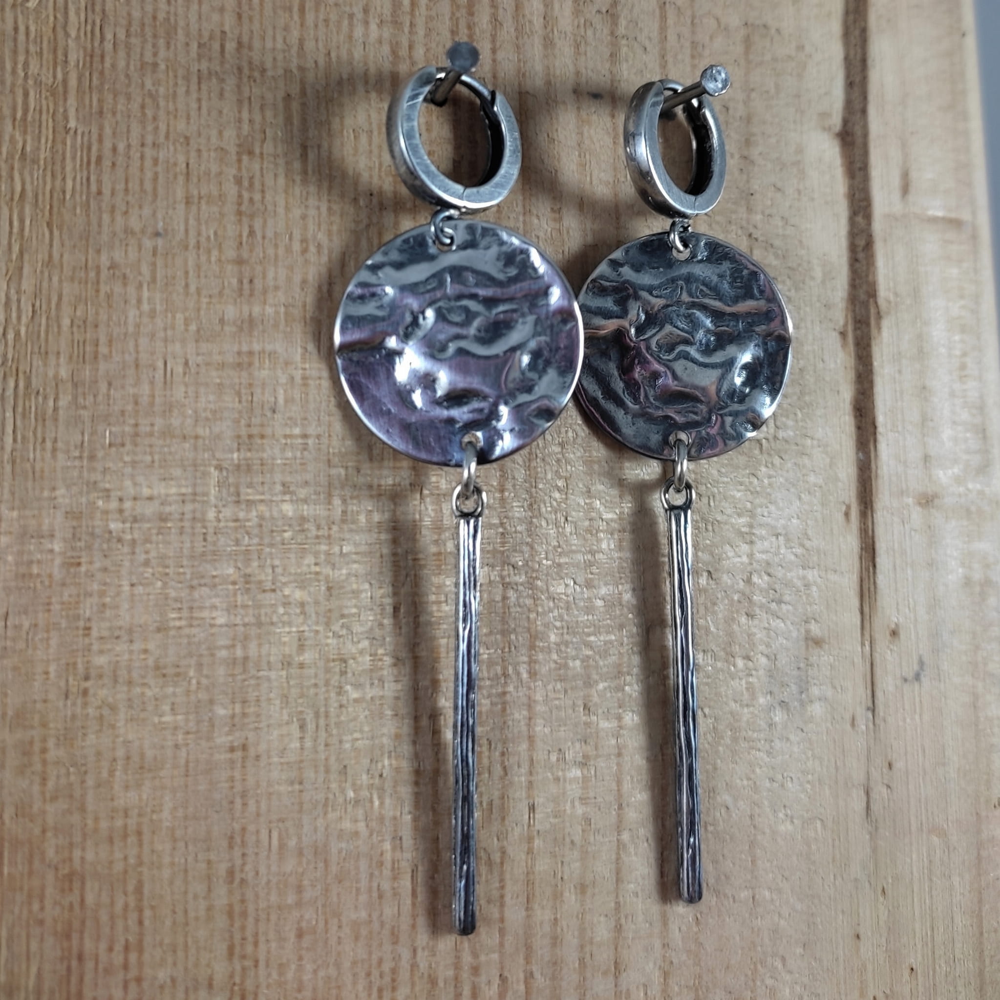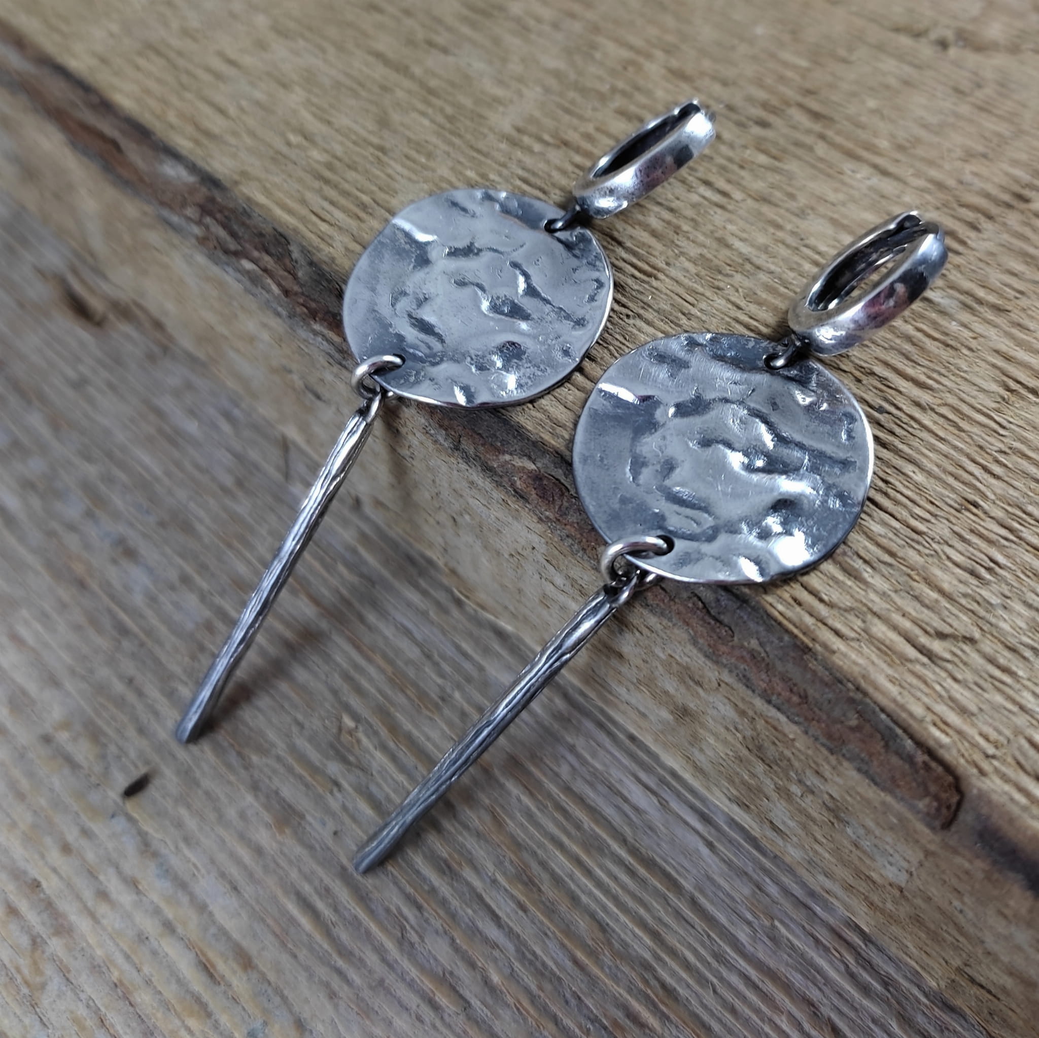 Kolczyki wykonane ze srebra 925, oksydowanego i wypolerowanego. Całkowita długość kolczyków wynosi ok. 6.6 cm. Wielkość srebrnych elementów/kół ok. 19 mm. Elegancko zapakowane.