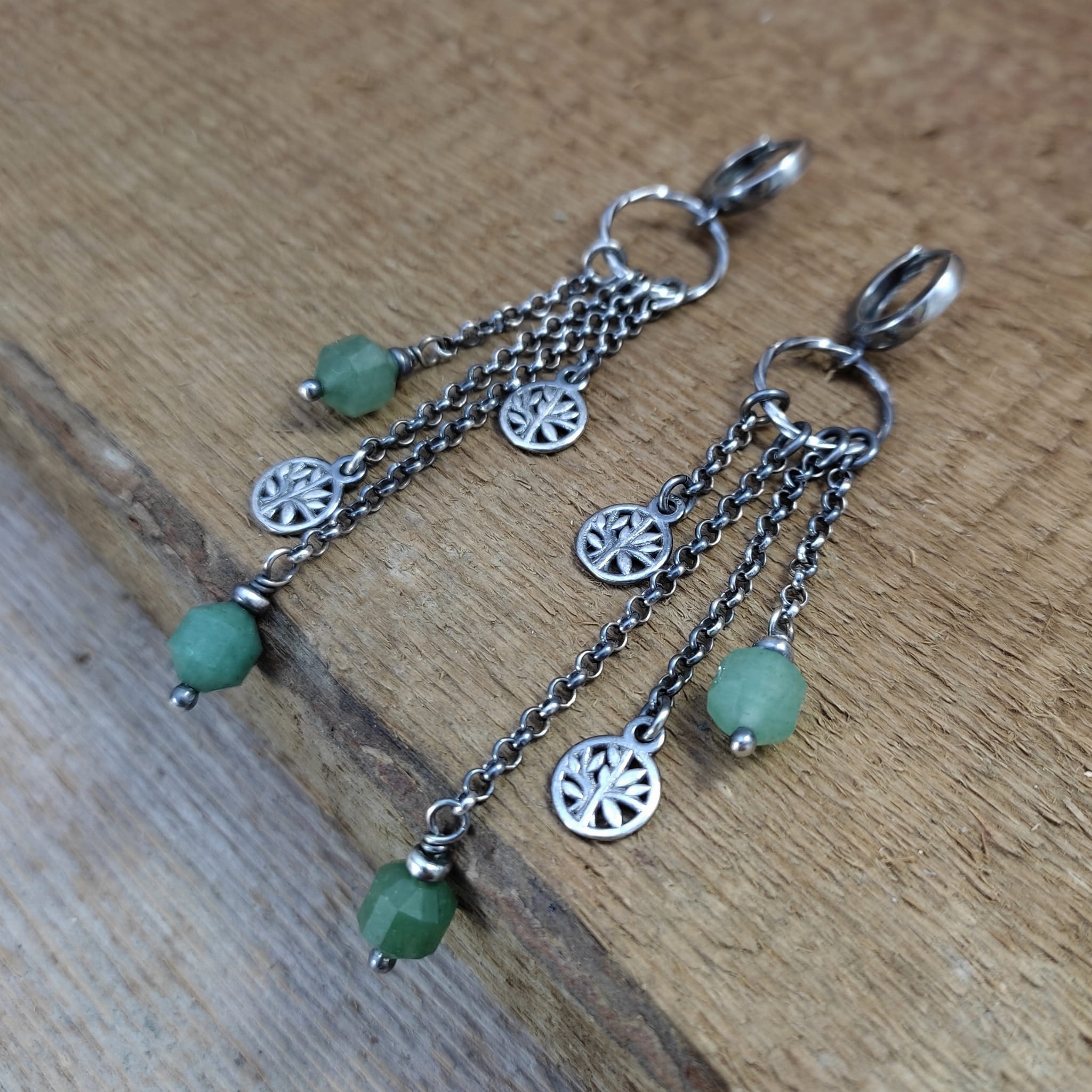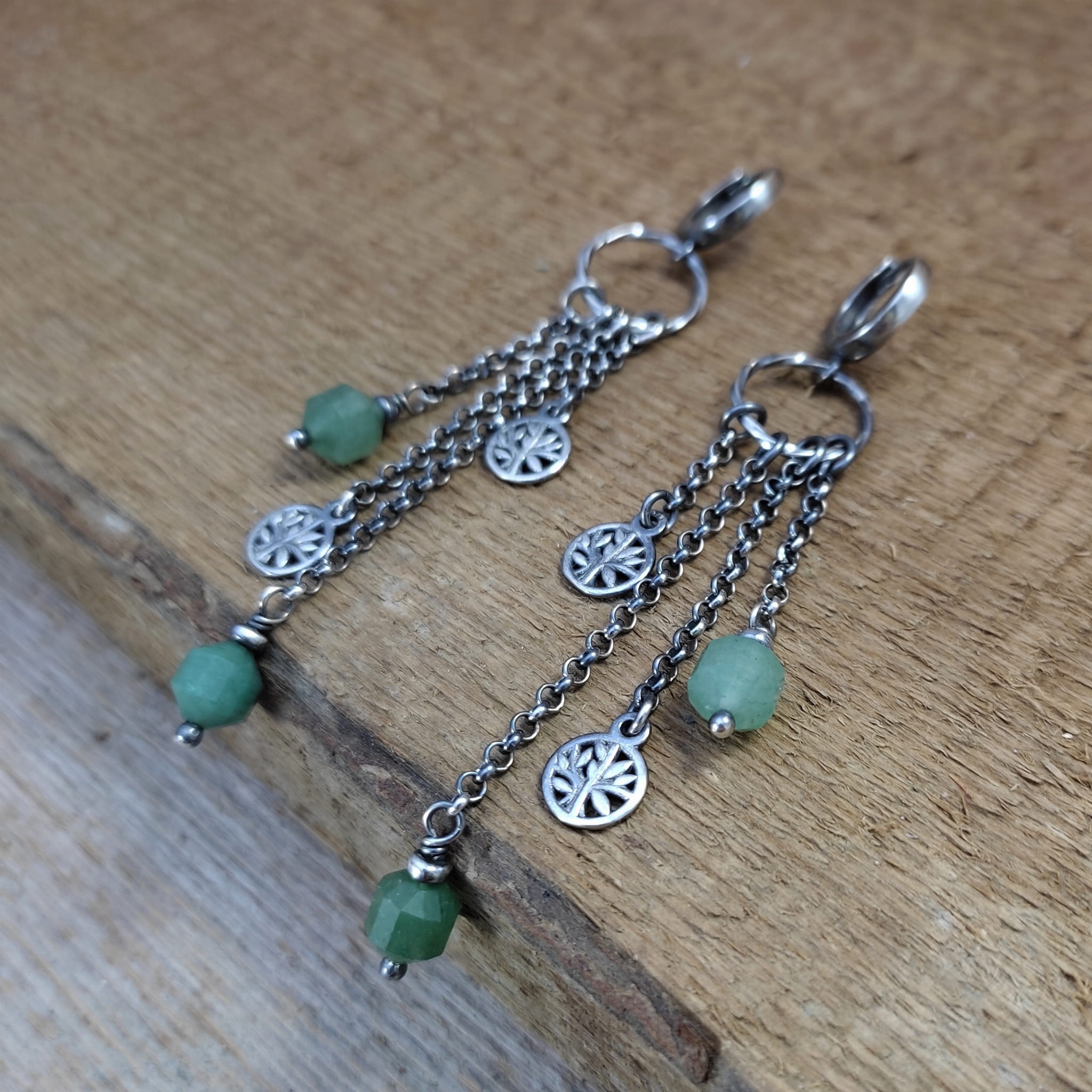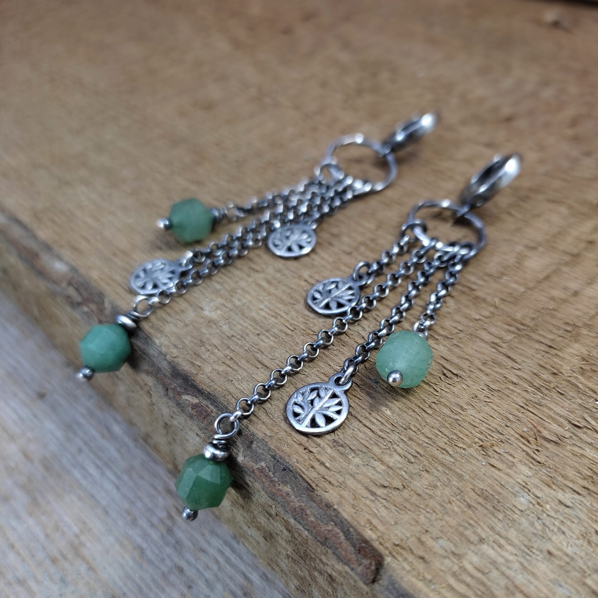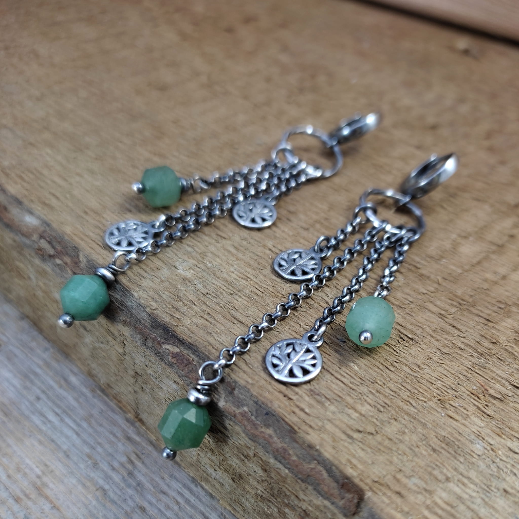 Kolczyki z bryłkami fasetowanego awenturynu. Fasetowany awenturyn o wymiarach 6,5/8 mm. Kamienie mogą posiadać delikatne niedoskonałości. Długość całkowita kolczyków wynosi ok. 82 mm. Kolczyki zostały wykonane w całości ze srebra 925, srebro oksydowane. Zapakowane w eleganckie pudełko.