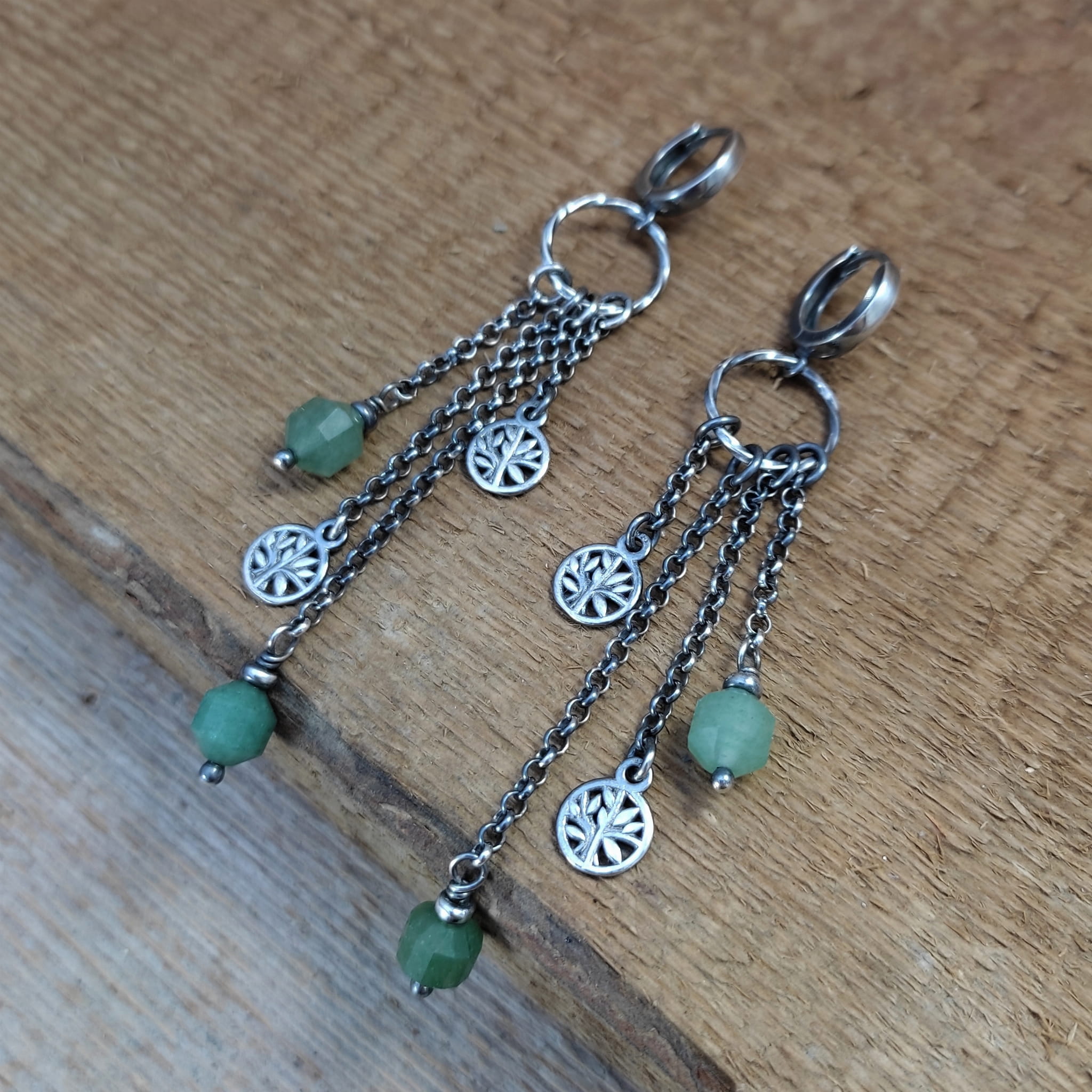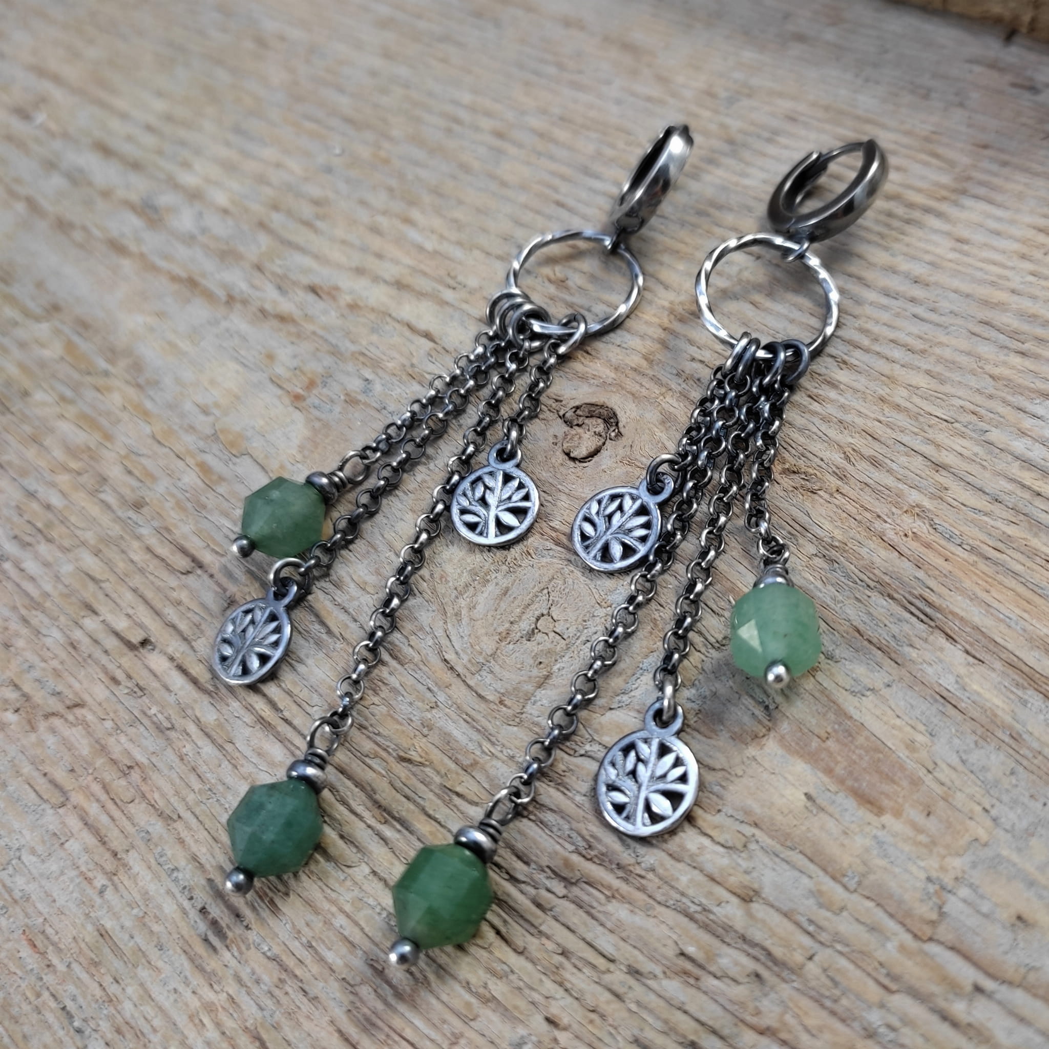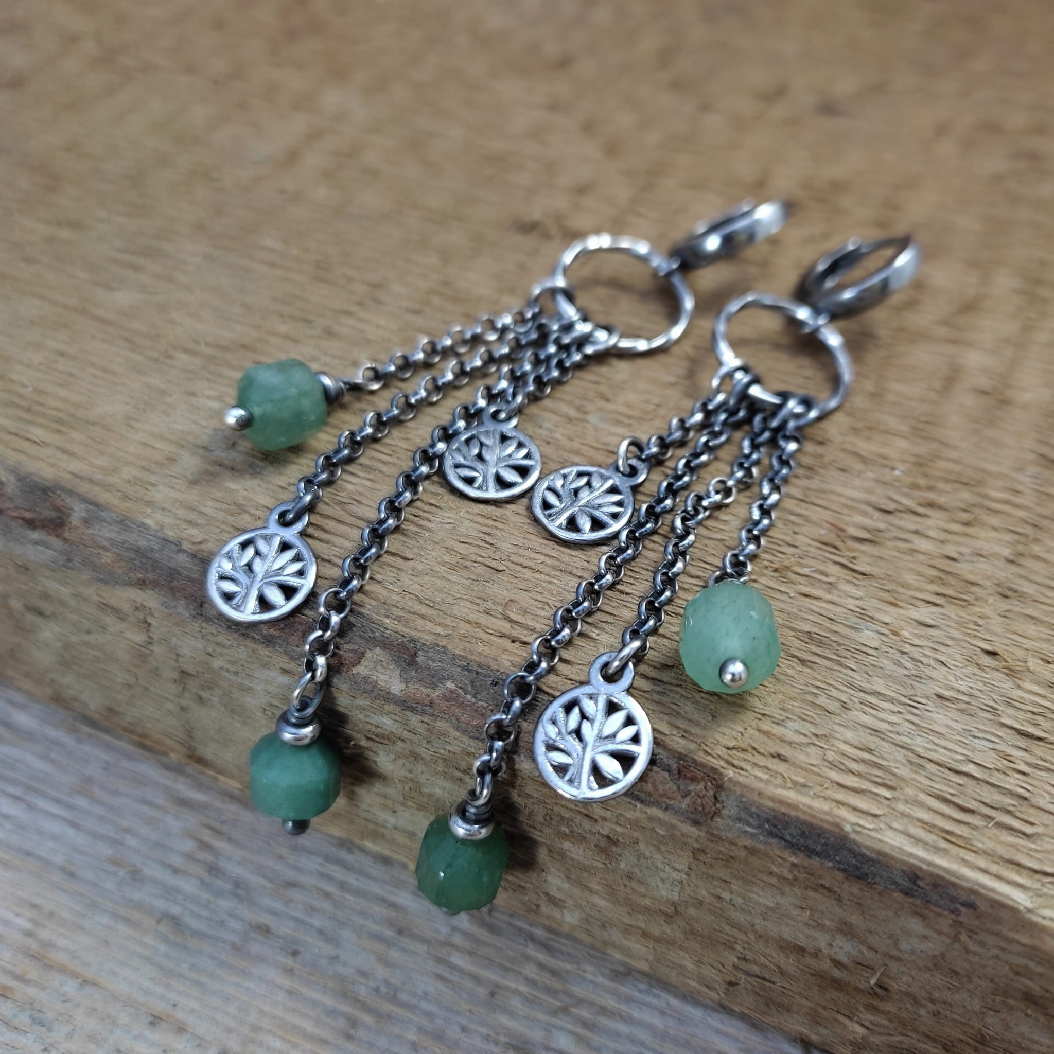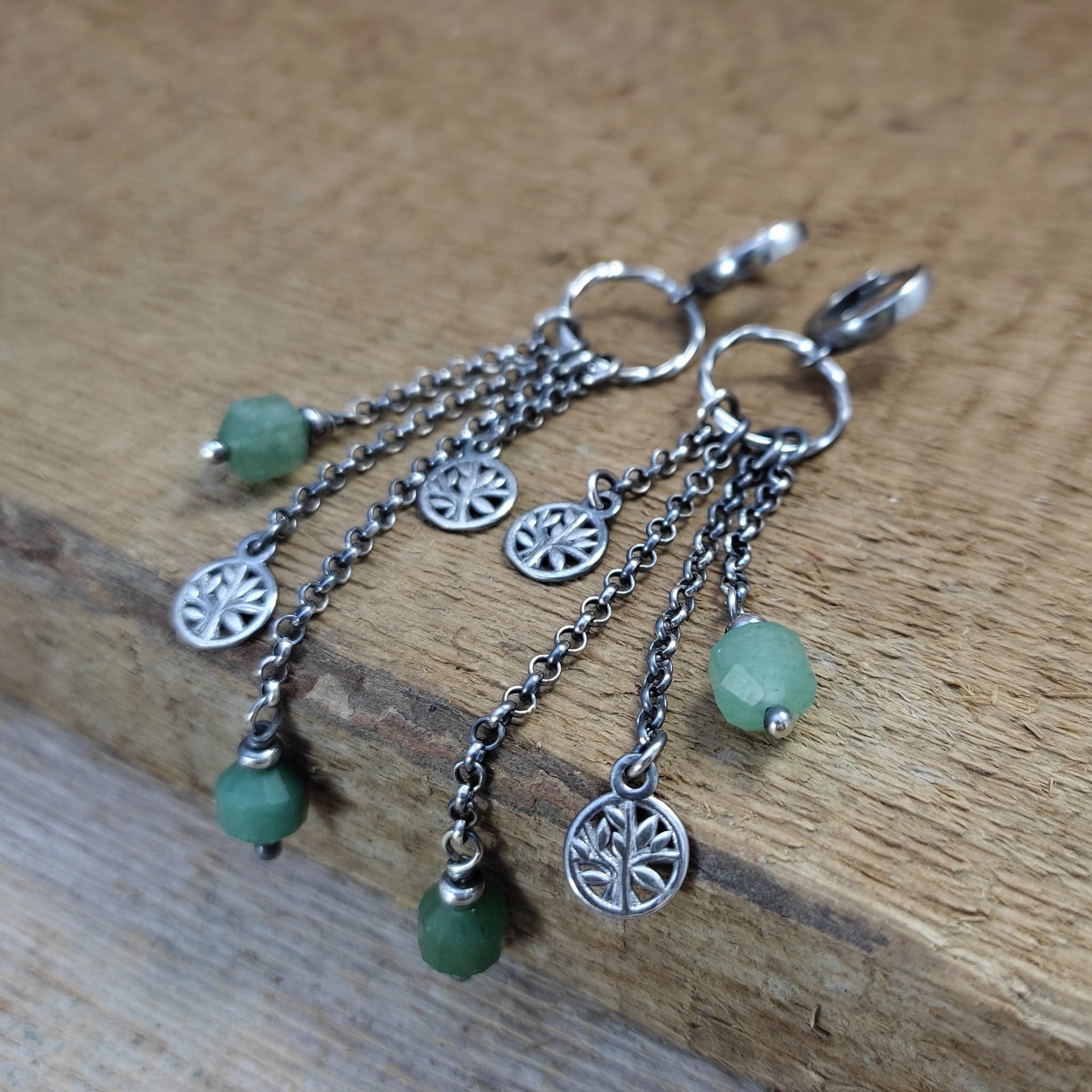 Kolczyki z bryłkami fasetowanego awenturynu. Fasetowany awenturyn o wymiarach 6,5/8 mm. Kamienie mogą posiadać delikatne niedoskonałości. Długość całkowita kolczyków wynosi ok. 82 mm. Kolczyki zostały wykonane w całości ze srebra 925, srebro oksydowane. Zapakowane w eleganckie pudełko.