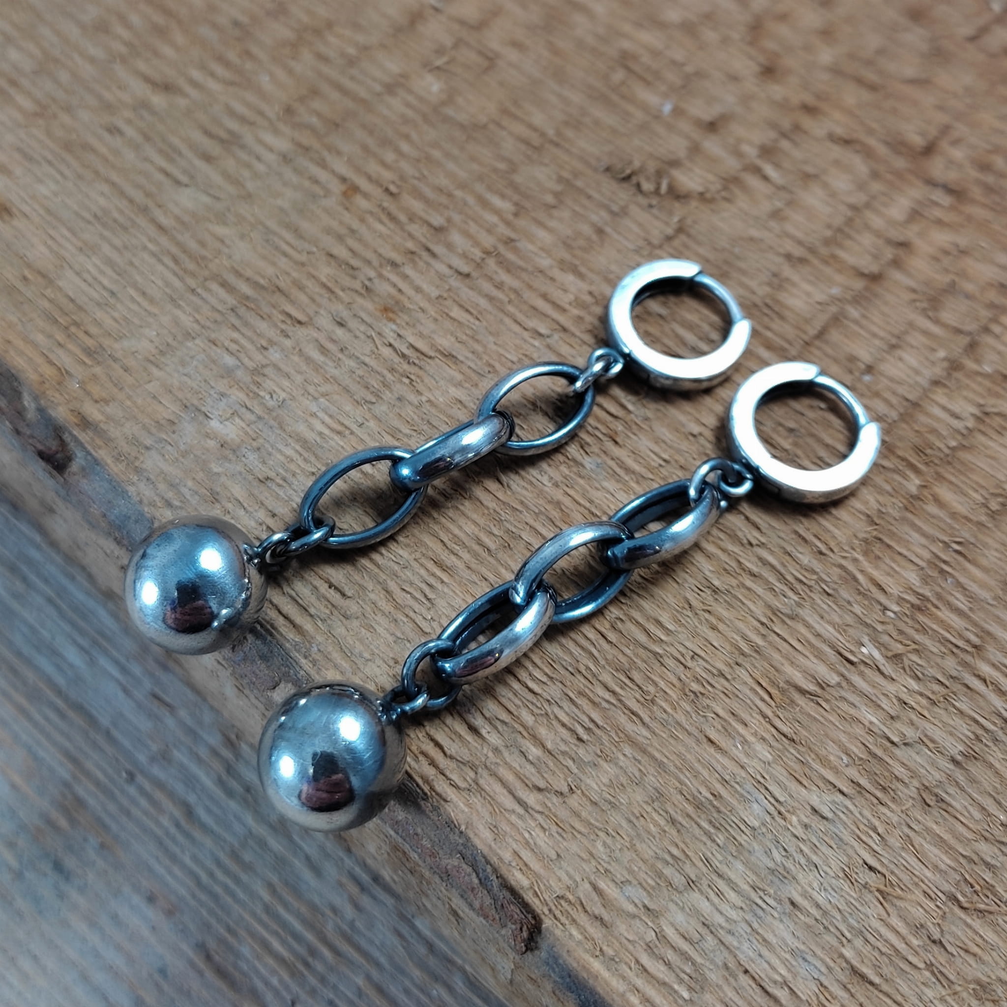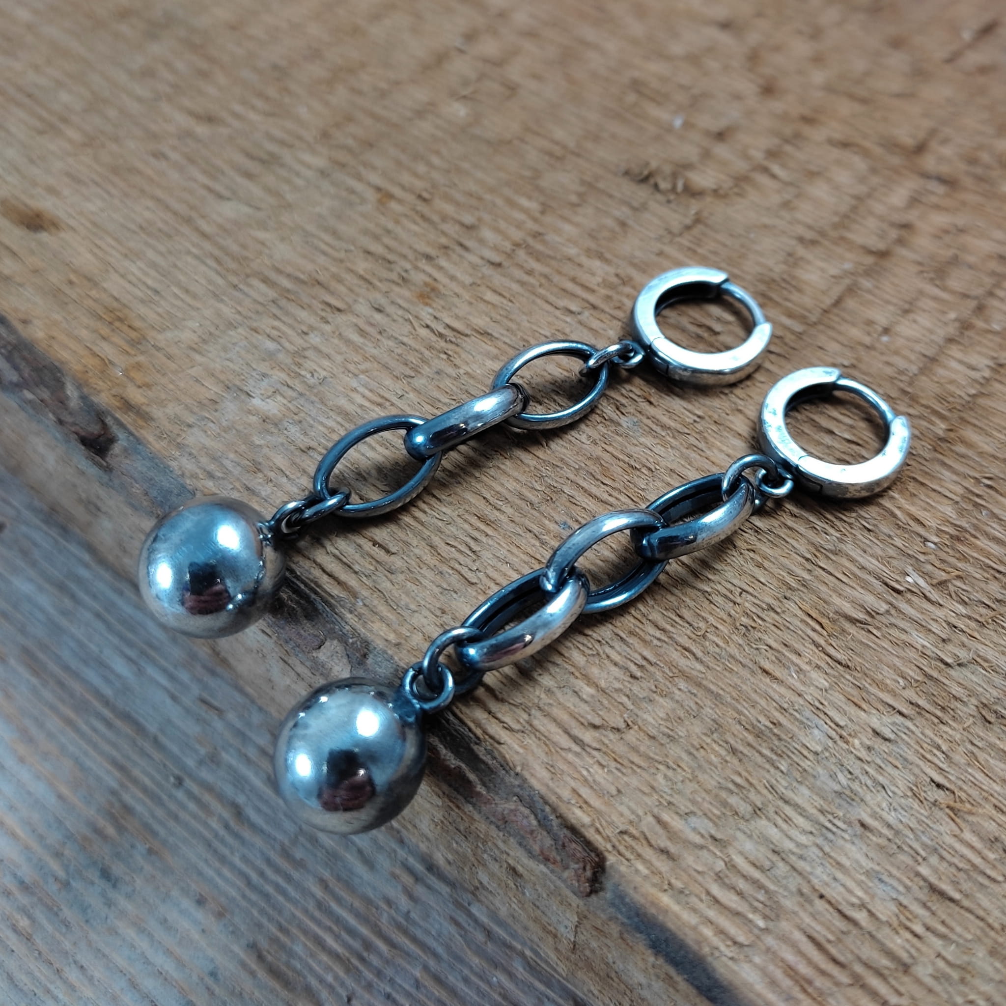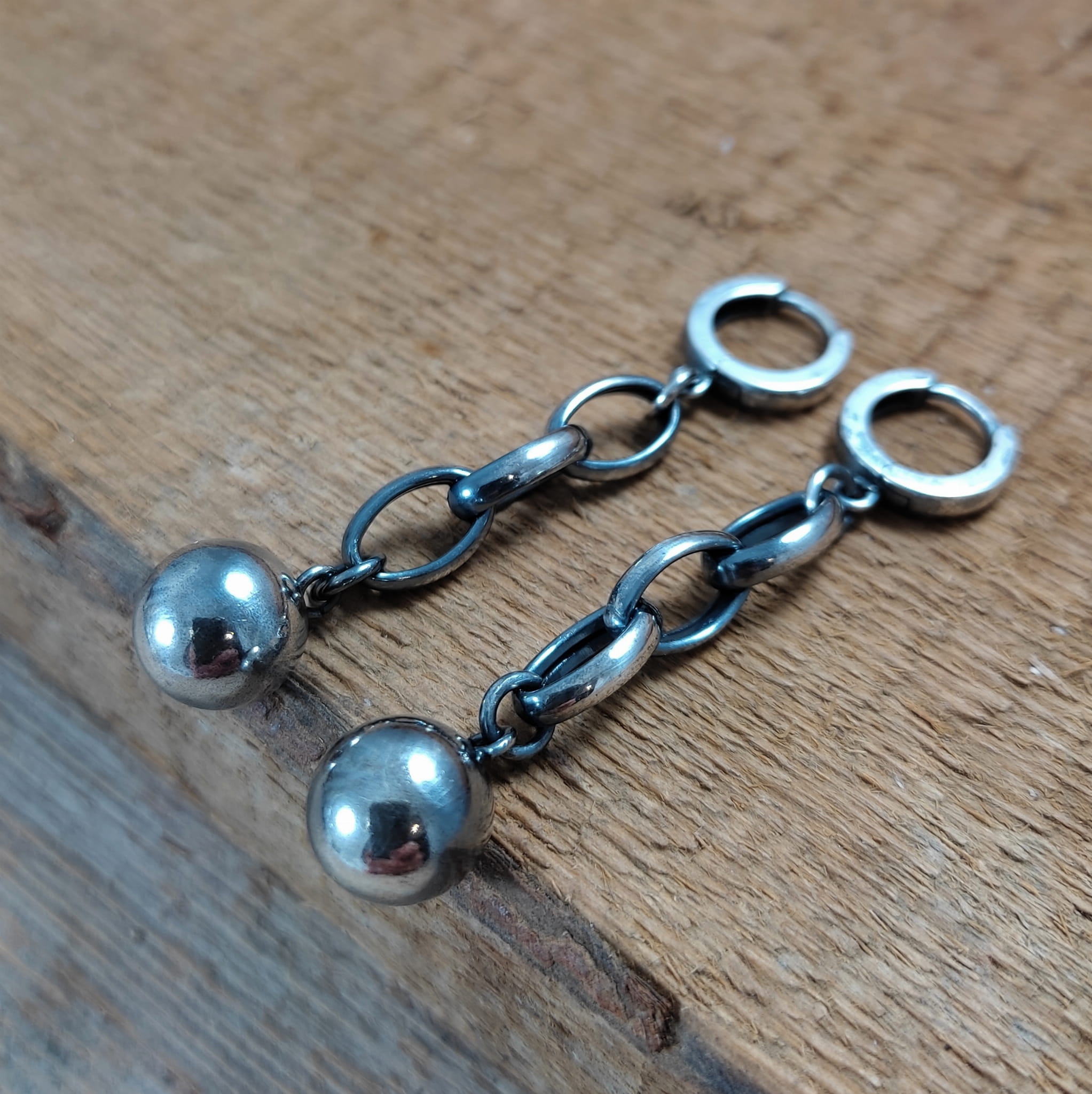 Kolczyki wykonane ze srebra 925, oksydowanego i wypolerowanego. Wielkość kuli ok 10 mm. Całkowita długość kolczyków wynosi ok. 5,6 cm. Elegancko zapakowane.