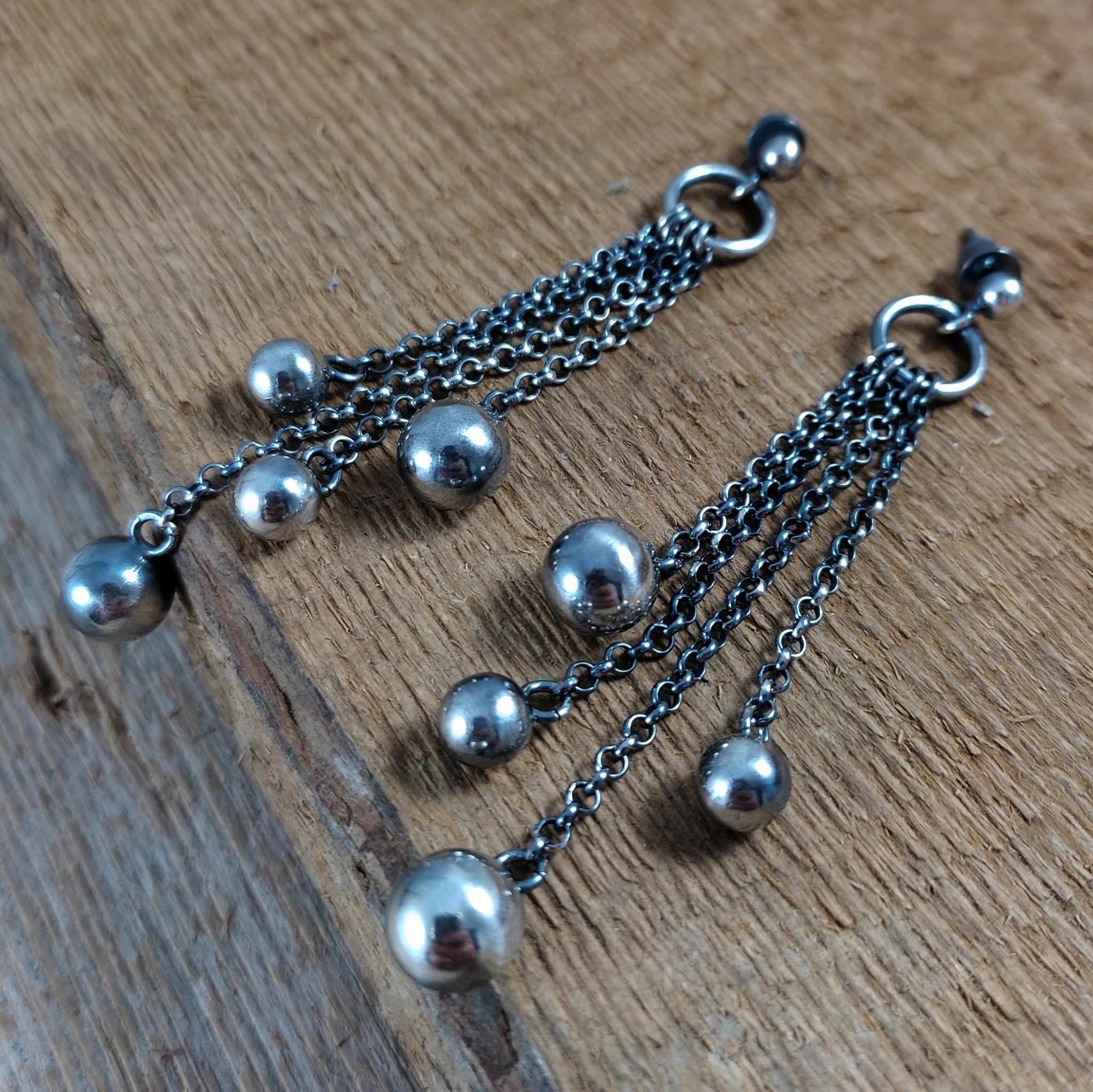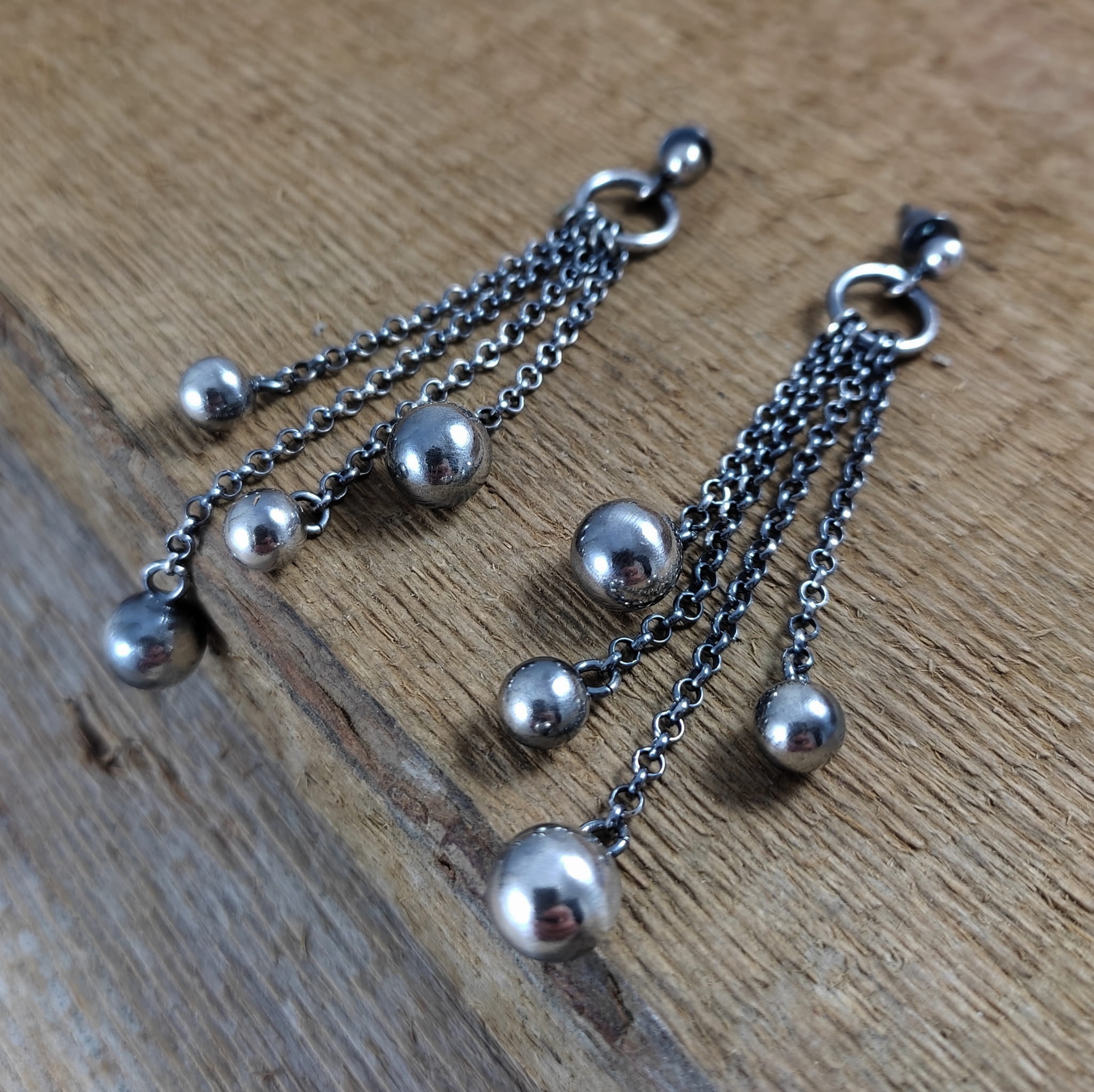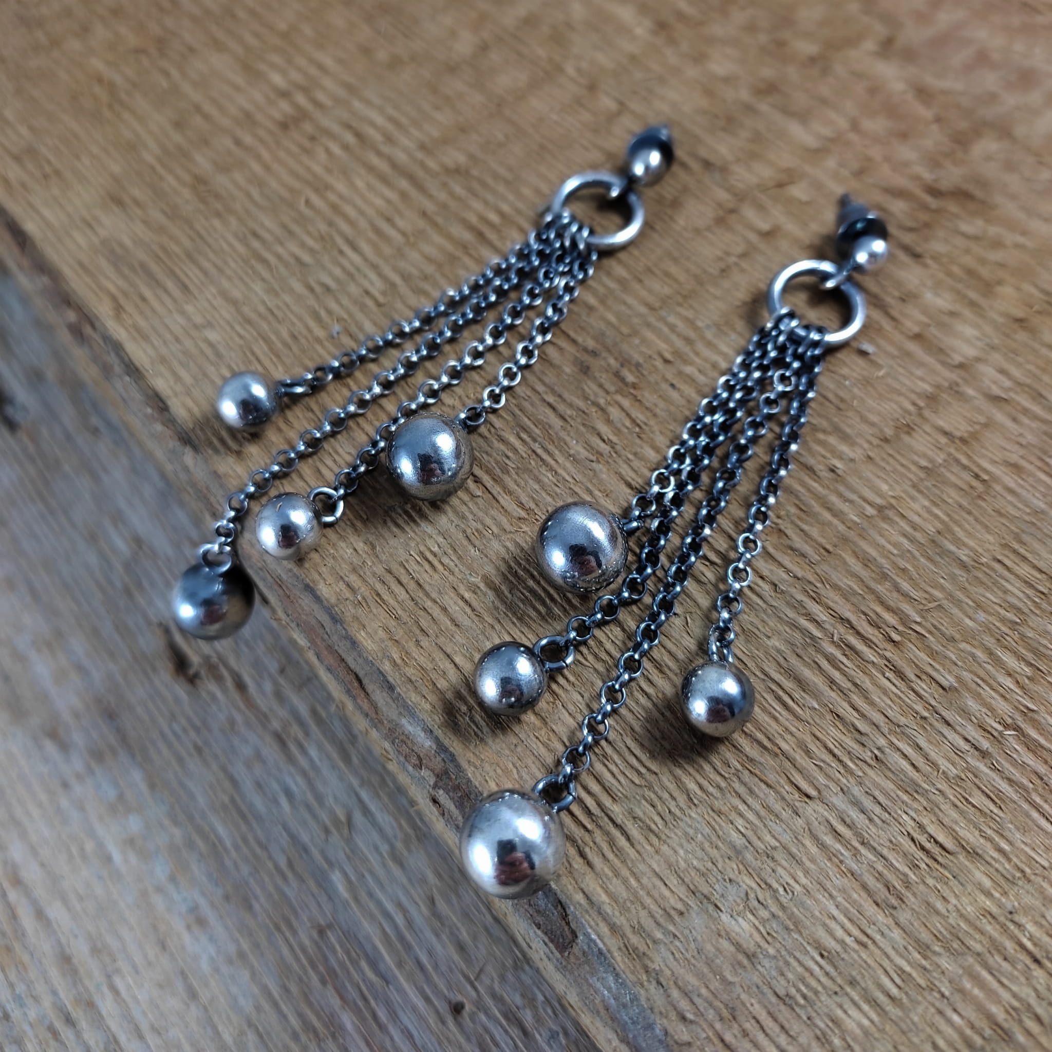Kolczyki wykonane ze srebra 925, oksydowanego i wypolerowanego. Całkowita długość kolczyków wynosi ok. 7,5 cm. Wielkość kul 6-8 mm. Elegancko zapakowane.