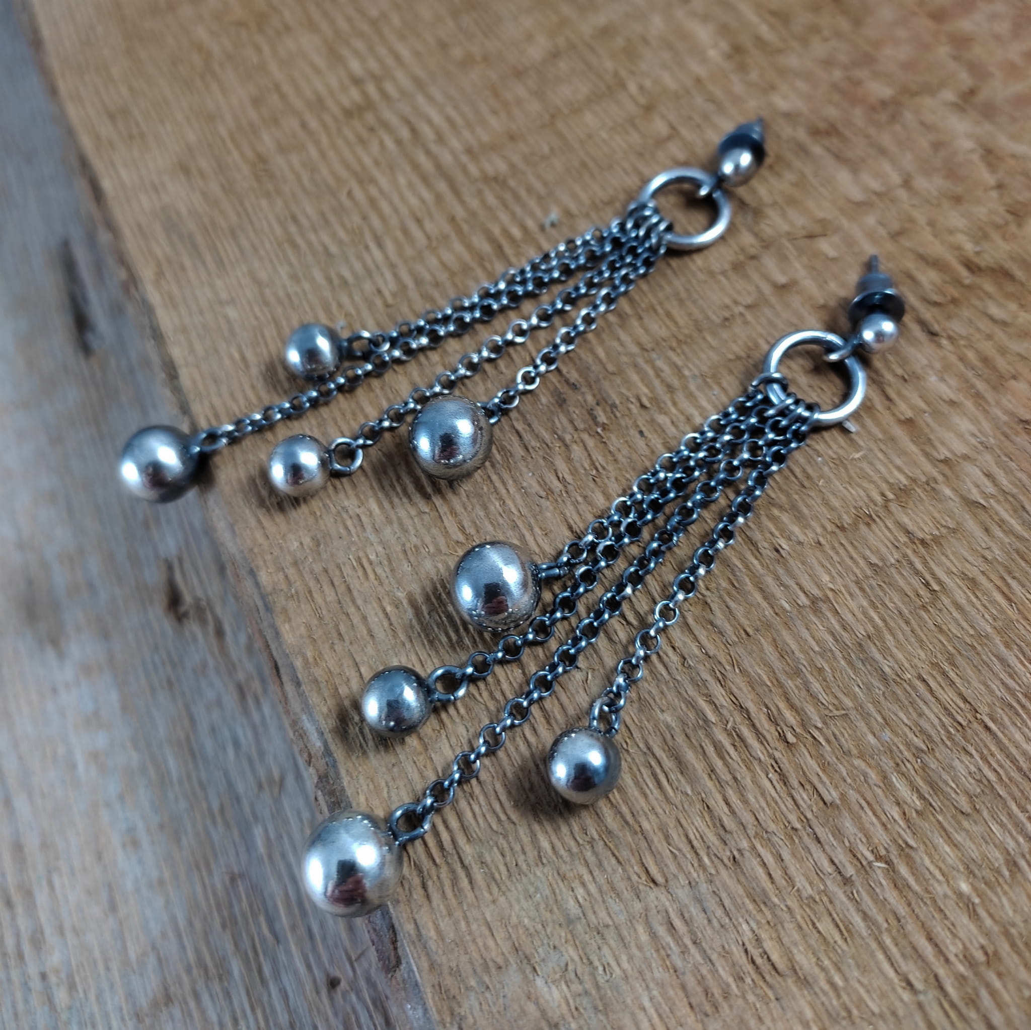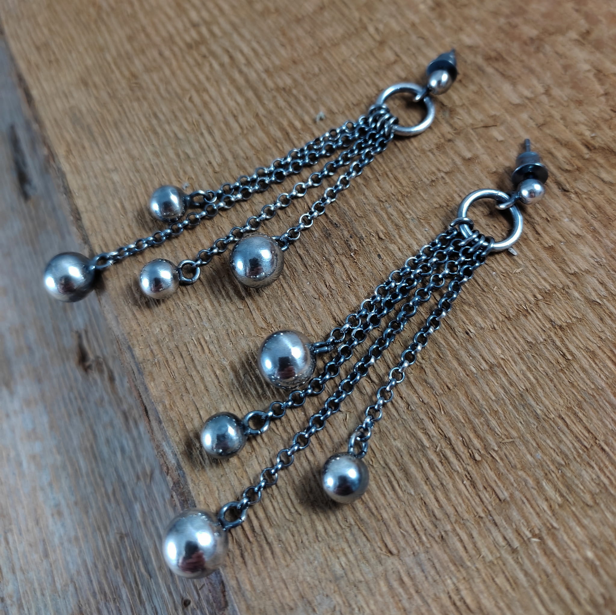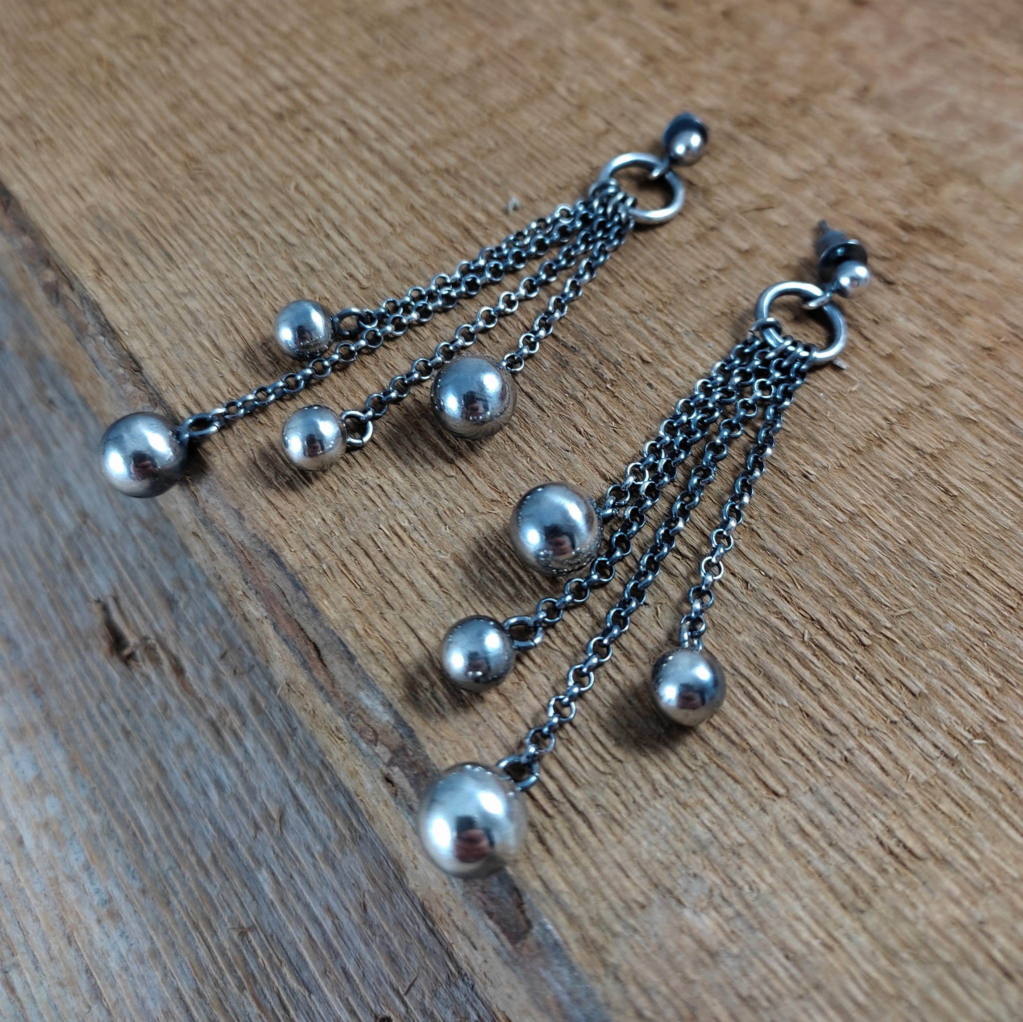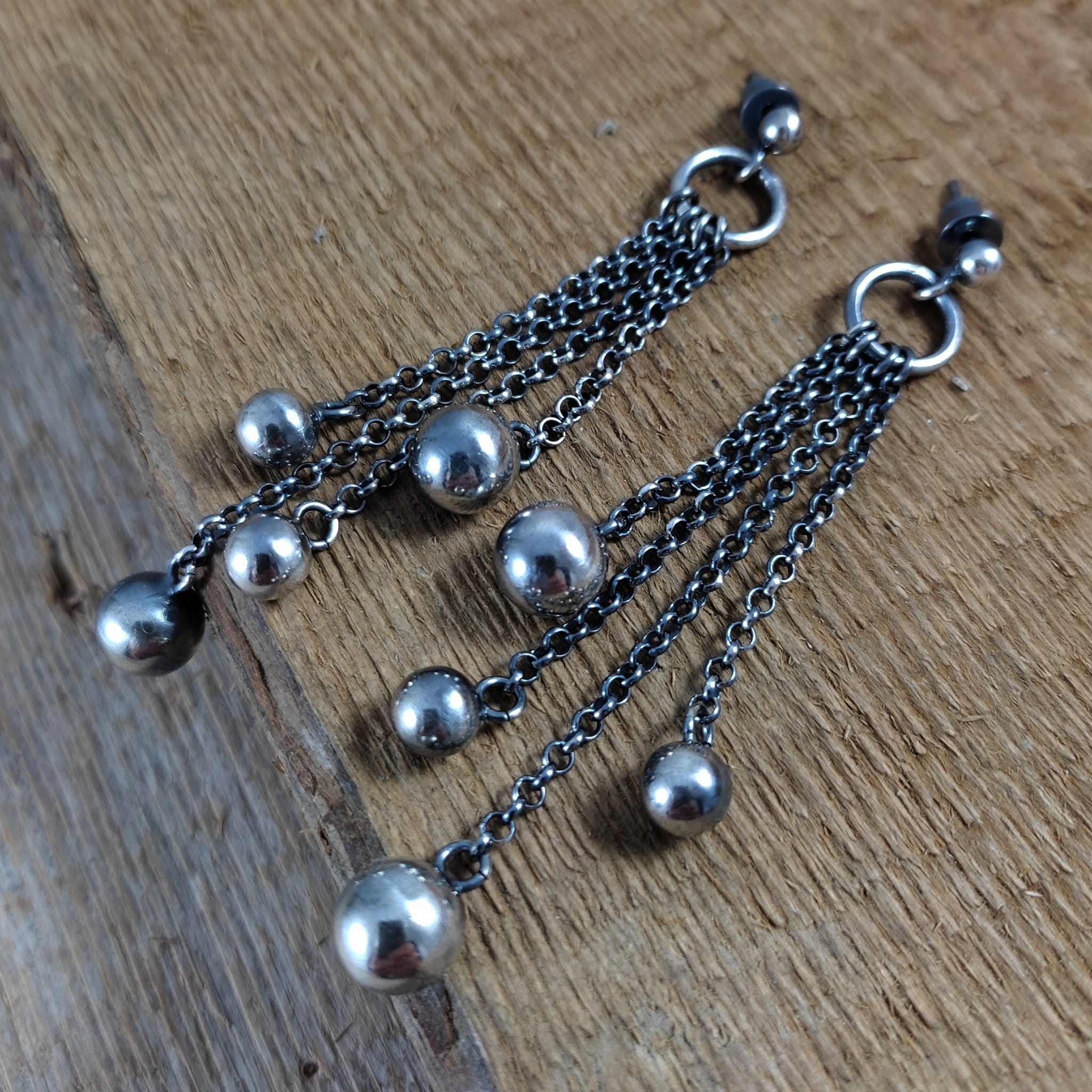 Kolczyki wykonane ze srebra 925, oksydowanego i wypolerowanego. Całkowita długość kolczyków wynosi ok. 7,5 cm. Wielkość kul 6-8 mm. Elegancko zapakowane.