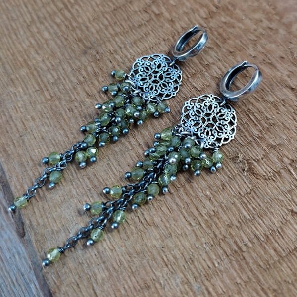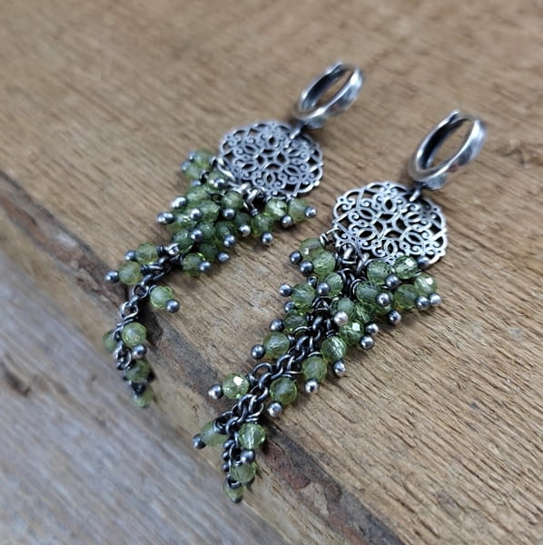 Kolczyki z kulami fasetowanego peridotu. Fasetowany peridot o średnicy 3 mm. Kamienie posiadają niedoskonałości. Długość całkowita kolczyków wynosi ok. 7,2 cm. Kolczyki zostały wykonane w całości ze srebra 925, srebro oksydowane. Zapakowane w eleganckie pudełko.