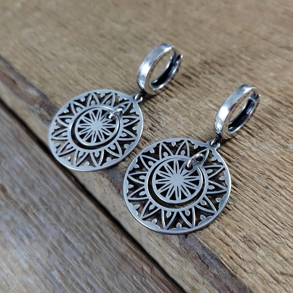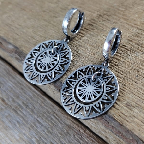 Kolczyki wykonane z oksydowanego i wypolerowanego srebra 925. Wielkość blaszki z ażurowym akcentem: 22,1/20,2 mm. Bigle typu kajdanki. Całkowita długość kolczyków wynosi ok. 3 cm. Elegancko zapakowane.