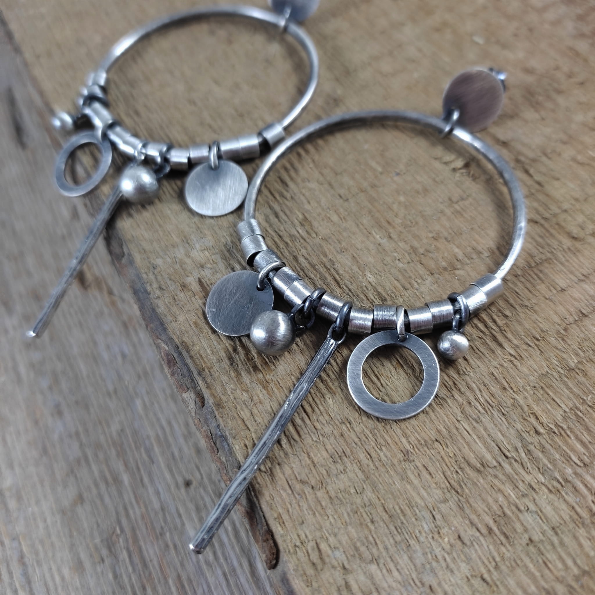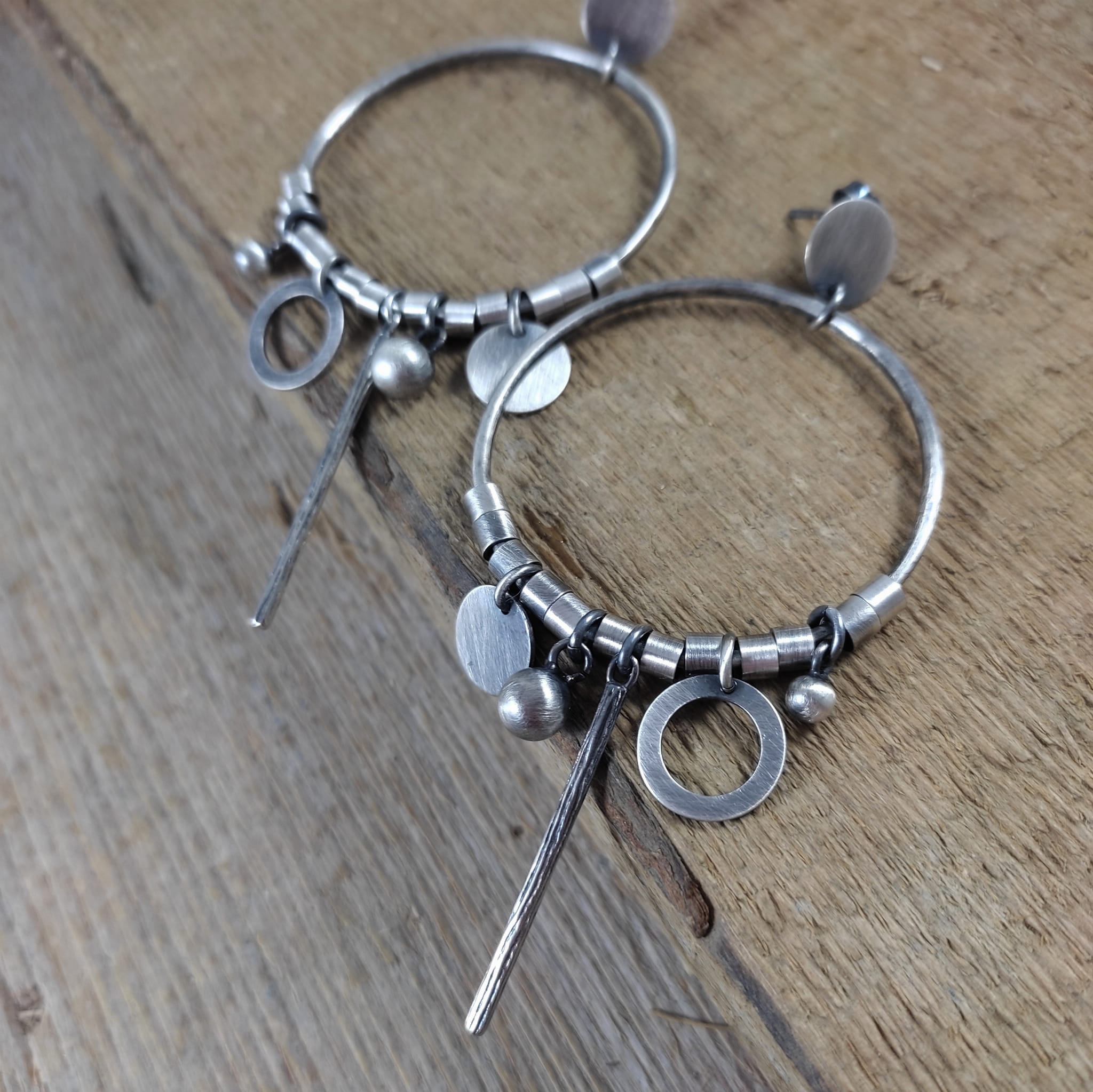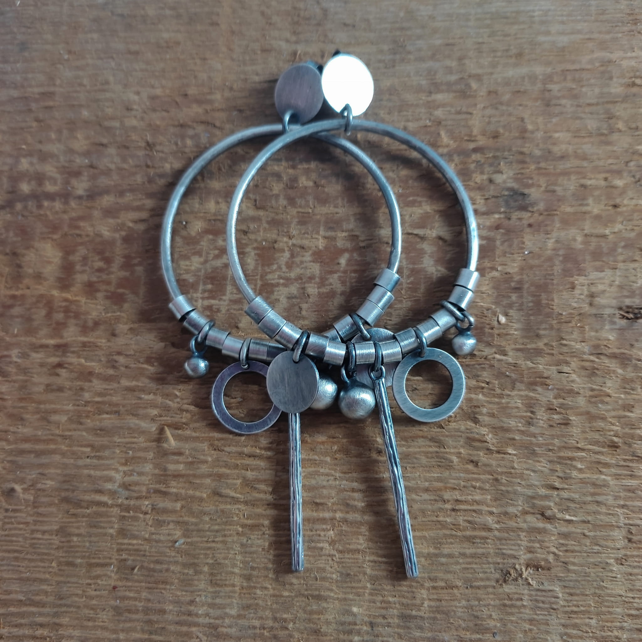 Kolczyki wykonane ze srebra 925, oksydowanego i wypolerowanego. Całkowita długość kolczyków wynosi ok. 8.6 cm. Wielkość srebrnych elementów