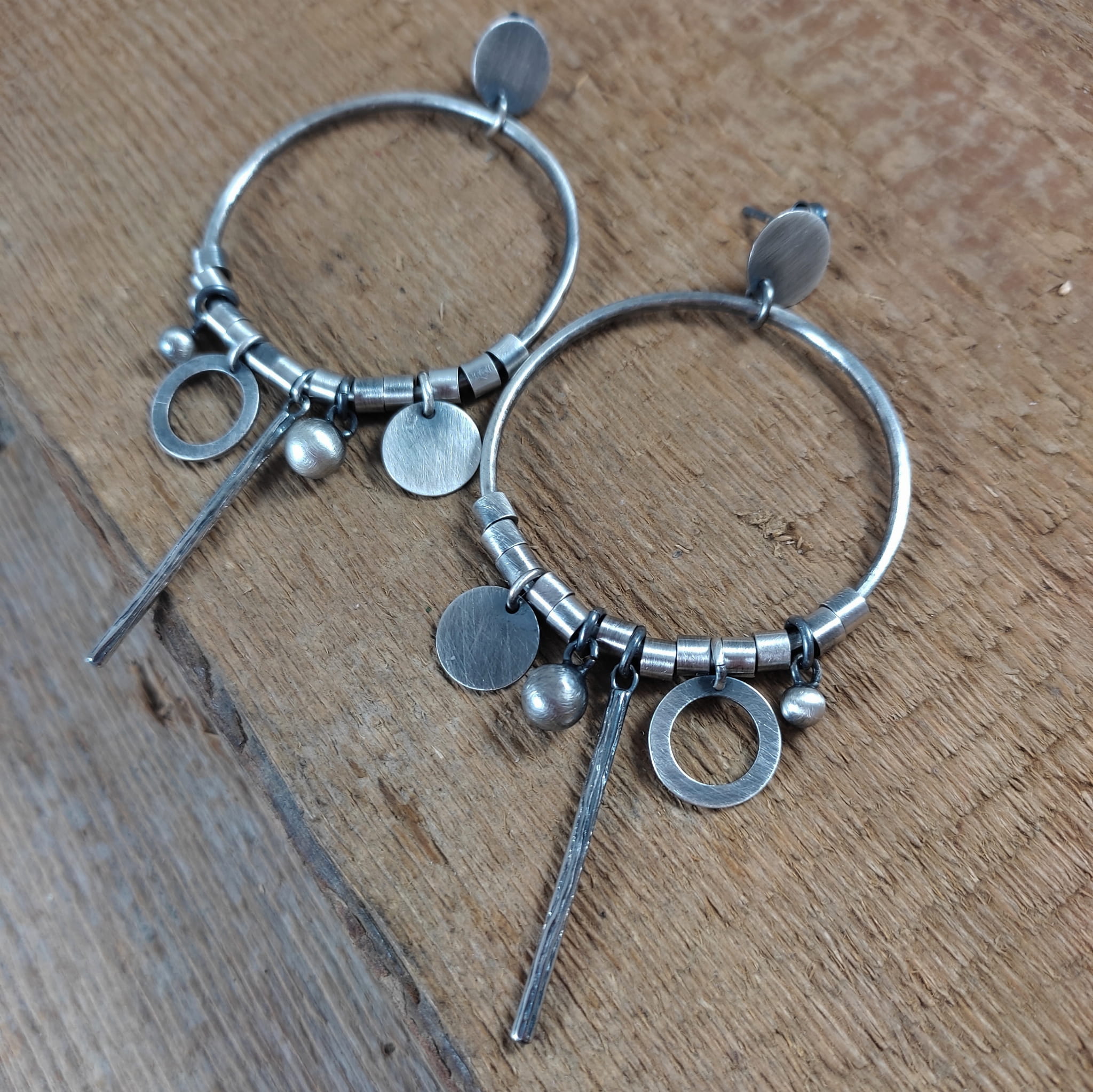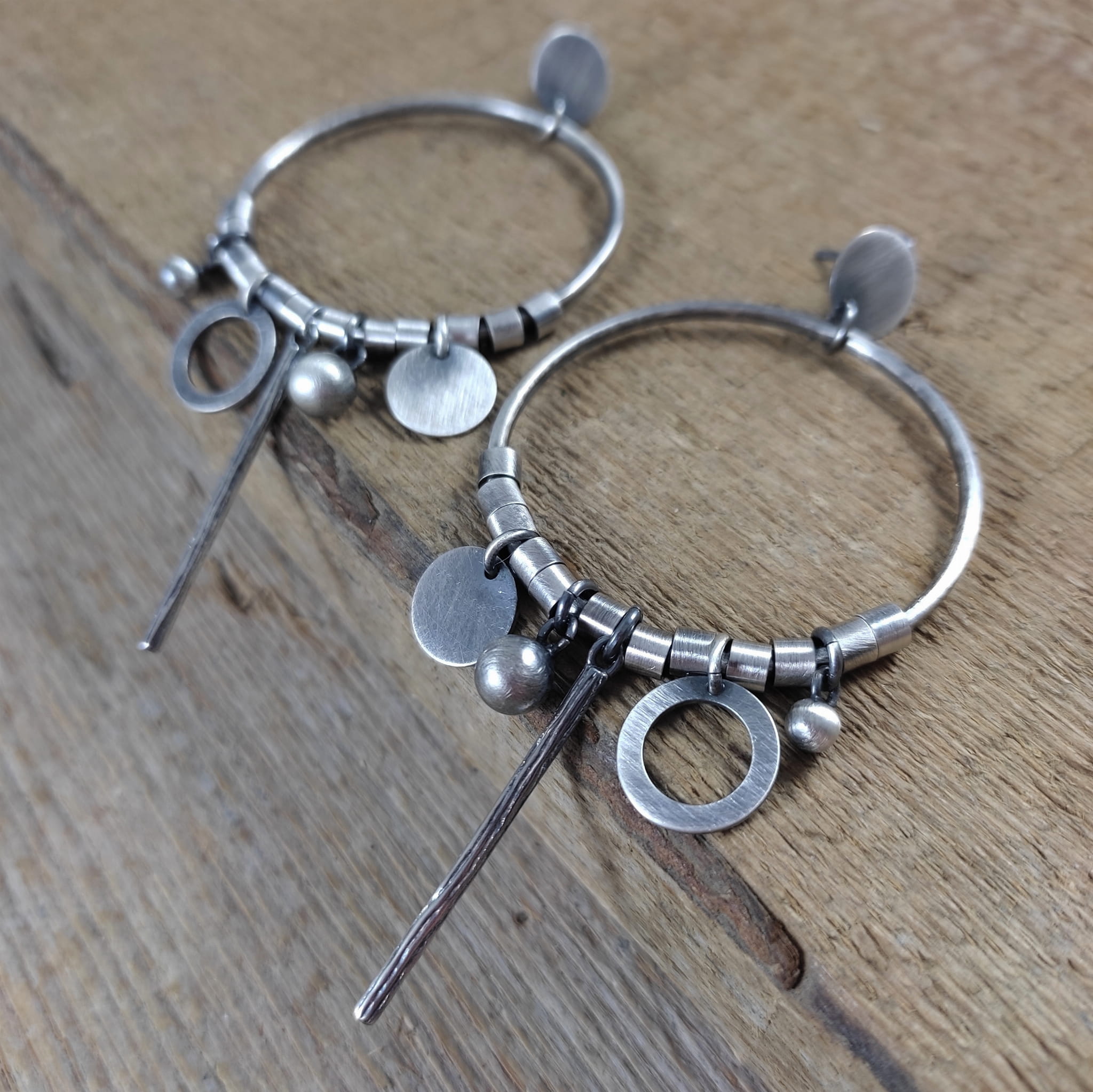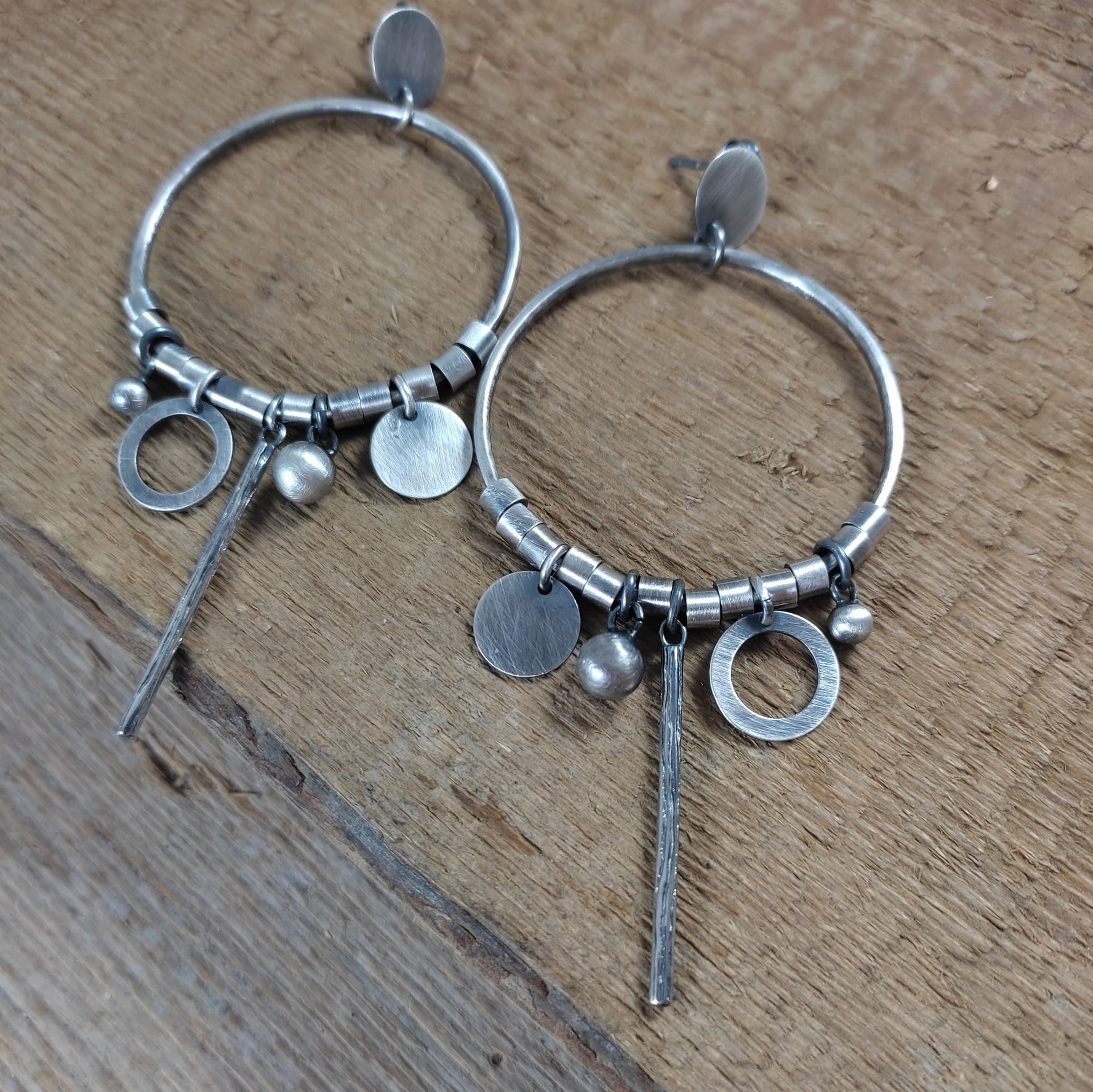 Kolczyki wykonane ze srebra 925, oksydowanego i wypolerowanego. Całkowita długość kolczyków wynosi ok. 8.6 cm. Wielkość srebrnych elementów