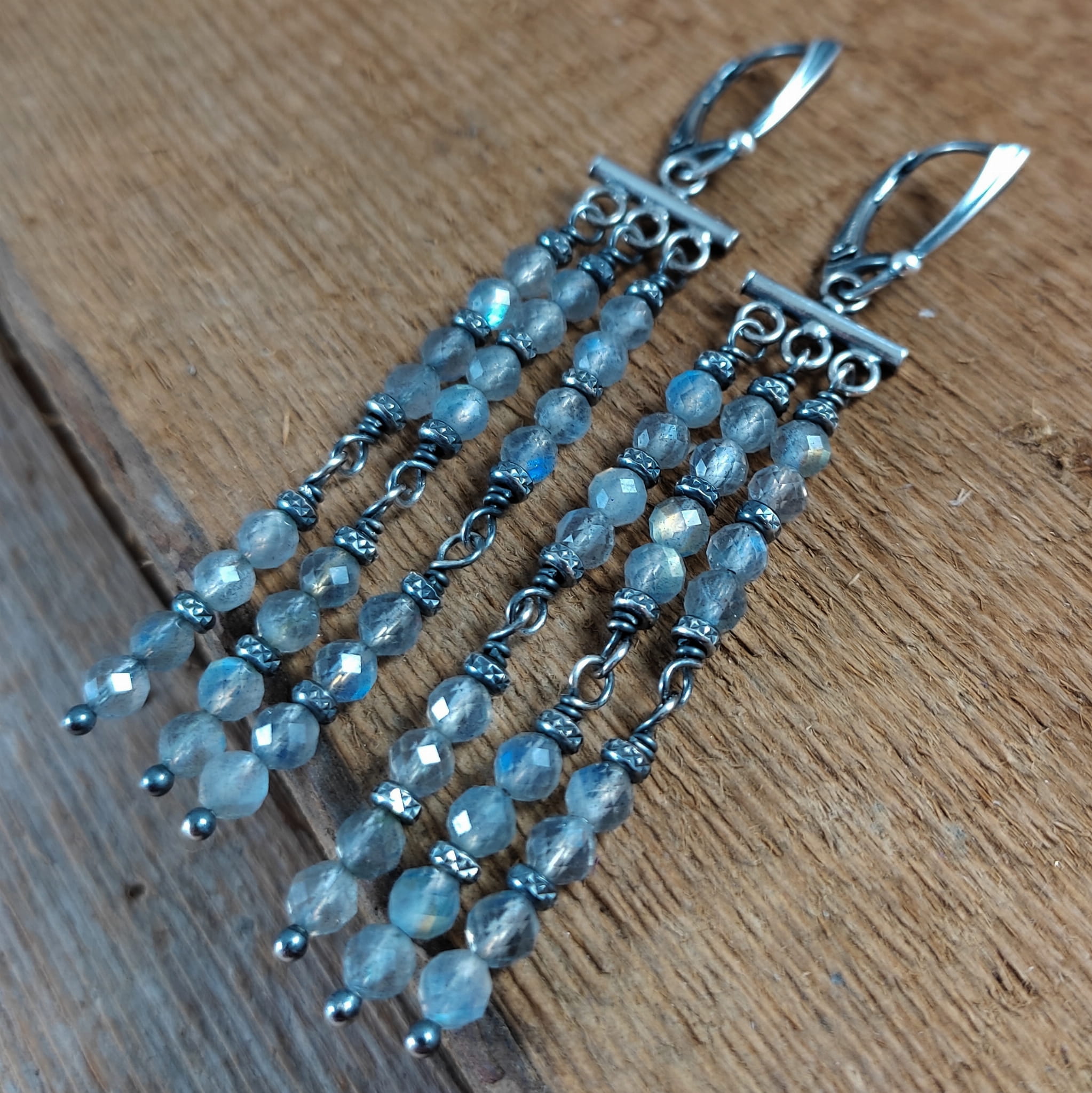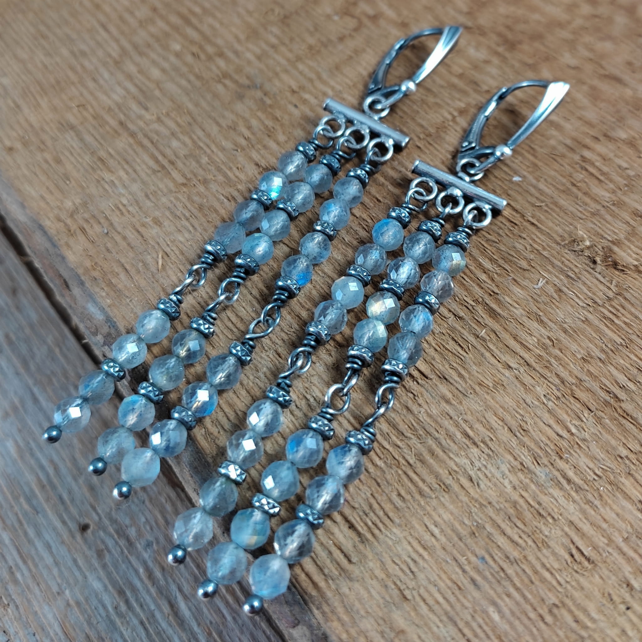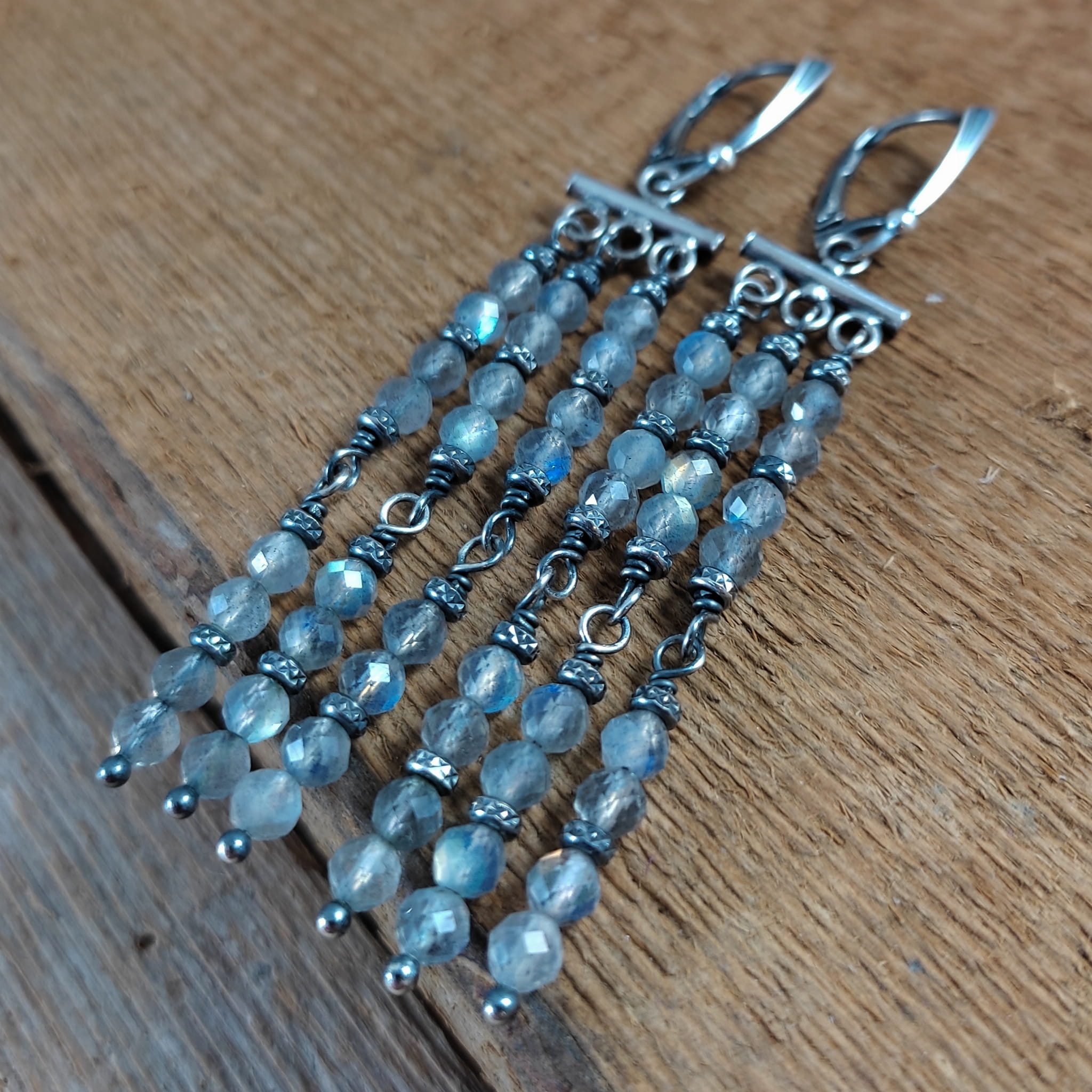 Kolczyki z kulami fasetowanego labradorytu. Fasetowany labradoryt o średnicy 4 mm. Kamienie posiadają niedoskonałości. Długość całkowita kolczyków wynosi ok. 80 mm. Kolczyki zostały wykonane w całości ze srebra 925, srebro oksydowane. Zapakowane w eleganckie pudełko.