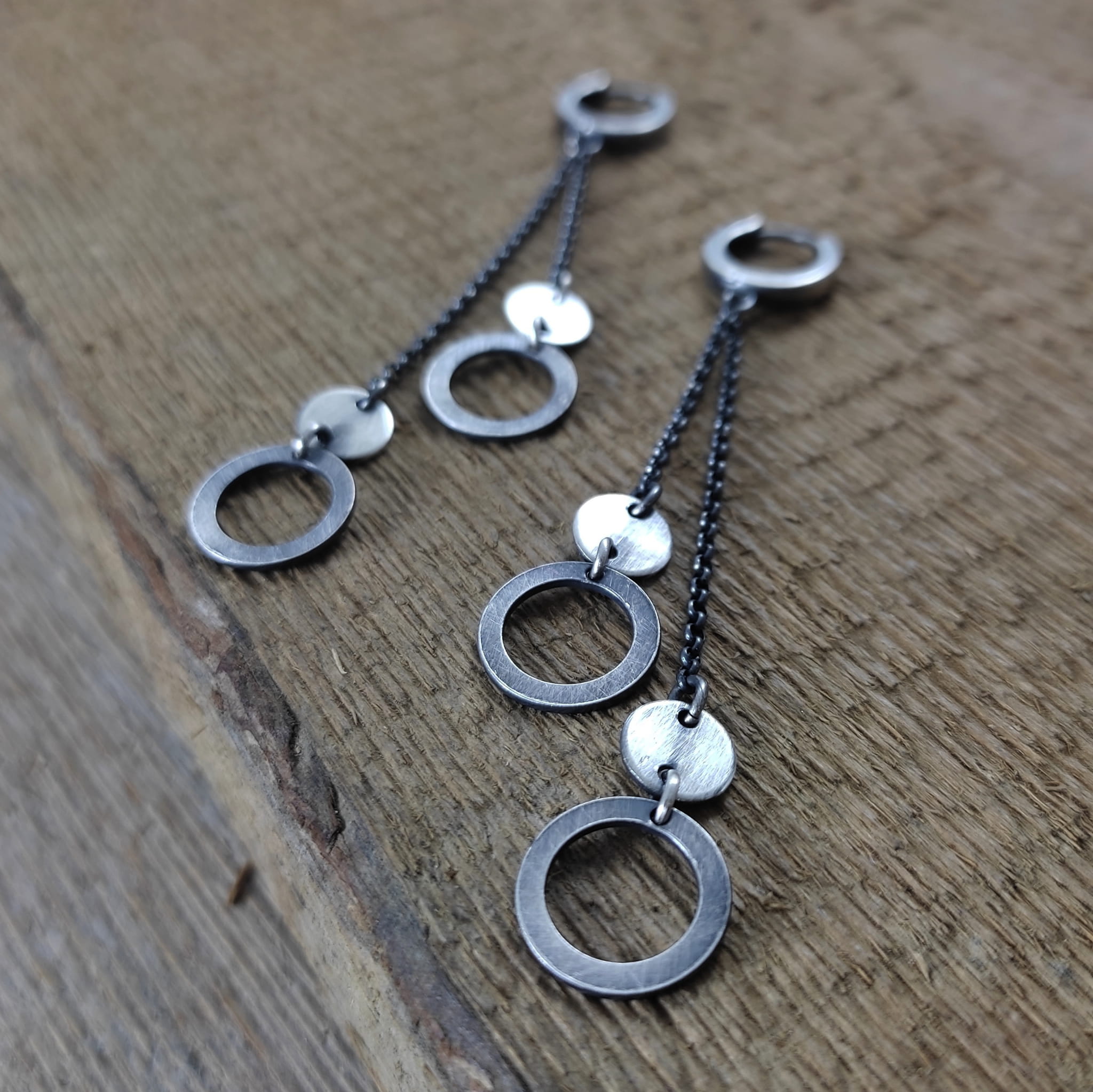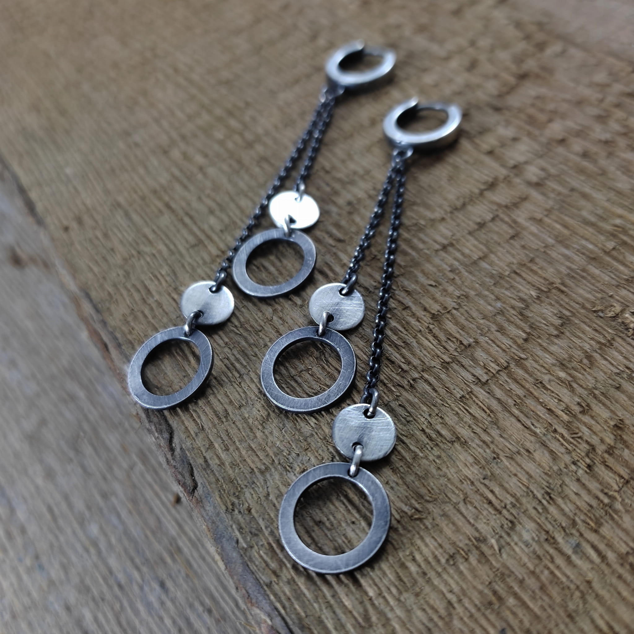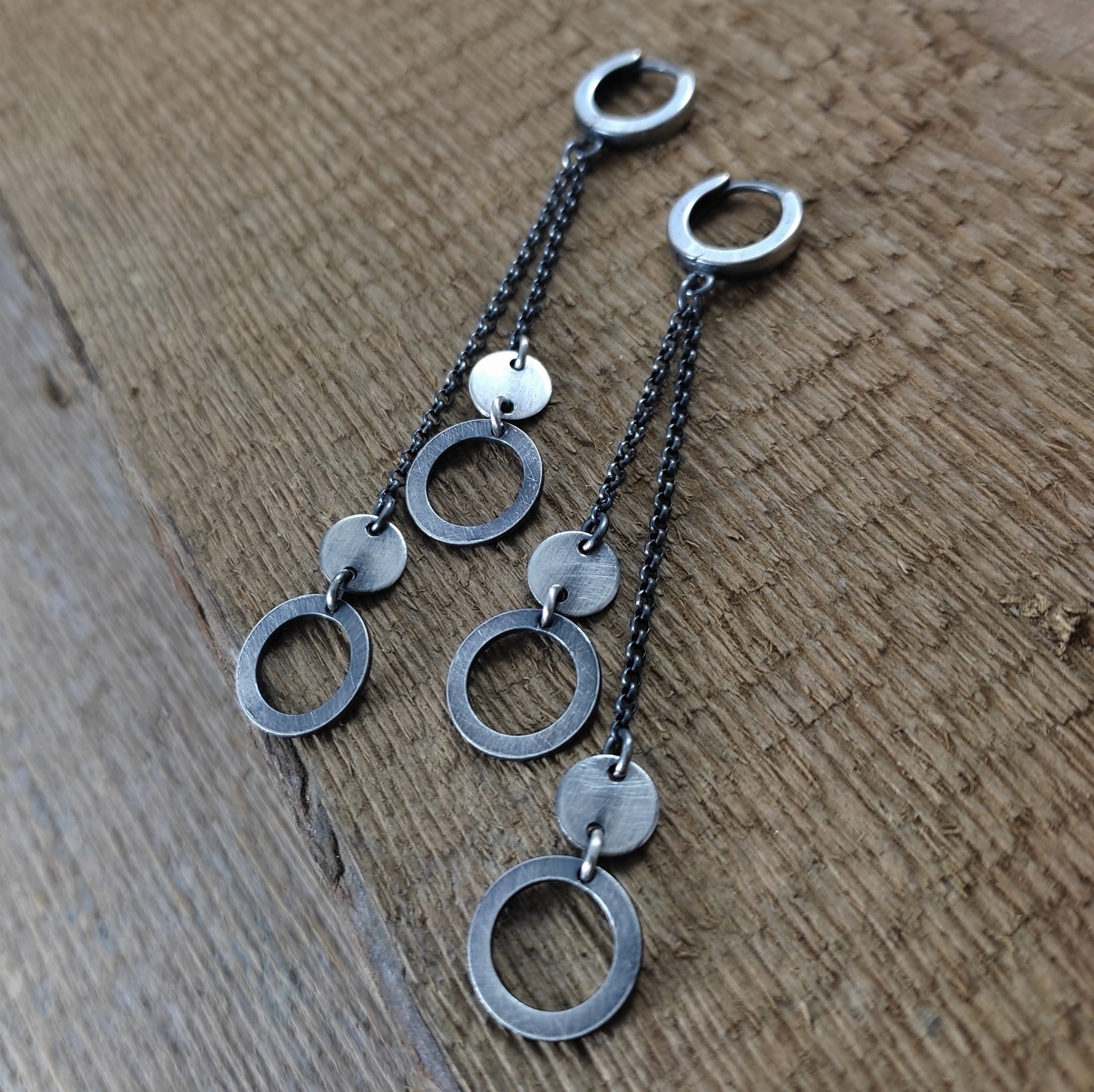 Kolczyki wykonane ze srebra 925, oksydowanego i wypolerowanego. Wielkość kółek ok. 8-12 mm. Całkowita długość kolczyków wynosi ok. 7,8 cm. Elegancko zapakowane.