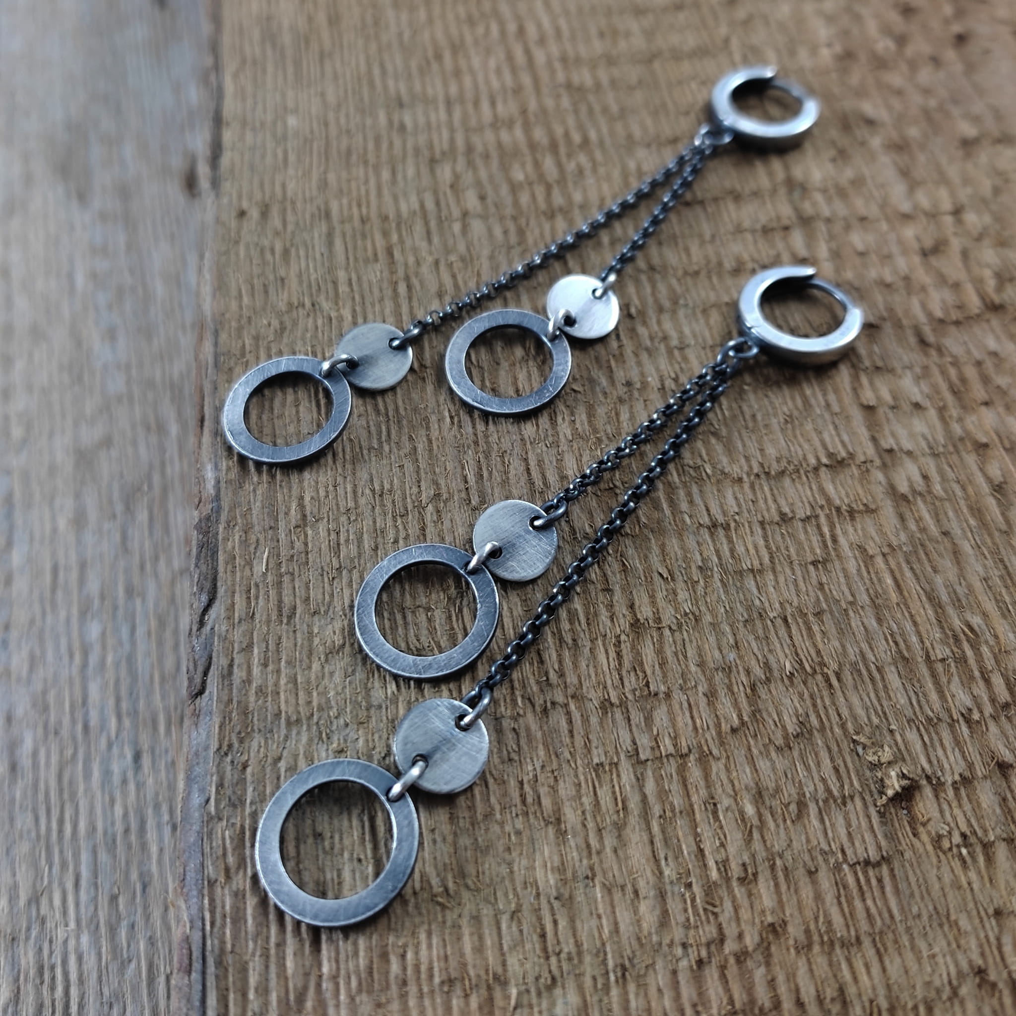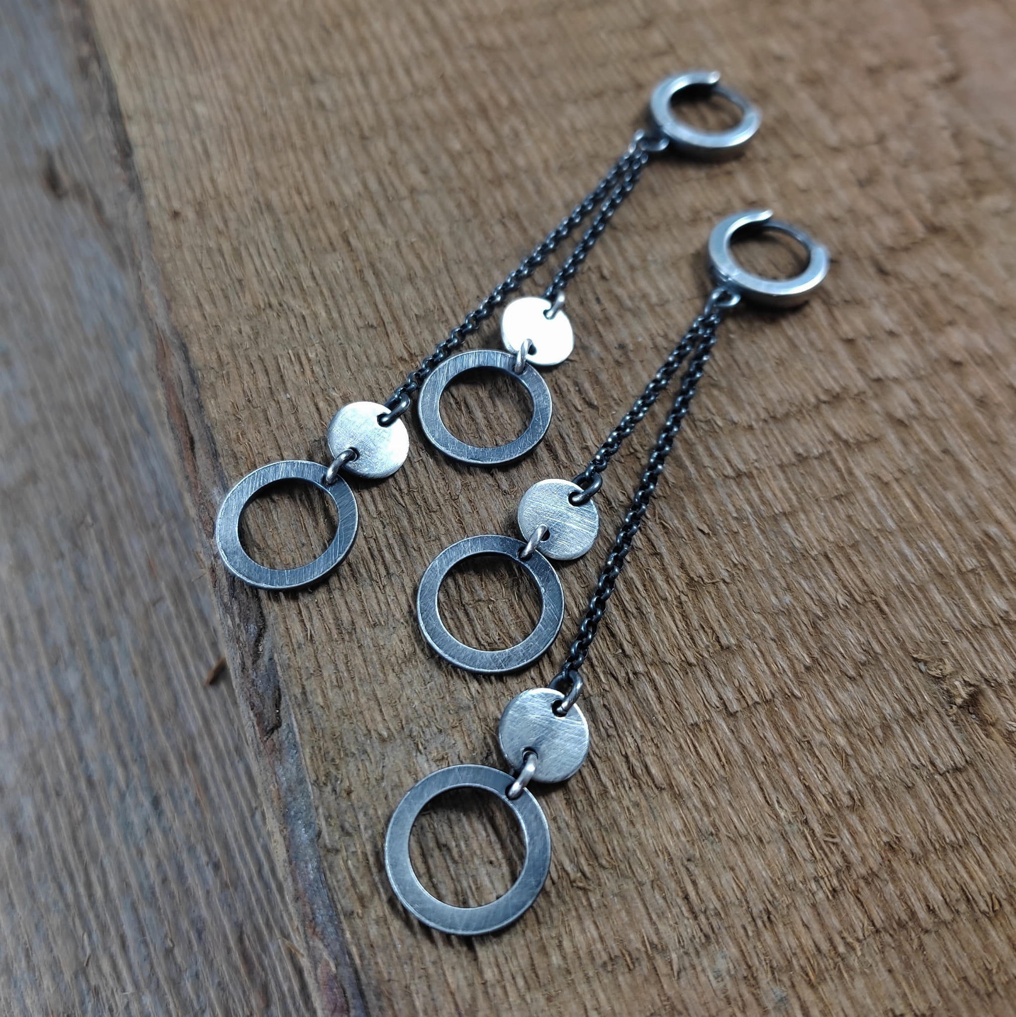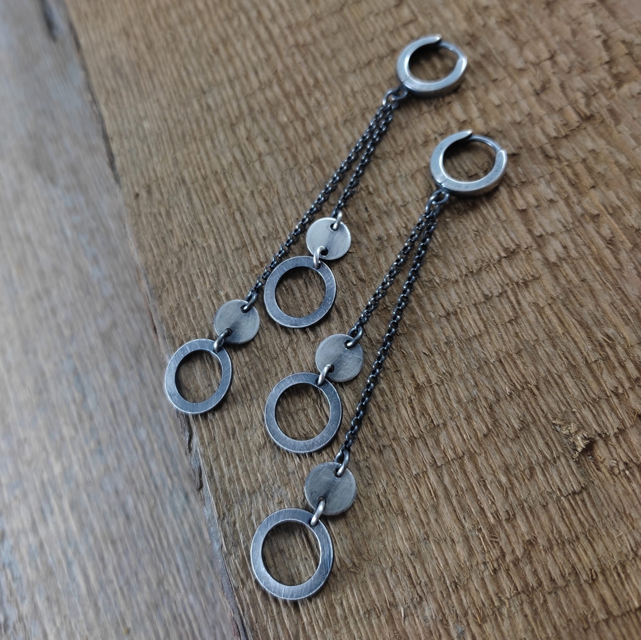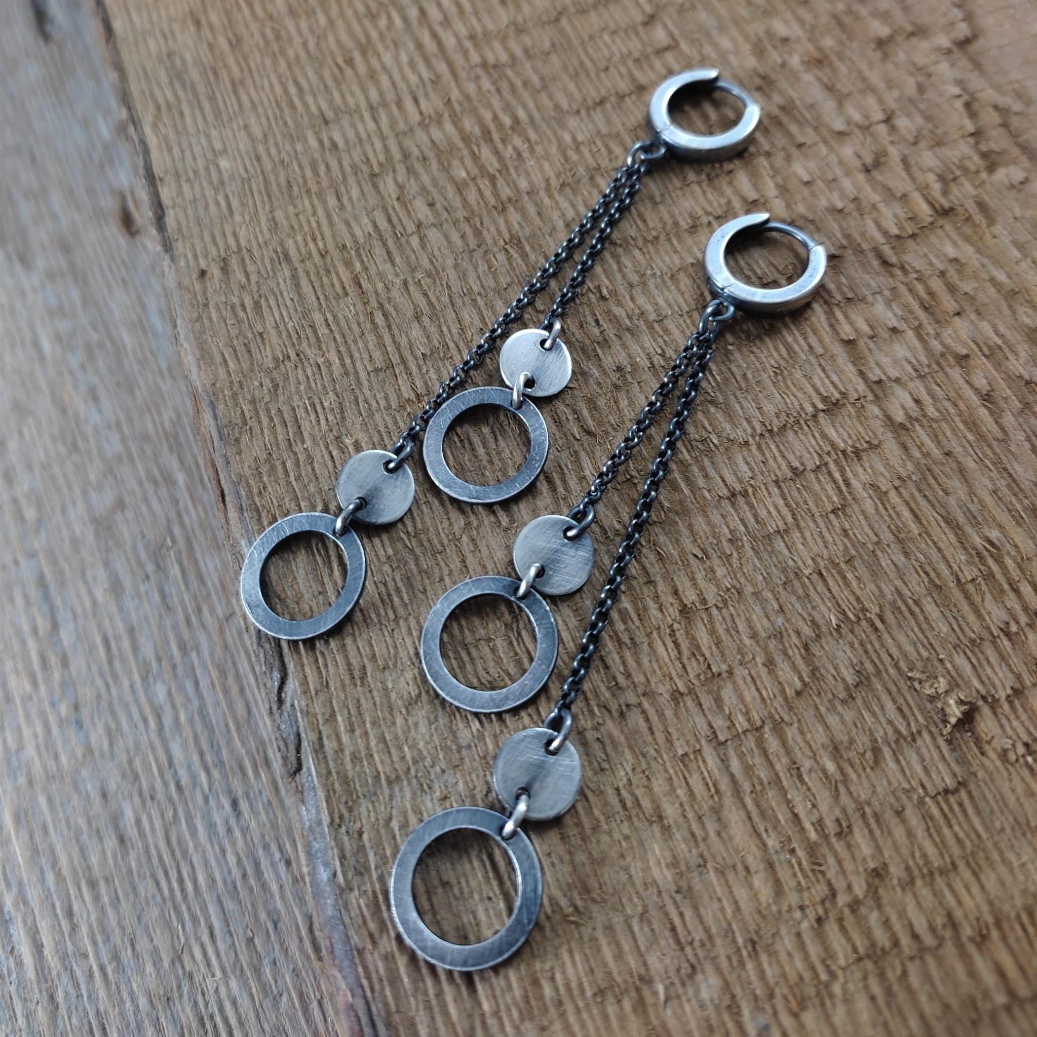 Kolczyki wykonane ze srebra 925, oksydowanego i wypolerowanego. Wielkość kółek ok. 8-12 mm. Całkowita długość kolczyków wynosi ok. 7,8 cm. Elegancko zapakowane.
