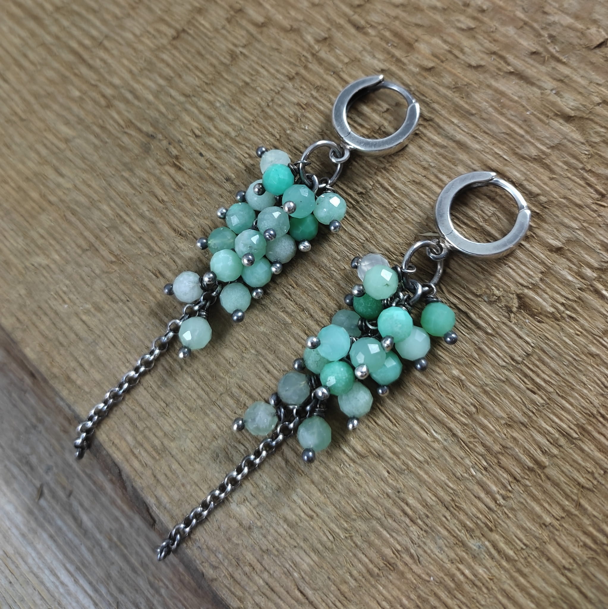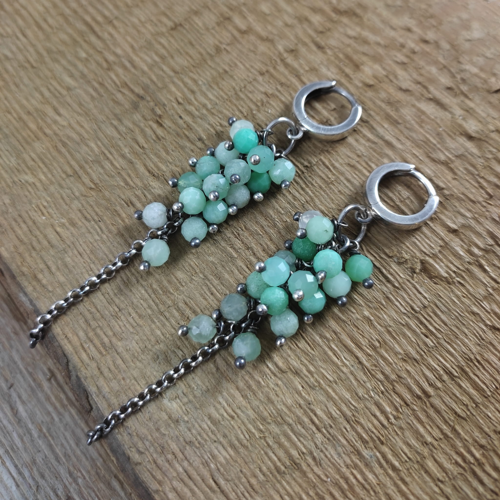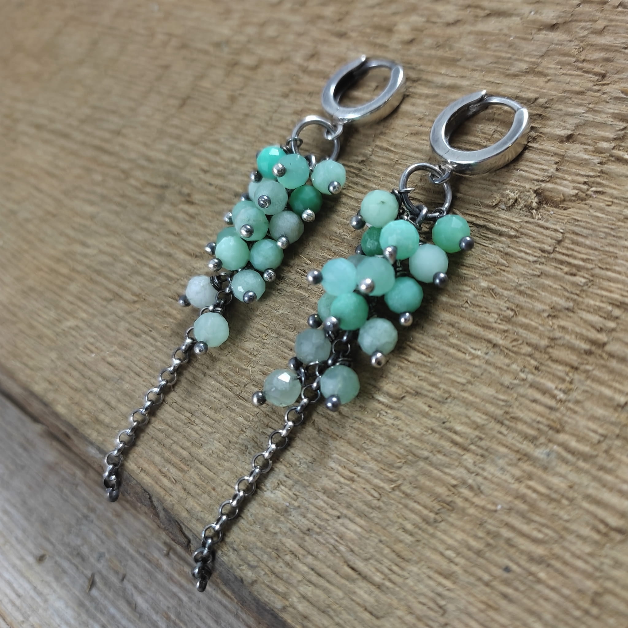 Kolczyki z kulami fasetowanego chryzoprazu. Fasetowany chryzopraz o średnicy 4,5 mm. Kamienie posiadają niedoskonałości. Długość całkowita kolczyków wynosi ok. 7 cm. Kolczyki zostały wykonane w całości ze srebra 925, srebro oksydowane. Zapakowane w eleganckie pudełko.