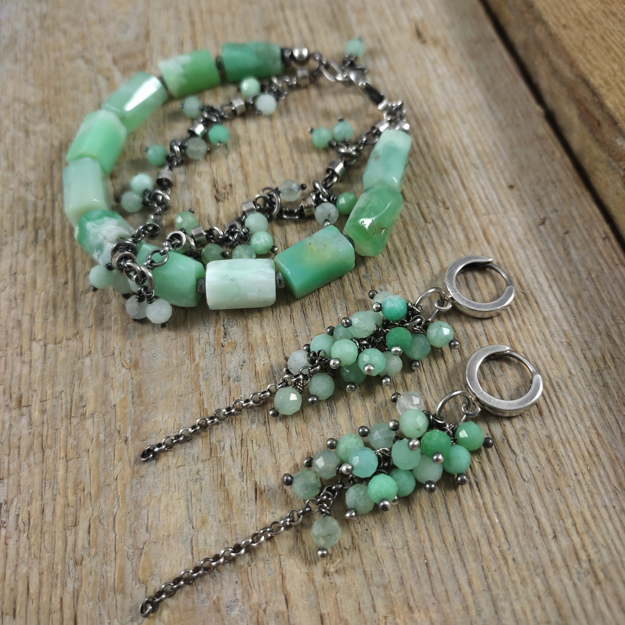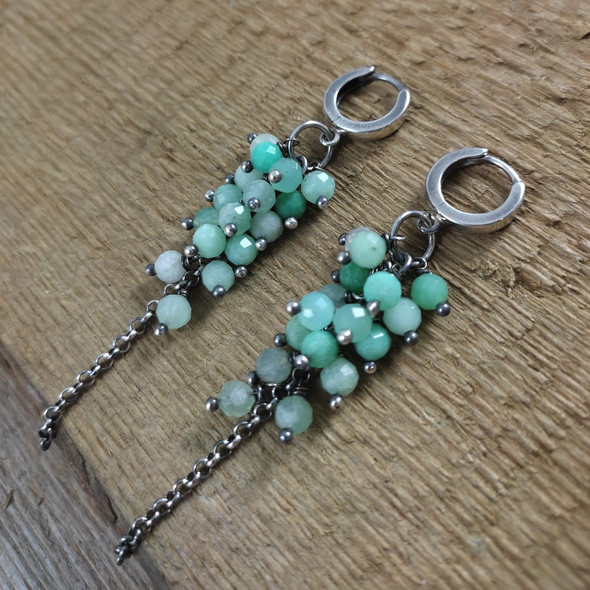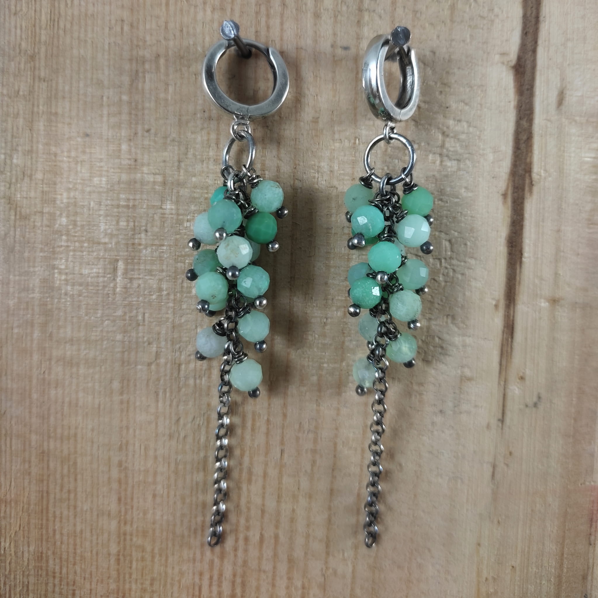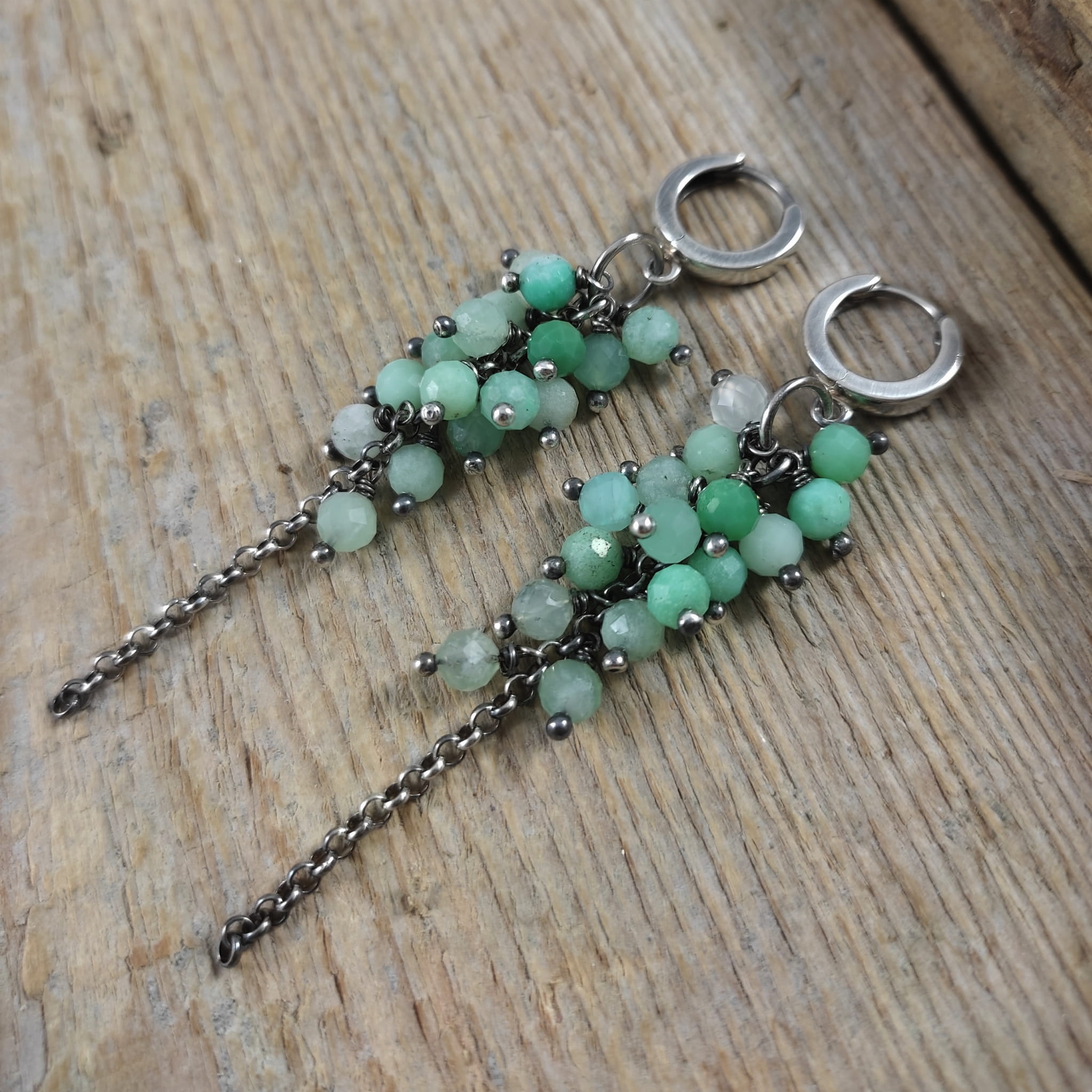 Kolczyki z kulami fasetowanego chryzoprazu. Fasetowany chryzopraz o średnicy 4,5 mm. Kamienie posiadają niedoskonałości. Długość całkowita kolczyków wynosi ok. 7 cm. Kolczyki zostały wykonane w całości ze srebra 925, srebro oksydowane. Zapakowane w eleganckie pudełko.