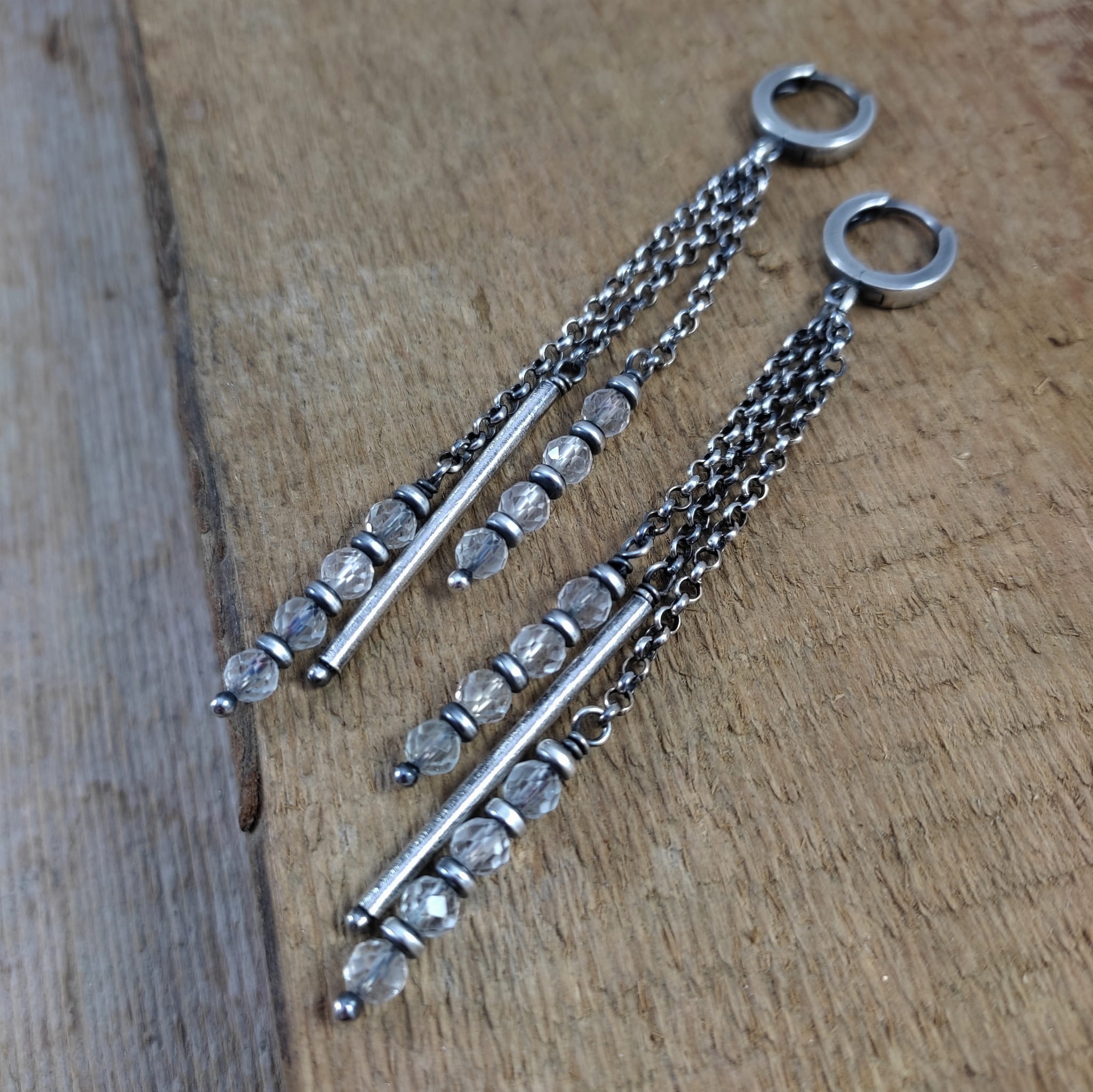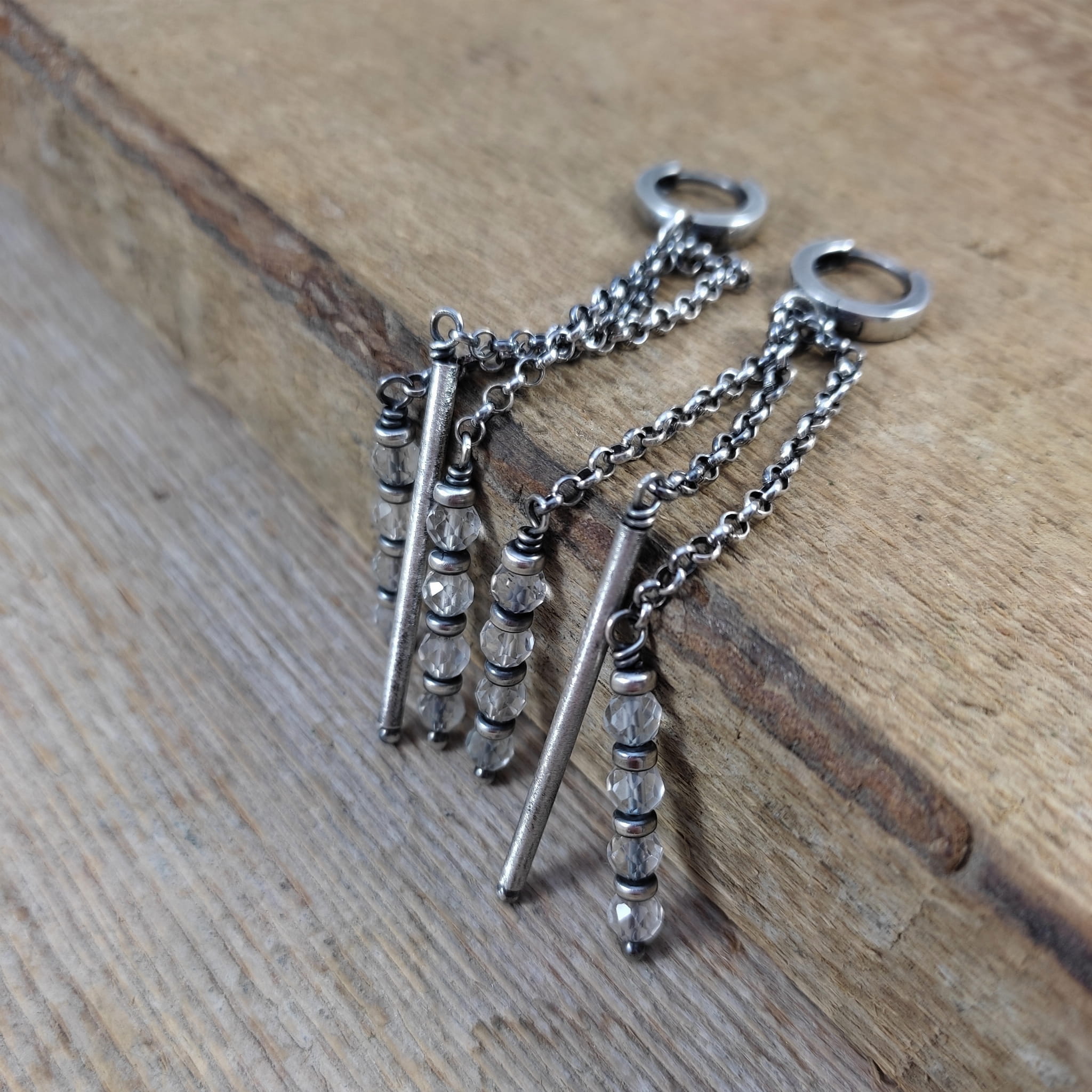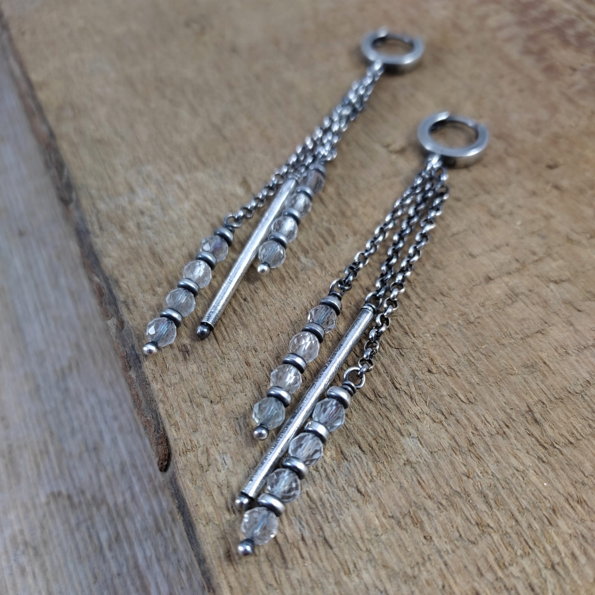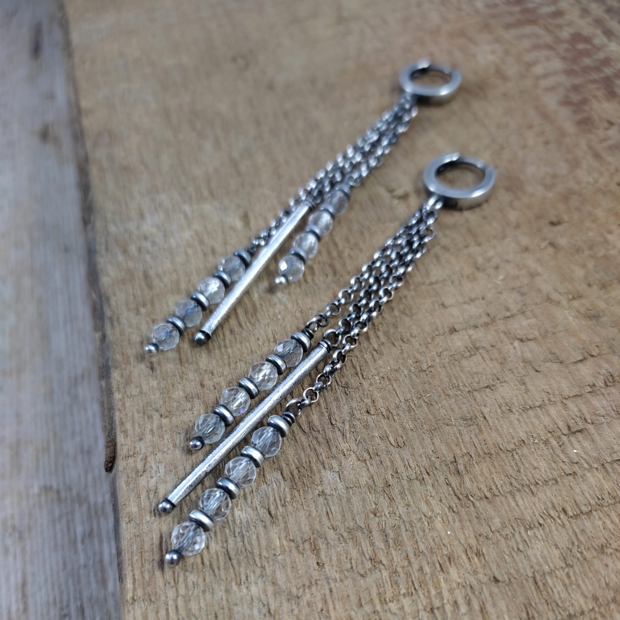 Kolczyki z kulami fasetowanego kwarcu. Fasetowany kwarc o średnicy 3,5 mm. Kamienie mogą posiadać delikatne niedoskonałości. Długość całkowita kolczyków wynosi ok. 87 mm. Kolczyki zostały wykonane w całości ze srebra 925, srebro oksydowane. Zapakowane w eleganckie pudełko.