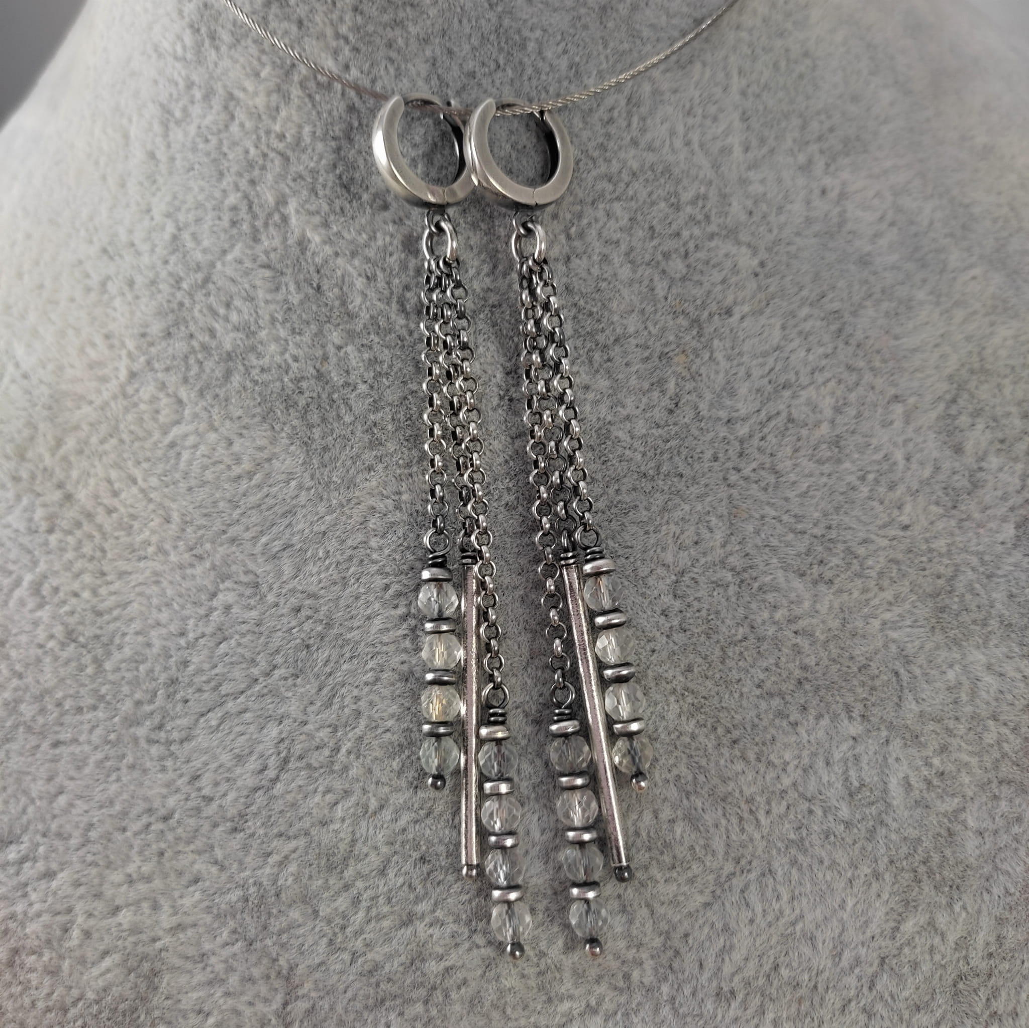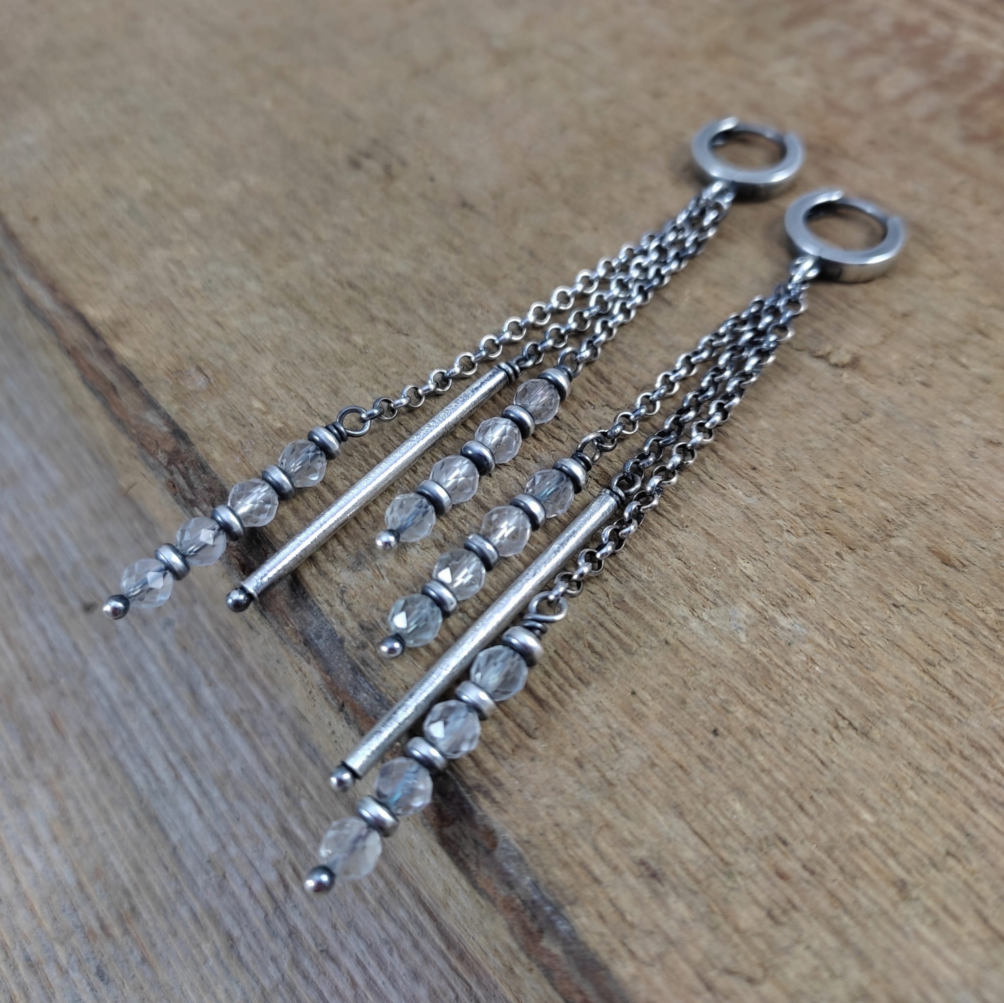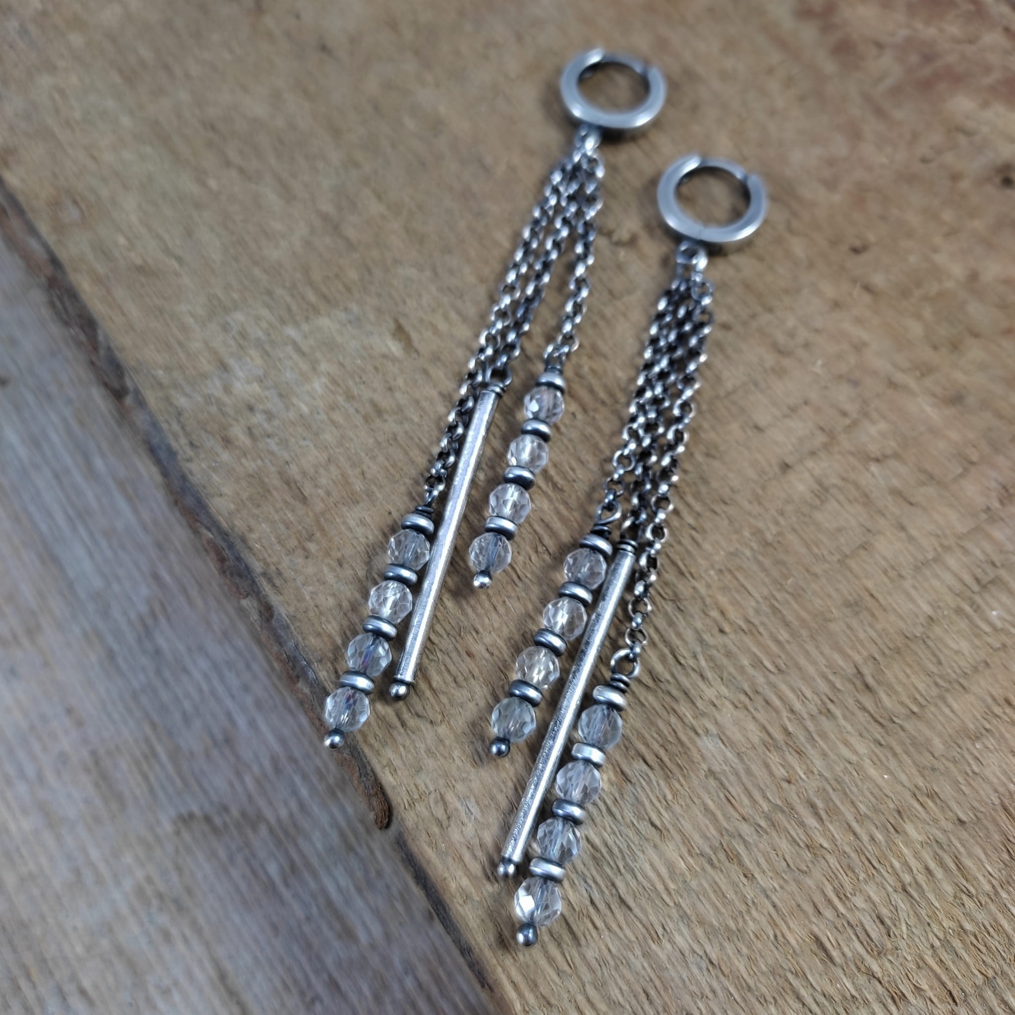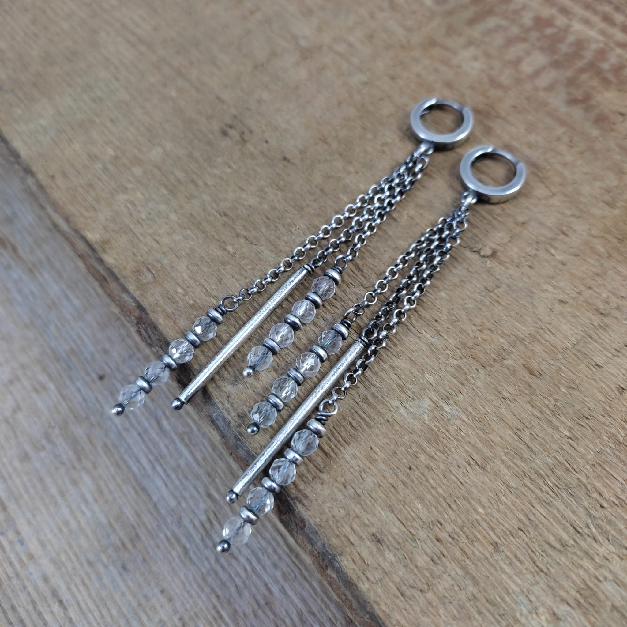Kolczyki z kulami fasetowanego kwarcu. Fasetowany kwarc o średnicy 3,5 mm. Kamienie mogą posiadać delikatne niedoskonałości. Długość całkowita kolczyków wynosi ok. 87 mm. Kolczyki zostały wykonane w całości ze srebra 925, srebro oksydowane. Zapakowane w eleganckie pudełko.
