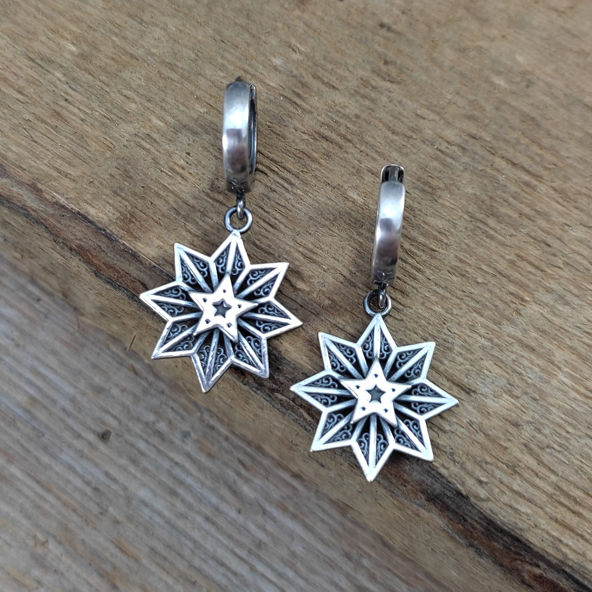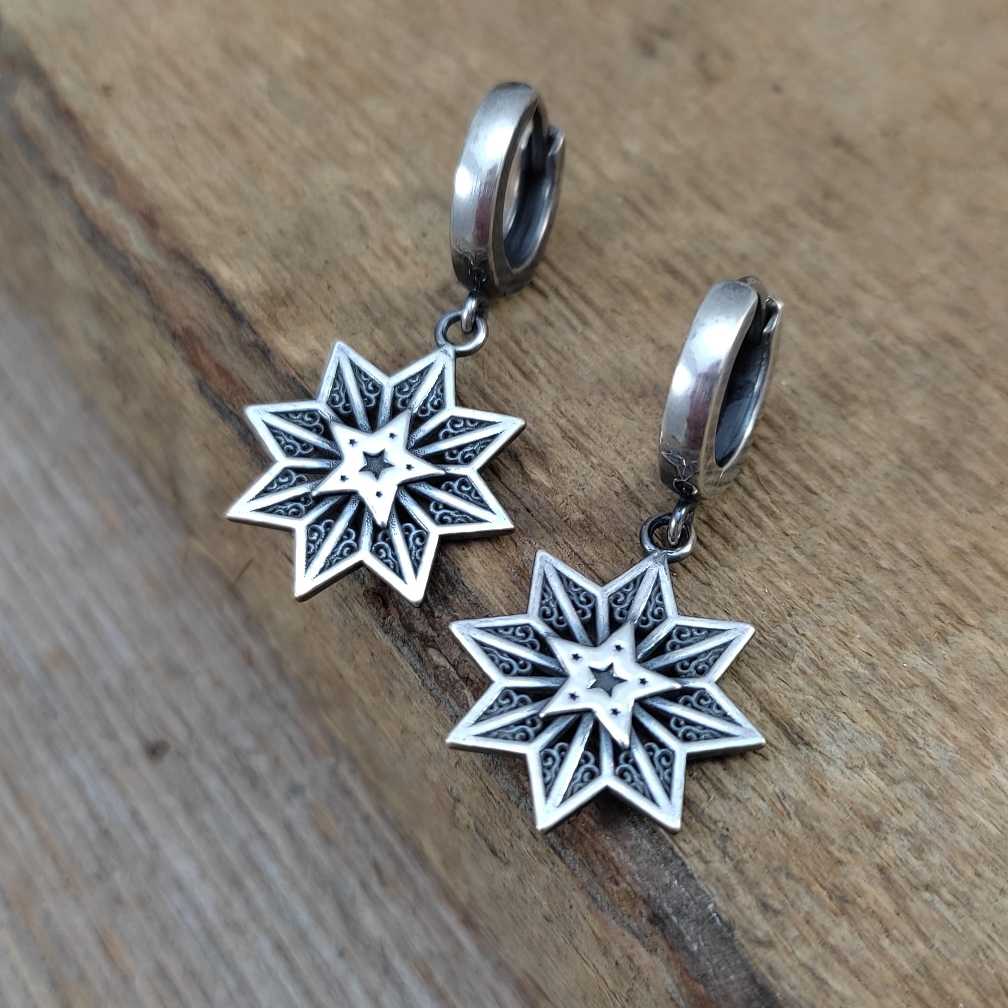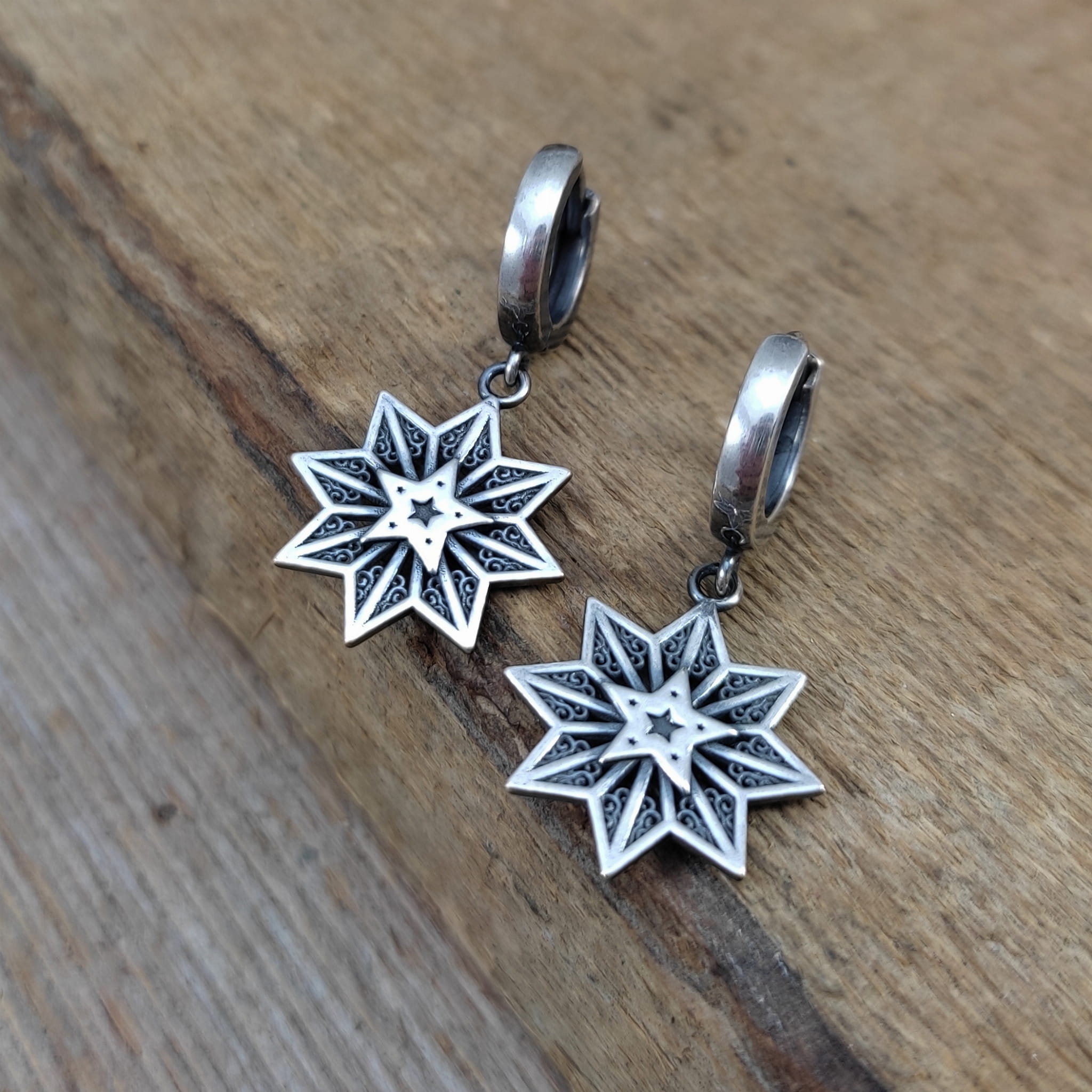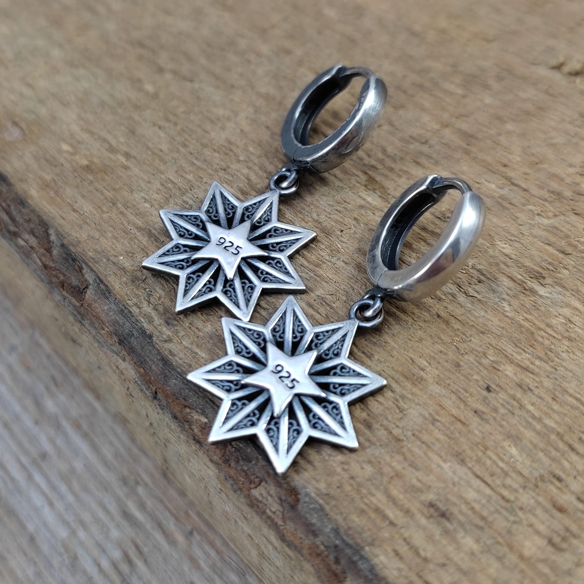 Kolczyki wykonane ze srebra 925, oksydowanego i wypolerowanego. Wielkość gwiazdki ok 19/16.5 mm. Bigle typu kajdanki. Całkowita długość kolczyków wynosi ok. 3,1 cm. Elegancko zapakowane.