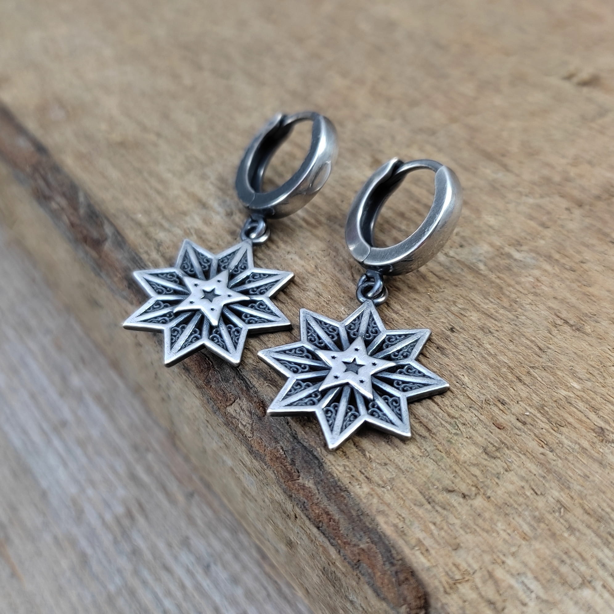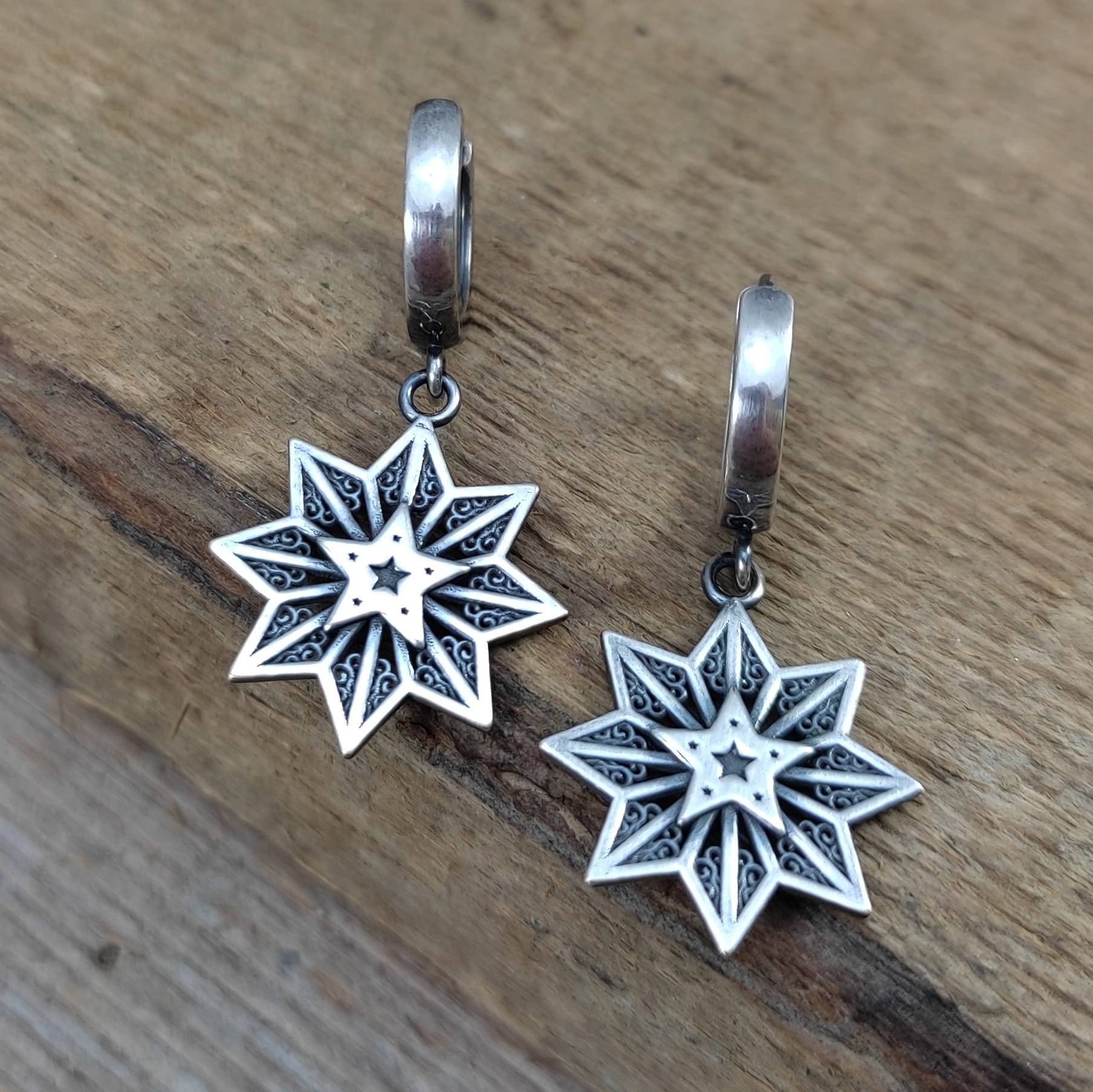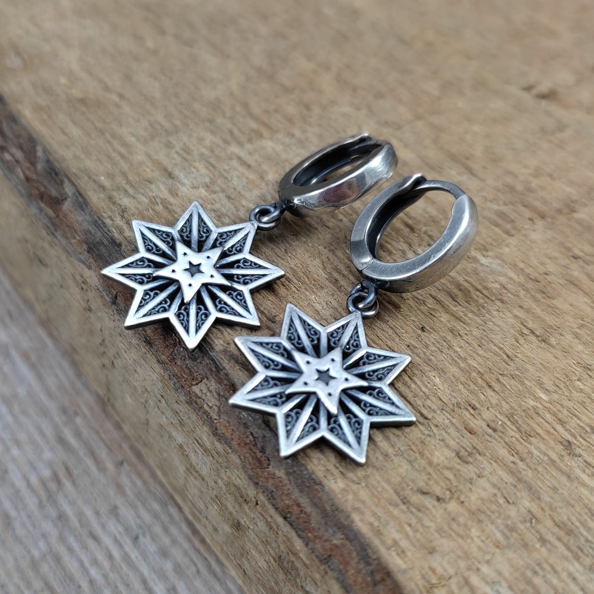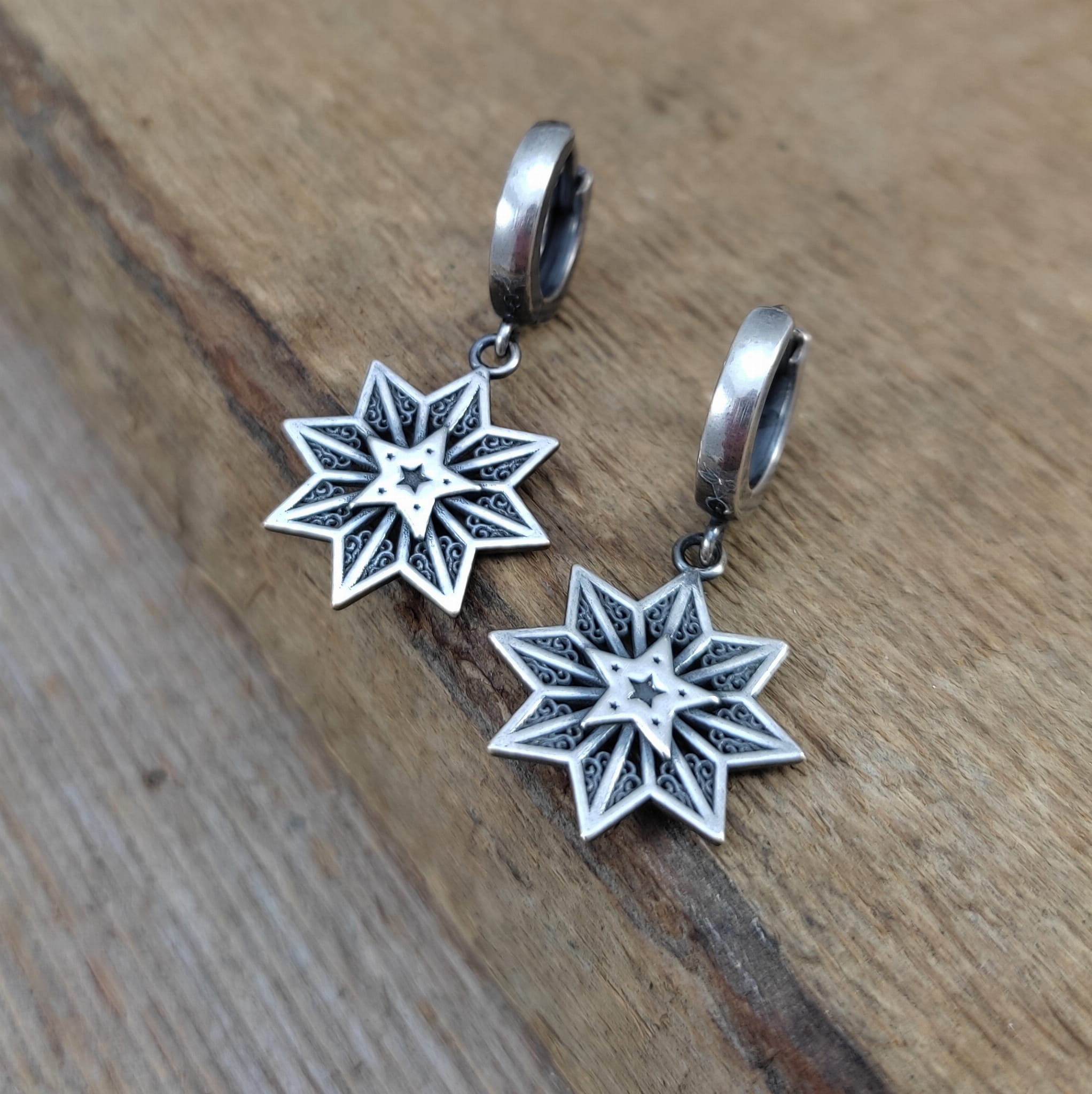 Kolczyki wykonane ze srebra 925, oksydowanego i wypolerowanego. Wielkość gwiazdki ok 19/16.5 mm. Bigle typu kajdanki. Całkowita długość kolczyków wynosi ok. 3,1 cm. Elegancko zapakowane.