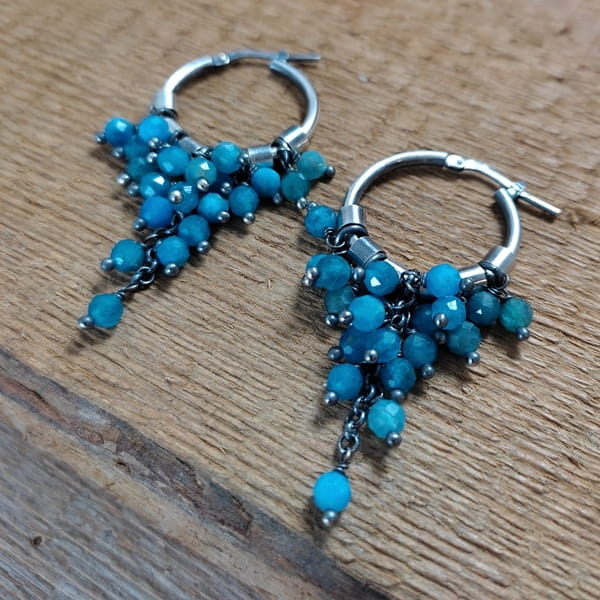Kolczyki z kulami fasetowanego apatytu. Fasetowany apatyt o średnicy 4 mm. Kamienie posiadają niedoskonałości. Długość całkowita kolczyków wynosi ok. 5,4 cm. Kolczyki zostały wykonane w całości ze srebra 925, srebro oksydowane. Zapakowane w eleganckie pudełko.