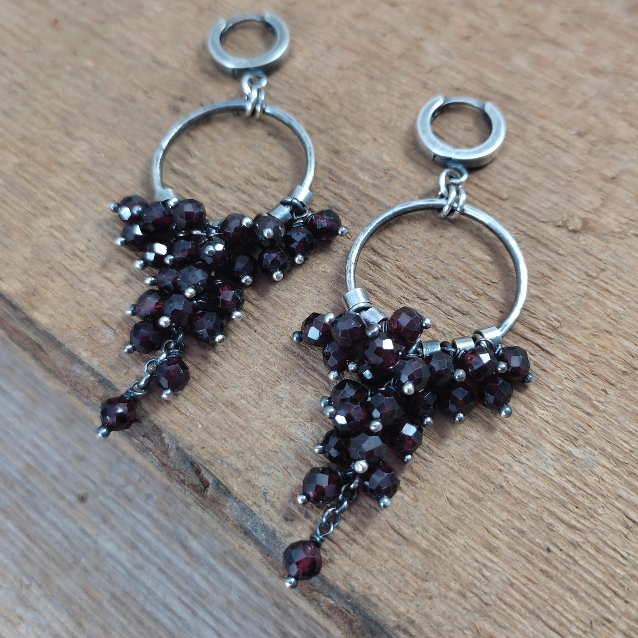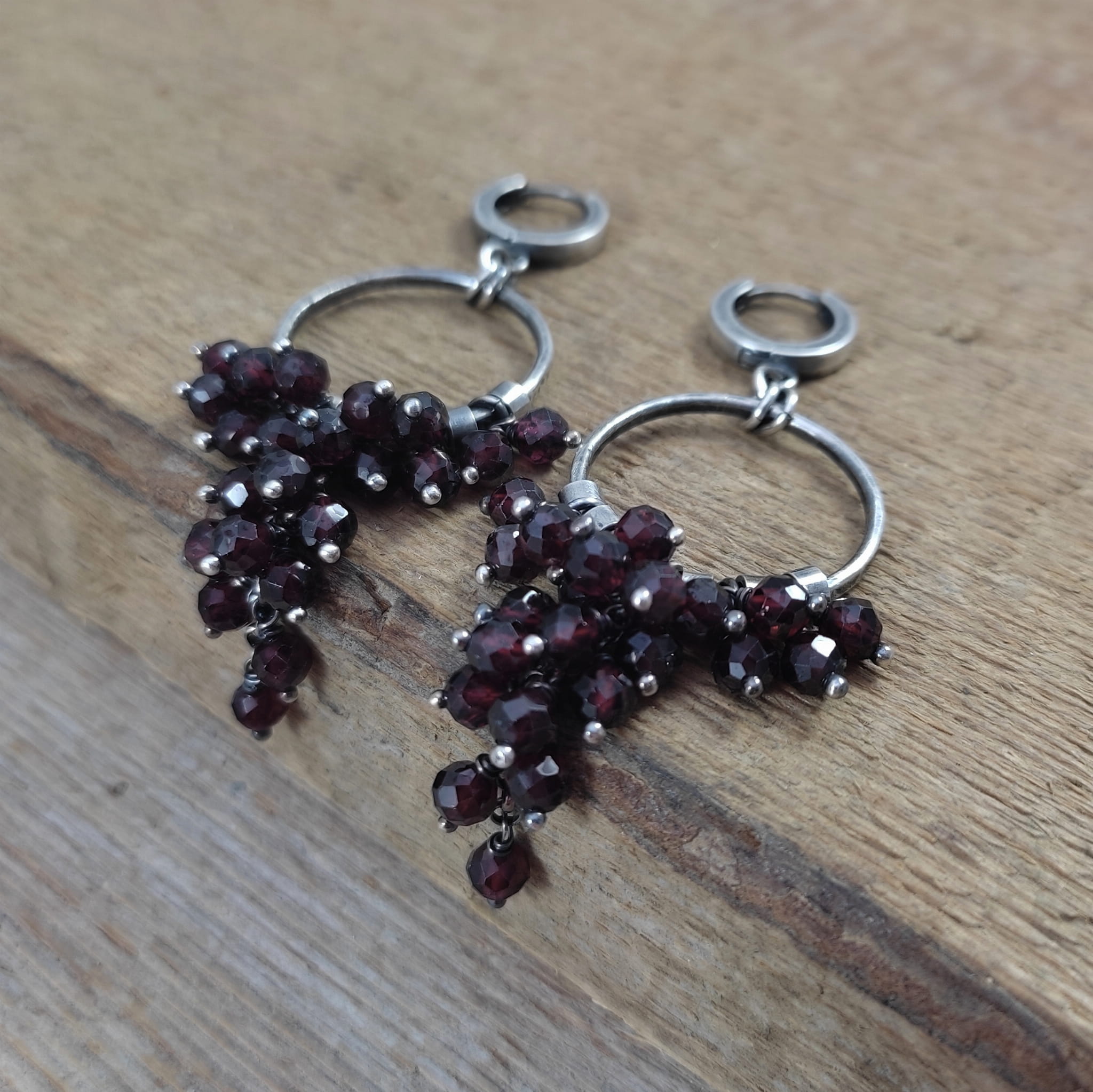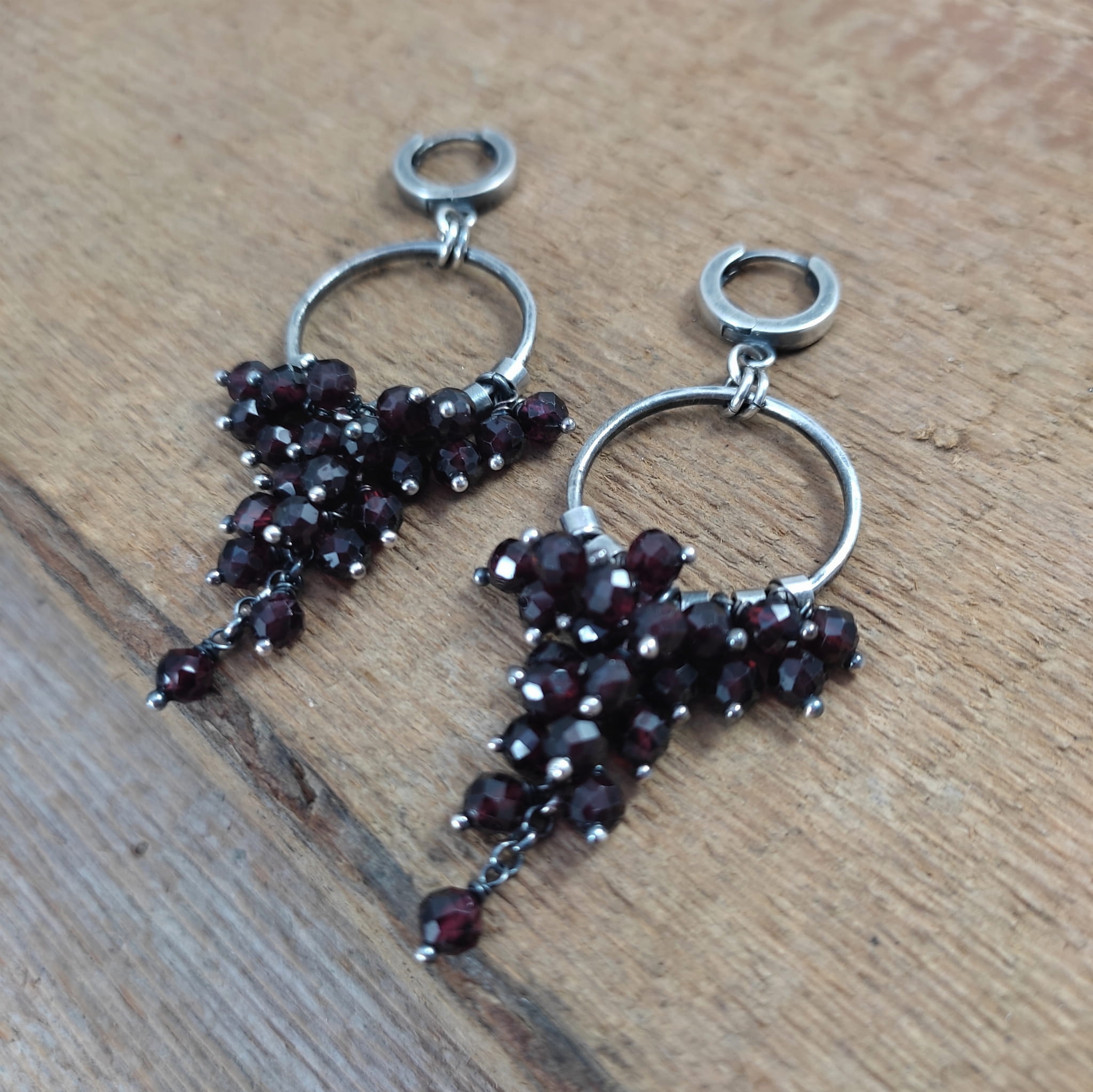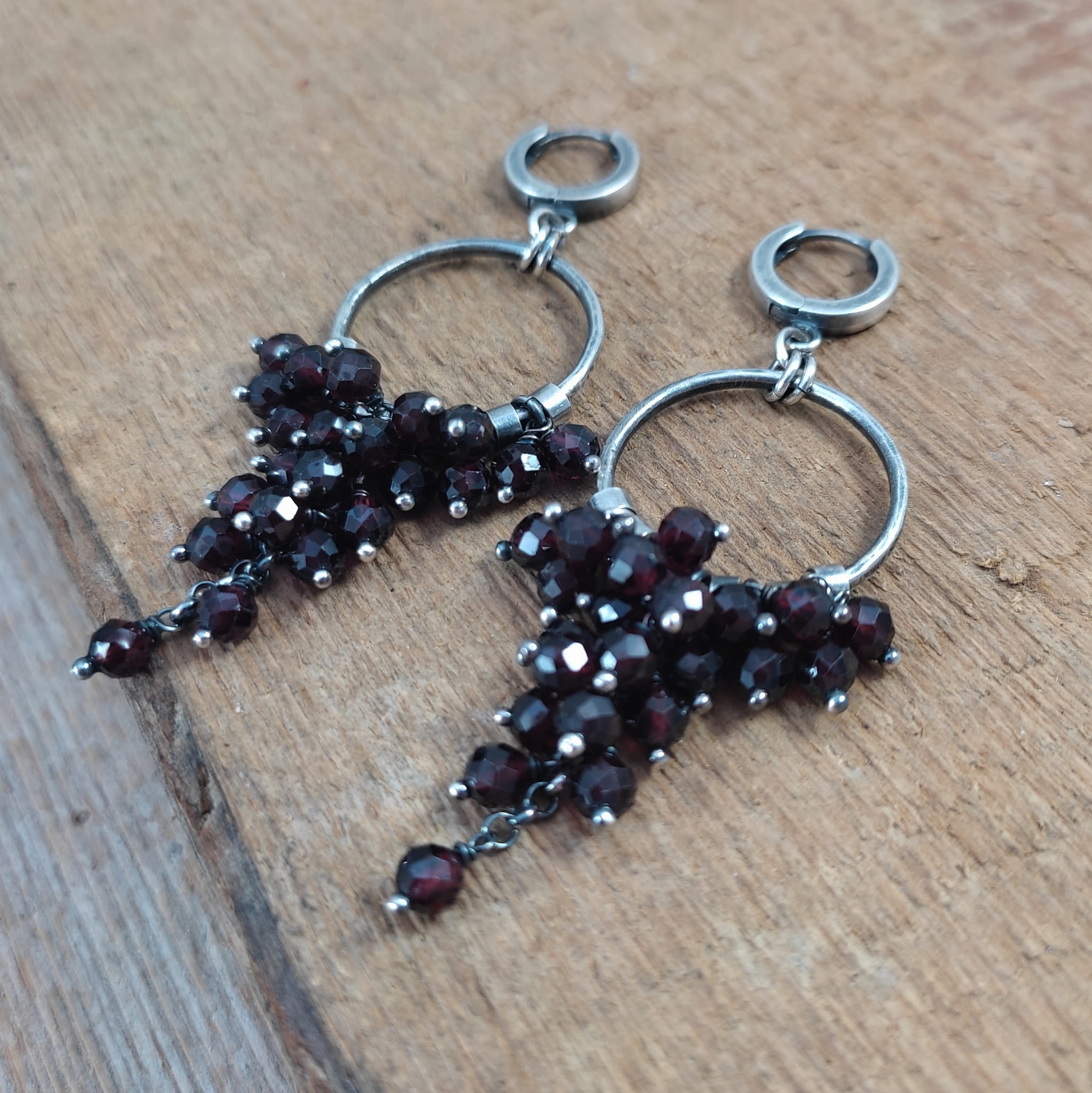 Kolczyki z kulami fasetowanego granatu. Fasetowany granat o średnicy 4 mm. Kamienie posiadają niedoskonałości. Długość całkowita kolczyków wynosi ok. 6,5 cm. Kolczyki zostały wykonane w całości ze srebra 925, srebro oksydowane. Zapakowane w eleganckie pudełko.