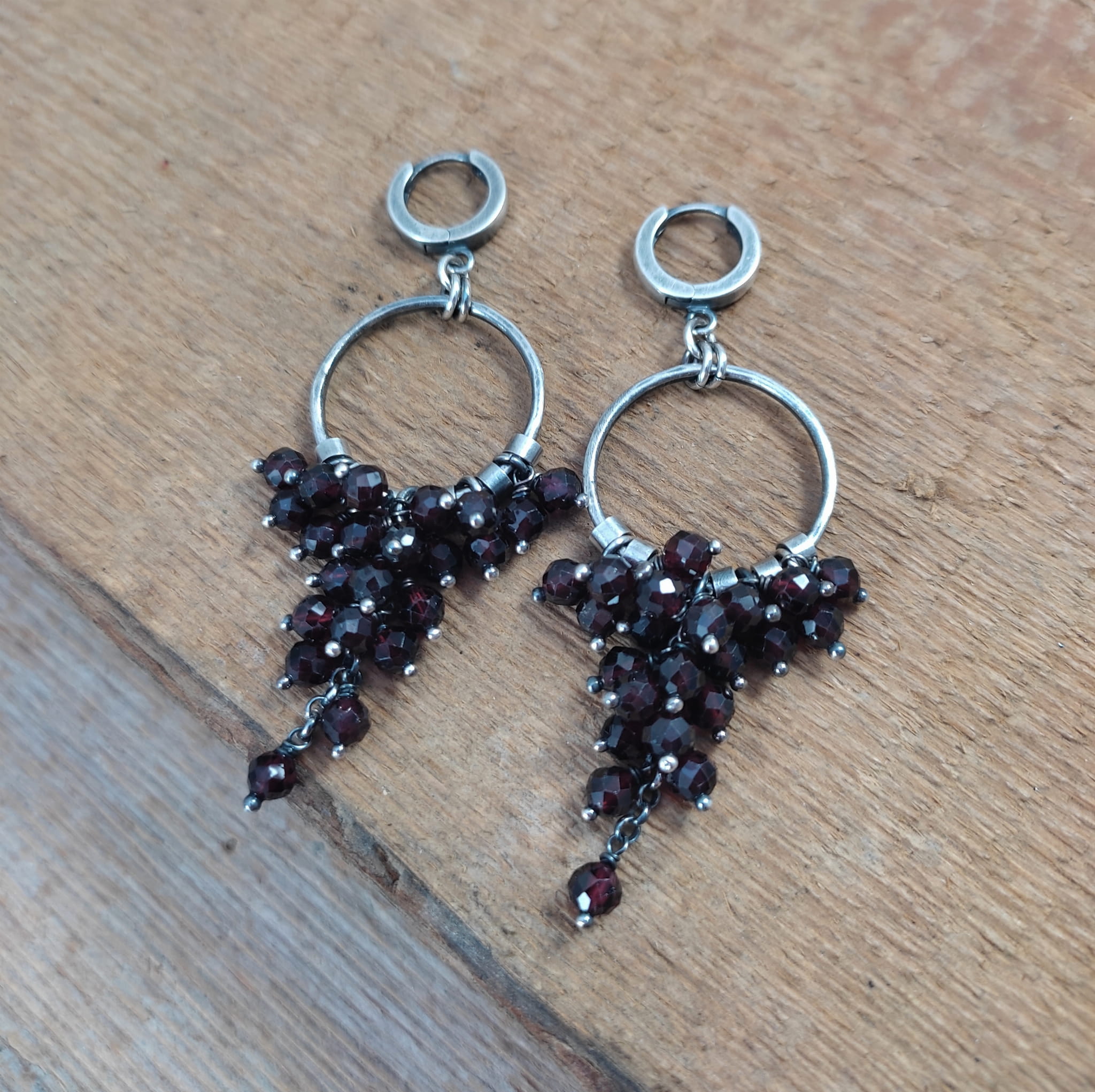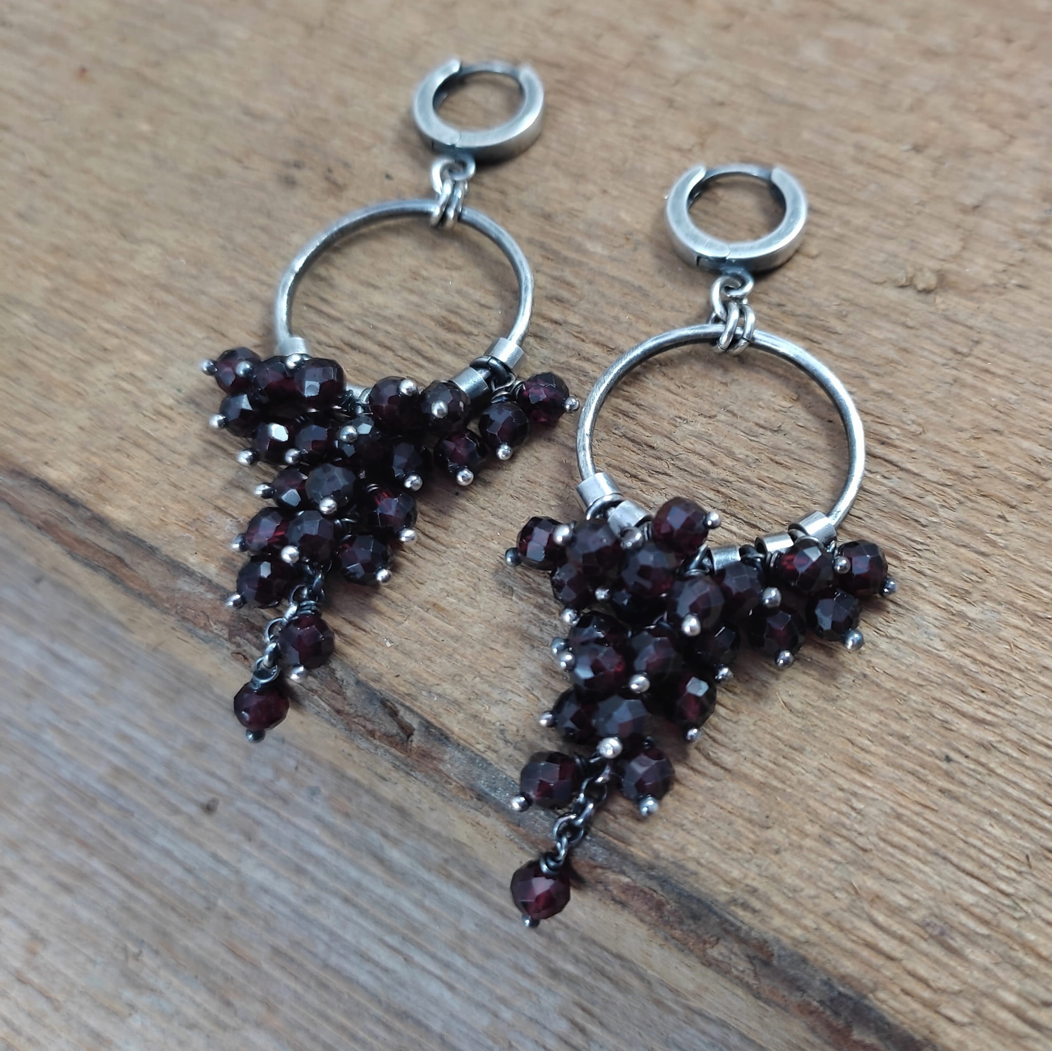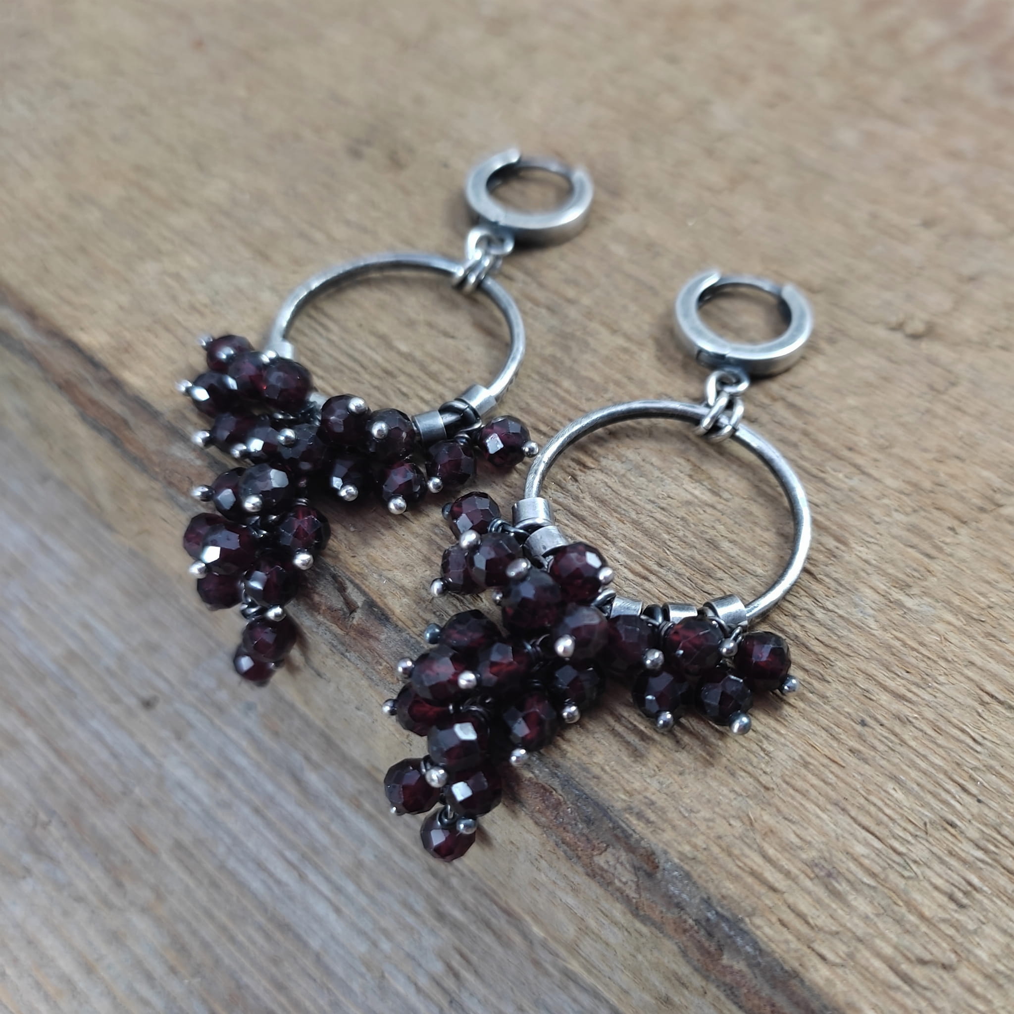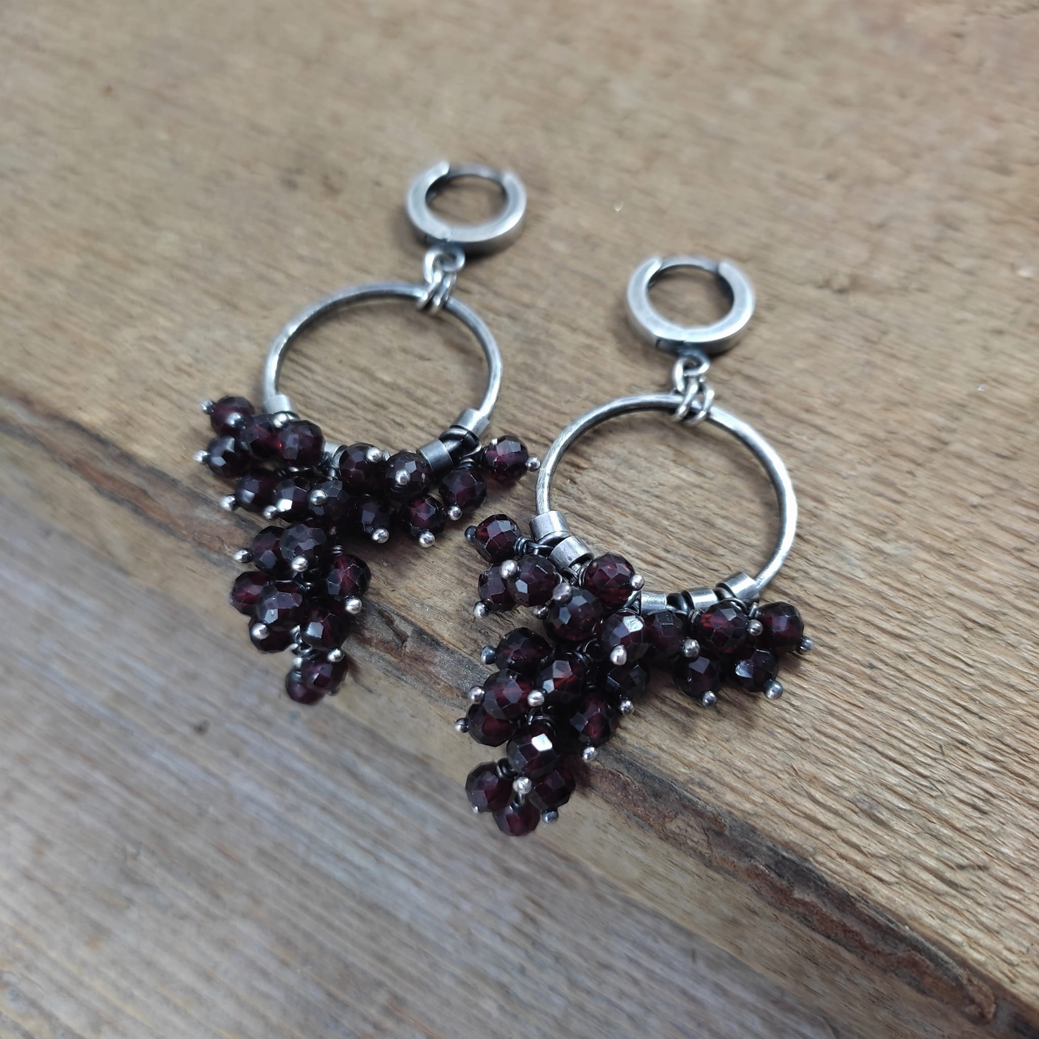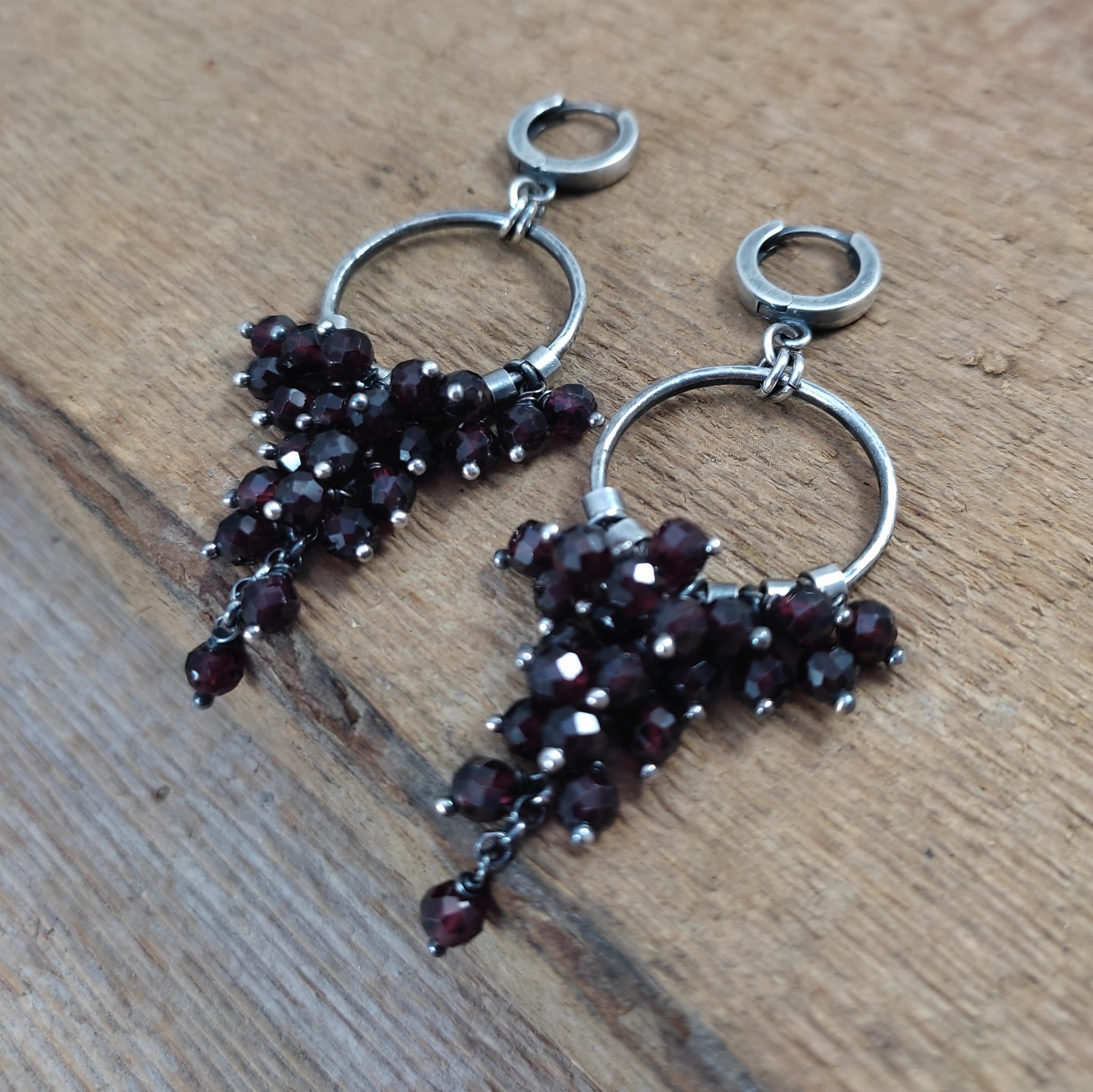 Kolczyki z kulami fasetowanego granatu. Fasetowany granat o średnicy 4 mm. Kamienie posiadają niedoskonałości. Długość całkowita kolczyków wynosi ok. 6,5 cm. Kolczyki zostały wykonane w całości ze srebra 925, srebro oksydowane. Zapakowane w eleganckie pudełko.