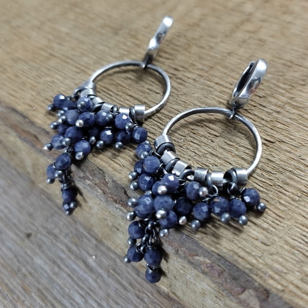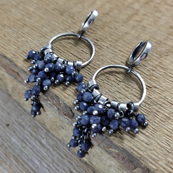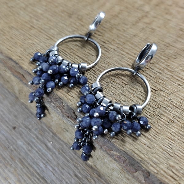 Kolczyki z kulami fasetowanego szafiru. Fasetowany szafir o średnicy 3 mm. Kamienie posiadają niedoskonałości. Długość całkowita kolczyków wynosi ok. 6,2 cm. Kolczyki zostały wykonane w całości ze srebra 925, srebro oksydowane. Zapakowane w eleganckie pudełko.