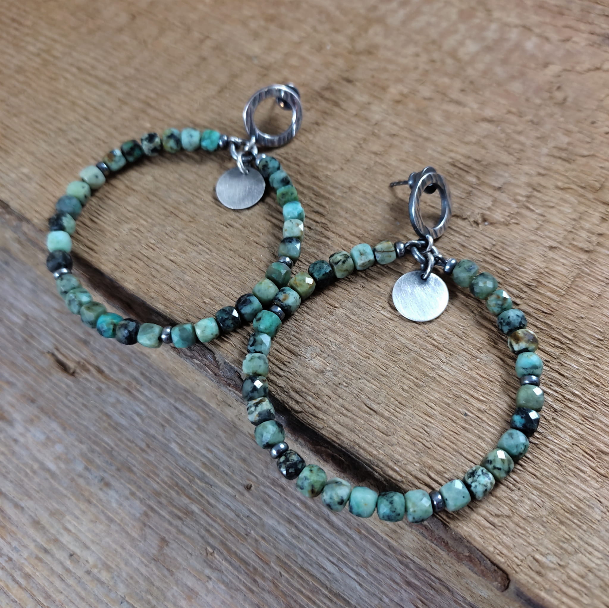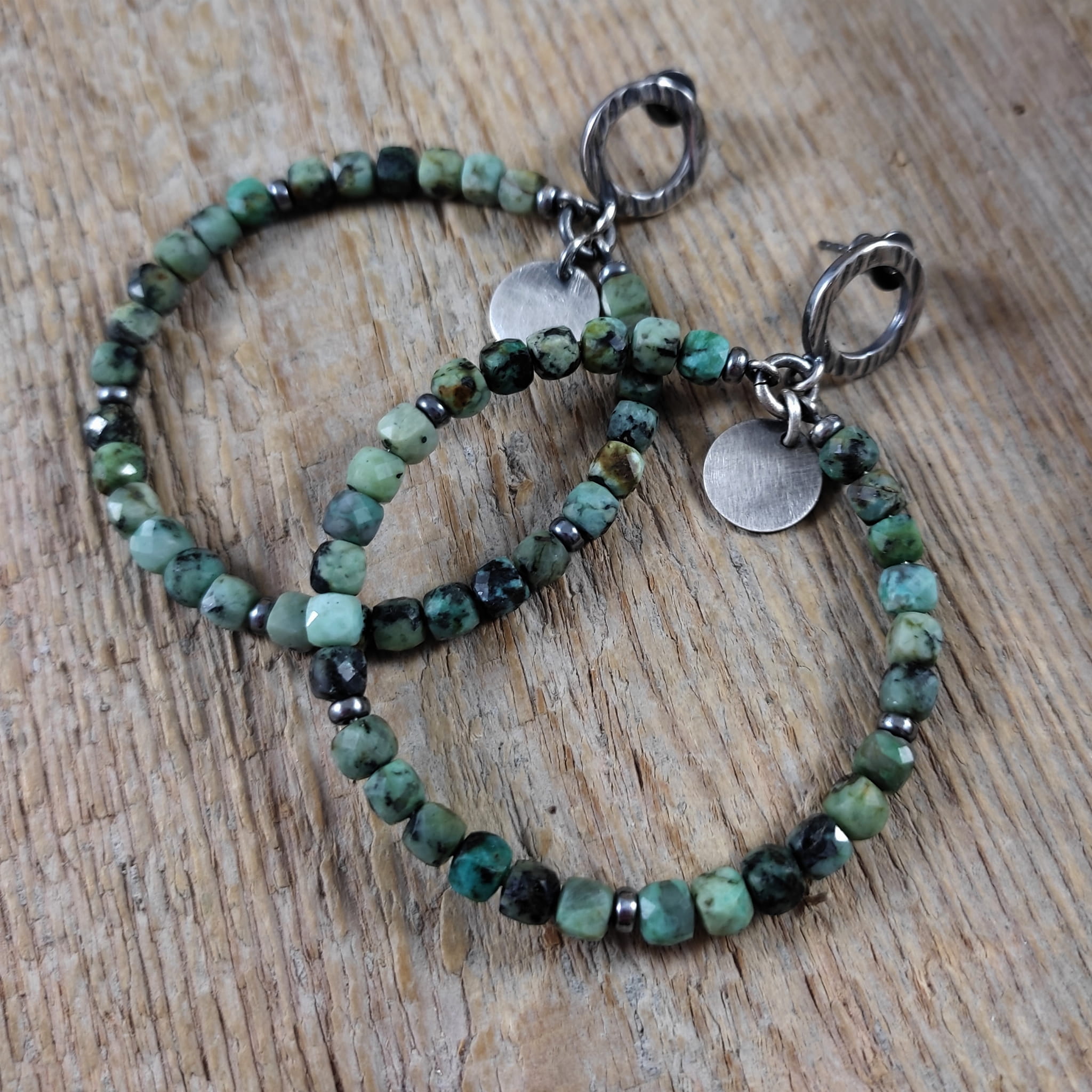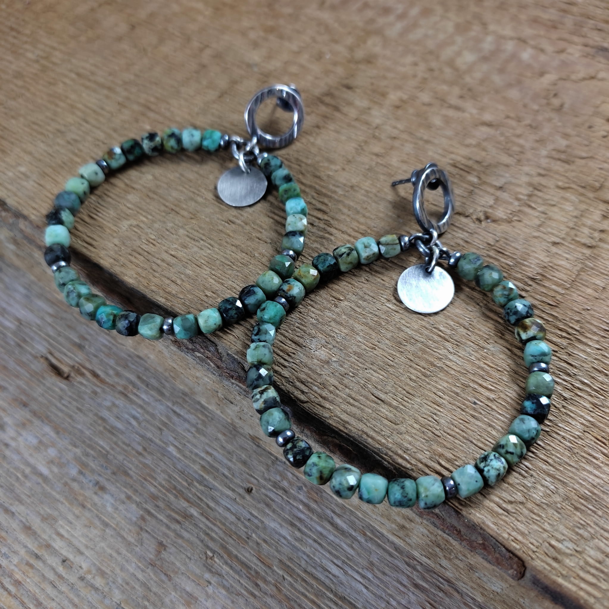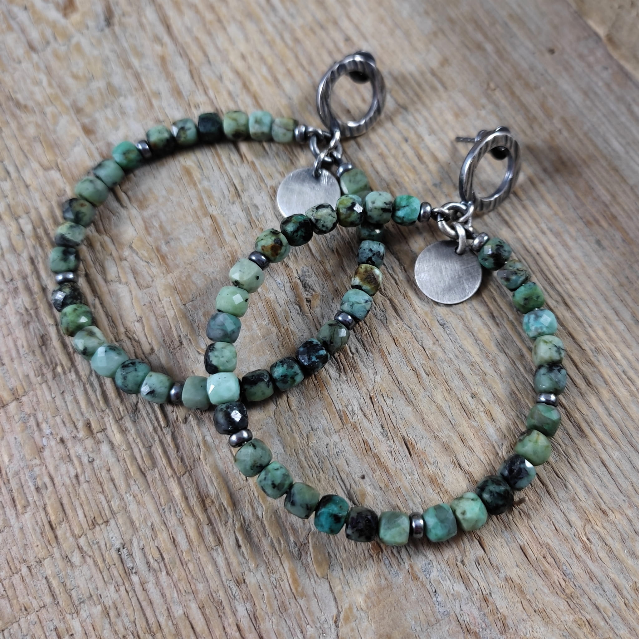 Kolczyki wykonane z sześcianów turkusu ok. 4 mm. Całość oprawiona w srebro 925, oksydowane i wypolerowane. Długość całkowita kolczyków wynosi ok. 6,5 cm. Elegancko zapakowane.