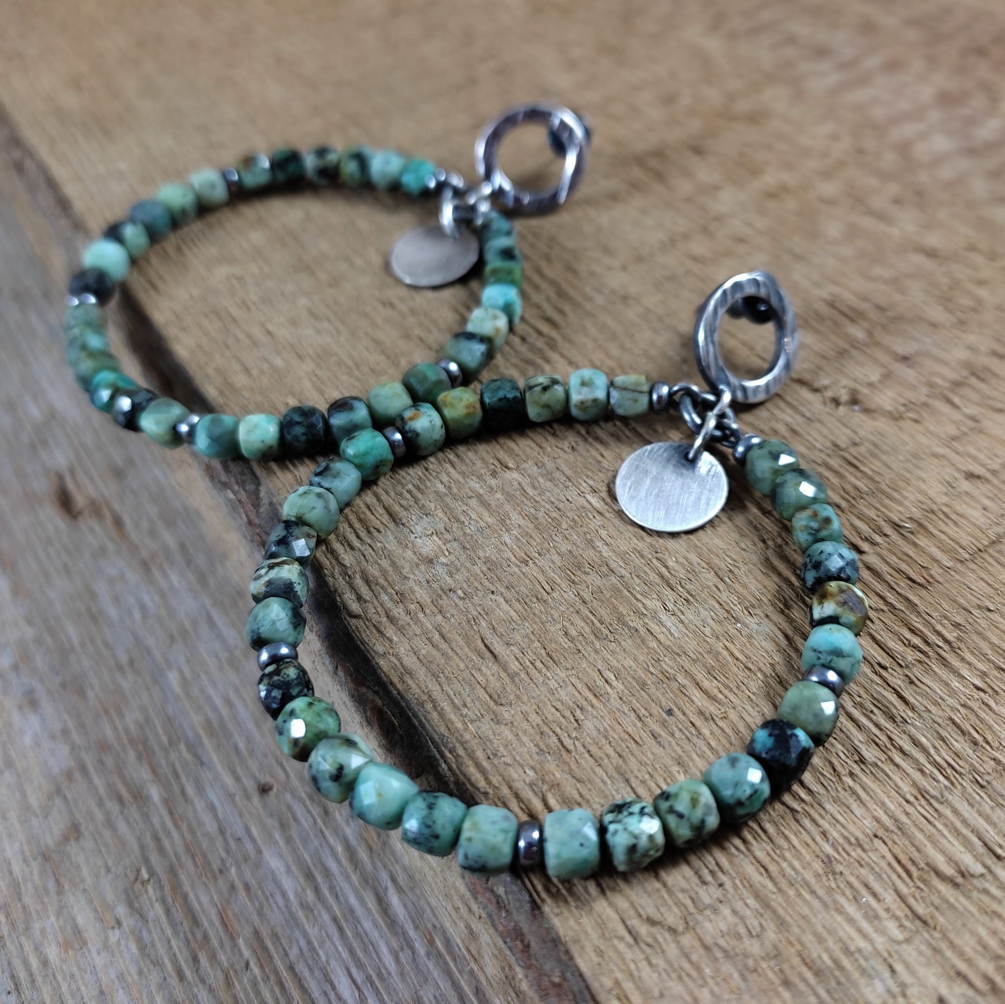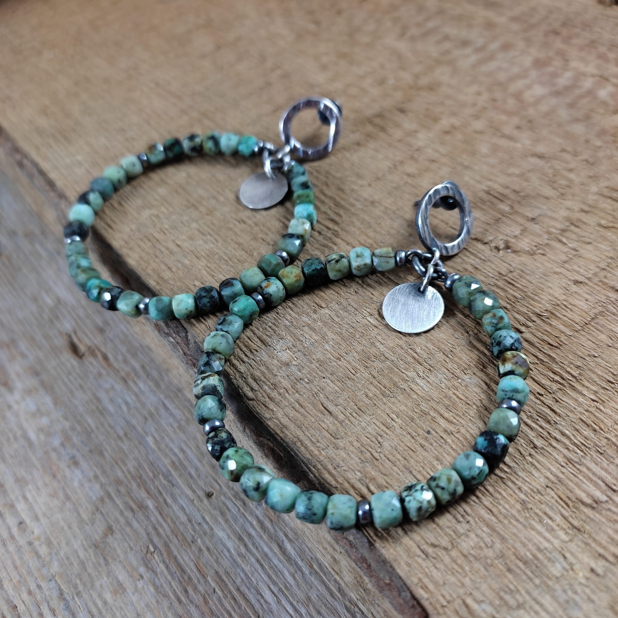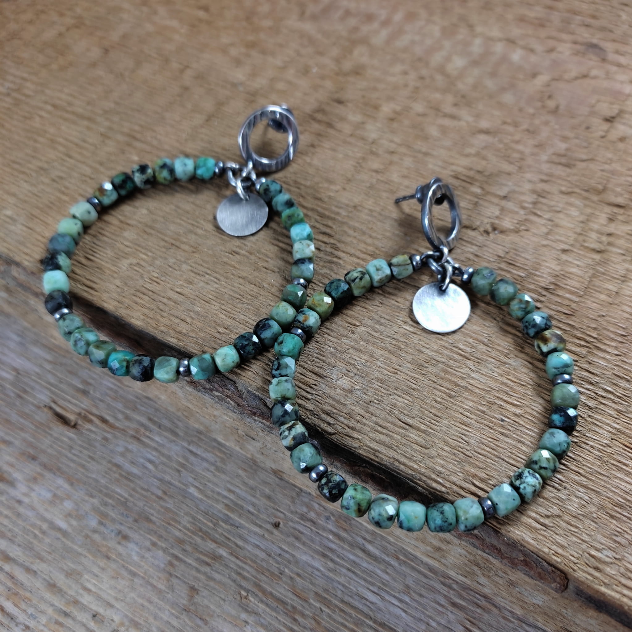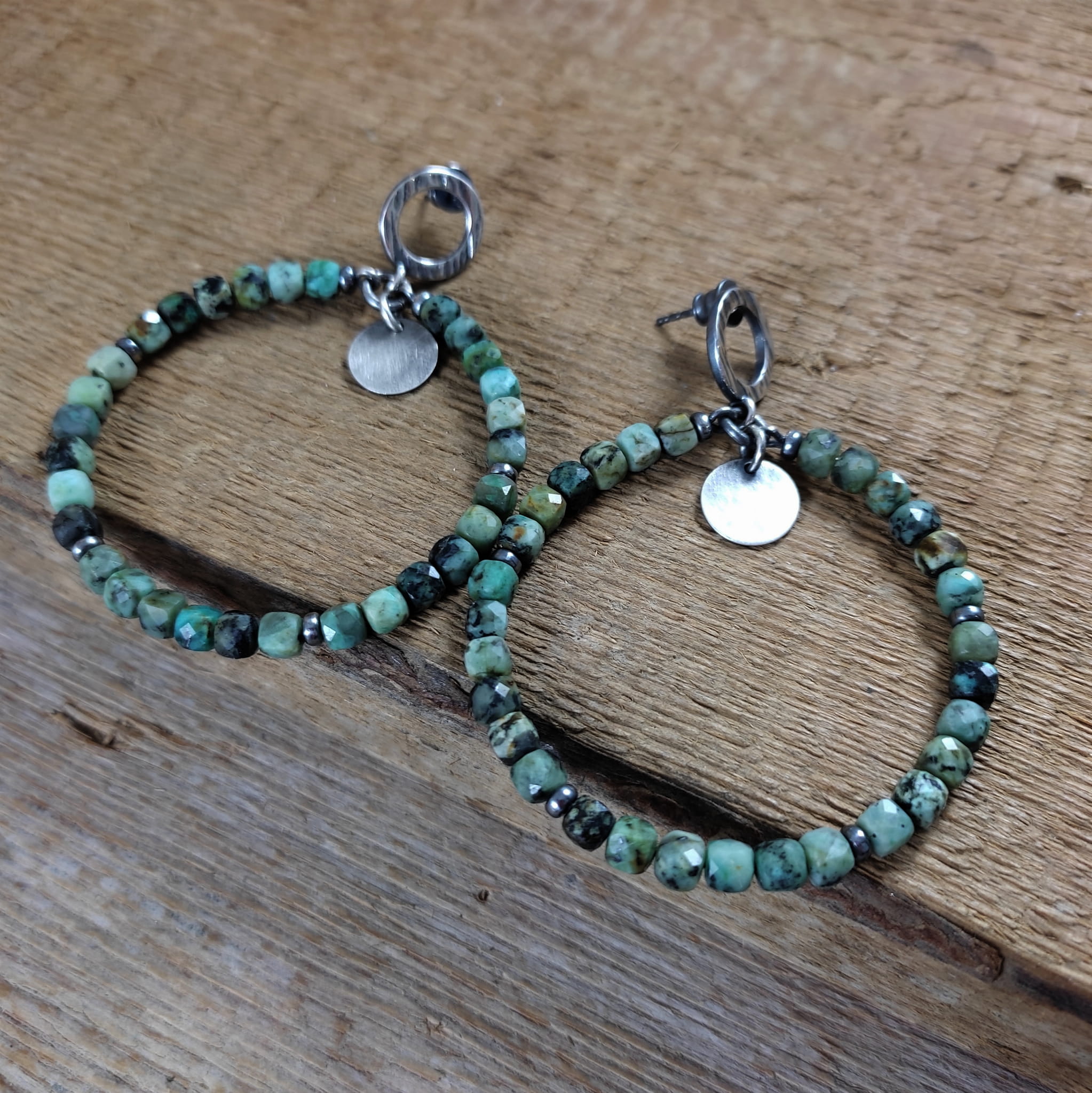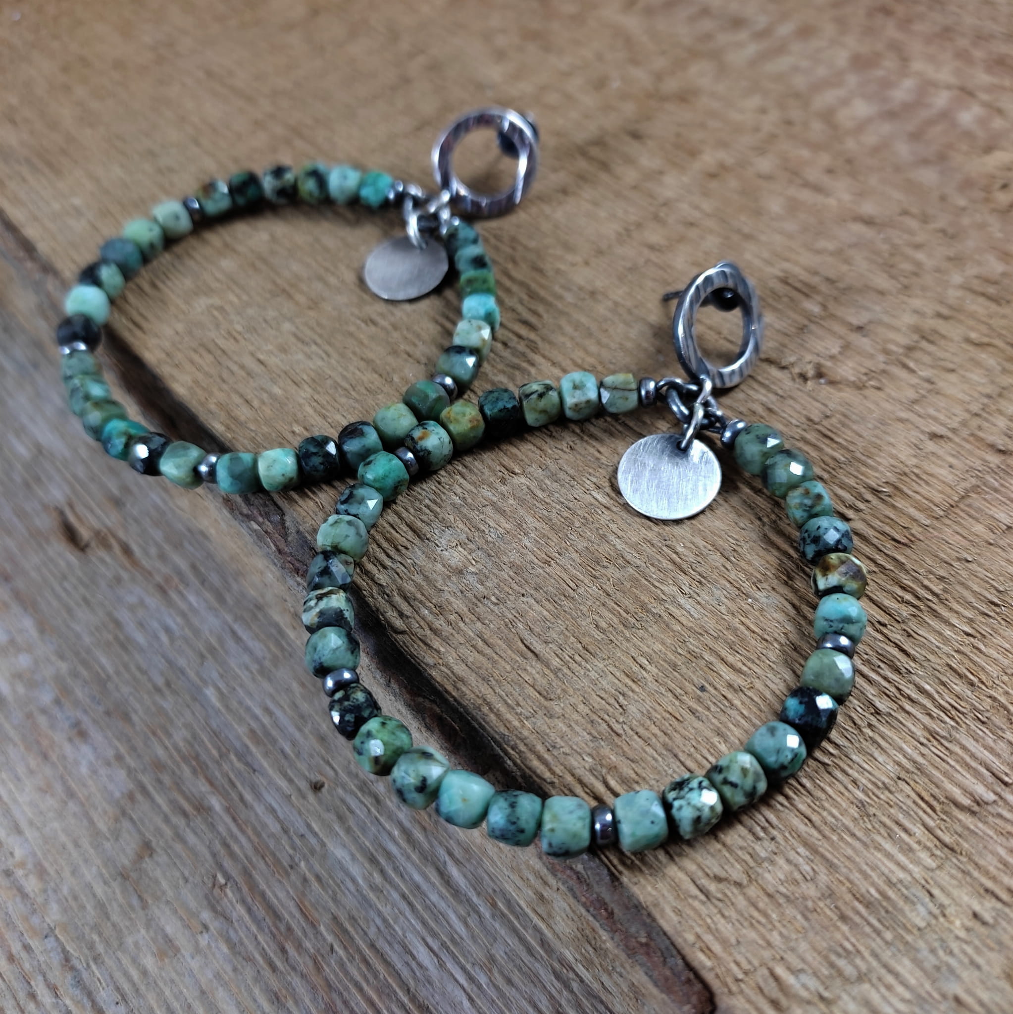 Kolczyki wykonane z sześcianów turkusu ok. 4 mm. Całość oprawiona w srebro 925, oksydowane i wypolerowane. Długość całkowita kolczyków wynosi ok. 6,5 cm. Elegancko zapakowane.