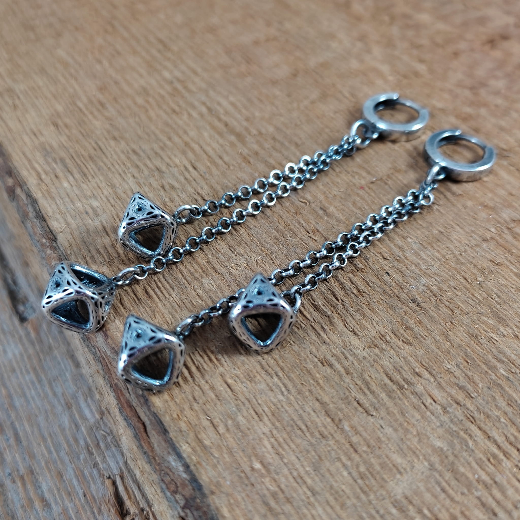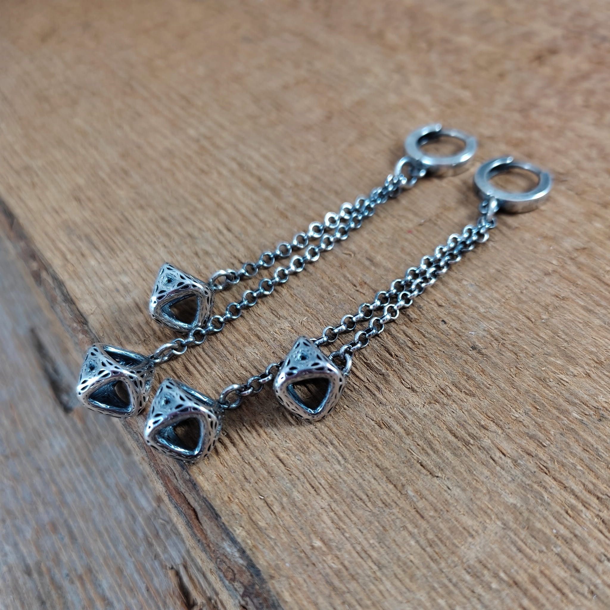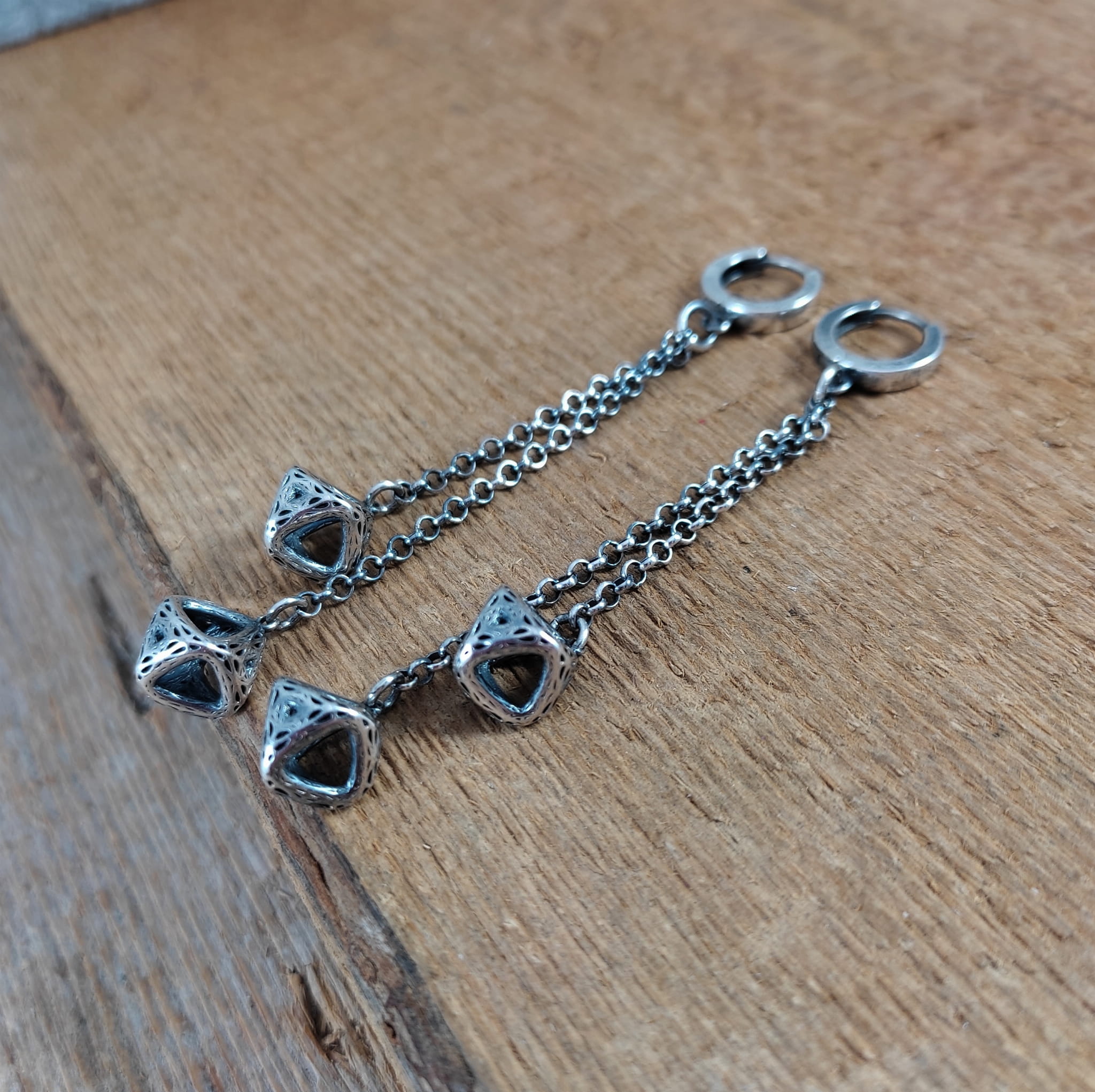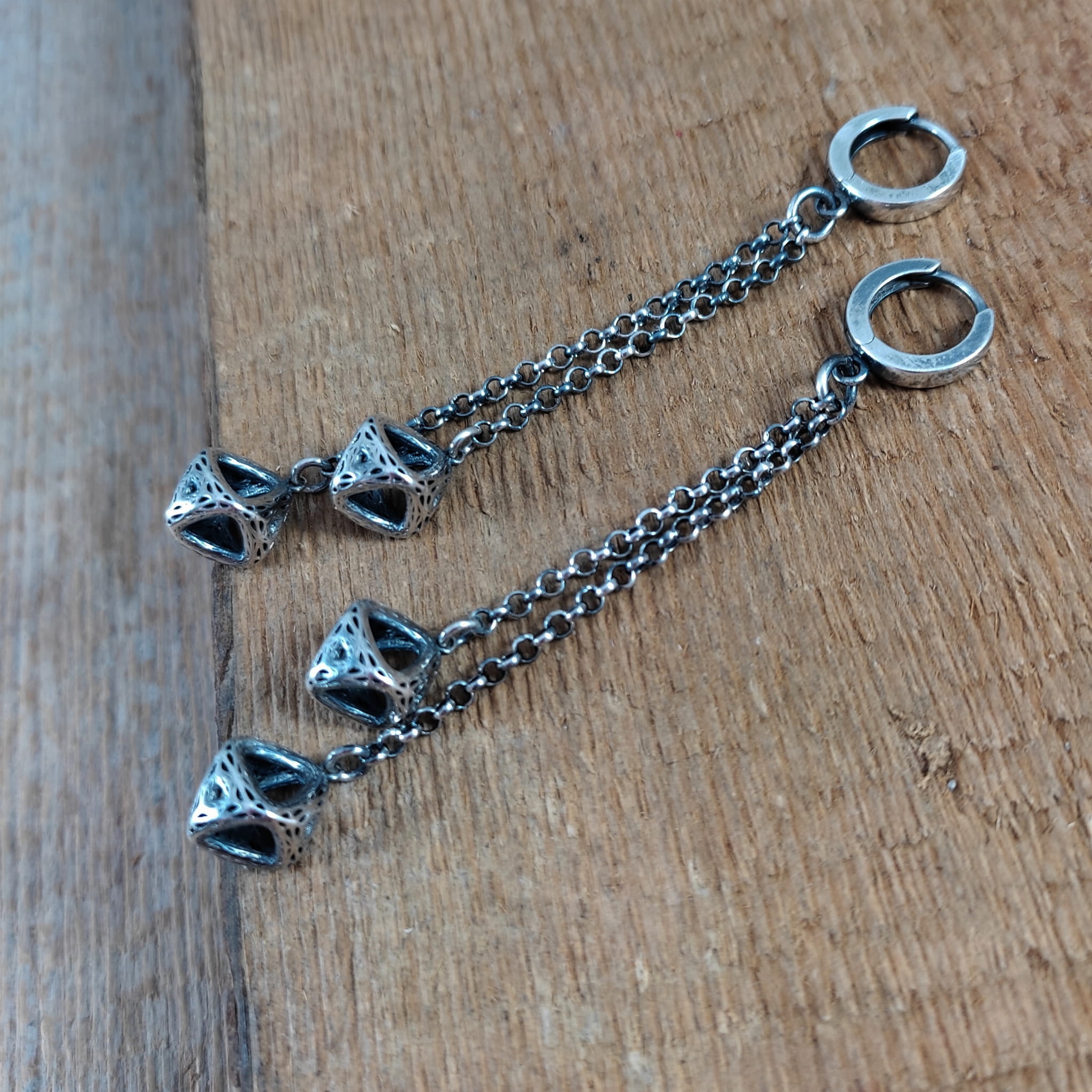 Kolczyki wykonane ze srebra 925, oksydowanego i wypolerowanego. Całkowita długość kolczyków wynosi ok. 7,8 cm.