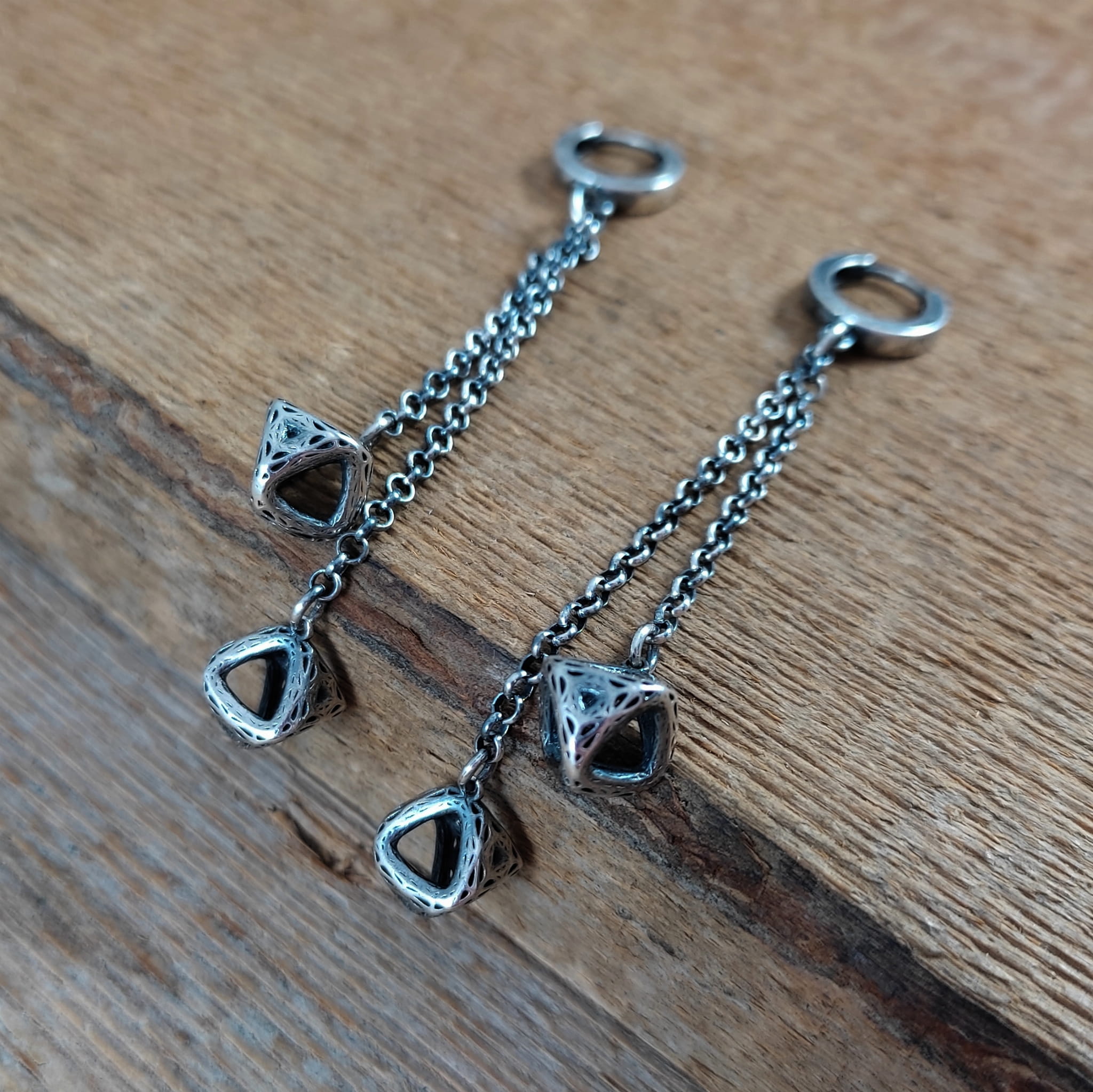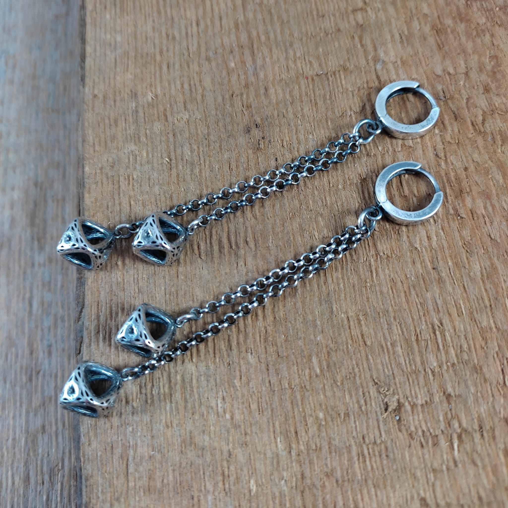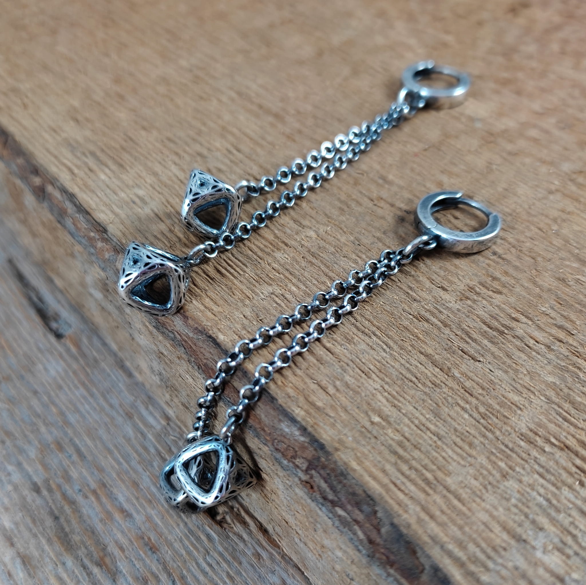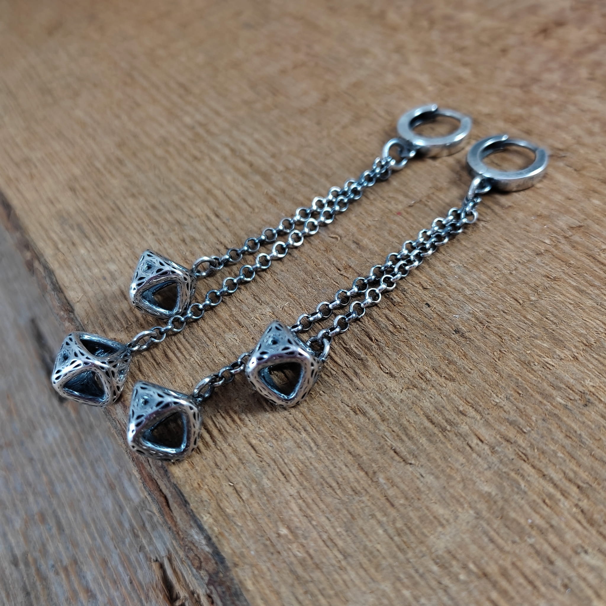 Kolczyki wykonane ze srebra 925, oksydowanego i wypolerowanego. Całkowita długość kolczyków wynosi ok. 7,8 cm.