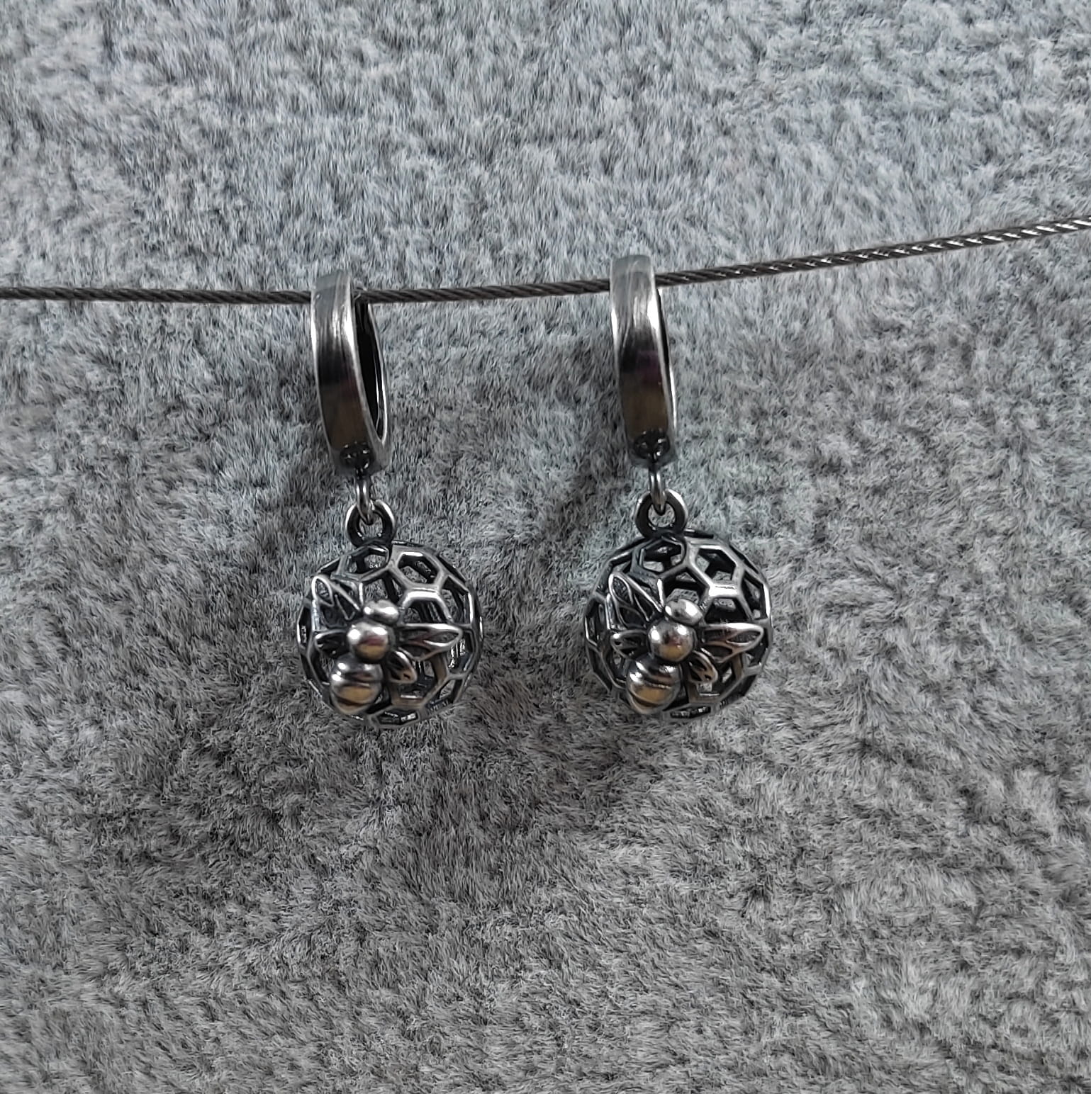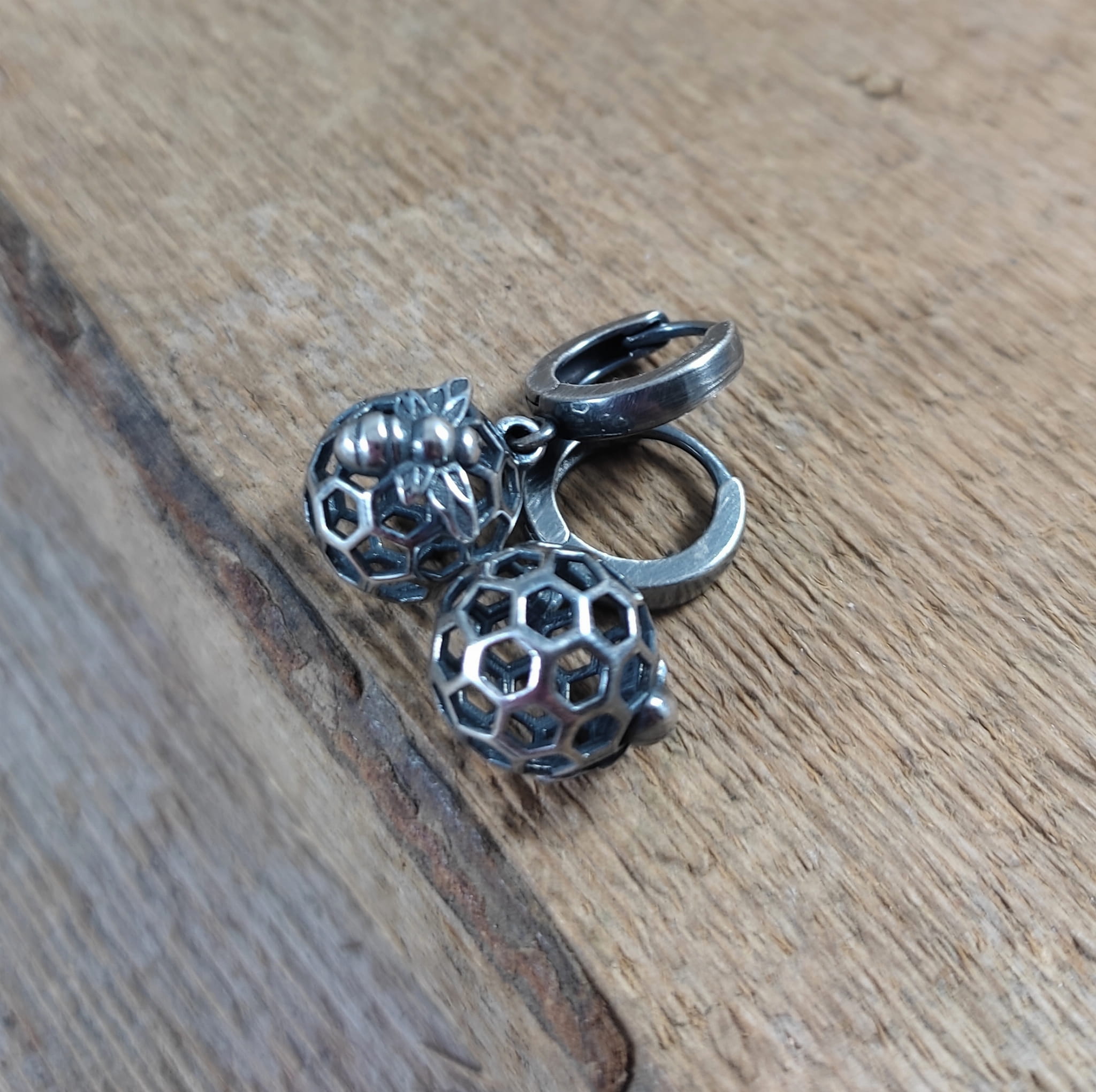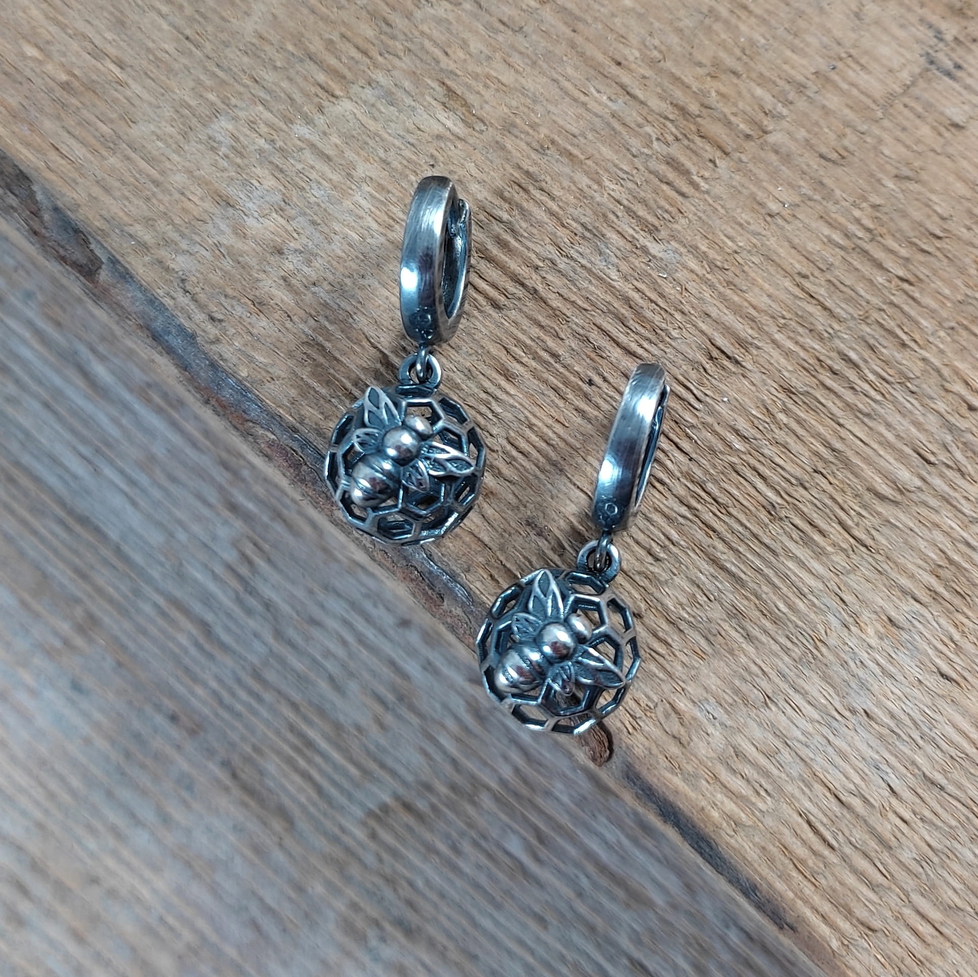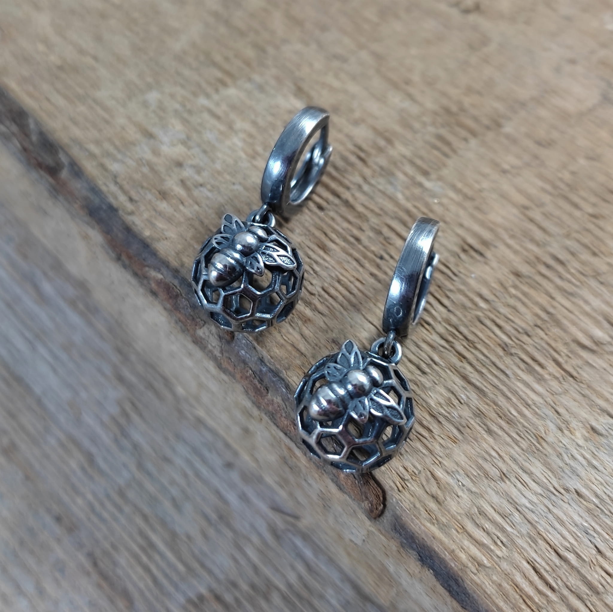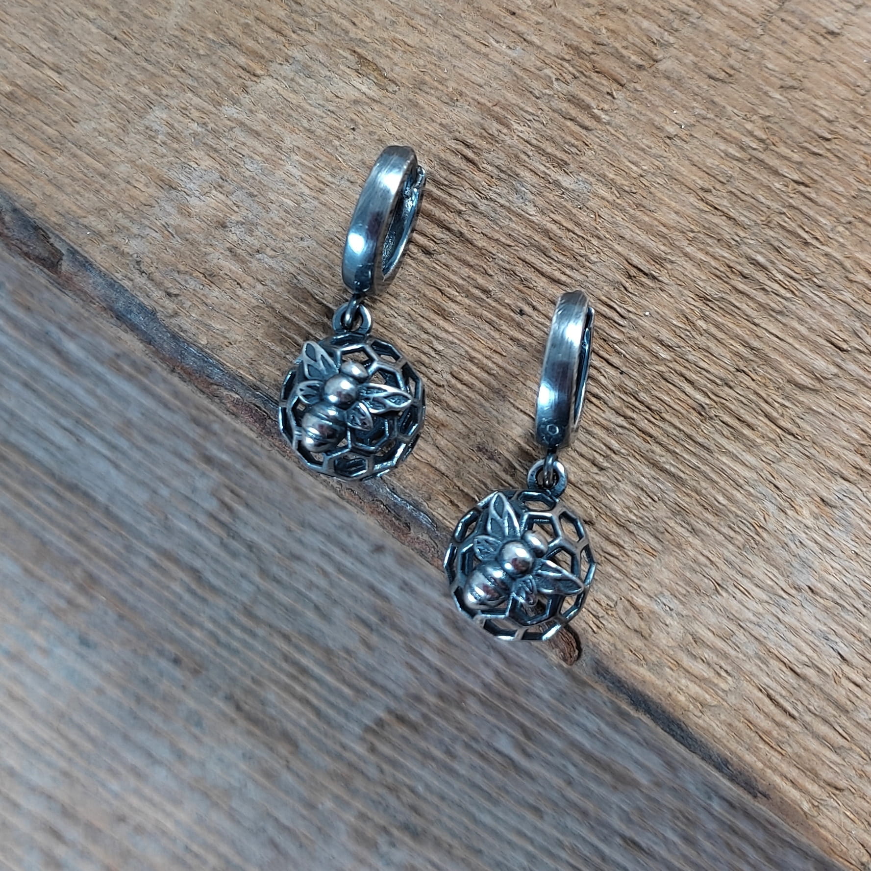 Kolczyki wykonane ze srebra 925, oksydowanego i wypolerowanego. Długość całkowita kolczyków wynosi ok. 2,6 cm. Wielkość kuli z pszczołą wynosi ok 1,1 cm. Elegancko zapakowane.