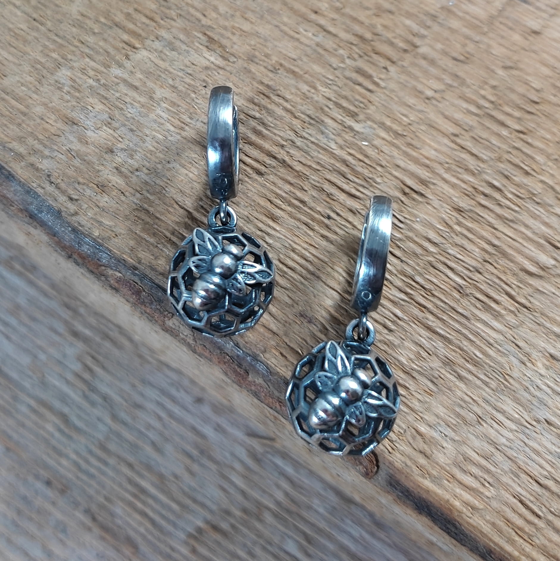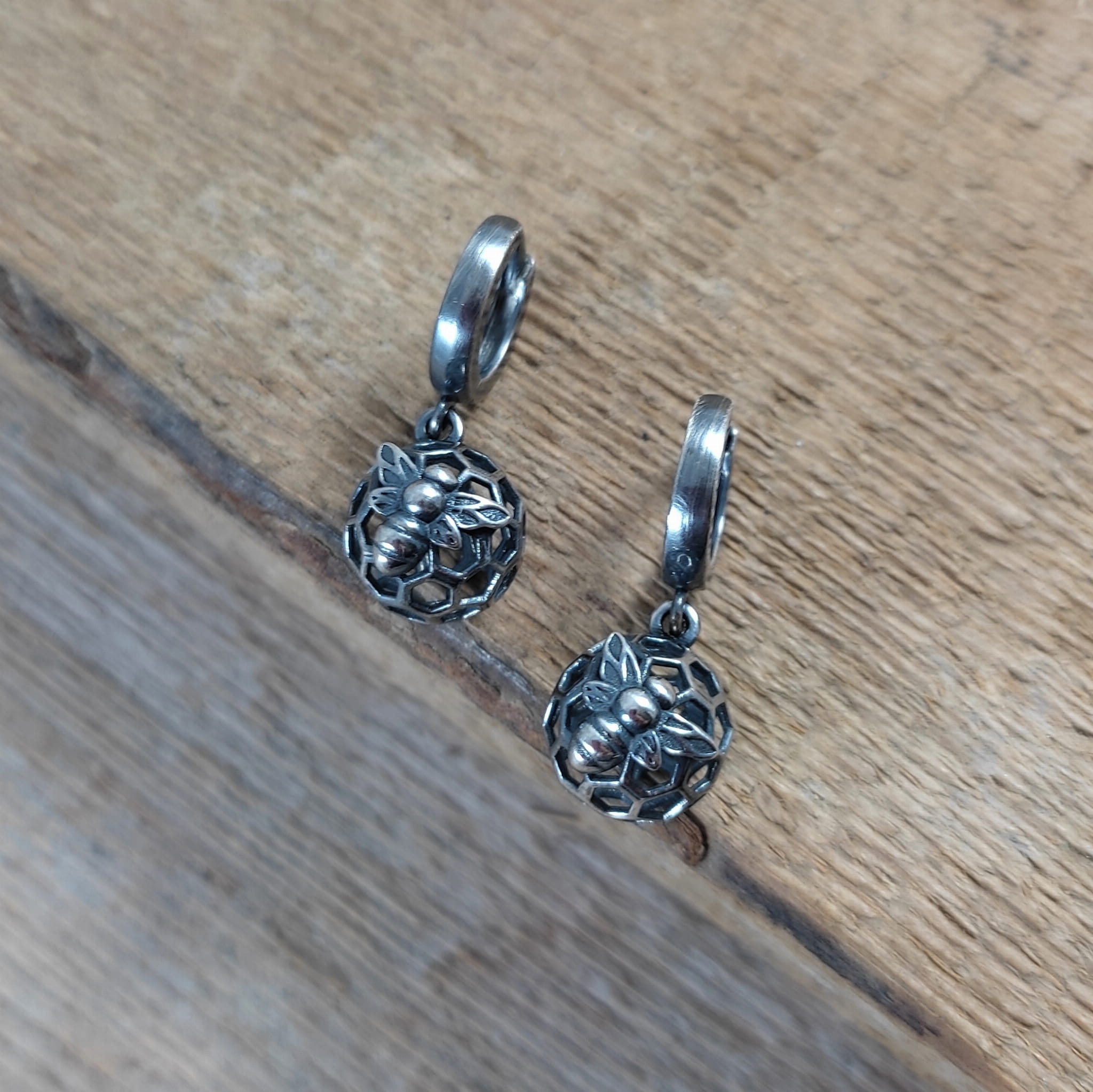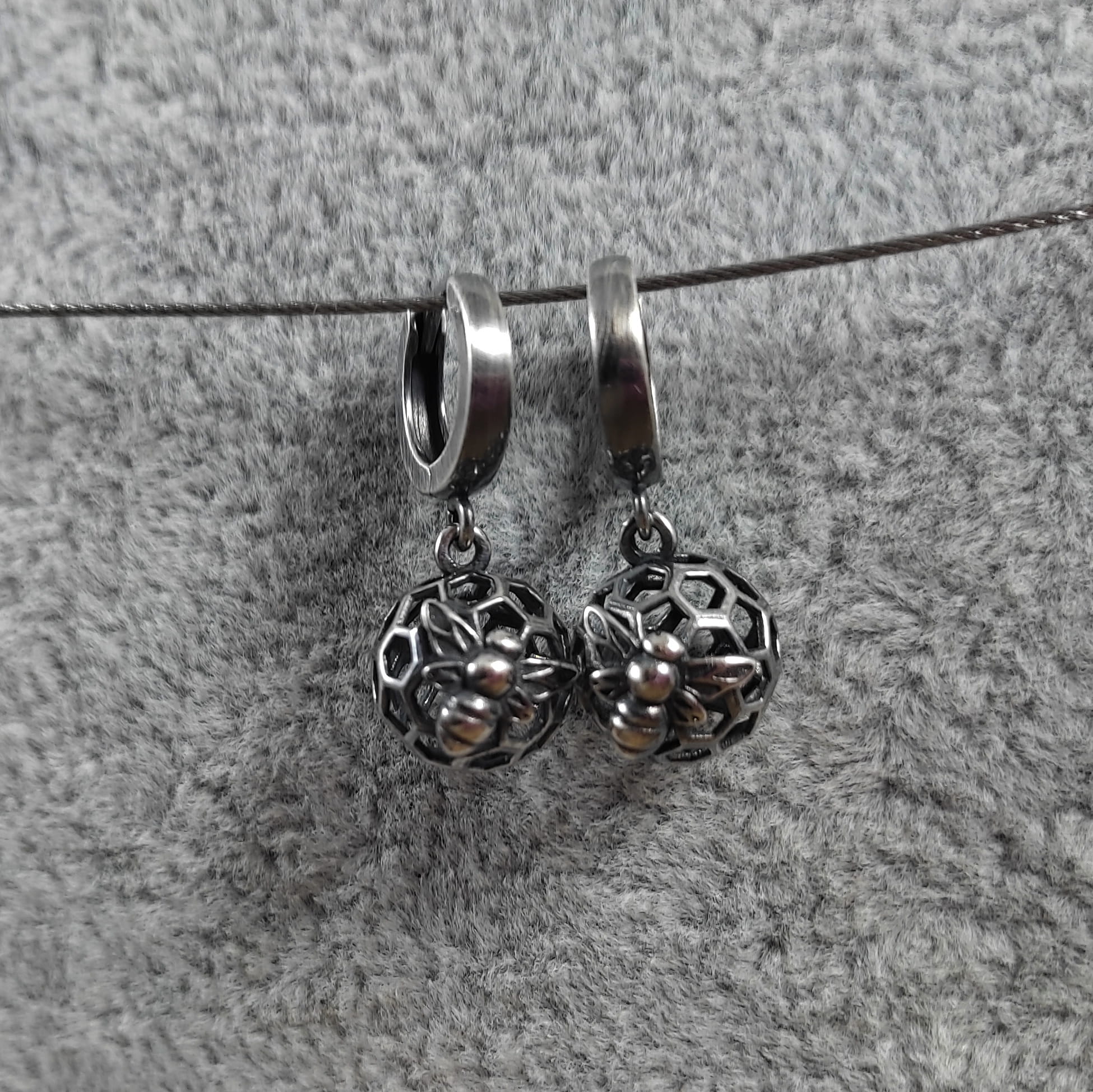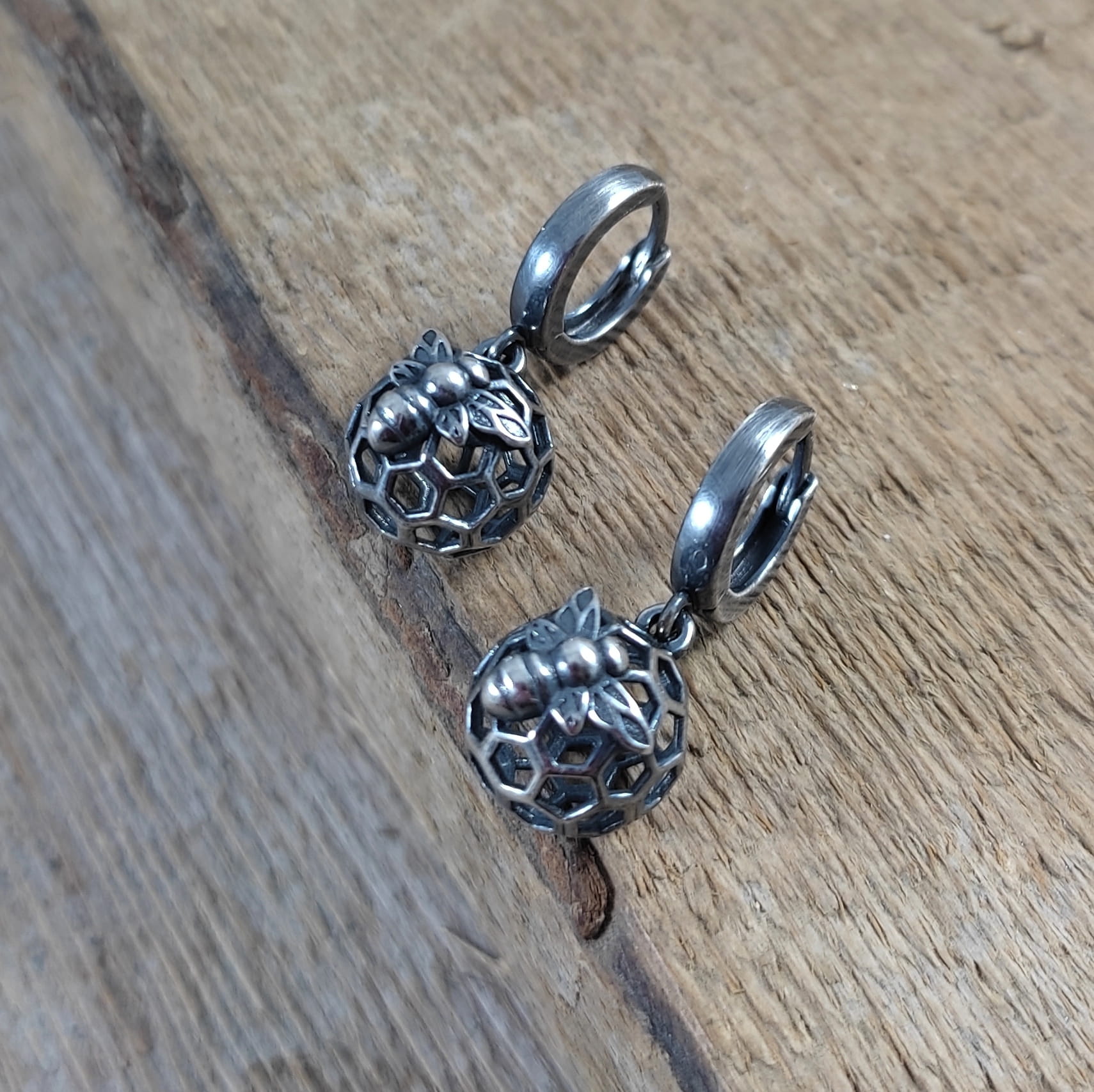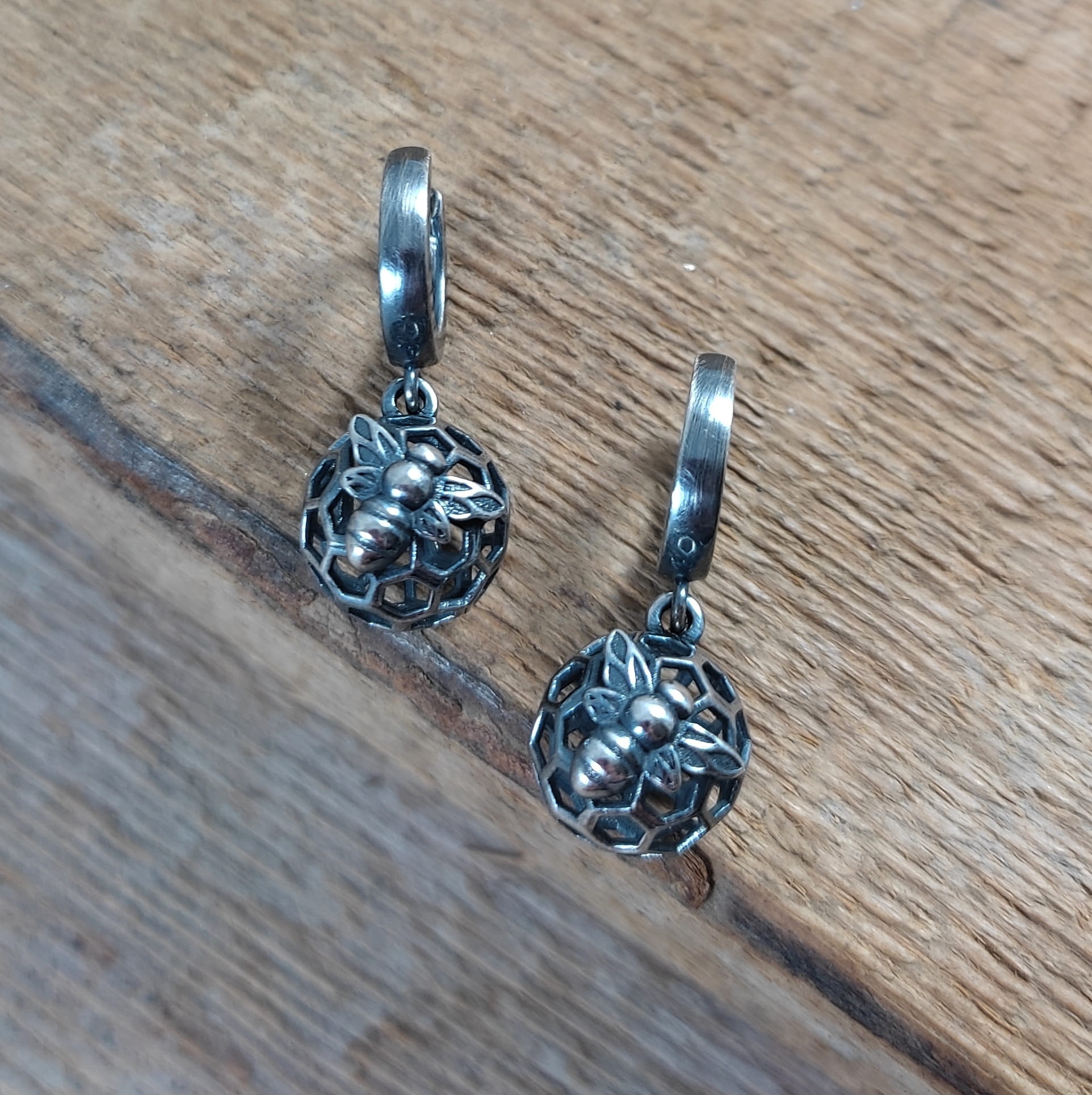 Kolczyki wykonane ze srebra 925, oksydowanego i wypolerowanego. Długość całkowita kolczyków wynosi ok. 2,6 cm. Wielkość kuli z pszczołą wynosi ok 1,1 cm. Elegancko zapakowane.