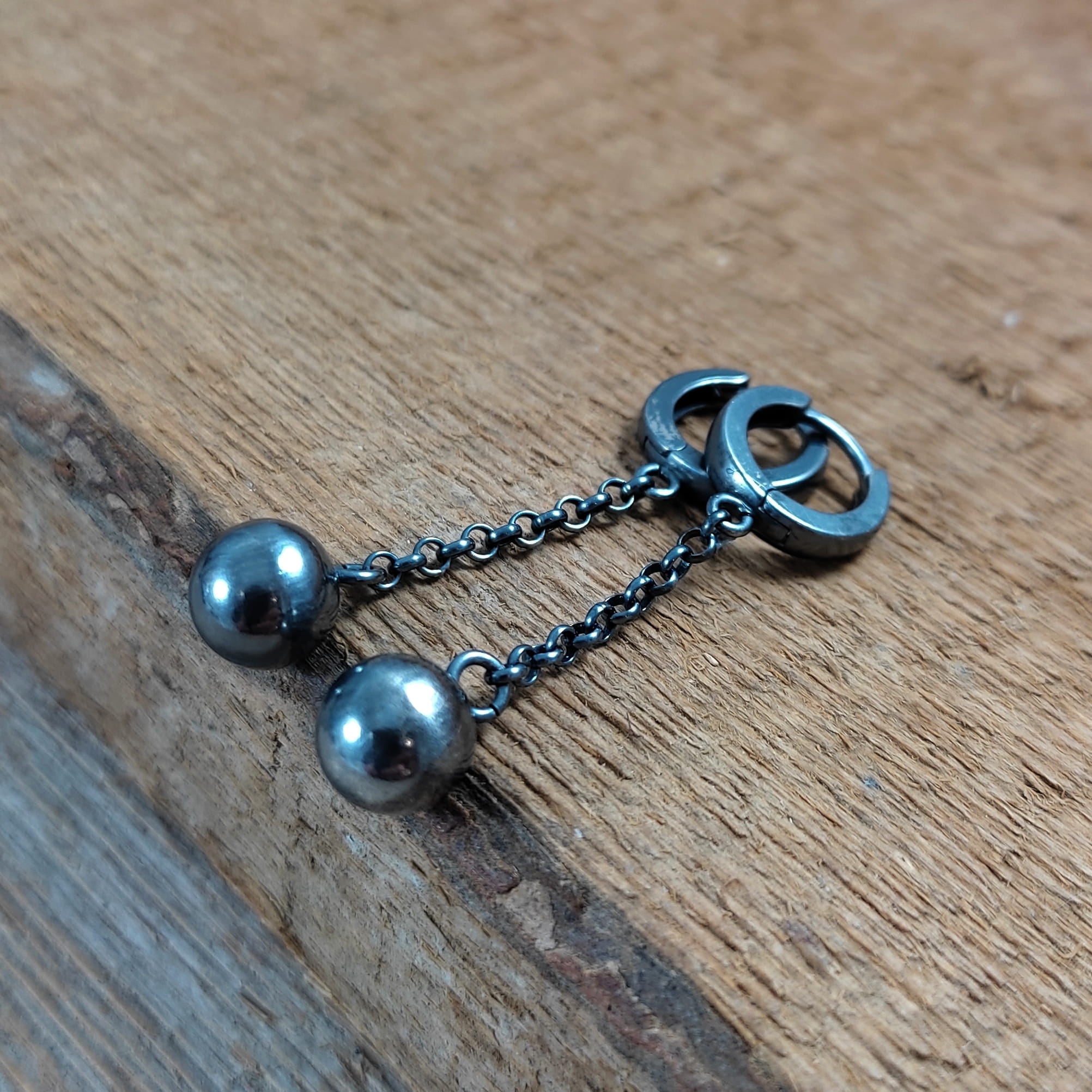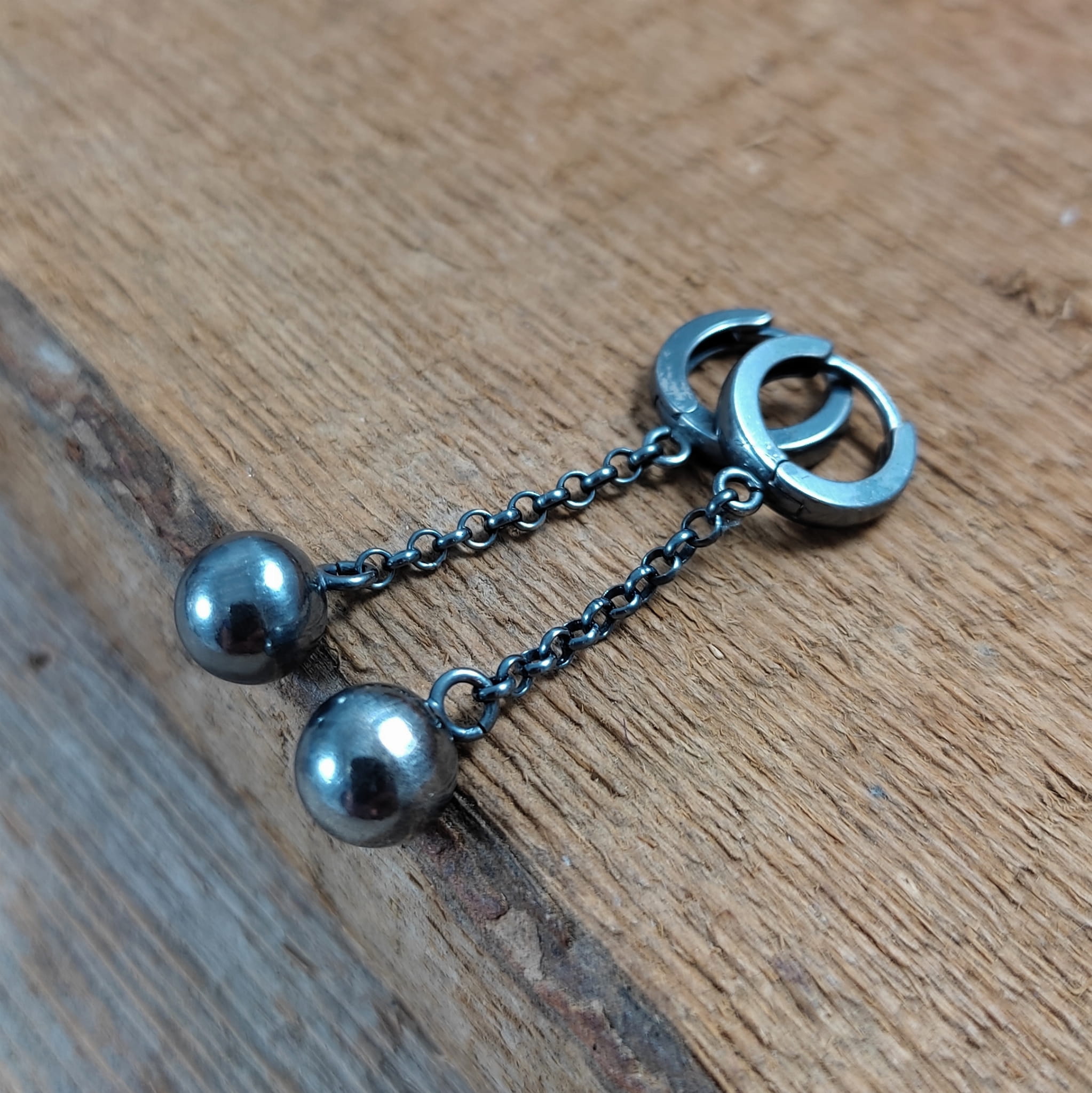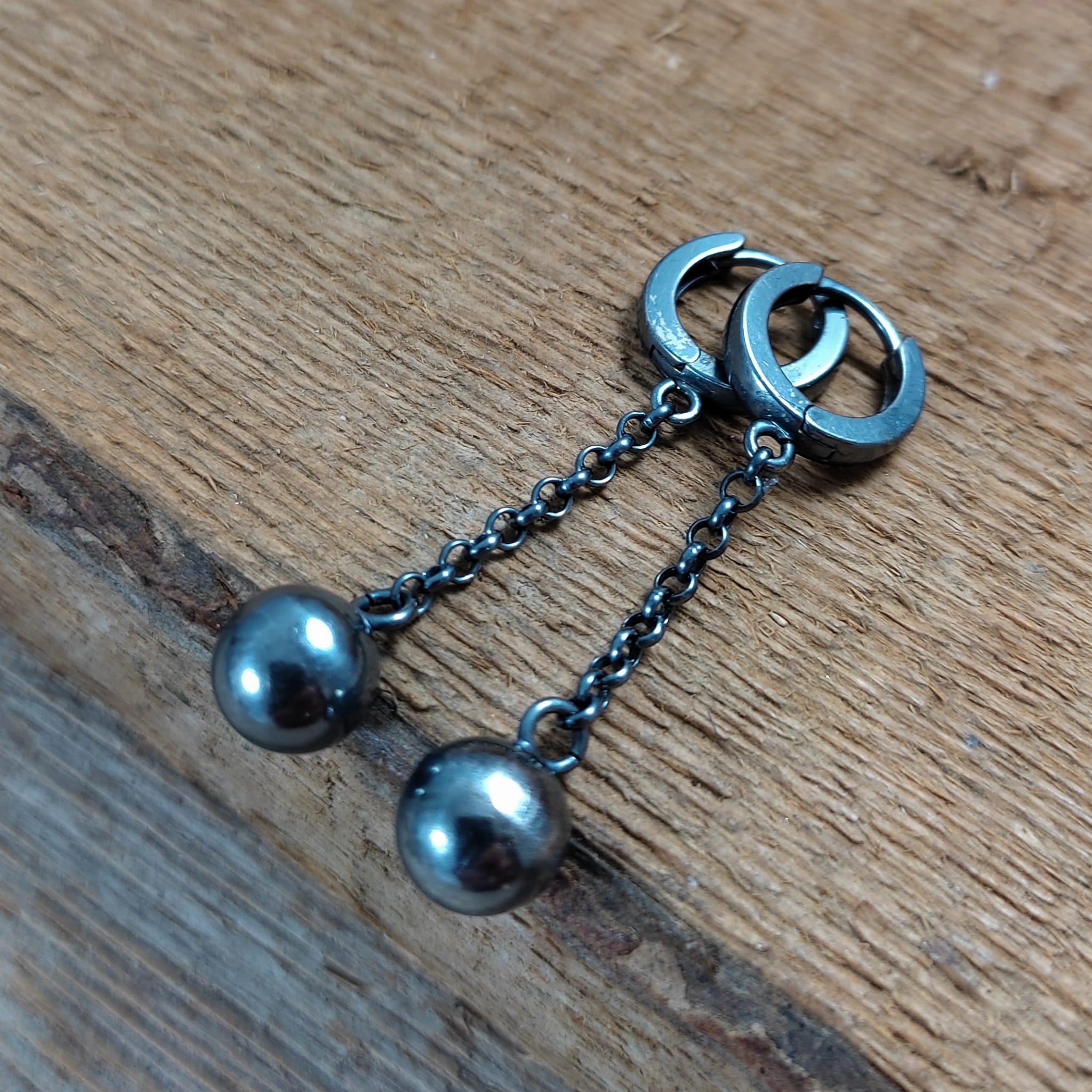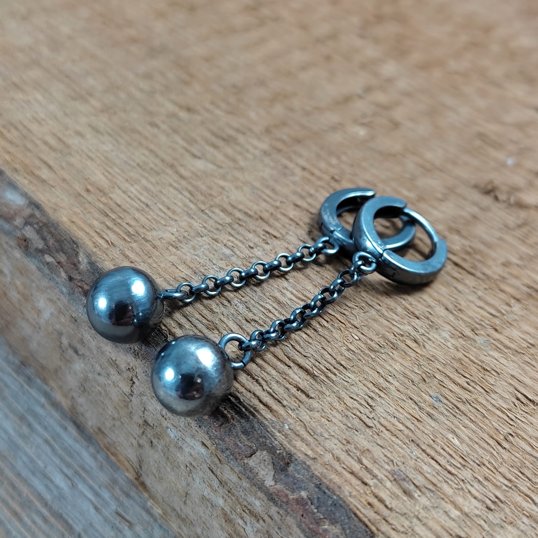 Kolczyki wykonane ze srebra 925, oksydowanego i wypolerowanego. Wielkość kuli ok. 8 mm. Całkowita długość kolczyków wynosi ok. 4,4 cm. Elegancko zapakowane.