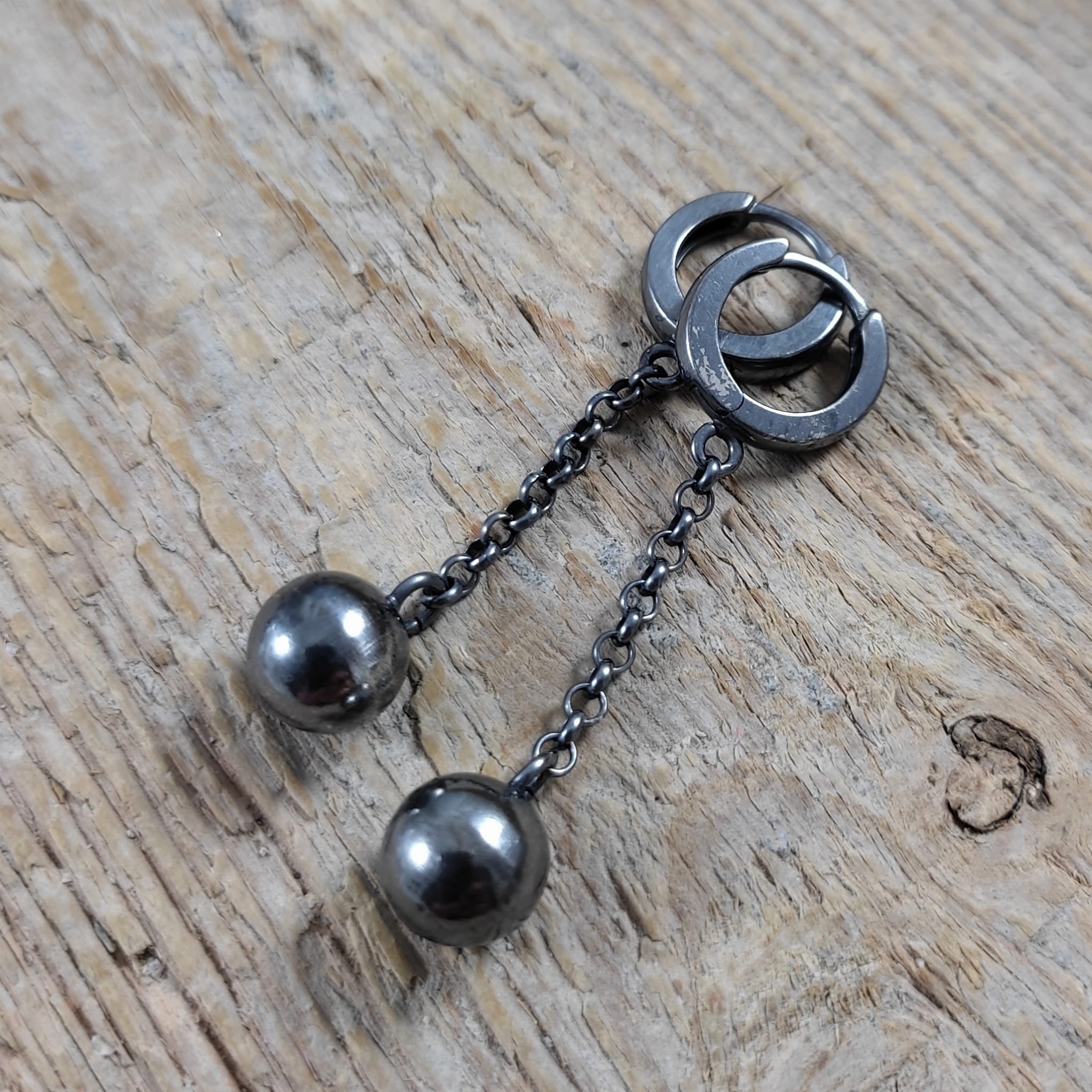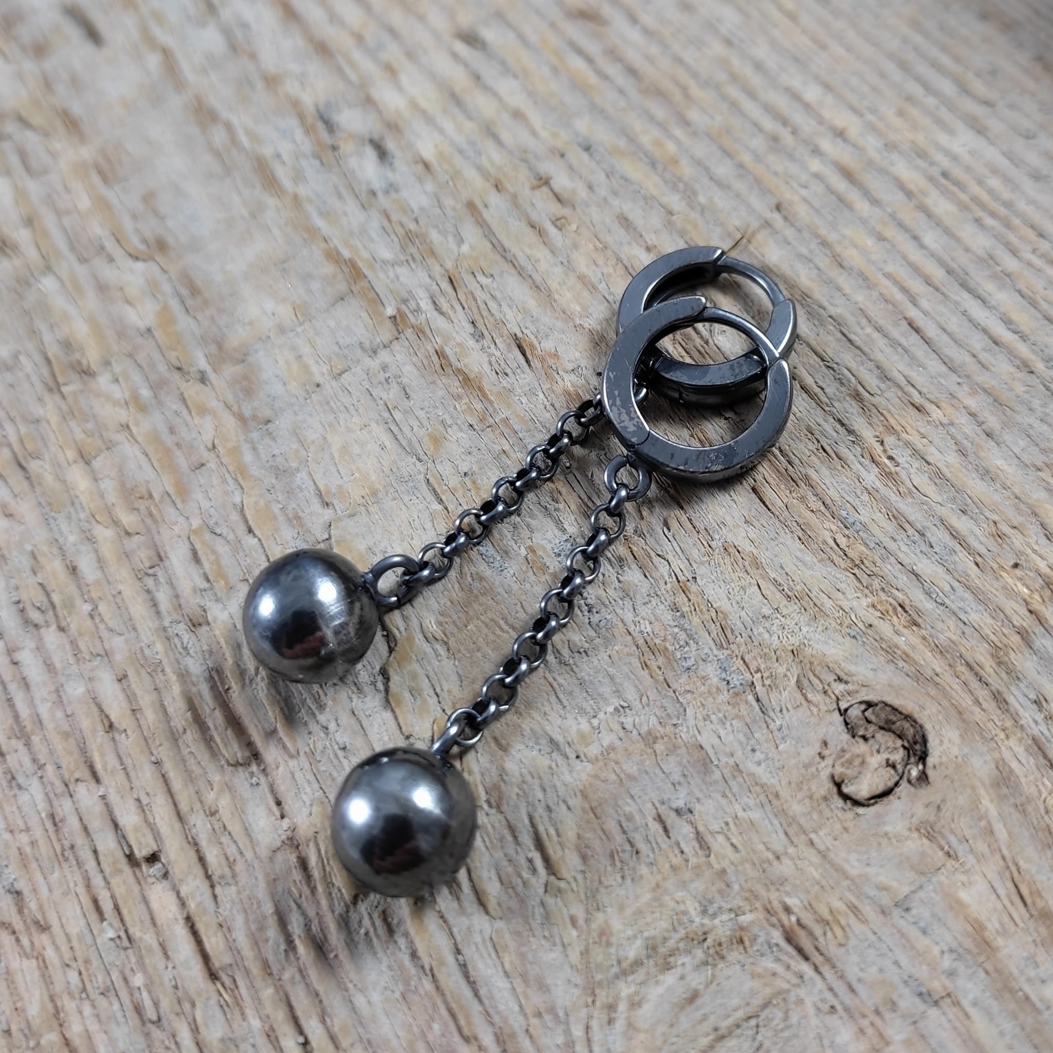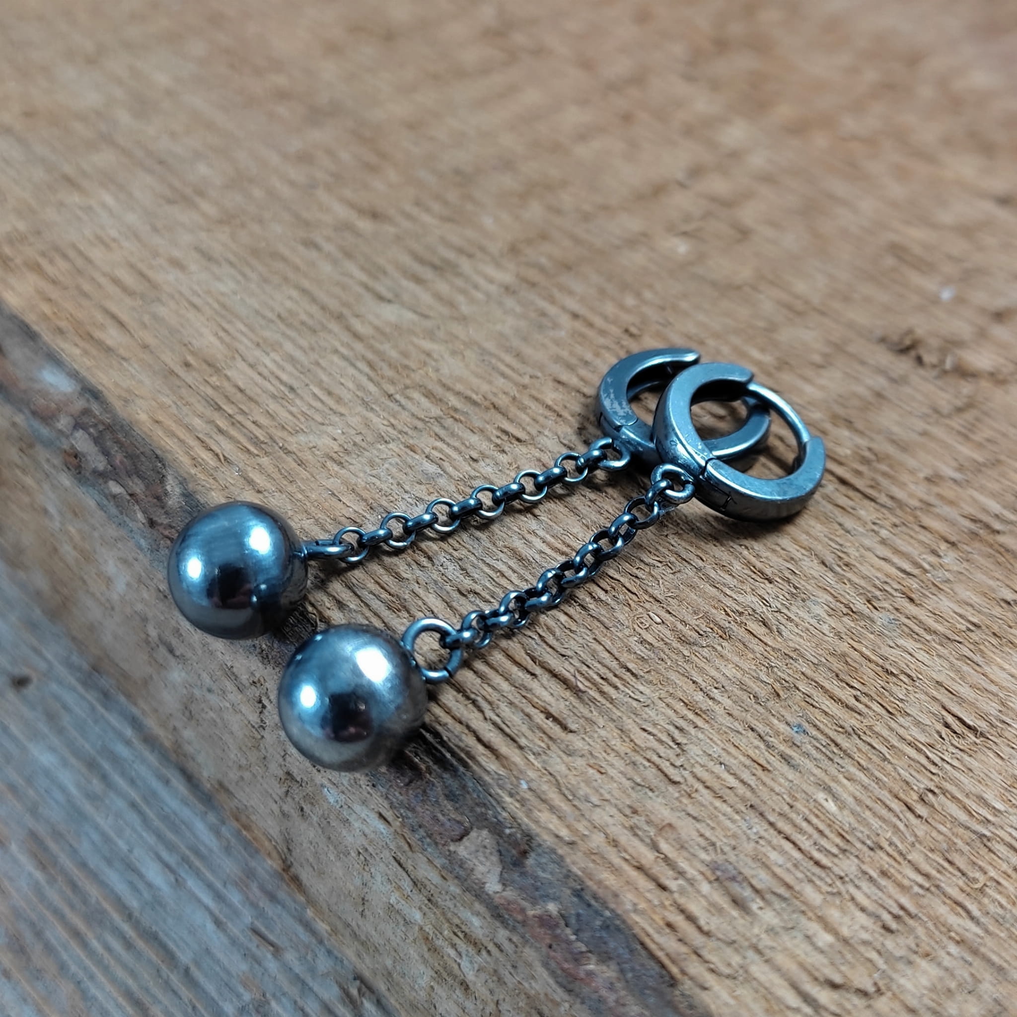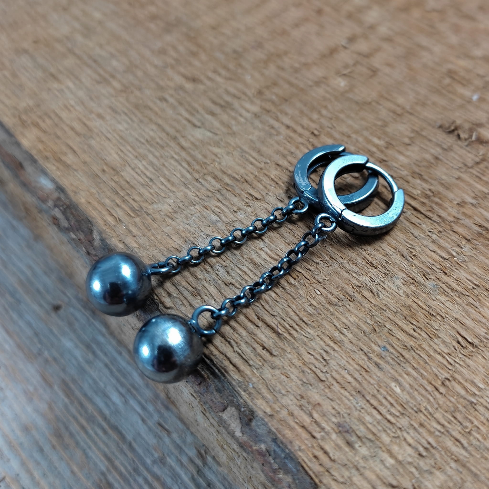 Kolczyki wykonane ze srebra 925, oksydowanego i wypolerowanego. Wielkość kuli ok. 8 mm. Całkowita długość kolczyków wynosi ok. 4,4 cm. Elegancko zapakowane.