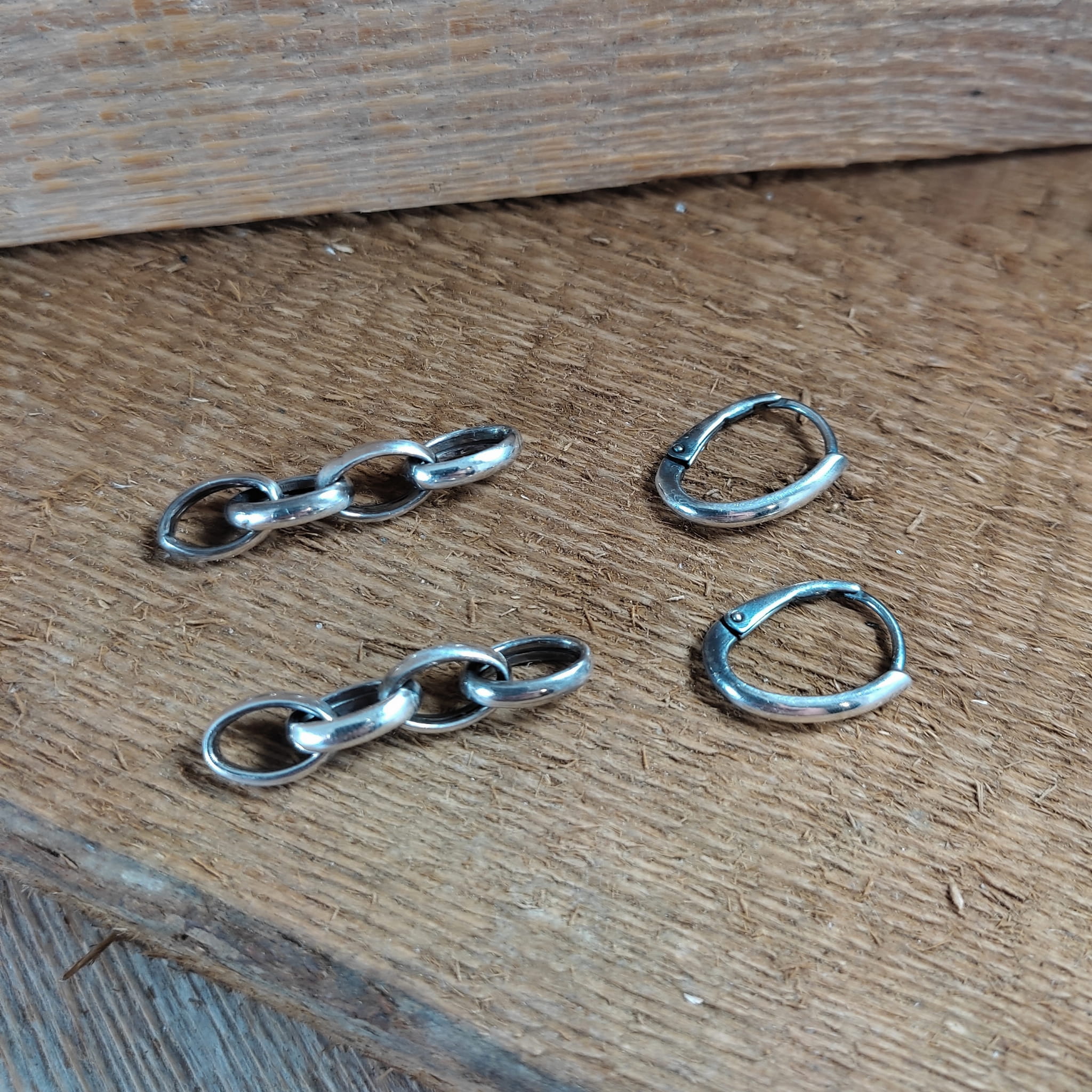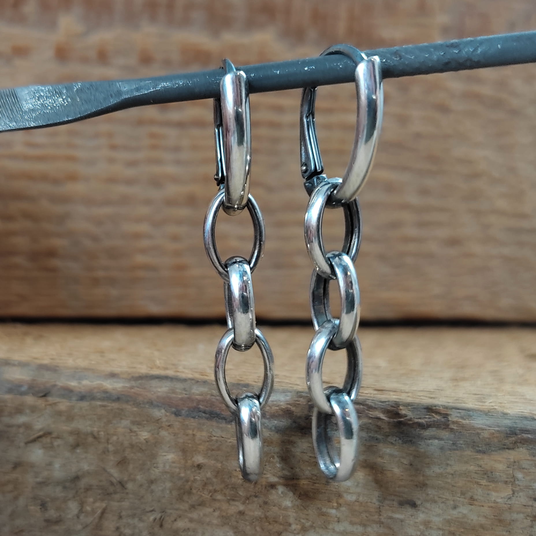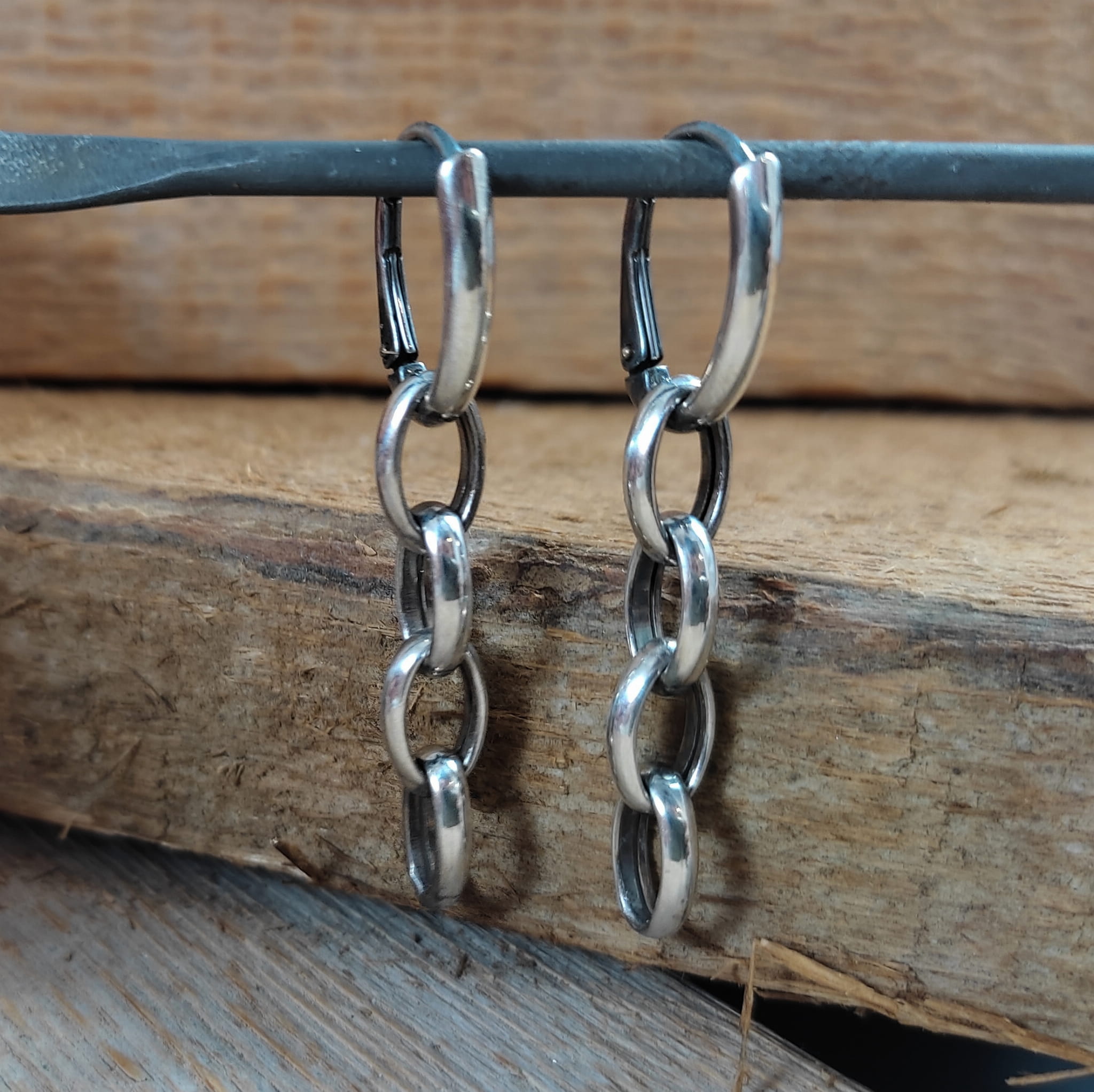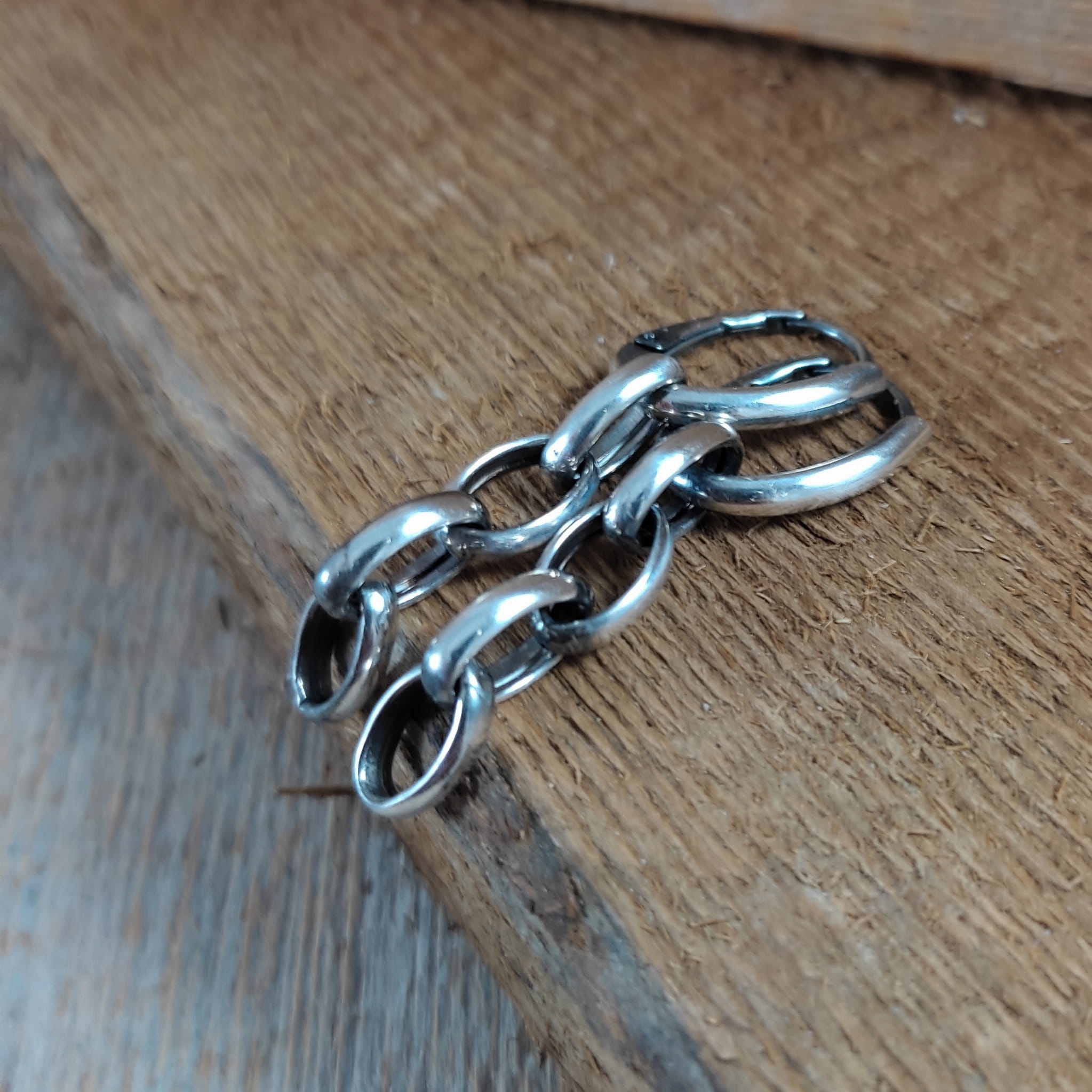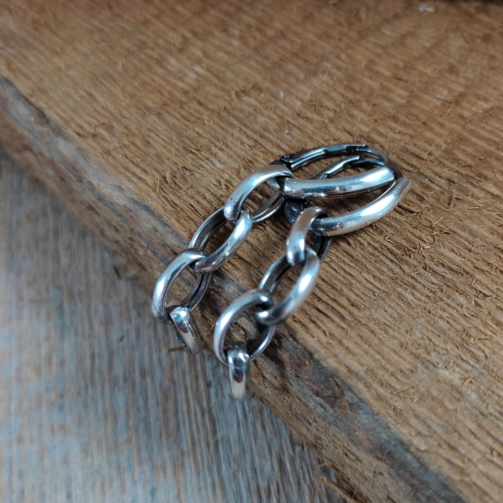 Kolczyki wykonane ze srebra 925, oksydowanego i wypolerowanego. Długość całkowita kolczyków wynosi 48 mm. Uniwersalne kolczyki, które można nosić w dwóch wersjach. Wielkość ogniwka łańcucha wynosi 7/10 mm. Elegancko zapakowane.
