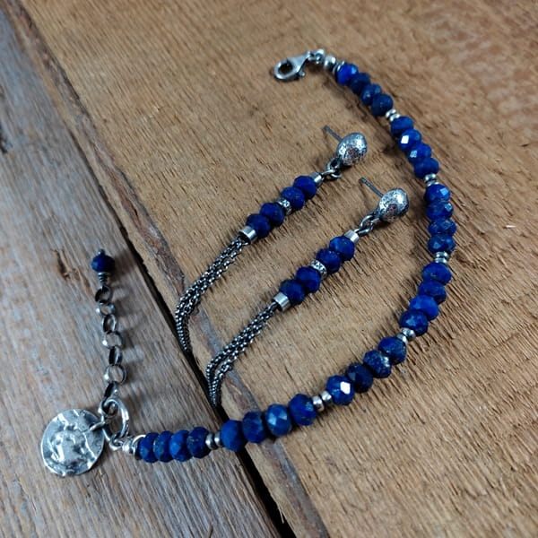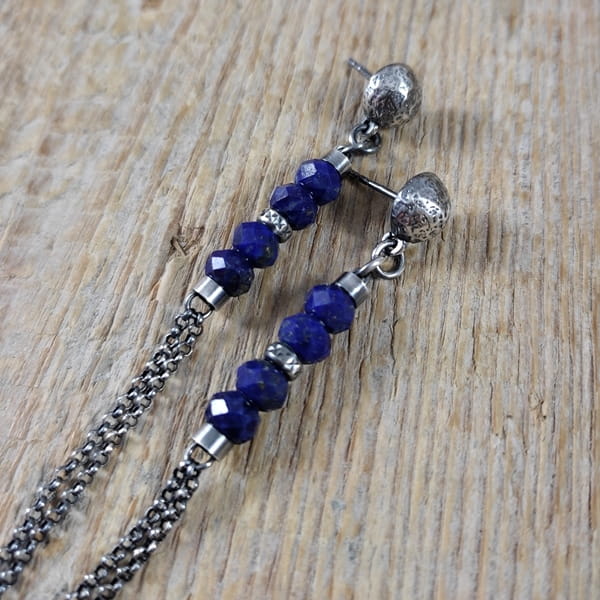 Kolczyki wykonane z fasetowanych oponek lapis lazuli ok. 6 mm. Całość wykończona w srebrze 925, oksydowanym i wypolerowanym. Długość całkowita kolczyków wynosi ok. 8,8 cm. Elegancko zapakowane. Kamienie z delikatnymi niedoskonałościami.
