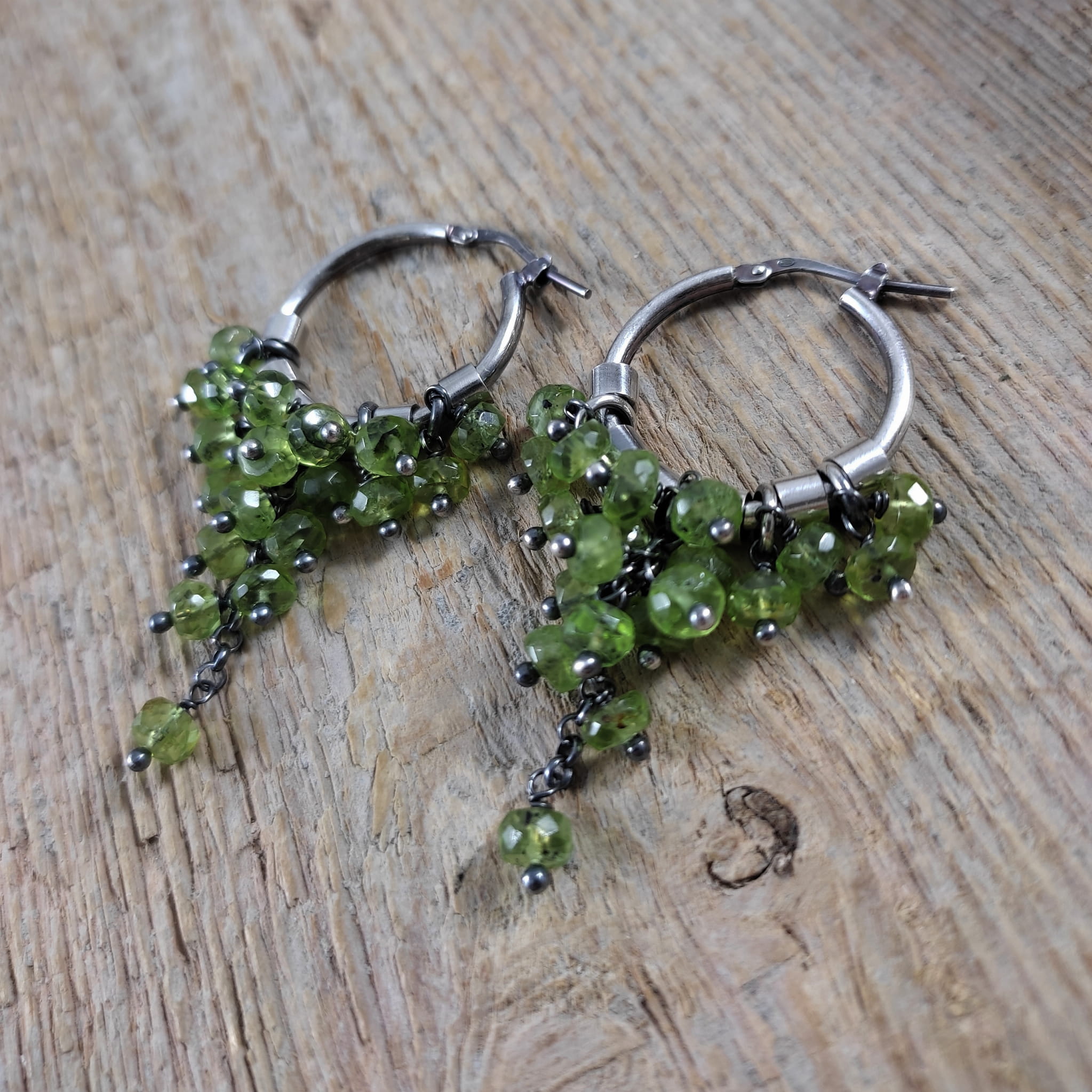 Kolczyki wykonane z fasetowanych oponek peridotu (oliwinu) ok. 5 mm. Całość wykończona w srebrze 925, oksydowanym i wypolerowanym. Długość całkowita kolczyków wynosi ok. 5,3 cm. Elegancko zapakowane. Kamienie z delikatnymi niedoskonałościami.