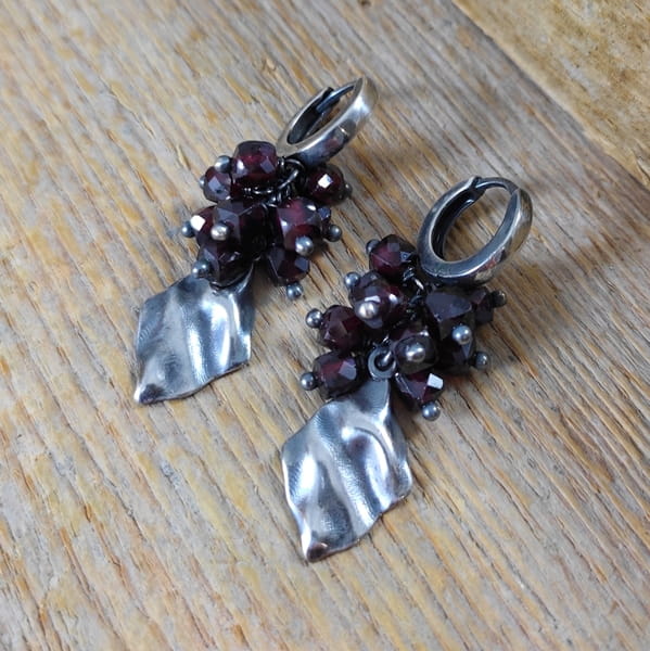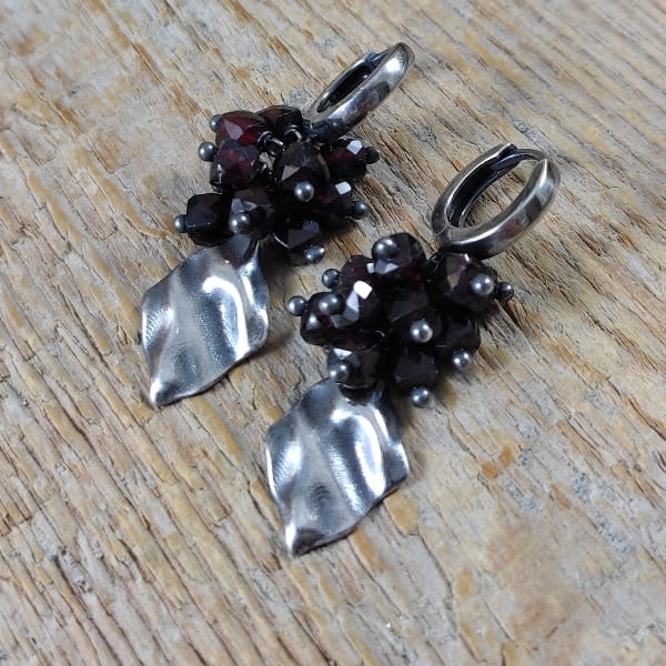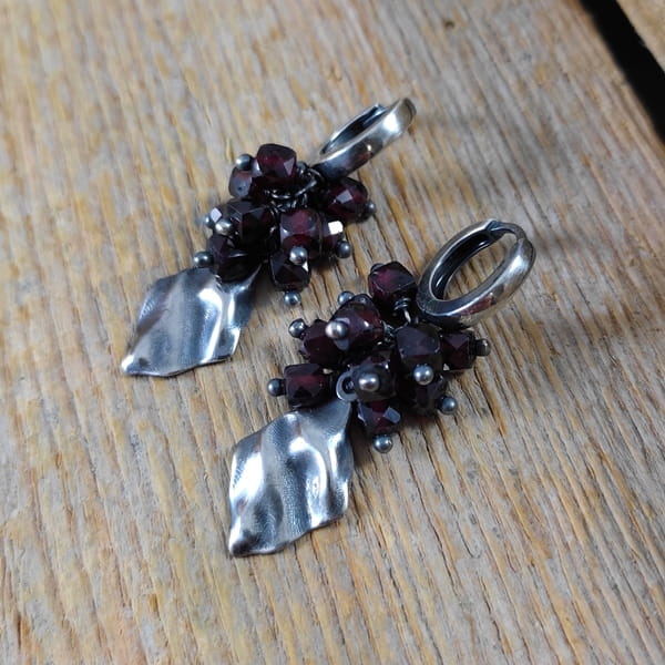 Kolczyki z fasetowanych sześcianów granatu o średnicy 4 mm. Kamienie posiadają niedoskonałości. Długość całkowita kolczyków wynosi ok. 4 cm. Kolczyki zostały wykonane w całości ze srebra 925, srebro oksydowane. Zapakowane w eleganckie pudełko.