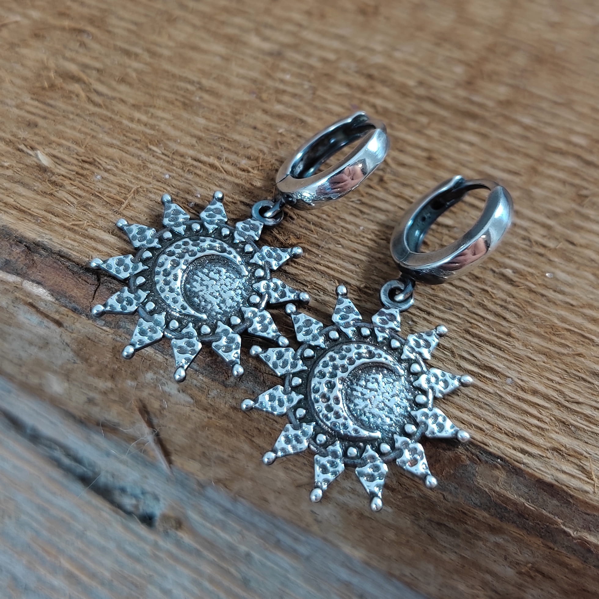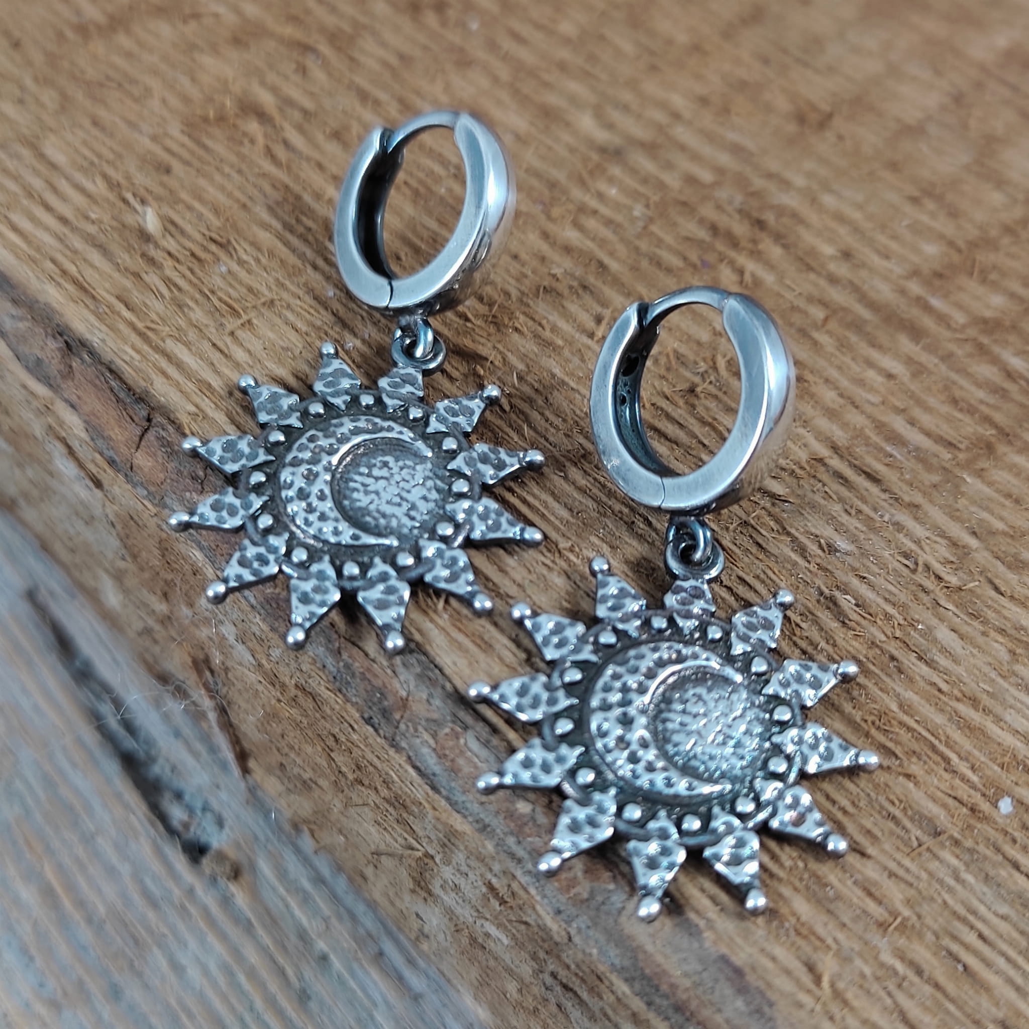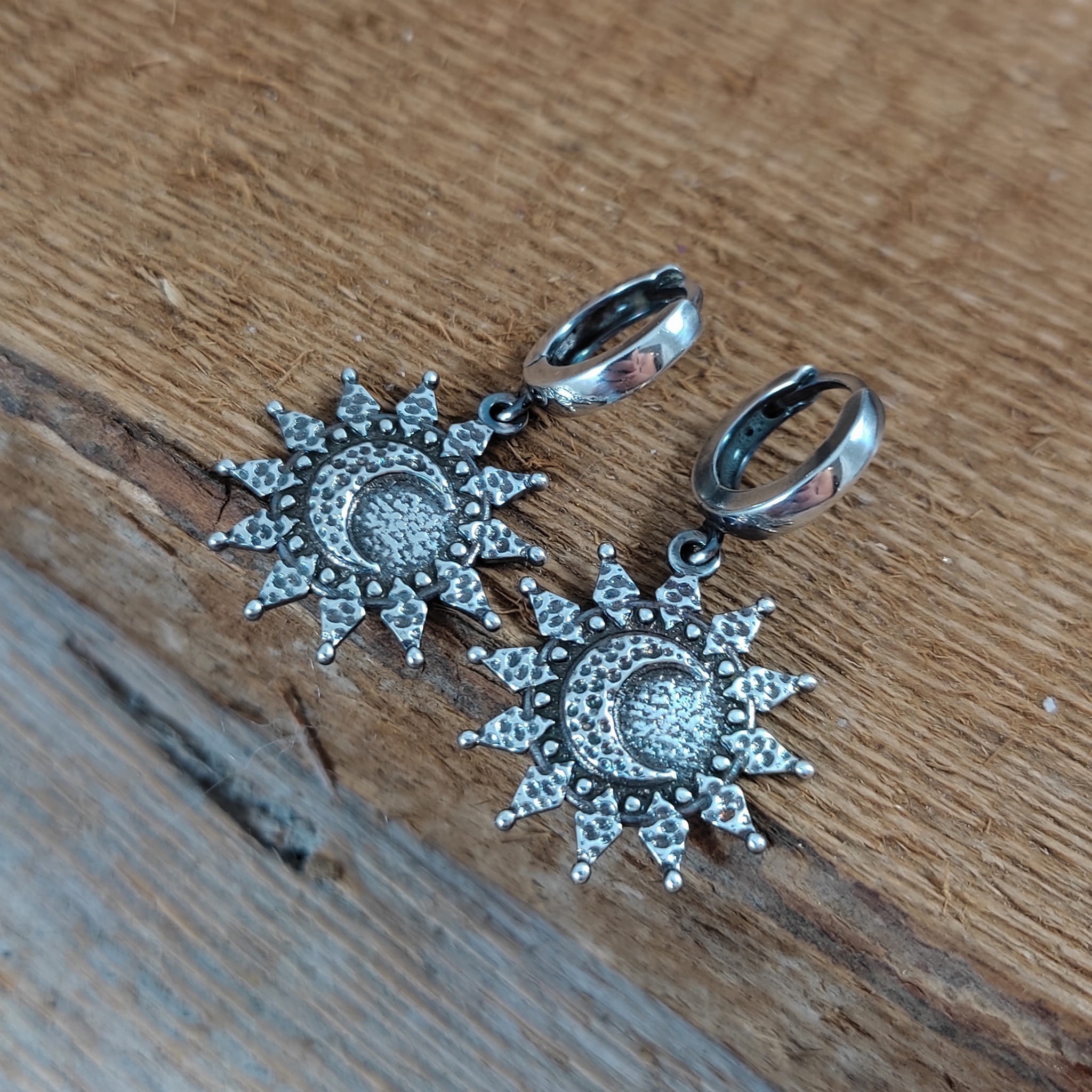 Kolczyki wykonane ze srebra 925, oksydowanego i wypolerowanego. Długość całkowita kolczyków wynosi ok. 33 mm. Wielkość słońca/ księżyca 20,7/19,3 mm. Elegancko zapakowane.