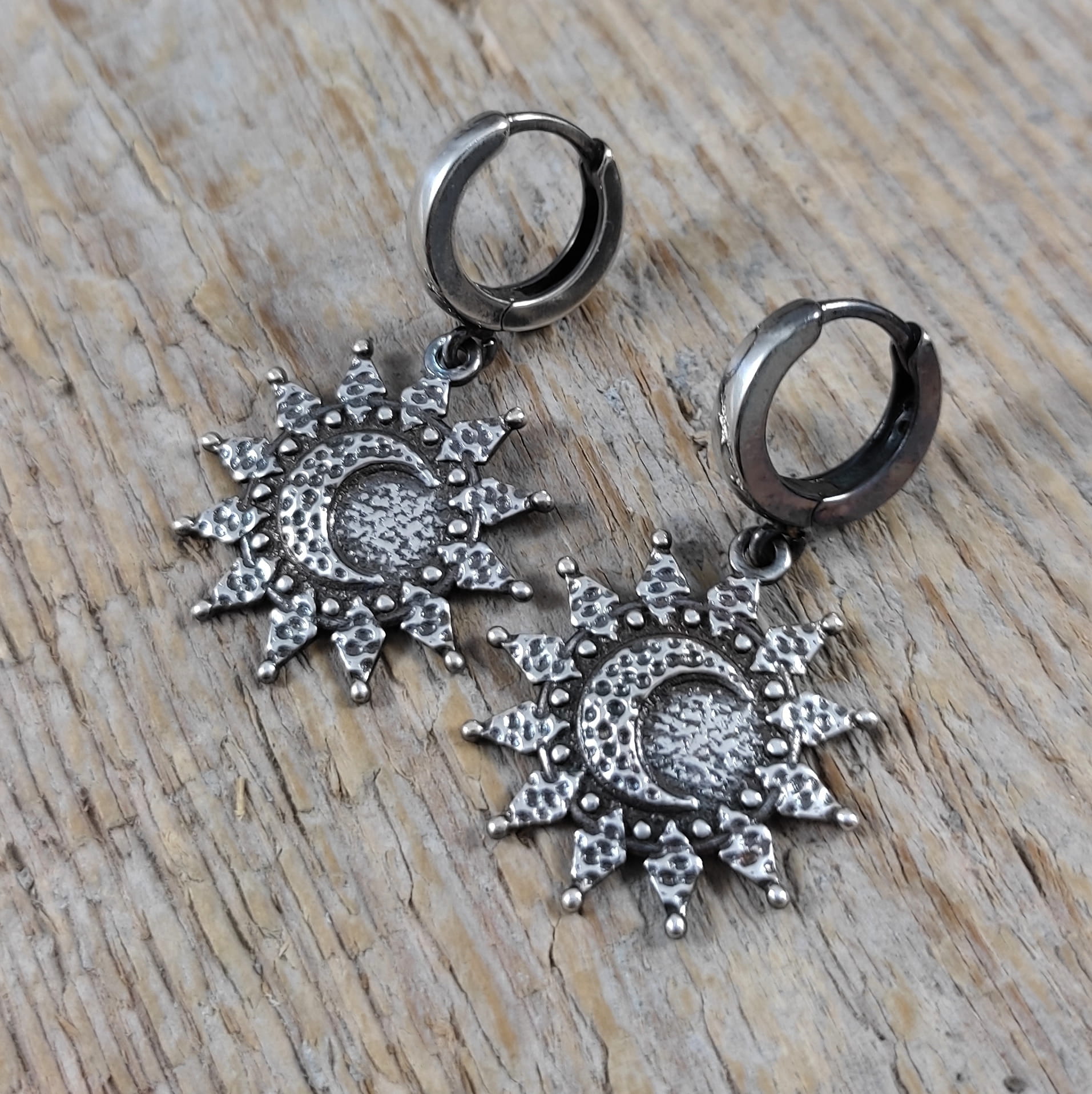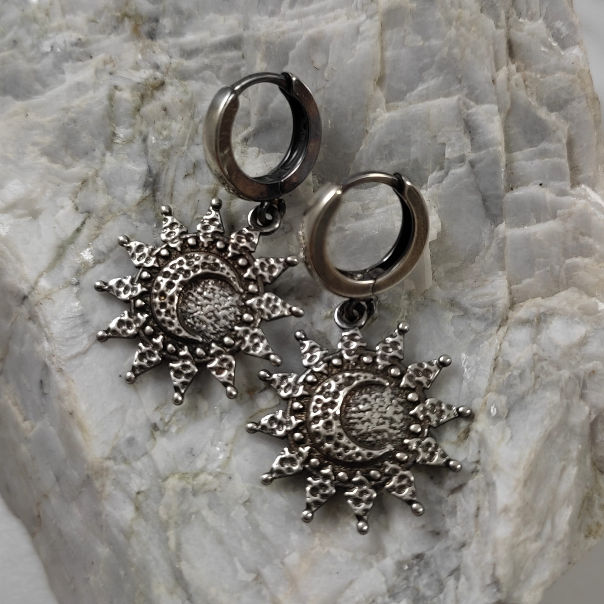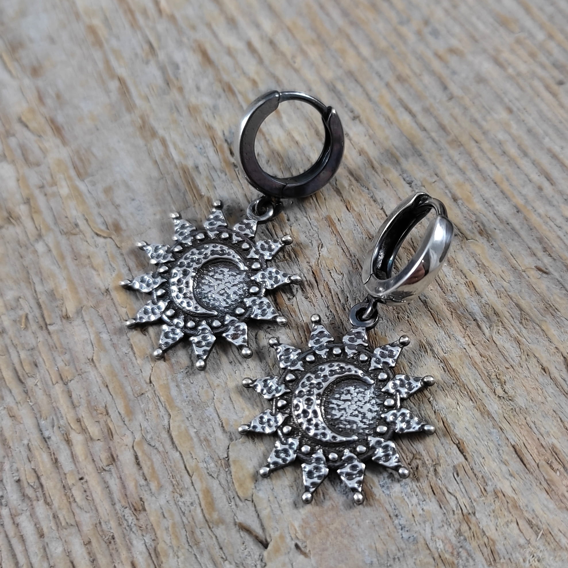 Kolczyki wykonane ze srebra 925, oksydowanego i wypolerowanego. Długość całkowita kolczyków wynosi ok. 33 mm. Wielkość słońca/ księżyca 20,7/19,3 mm. Elegancko zapakowane.