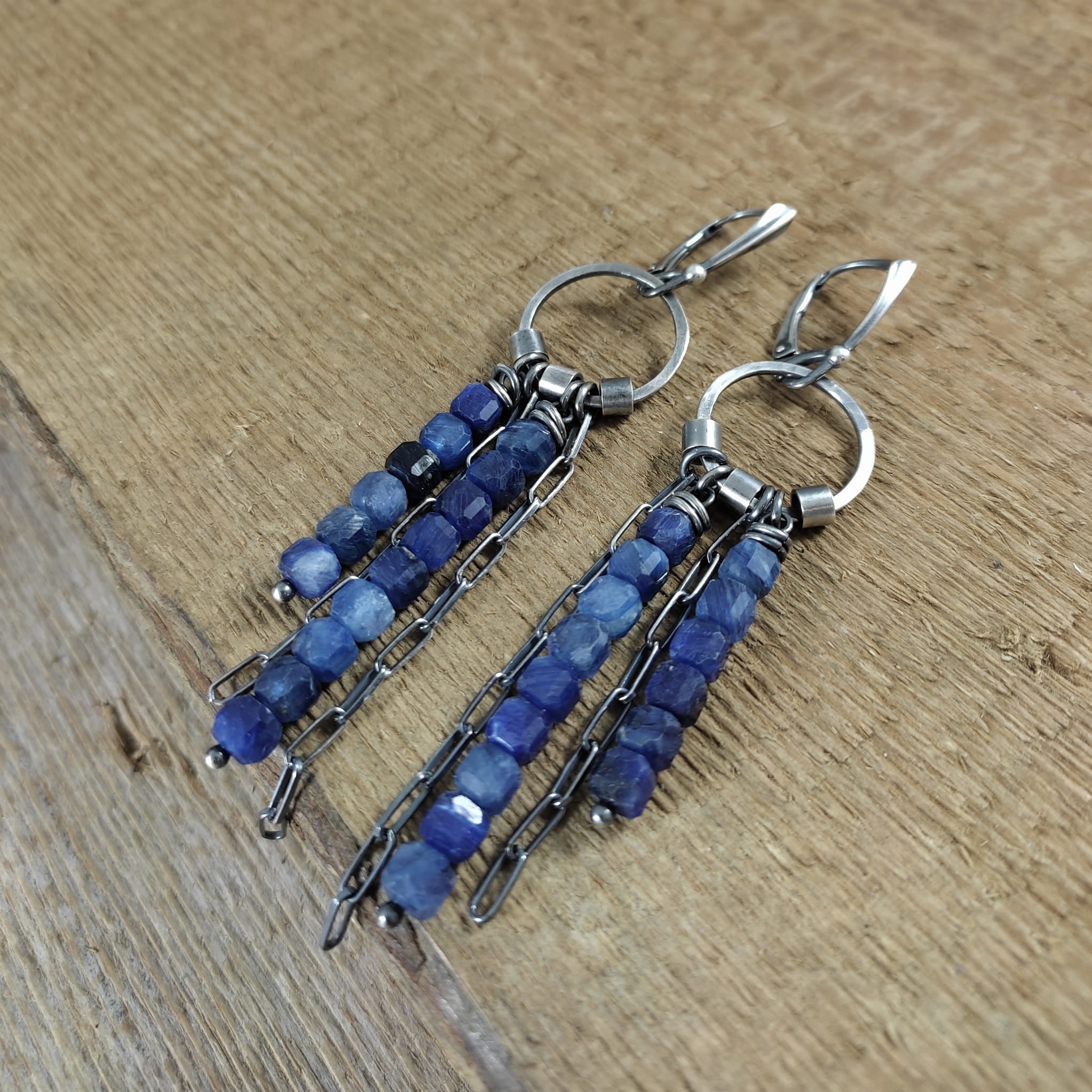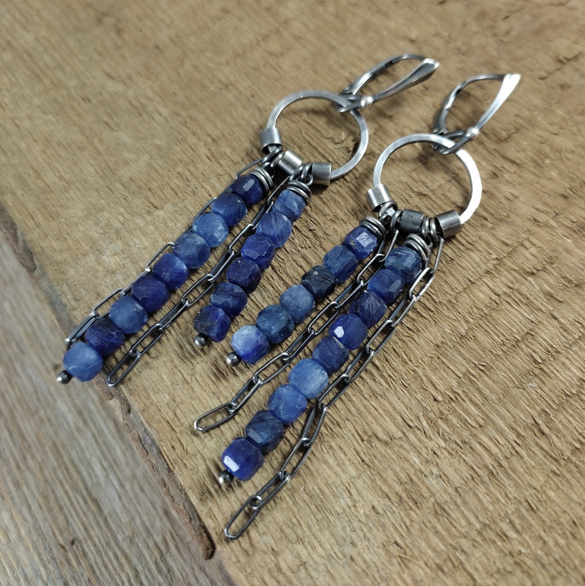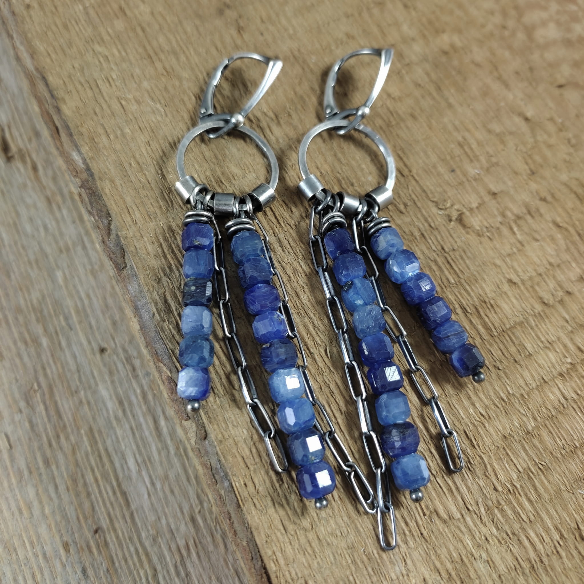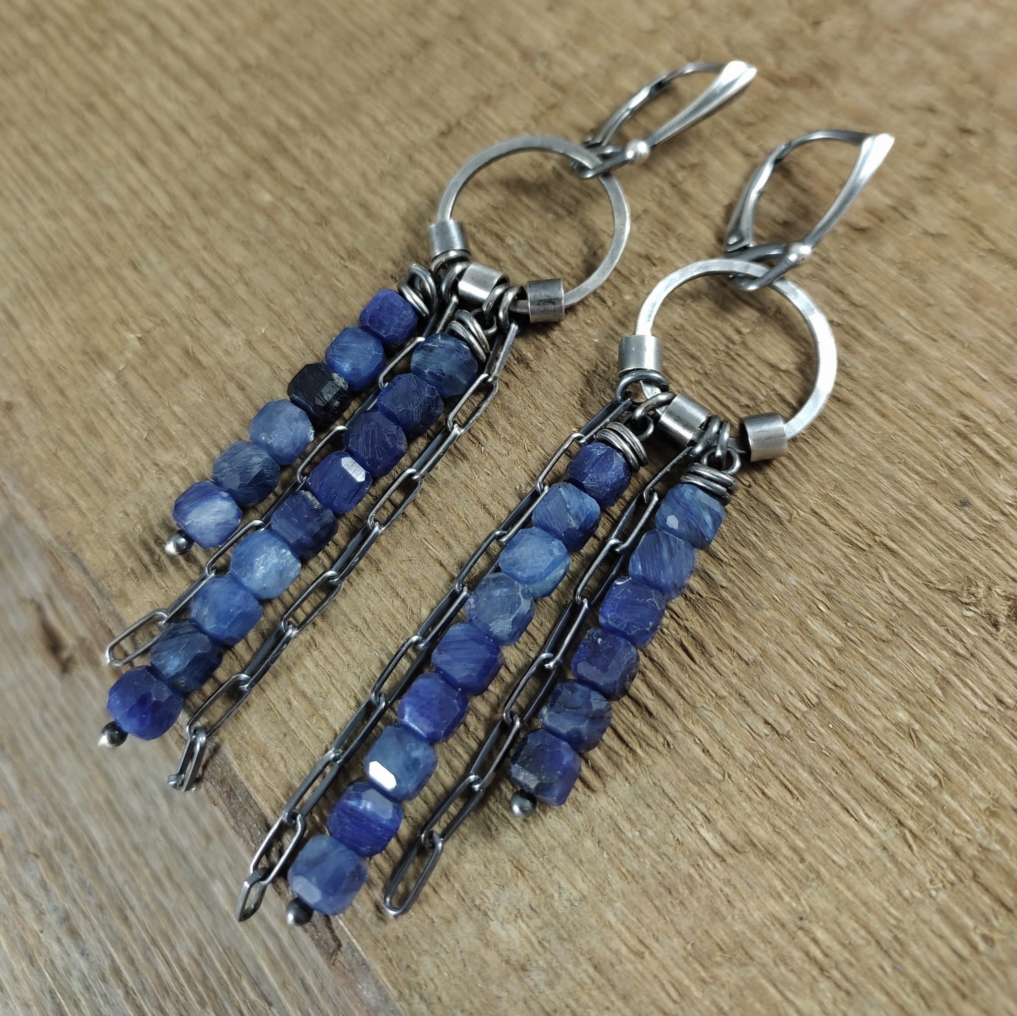 Kolczyki z sześcianami fasetowanego kyanitu. Fasetowany kyanit ok. 4-4,5 mm. Kamienie posiadają niedoskonałości. Długość całkowita kolczyków wynosi ok. 8,5 cm. Kolczyki zostały wykonane w całości ze srebra 925, srebro oksydowane. Zapakowane w eleganckie pudełko.