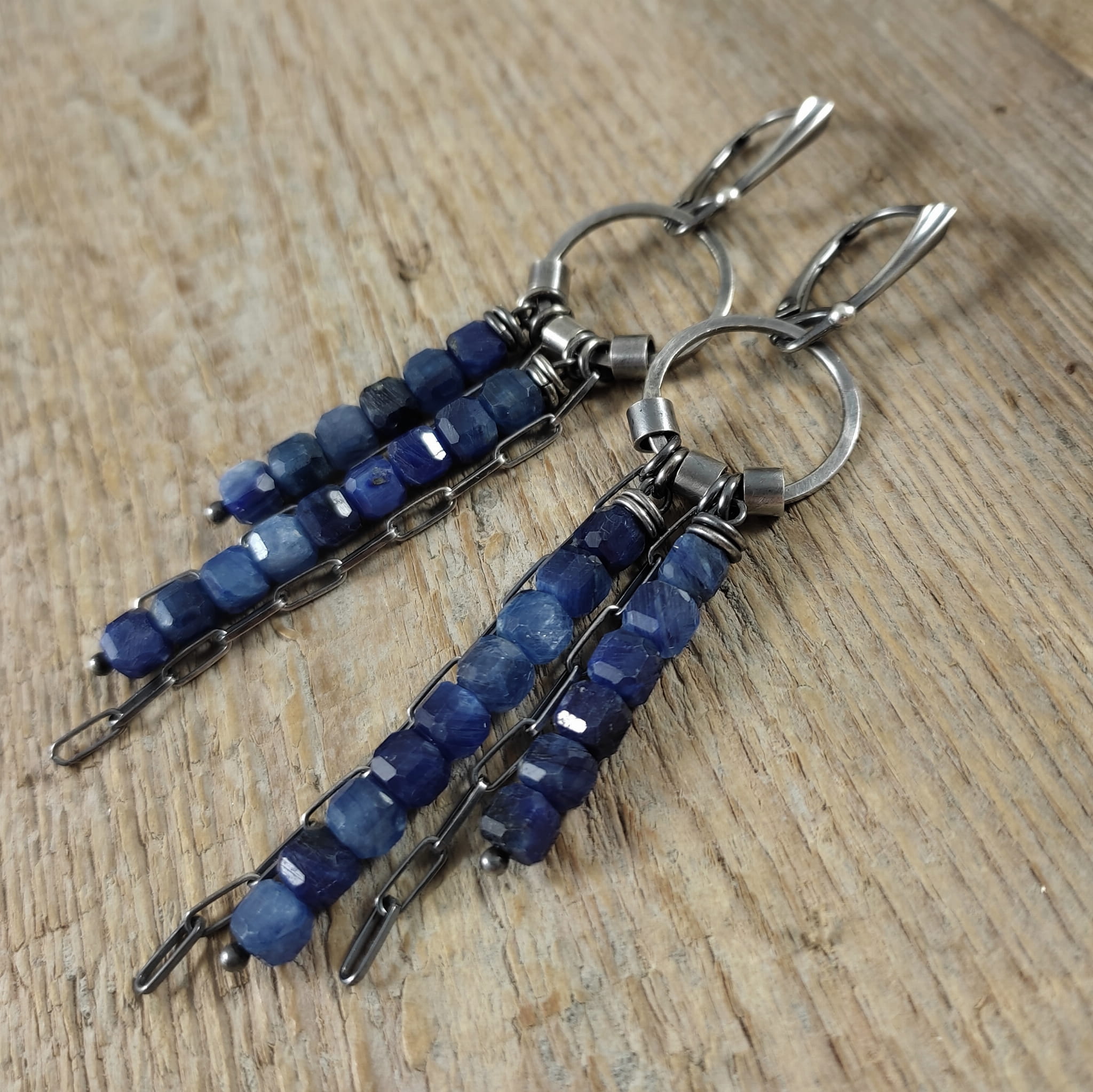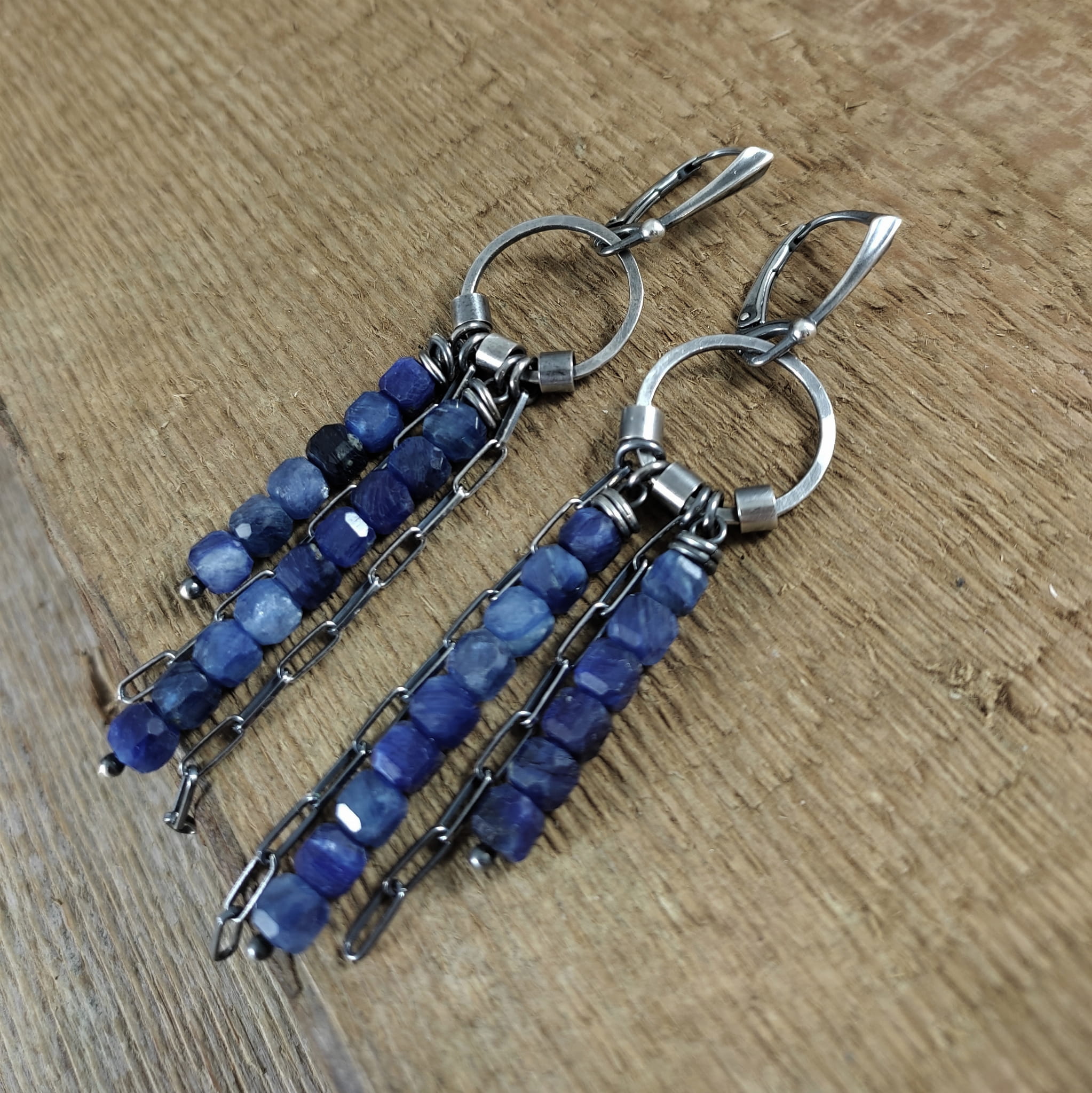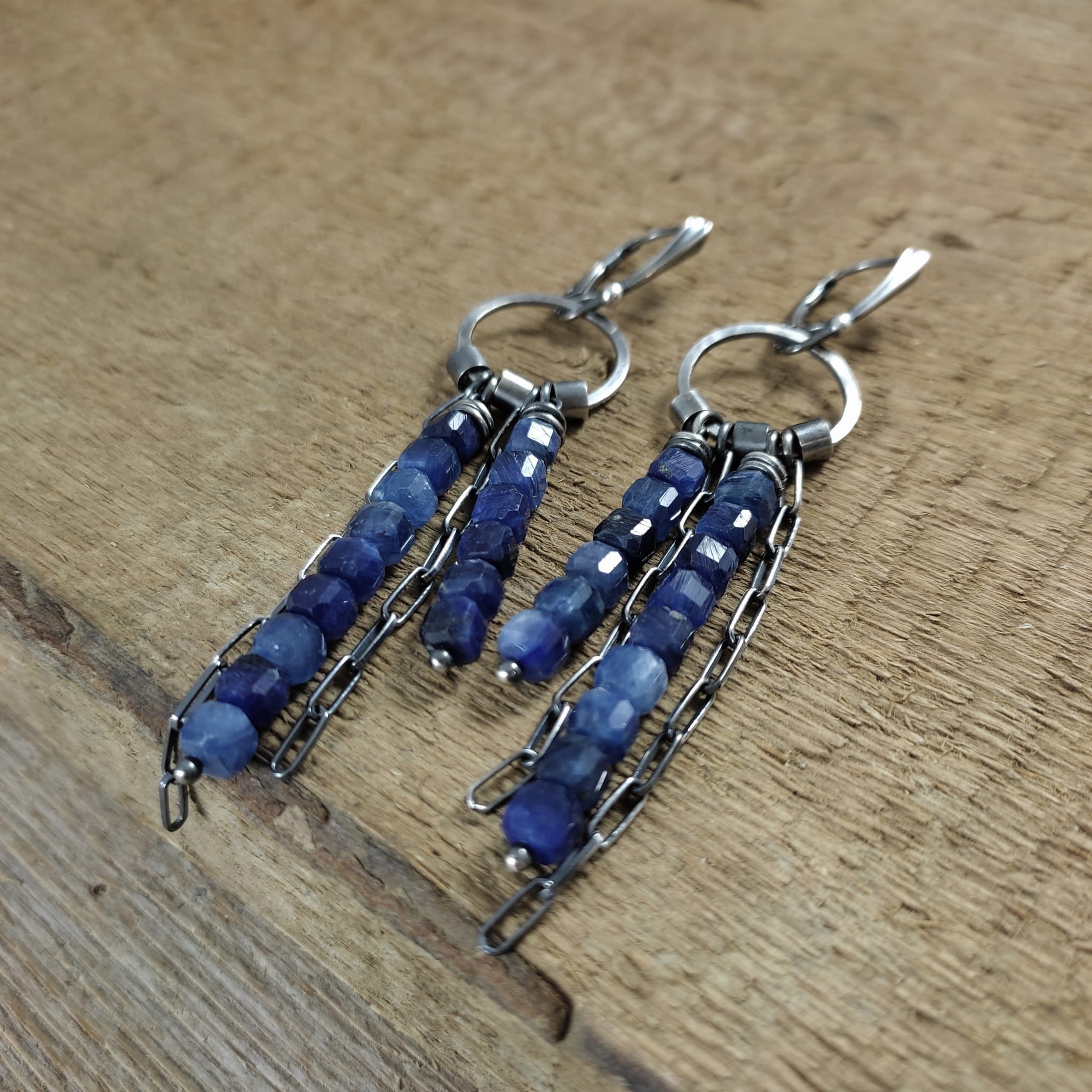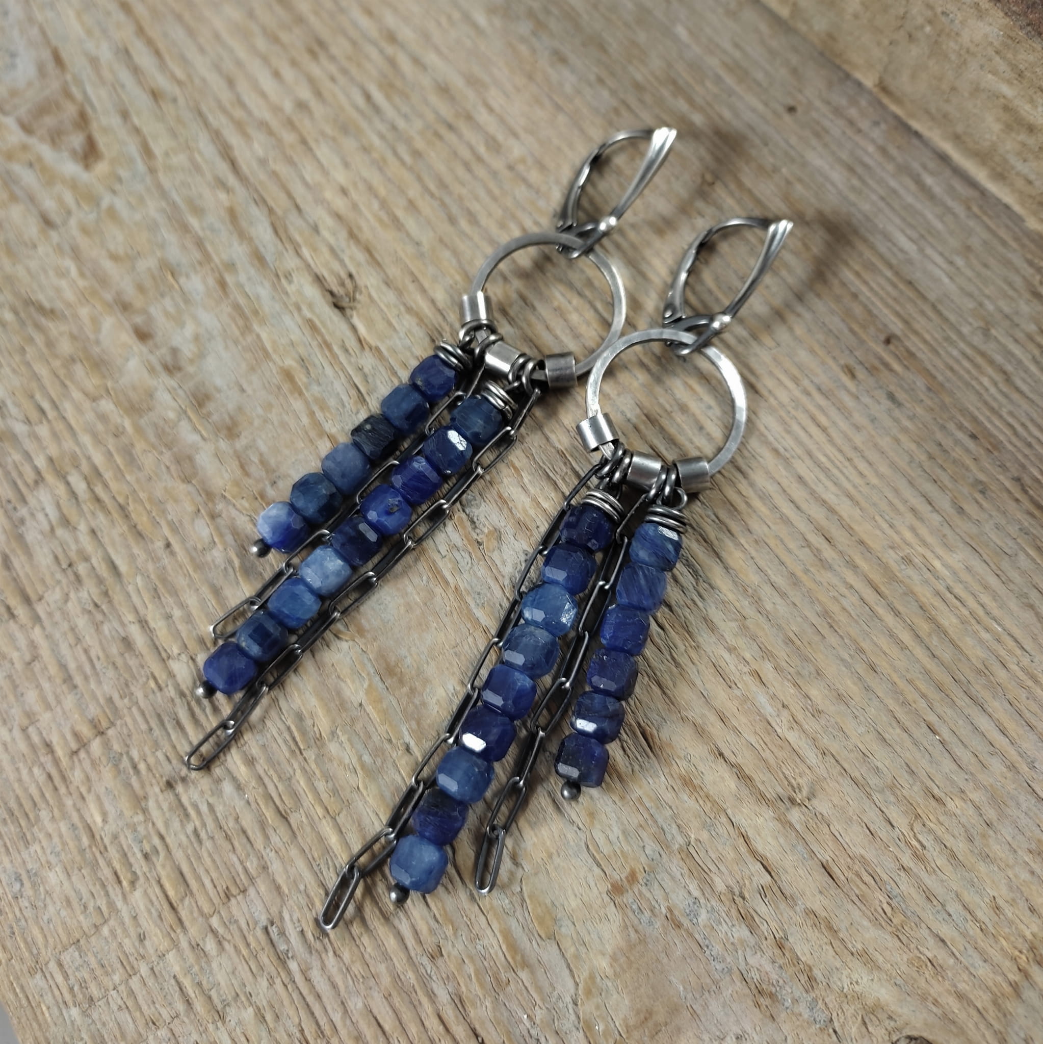Kolczyki z sześcianami fasetowanego kyanitu. Fasetowany kyanit ok. 4-4,5 mm. Kamienie posiadają niedoskonałości. Długość całkowita kolczyków wynosi ok. 8,5 cm. Kolczyki zostały wykonane w całości ze srebra 925, srebro oksydowane. Zapakowane w eleganckie pudełko.