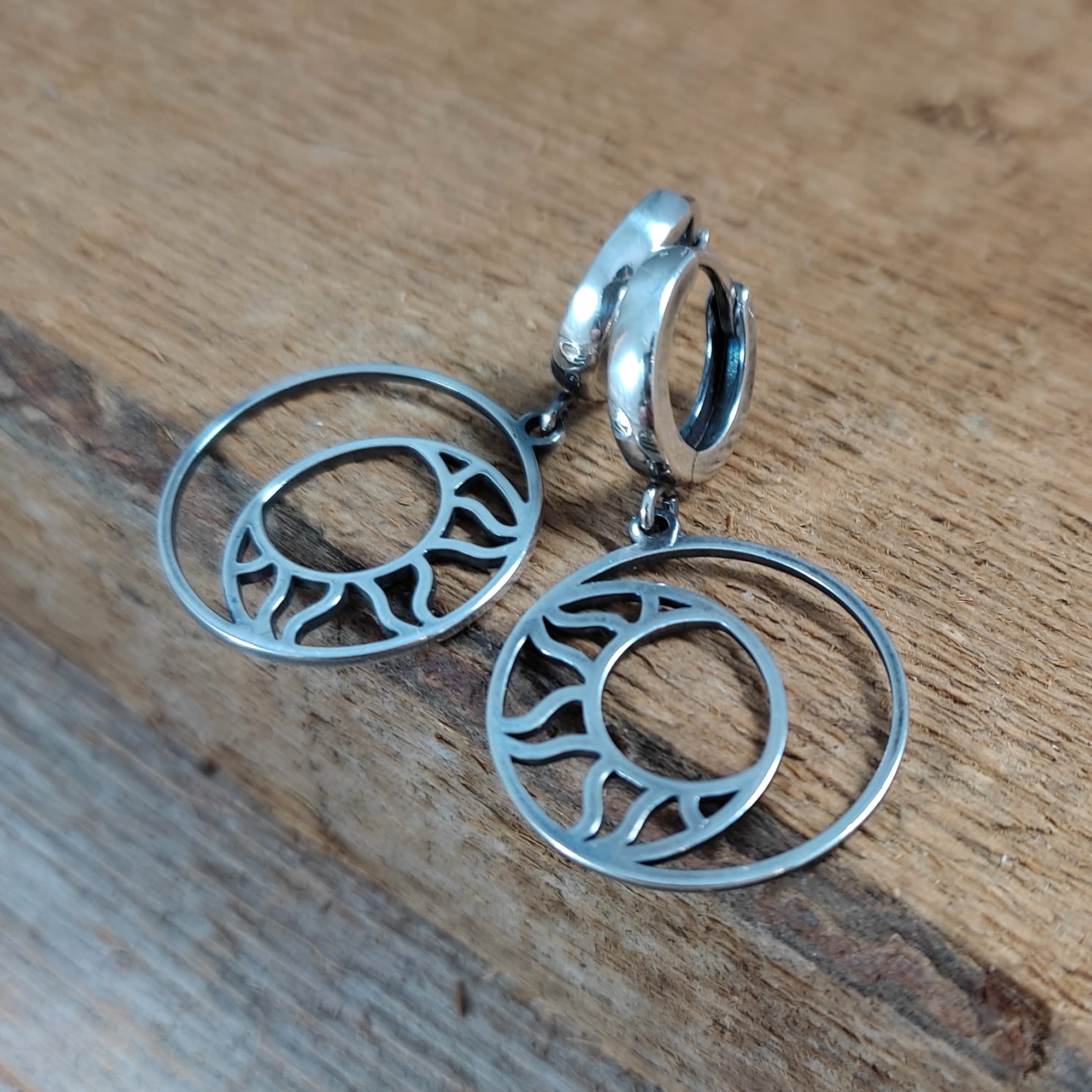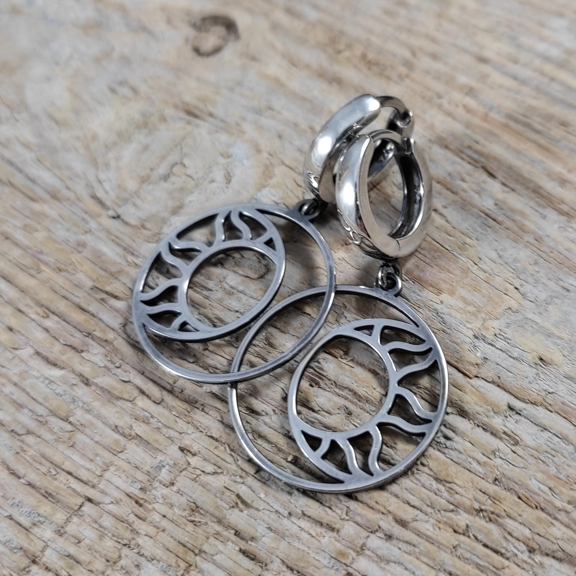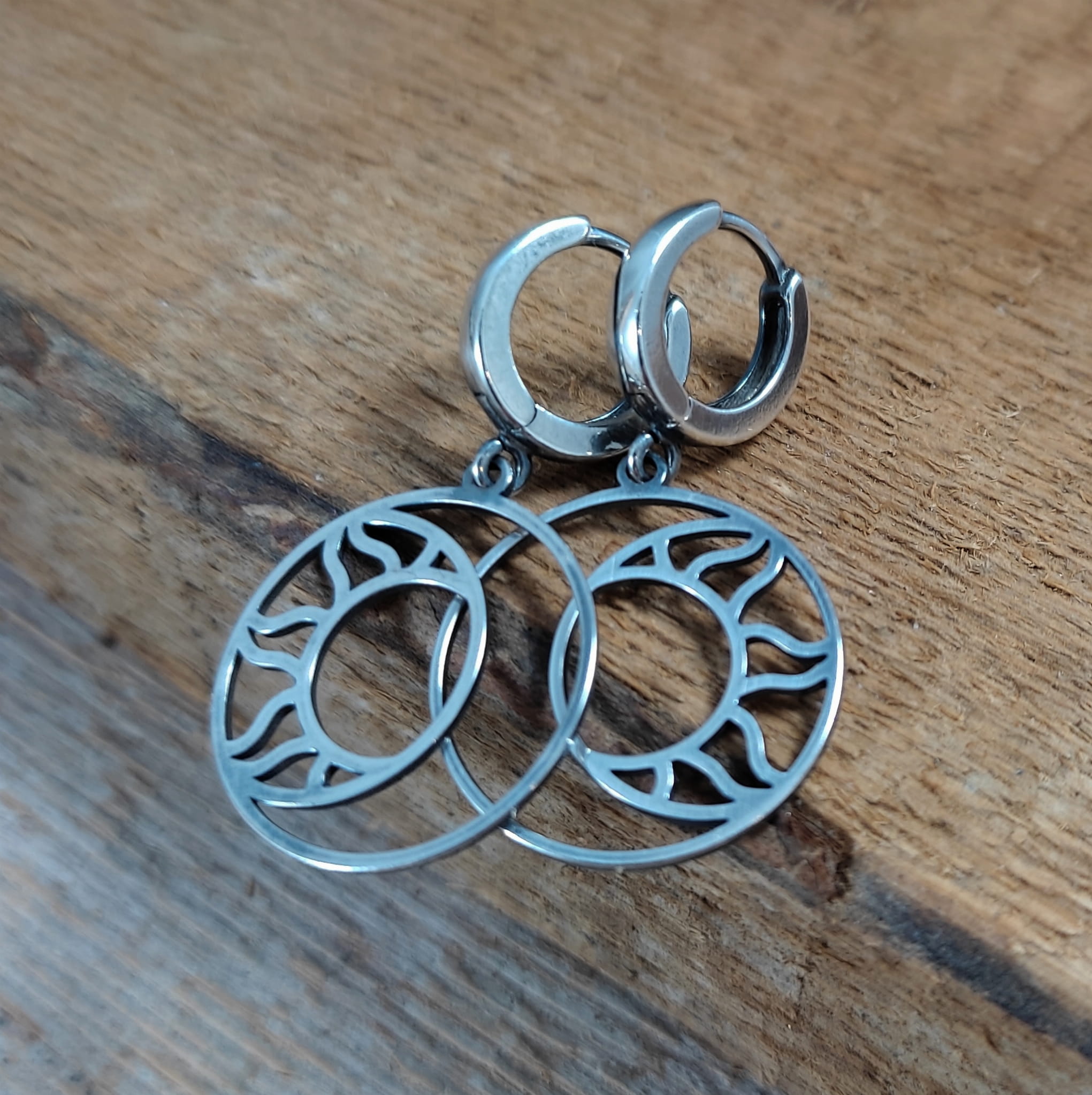 Kolczyki słońce/księżyc. Długość całkowita kolczyków wynosi ok. 35 mm. Wymiary blaszki to 21,4/19,2 mm. Kolczyki zostały wykonane w całości ze srebra 925, srebro oksydowane. Zapakowane w eleganckie pudełko.