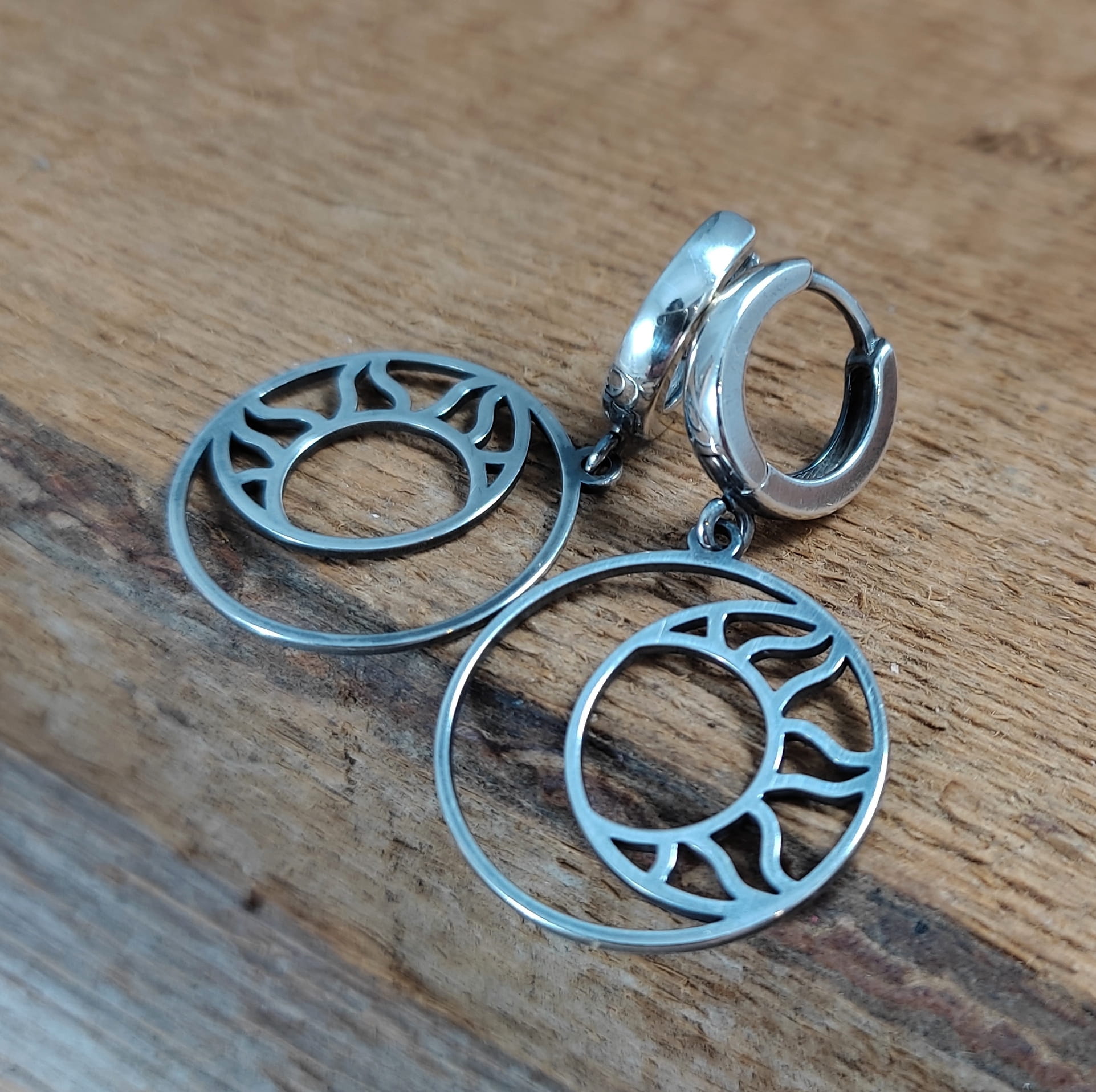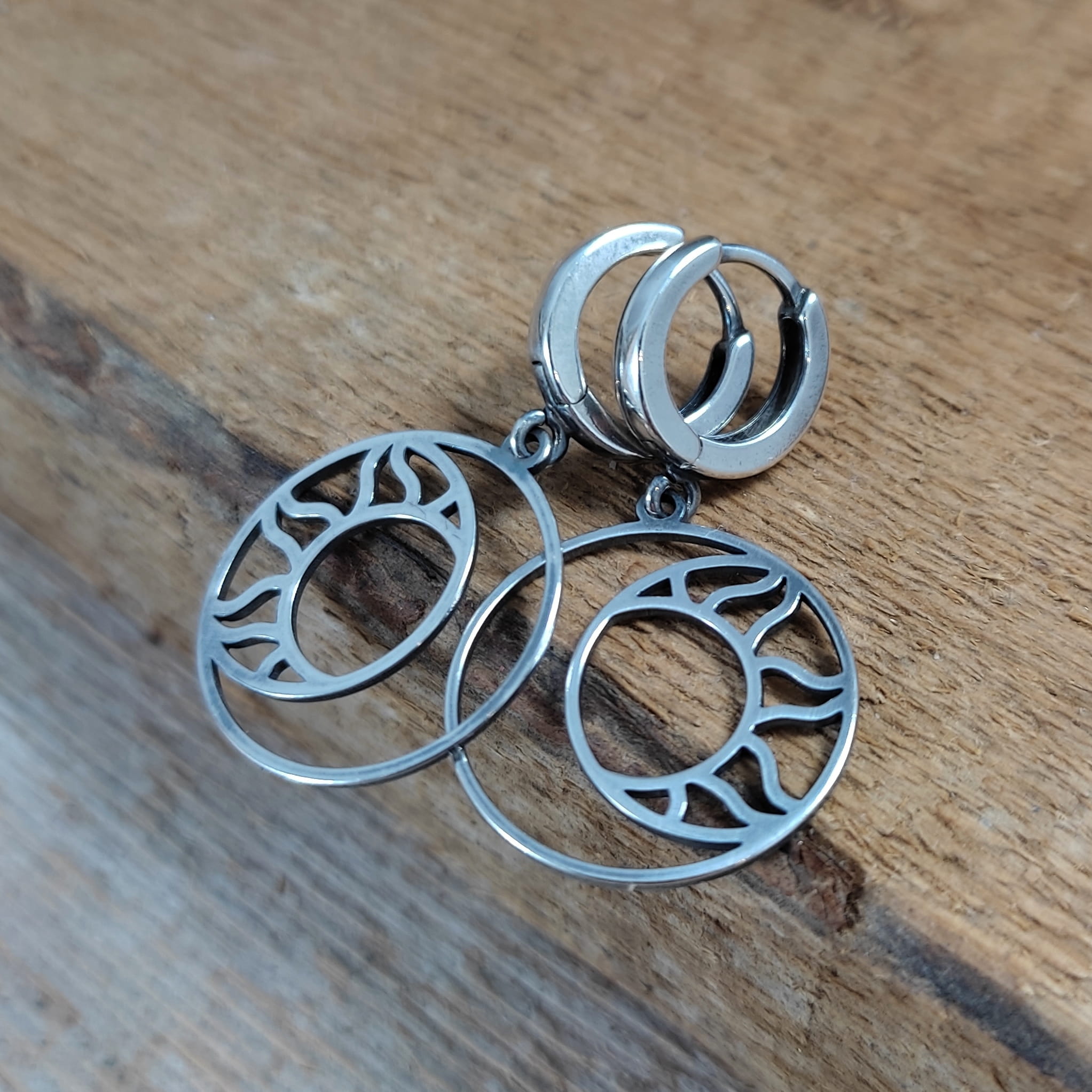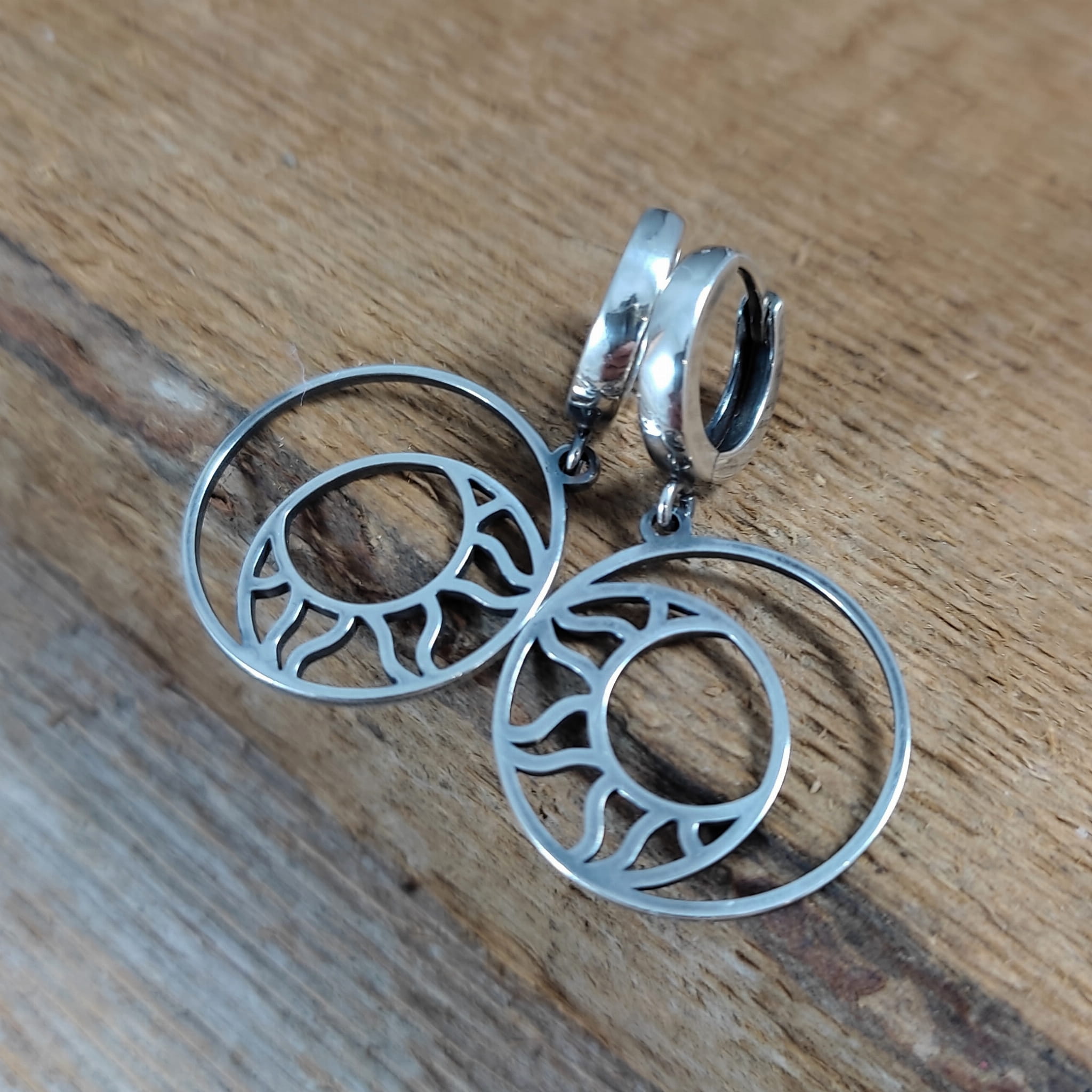 Kolczyki słońce/księżyc. Długość całkowita kolczyków wynosi ok. 35 mm. Wymiary blaszki to 21,4/19,2 mm. Kolczyki zostały wykonane w całości ze srebra 925, srebro oksydowane. Zapakowane w eleganckie pudełko.