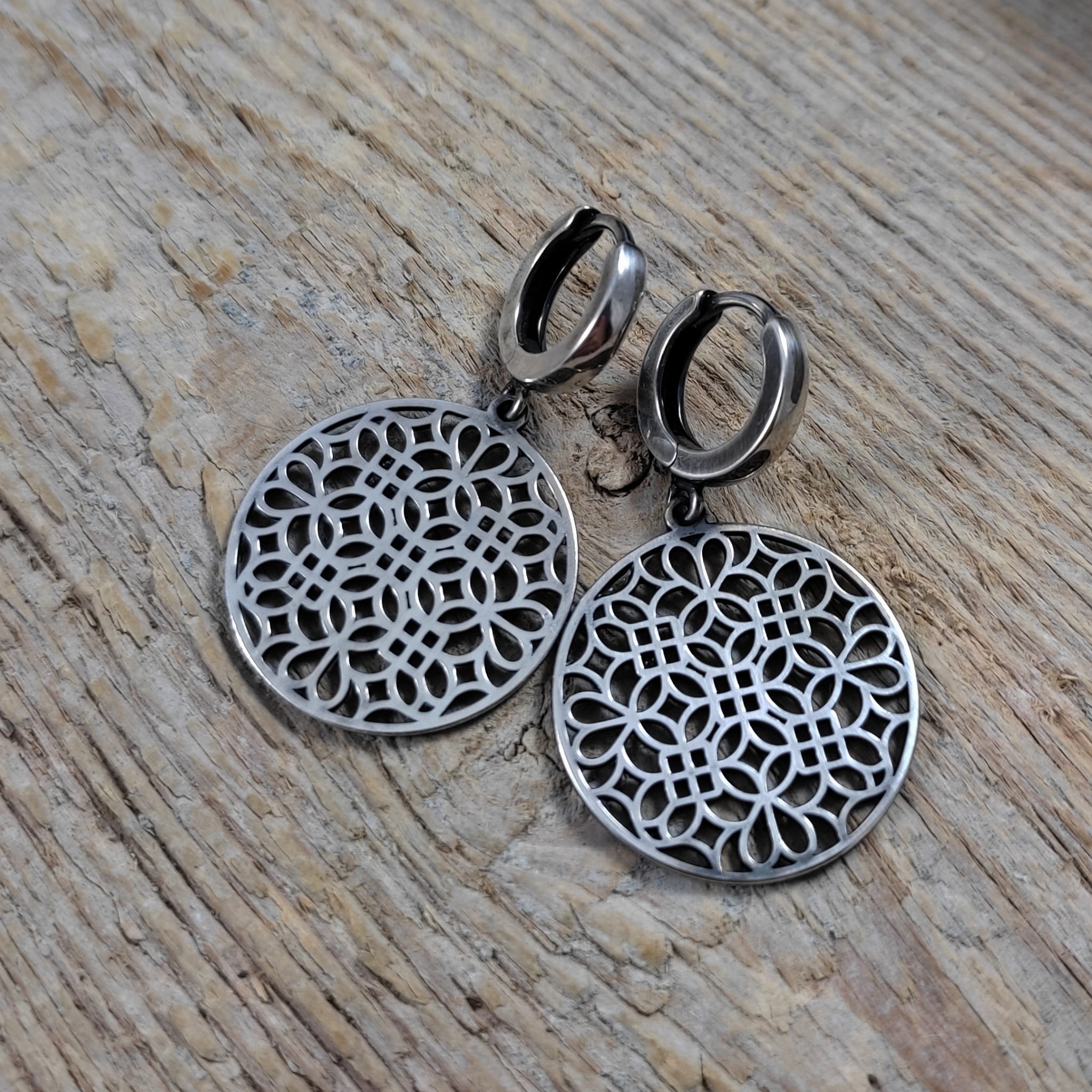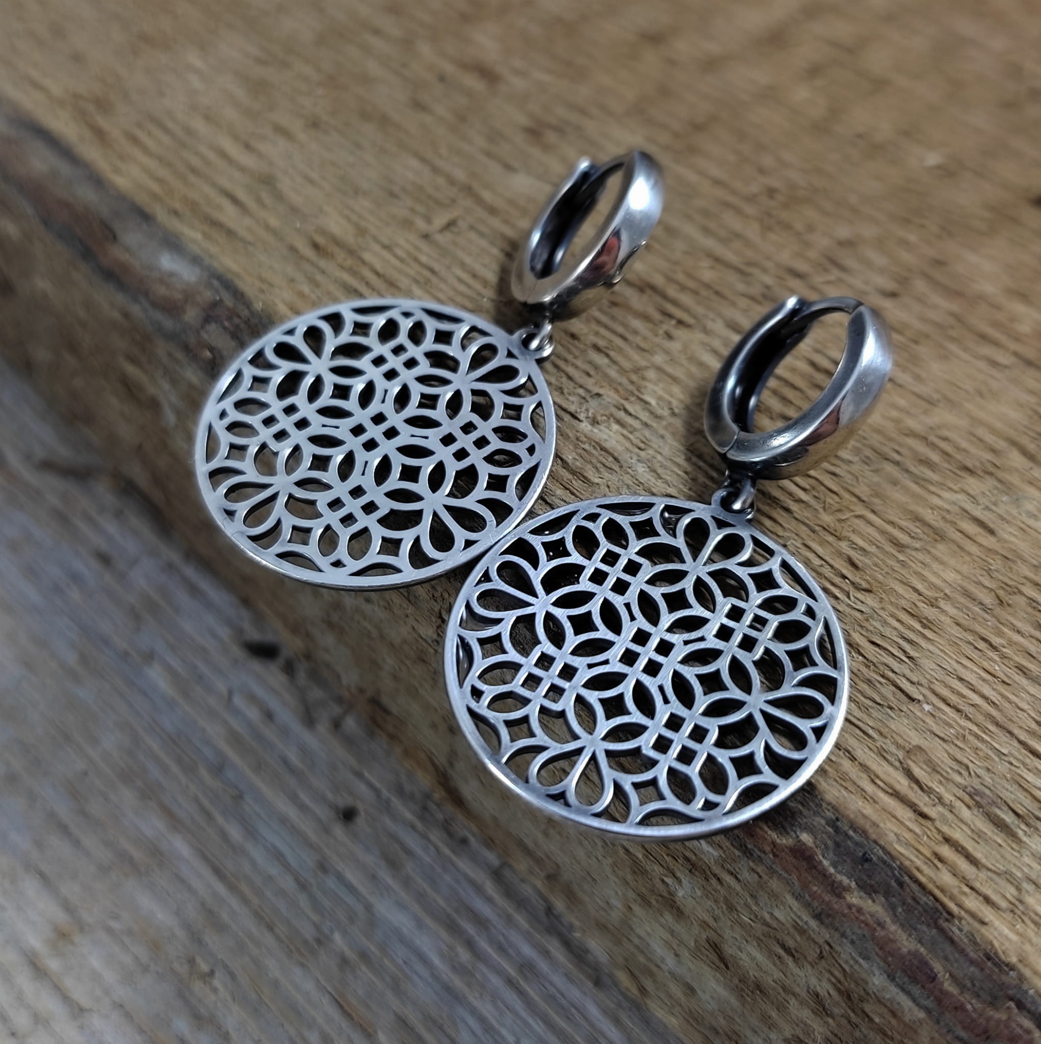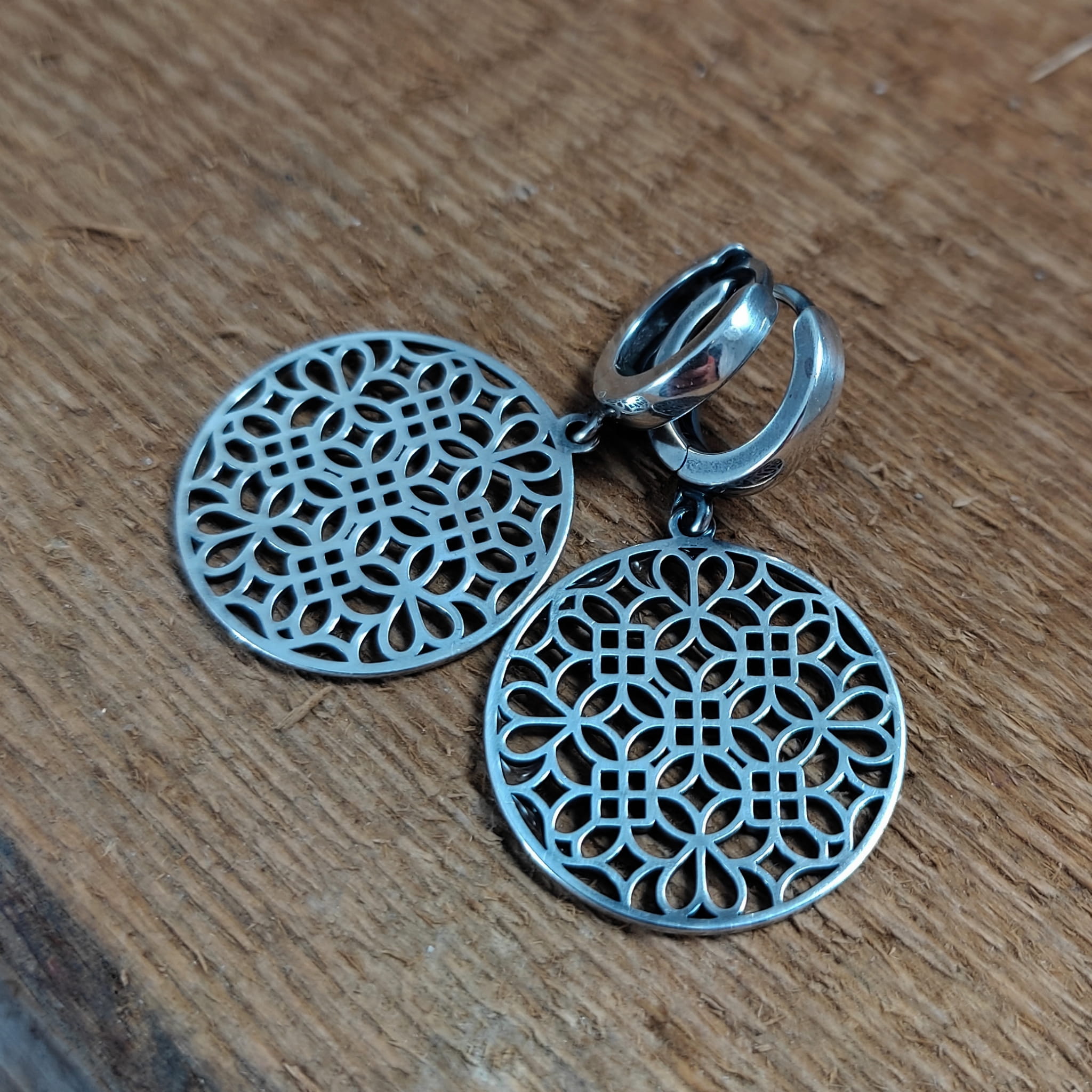 Kolczyki ze ślicznym ażurowym ornamentem. Srebrne ażurowe koła o średnicy 21 mm. Długość całkowita kolczyków wynosi ok. 30 mm. Kolczyki zostały wykonane w całości ze srebra 925, srebro oksydowane. Zapakowane w eleganckie pudełko.